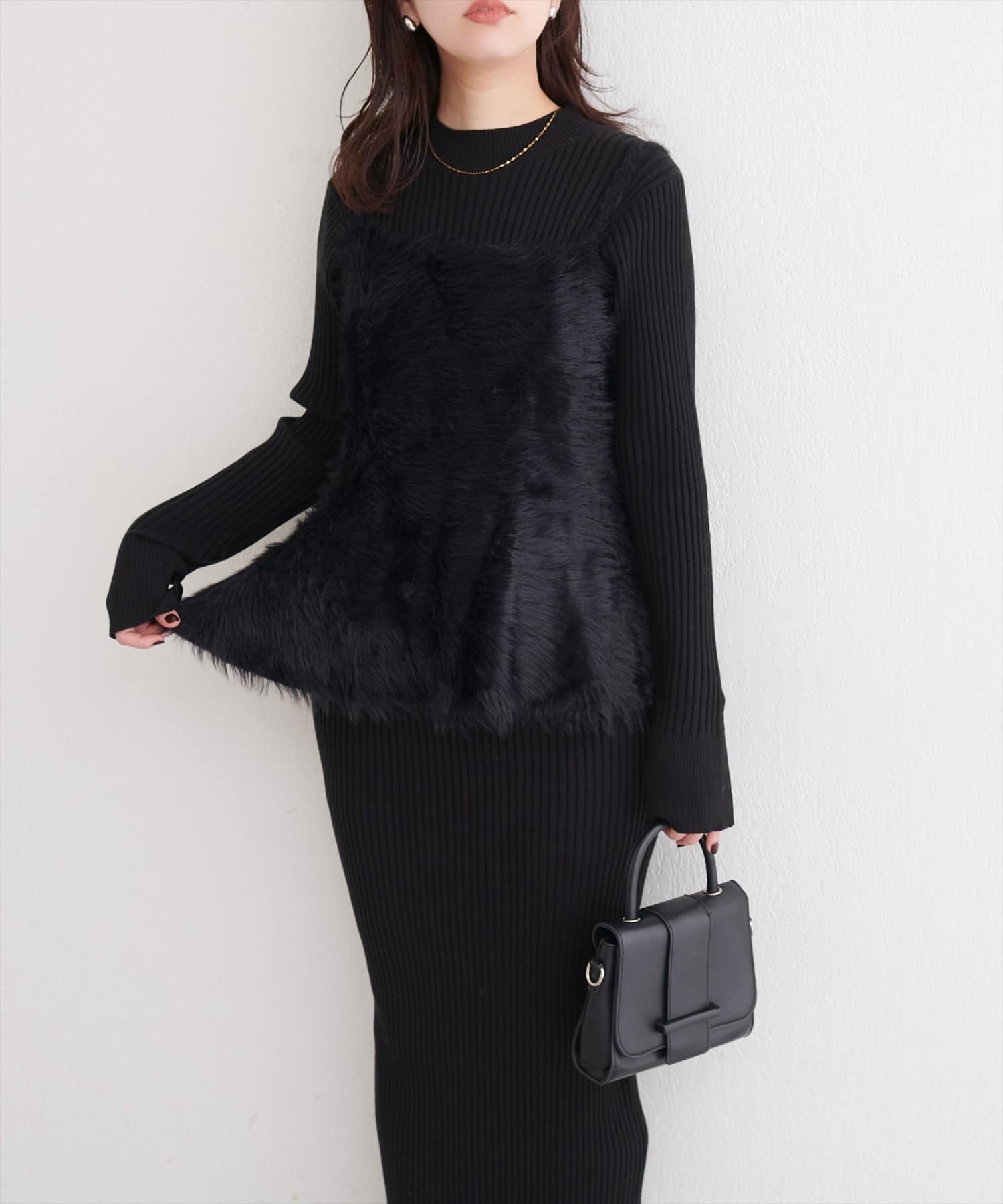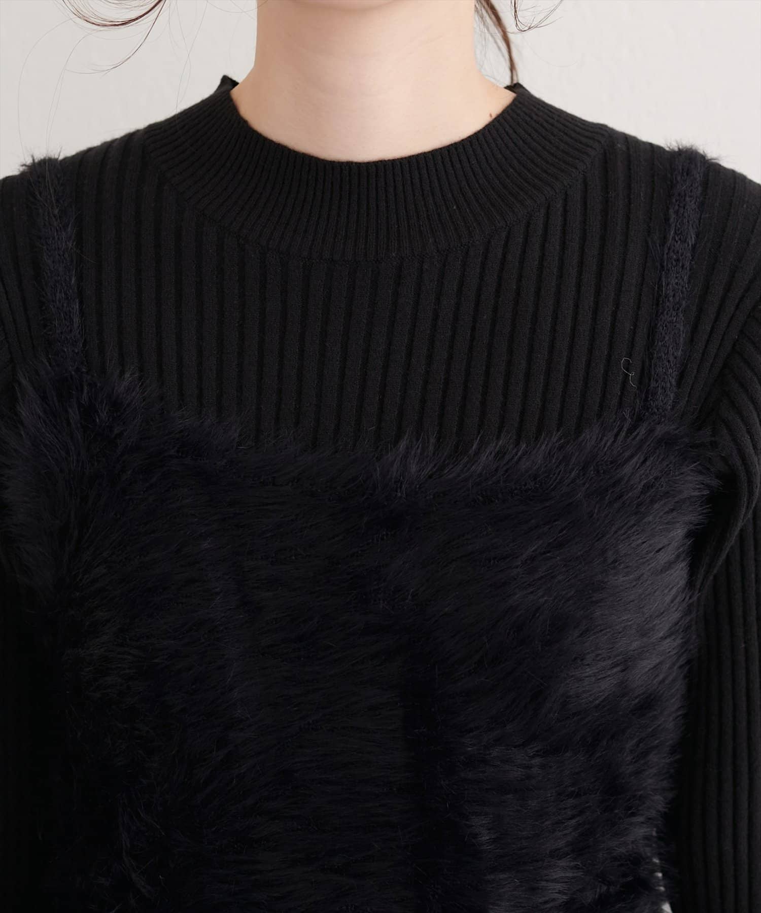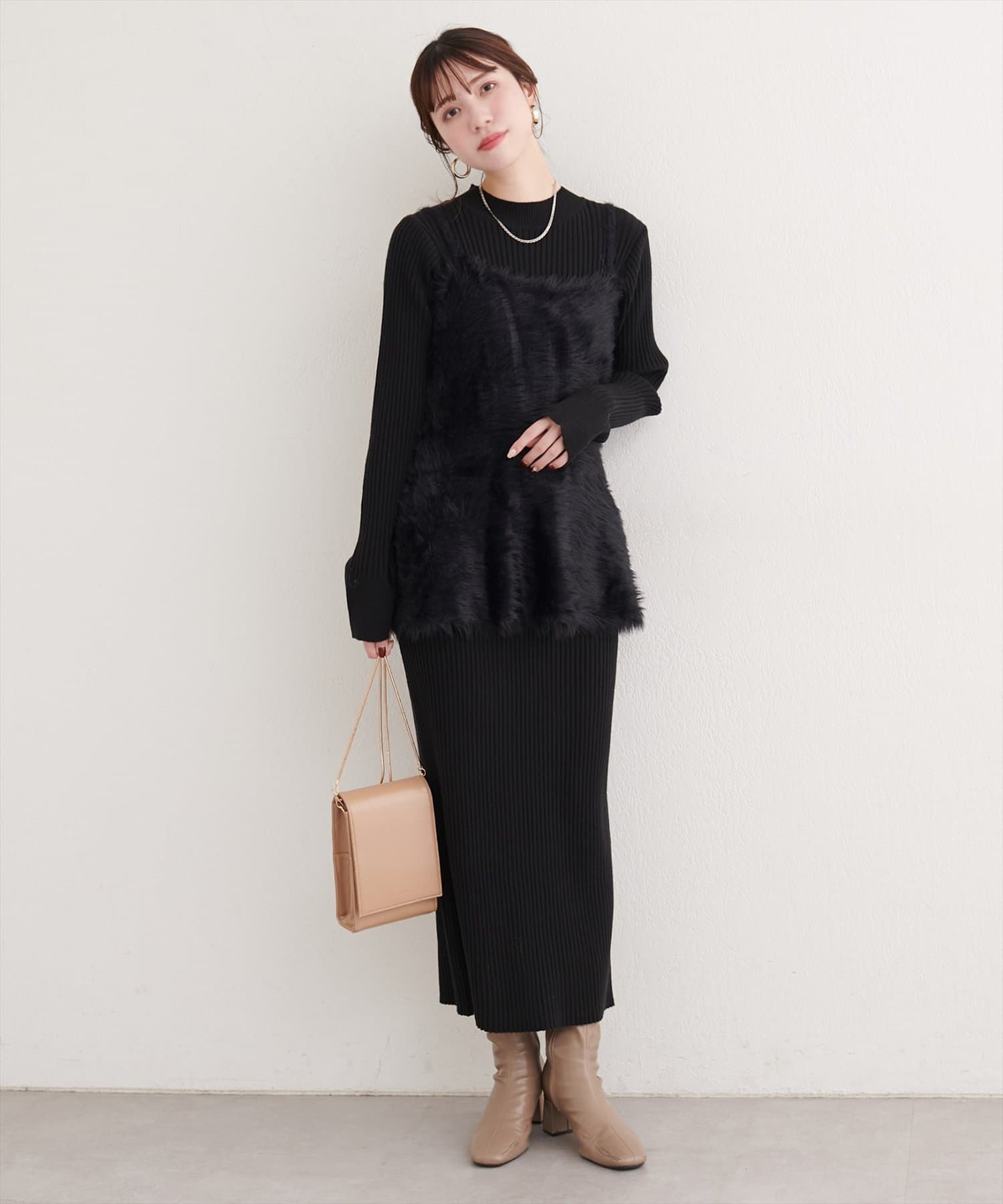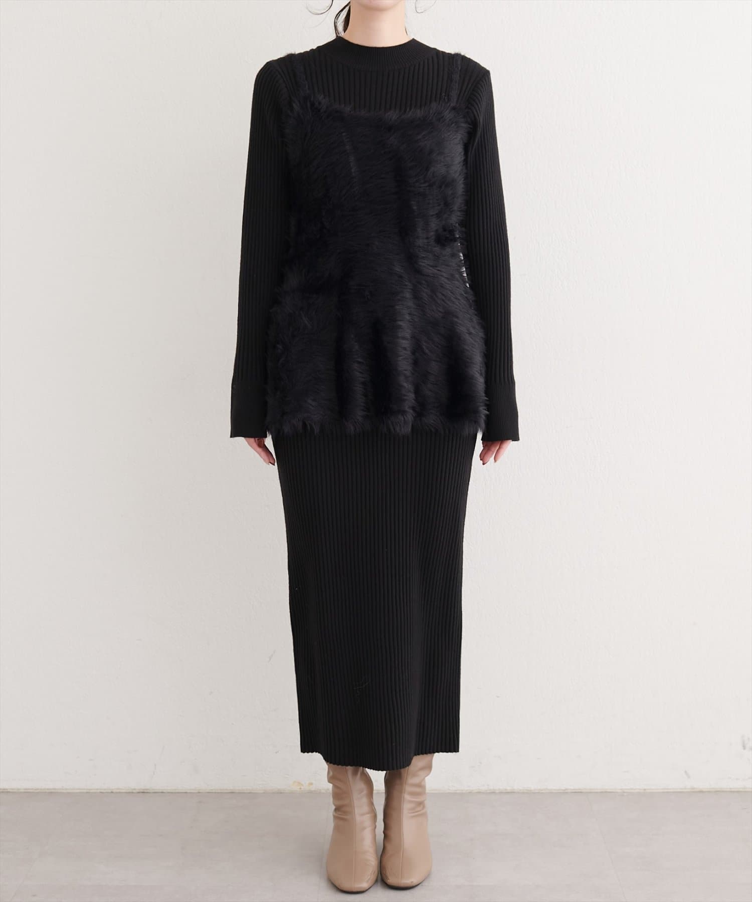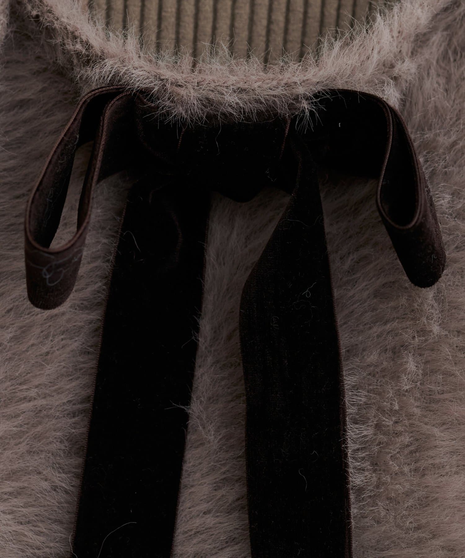 バックリボンが目を惹くペプラムビスチェは、ふわふわとした素材感が、ニットワンピースに奥行きと立体感をプラス。