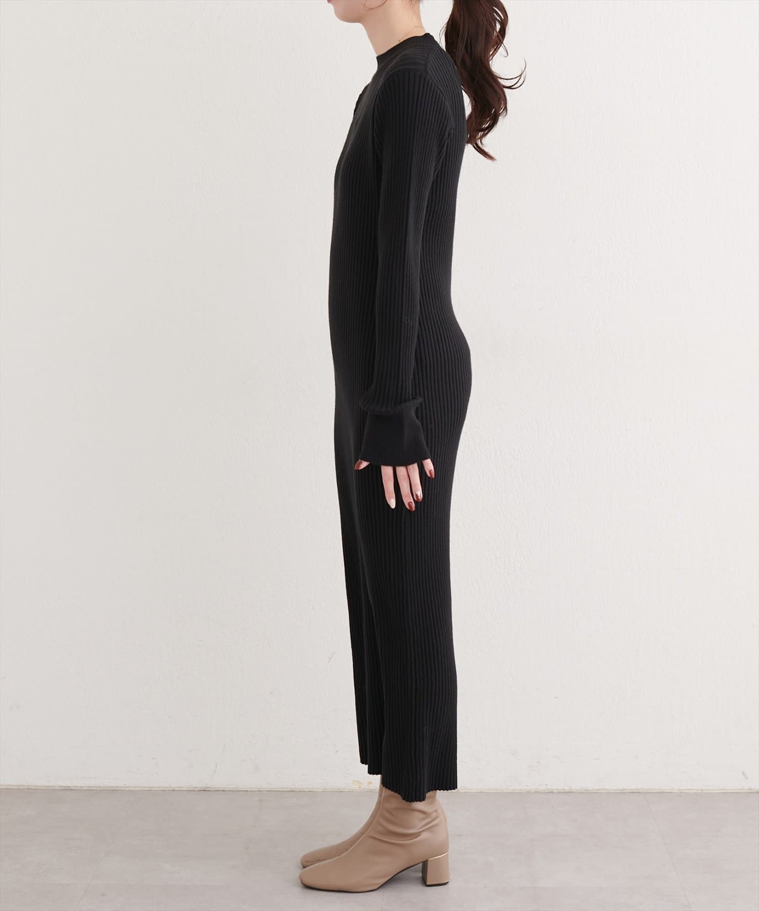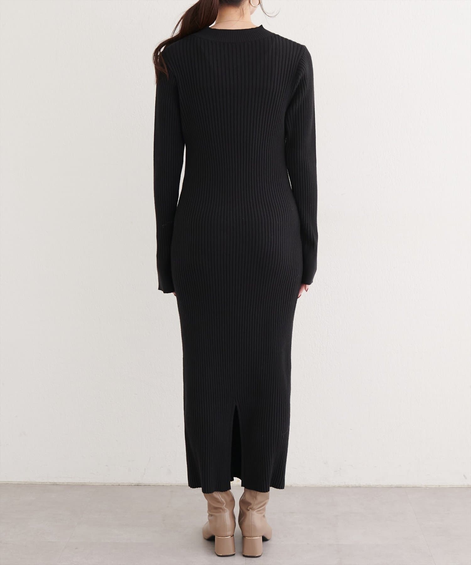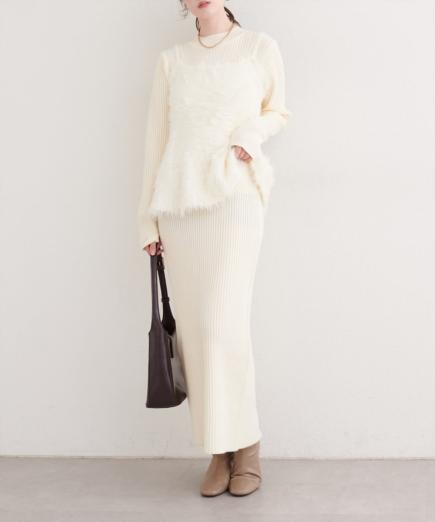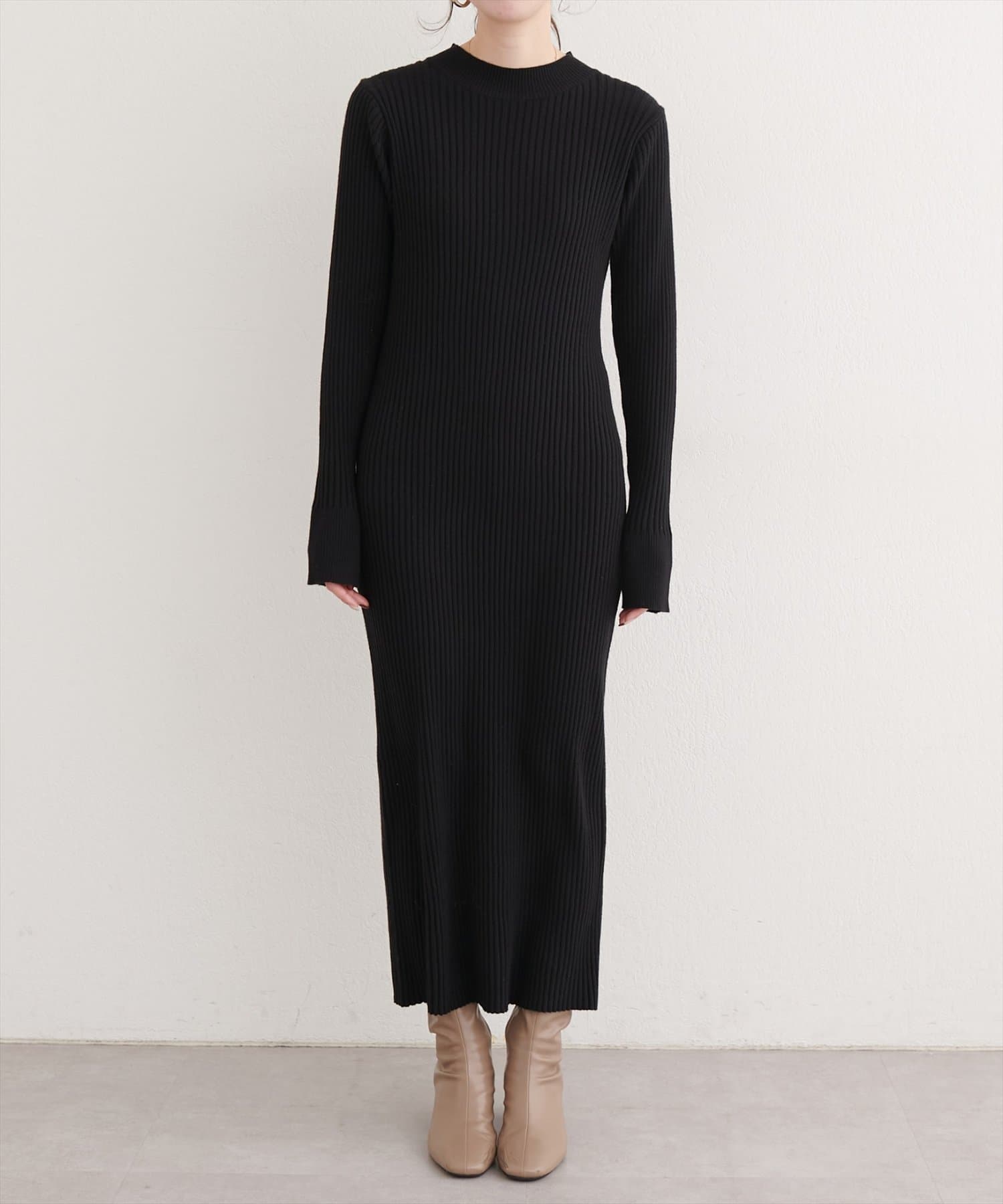 洗練されたリブニットワンピースは、ボディラインを美しく引き立てるIラインシルエット。