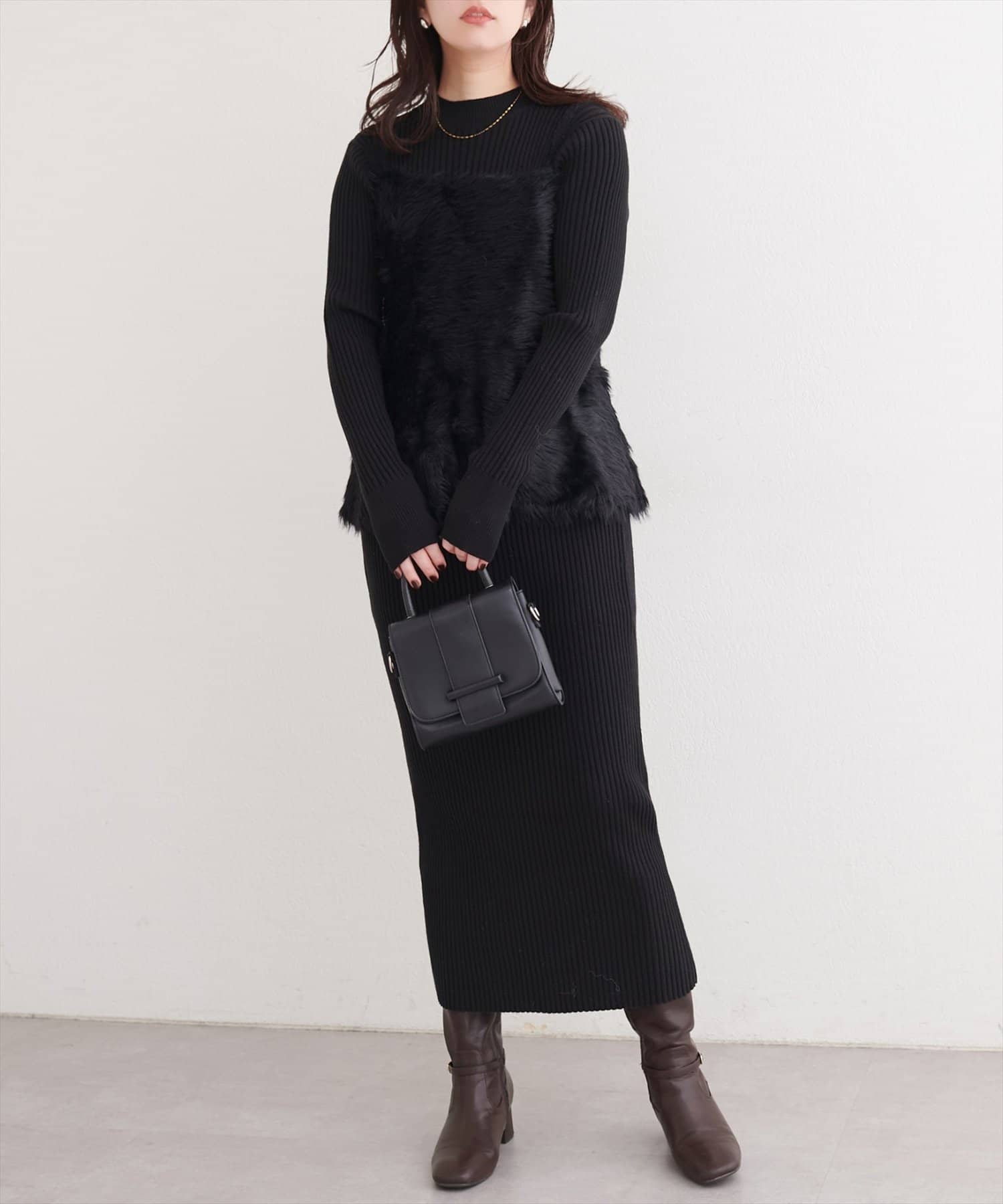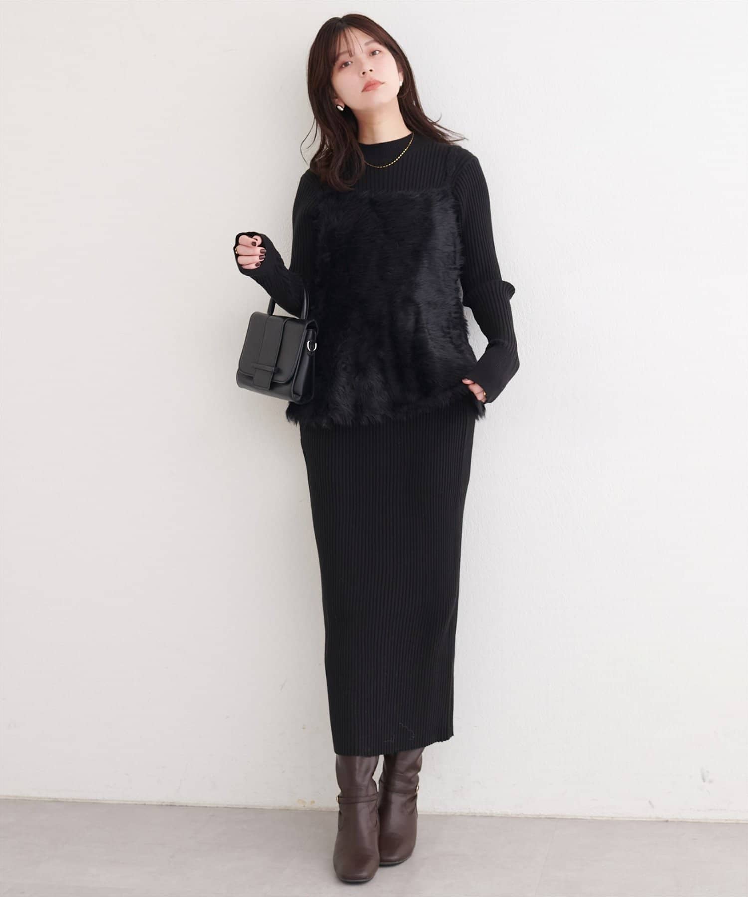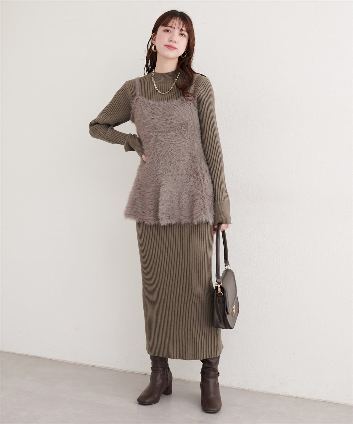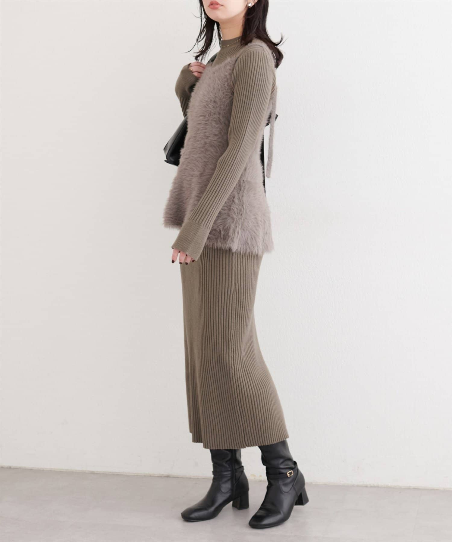 洗練されたリブニットワンピースは、ボディラインを美しく引き立てるIラインシルエット。