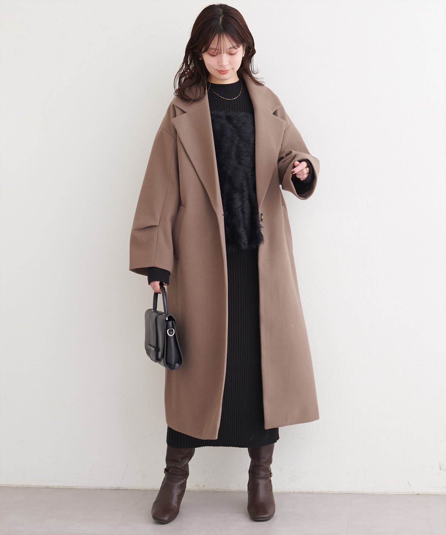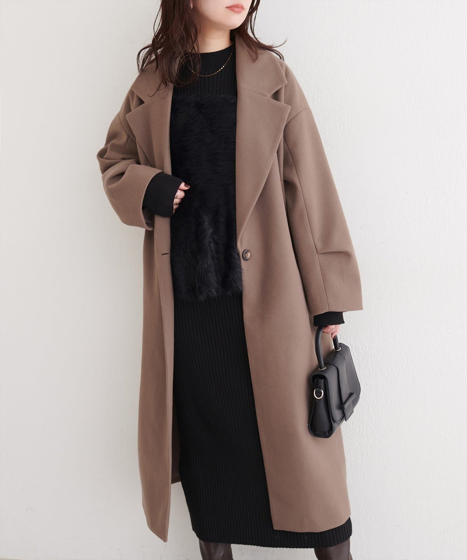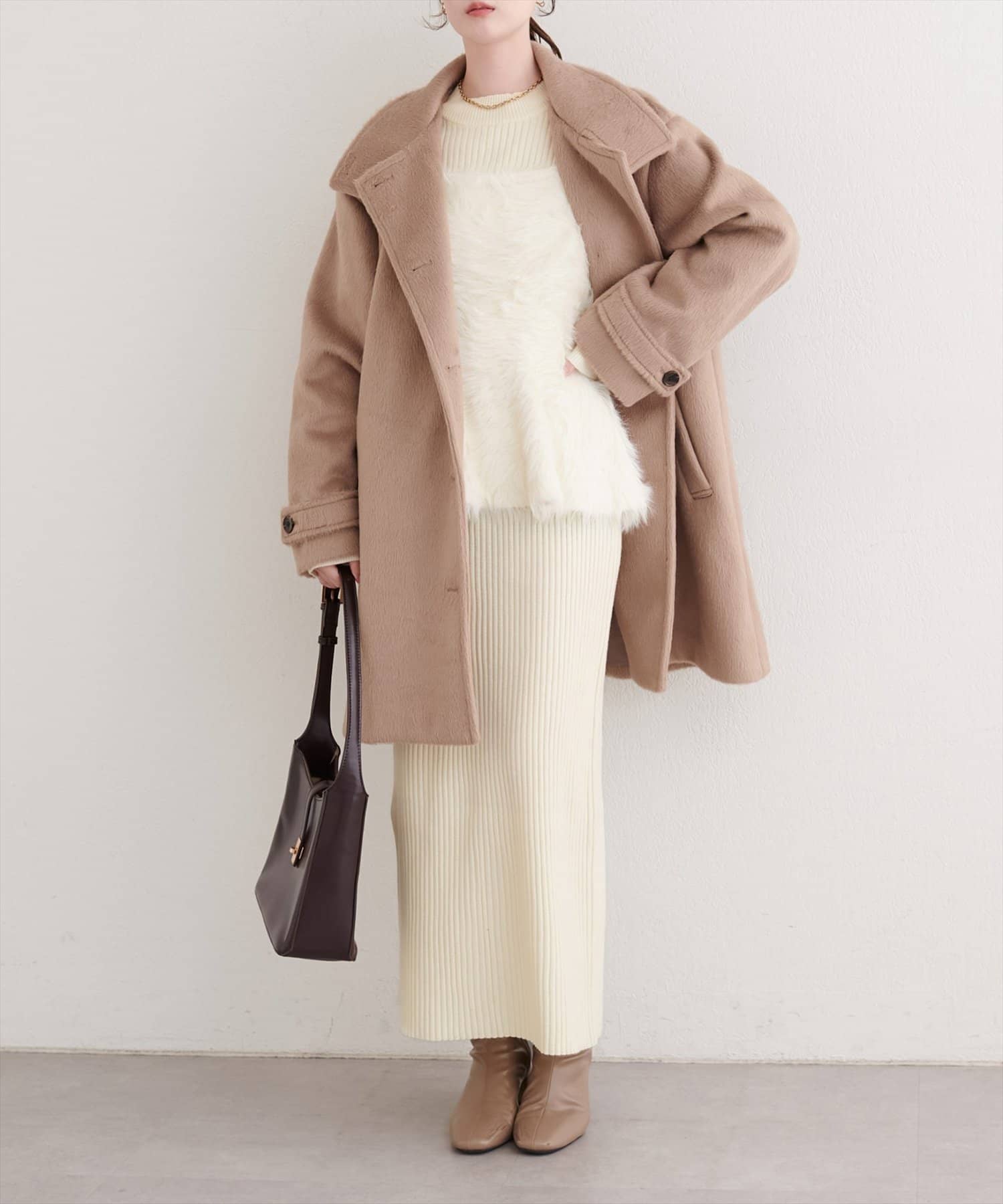 同色のバッグを持てば、洗練されたワントーンスタイルに。