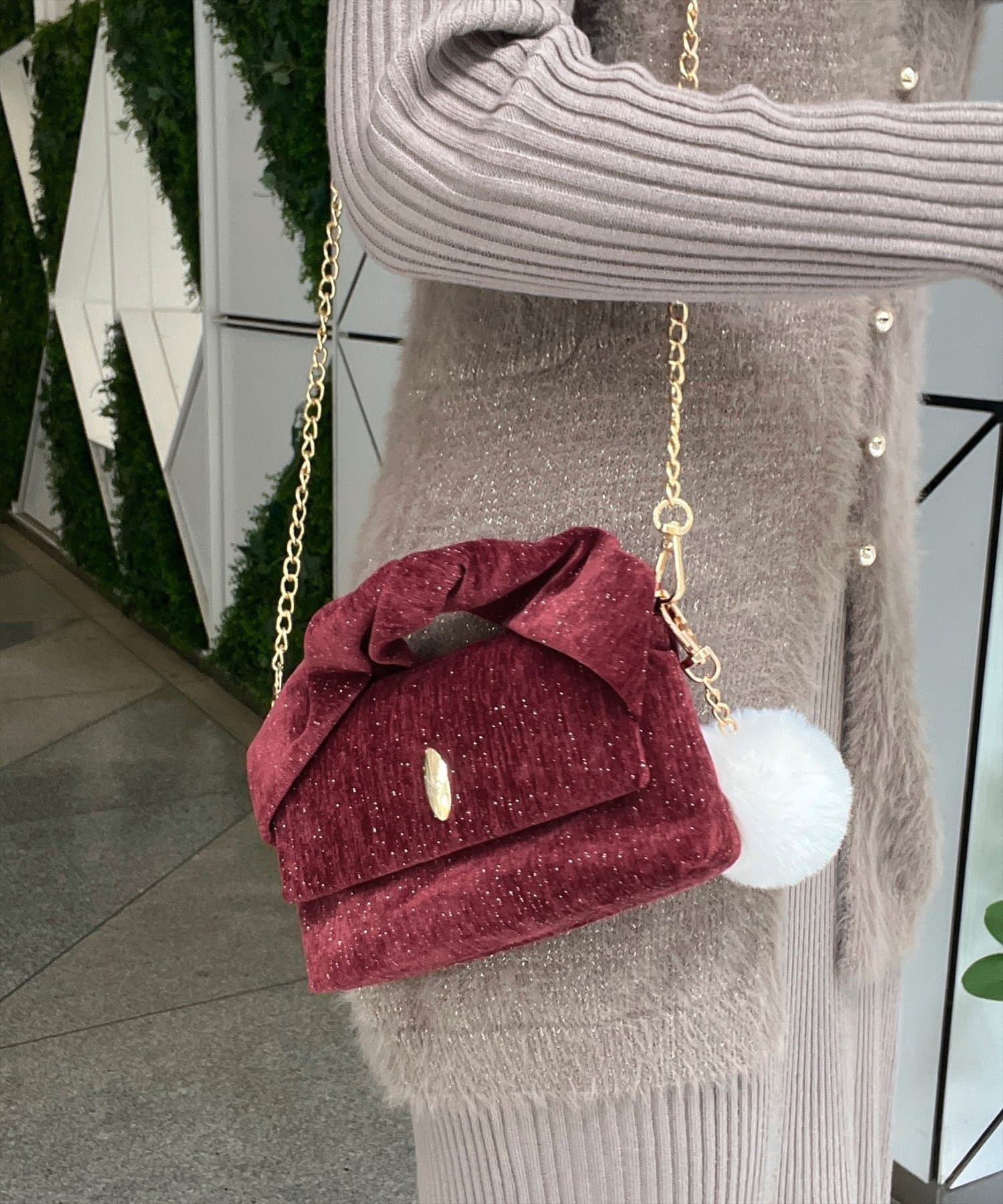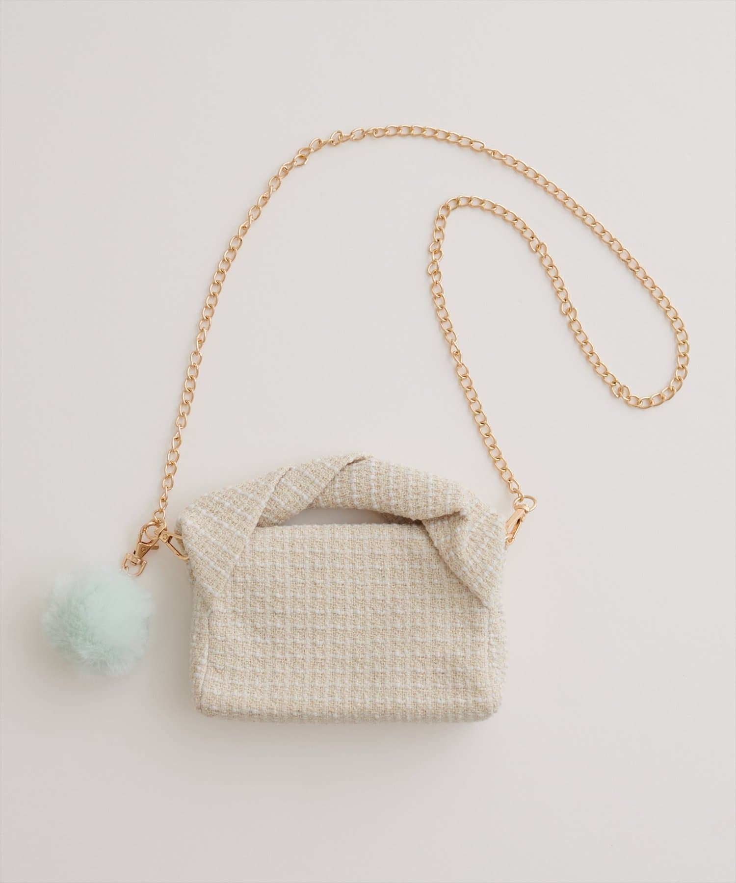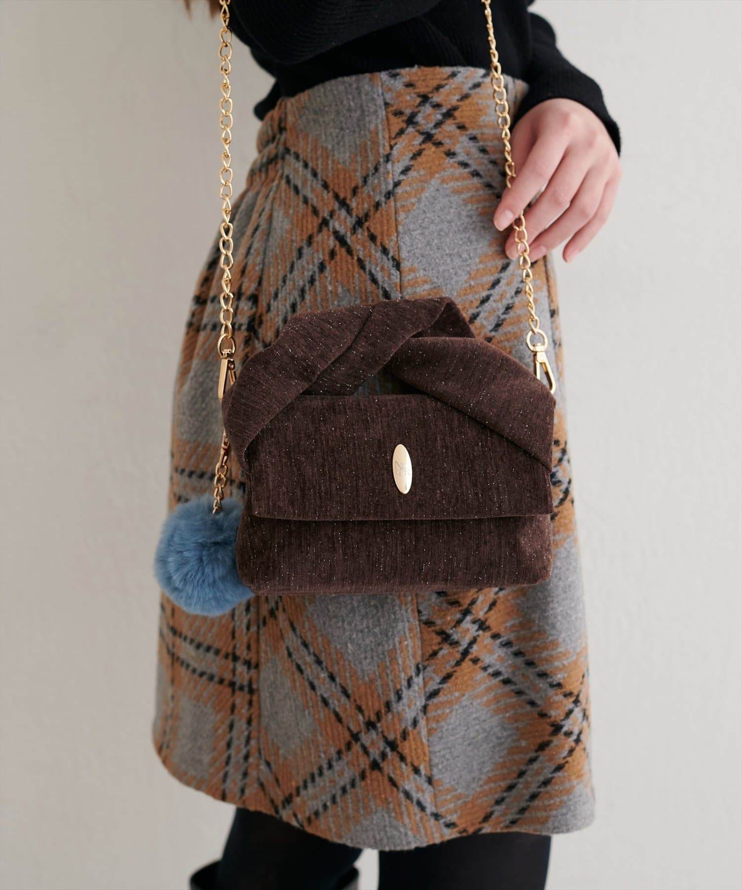 特徴的なねじりデザインは、持つ人の個性を引き立てます。華奢なチェーンストラップが、エレガントな雰囲気をプラス。