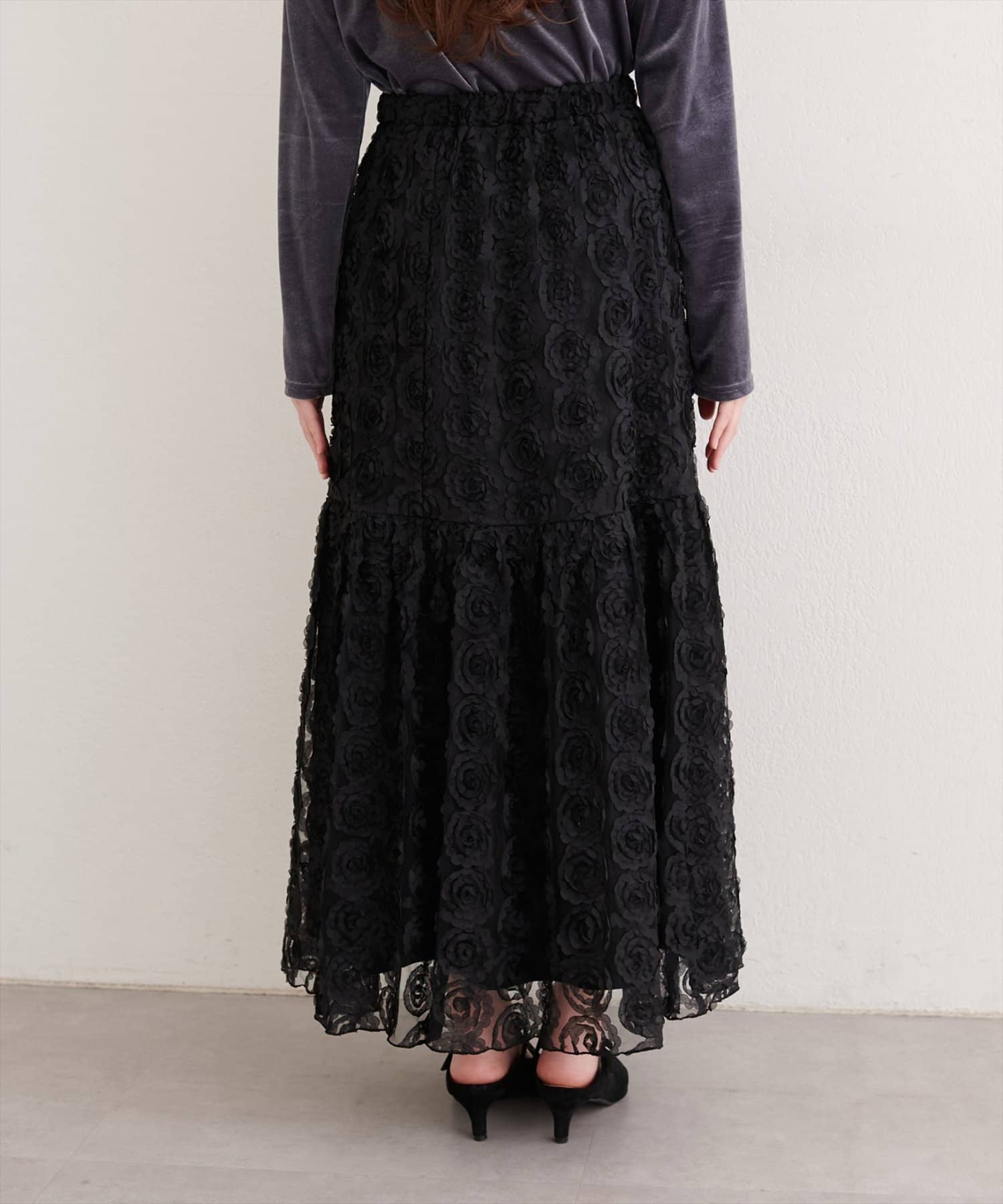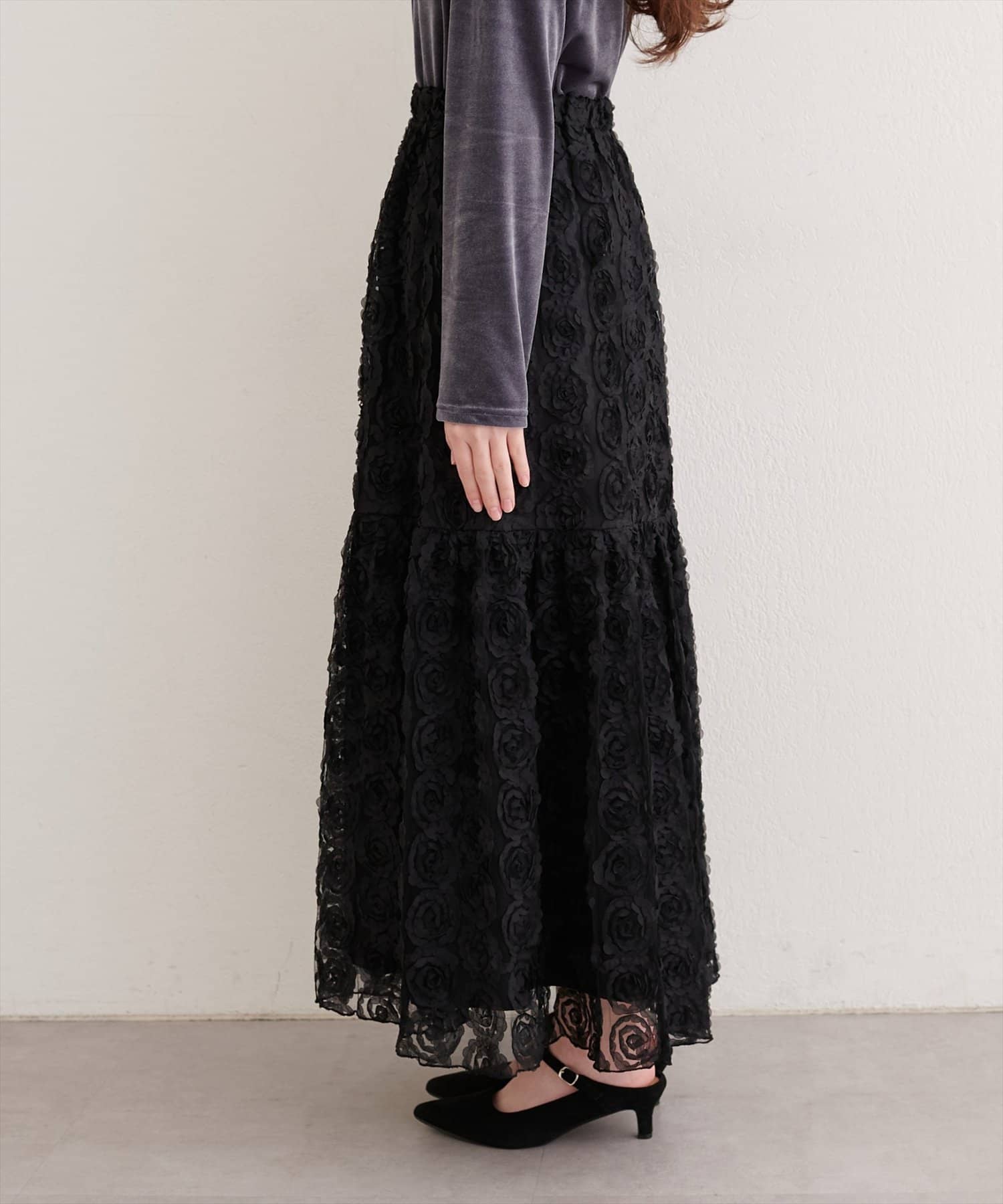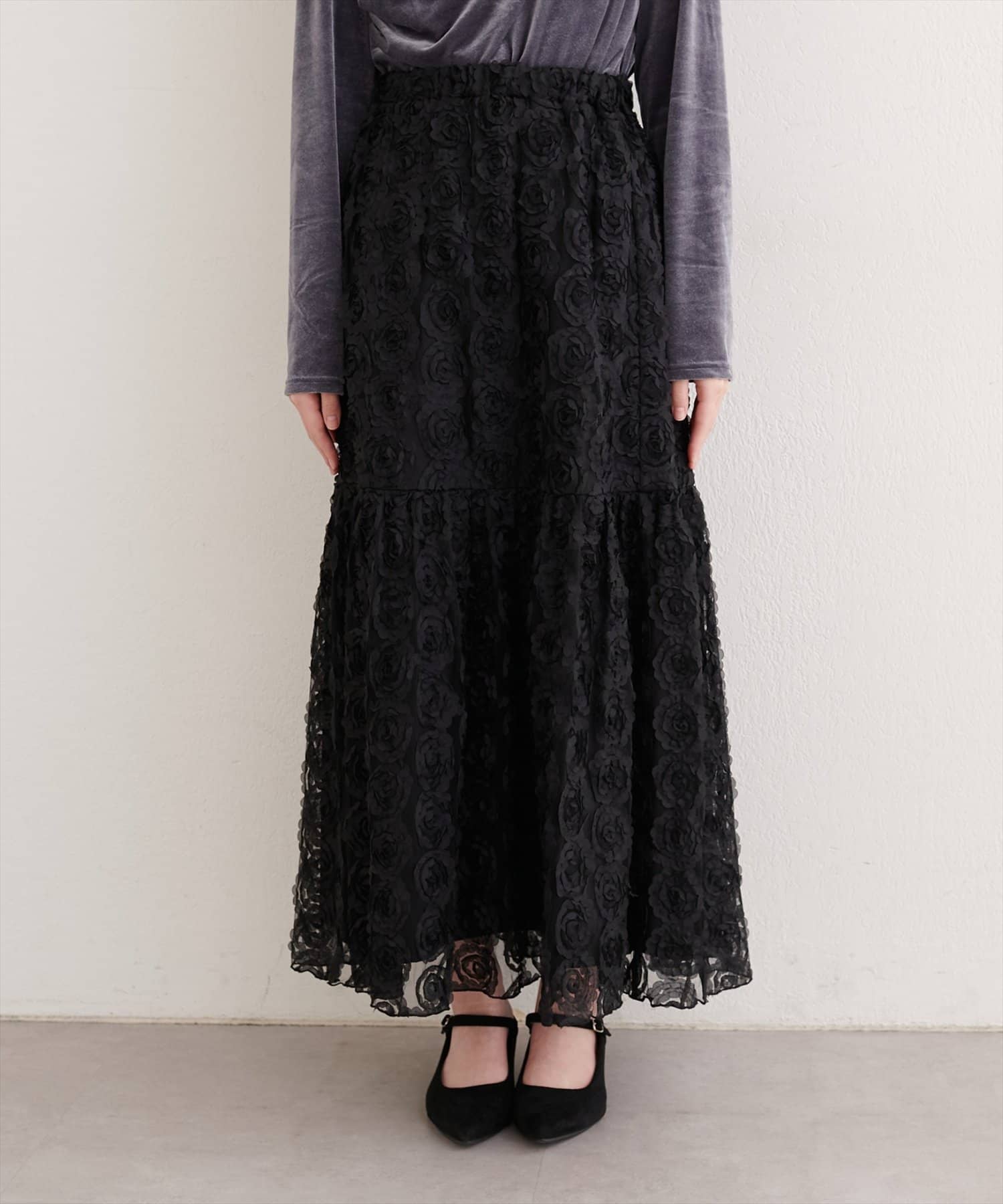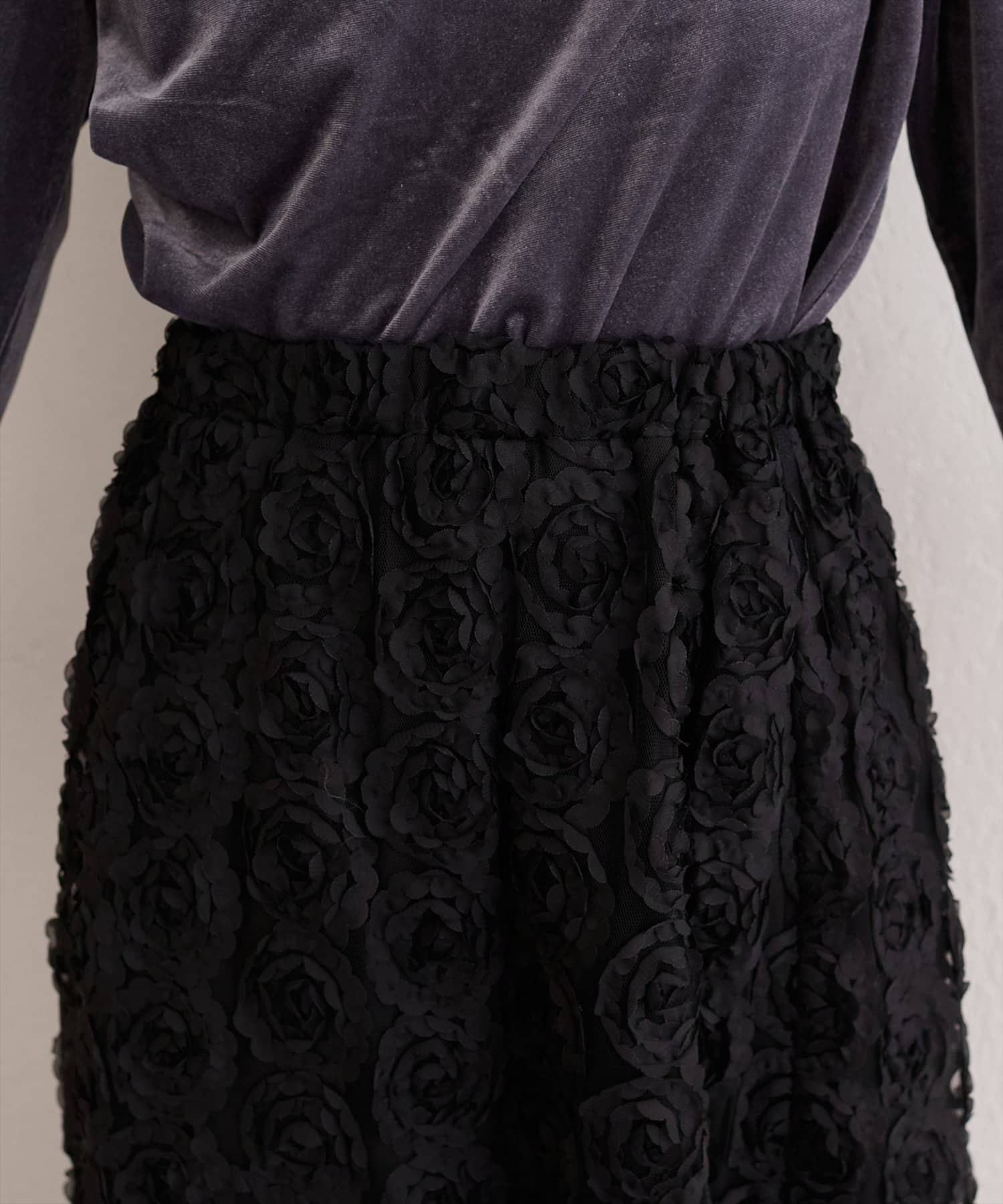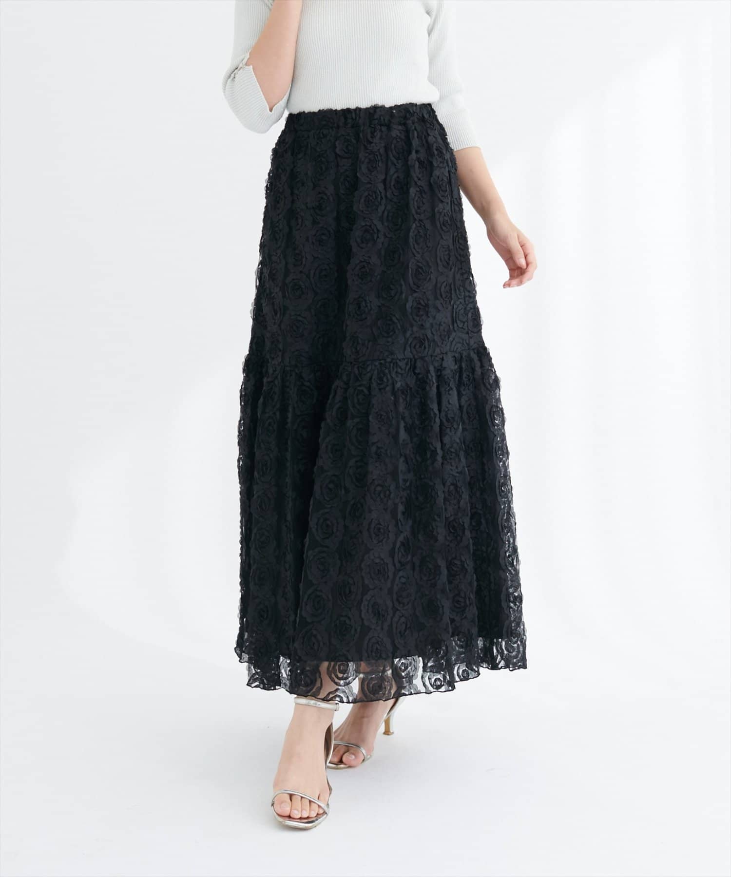 スカート全体を覆う立体的で繊細なフラワーモチーフがポイントのスカート。