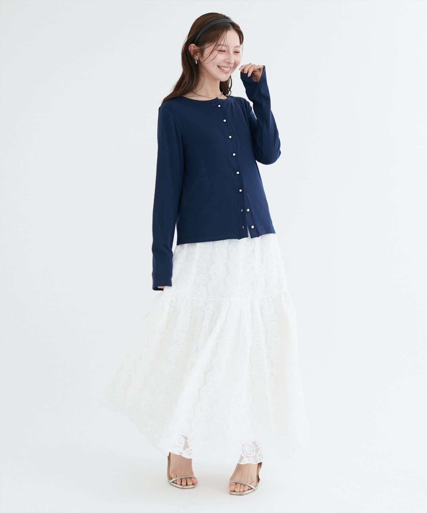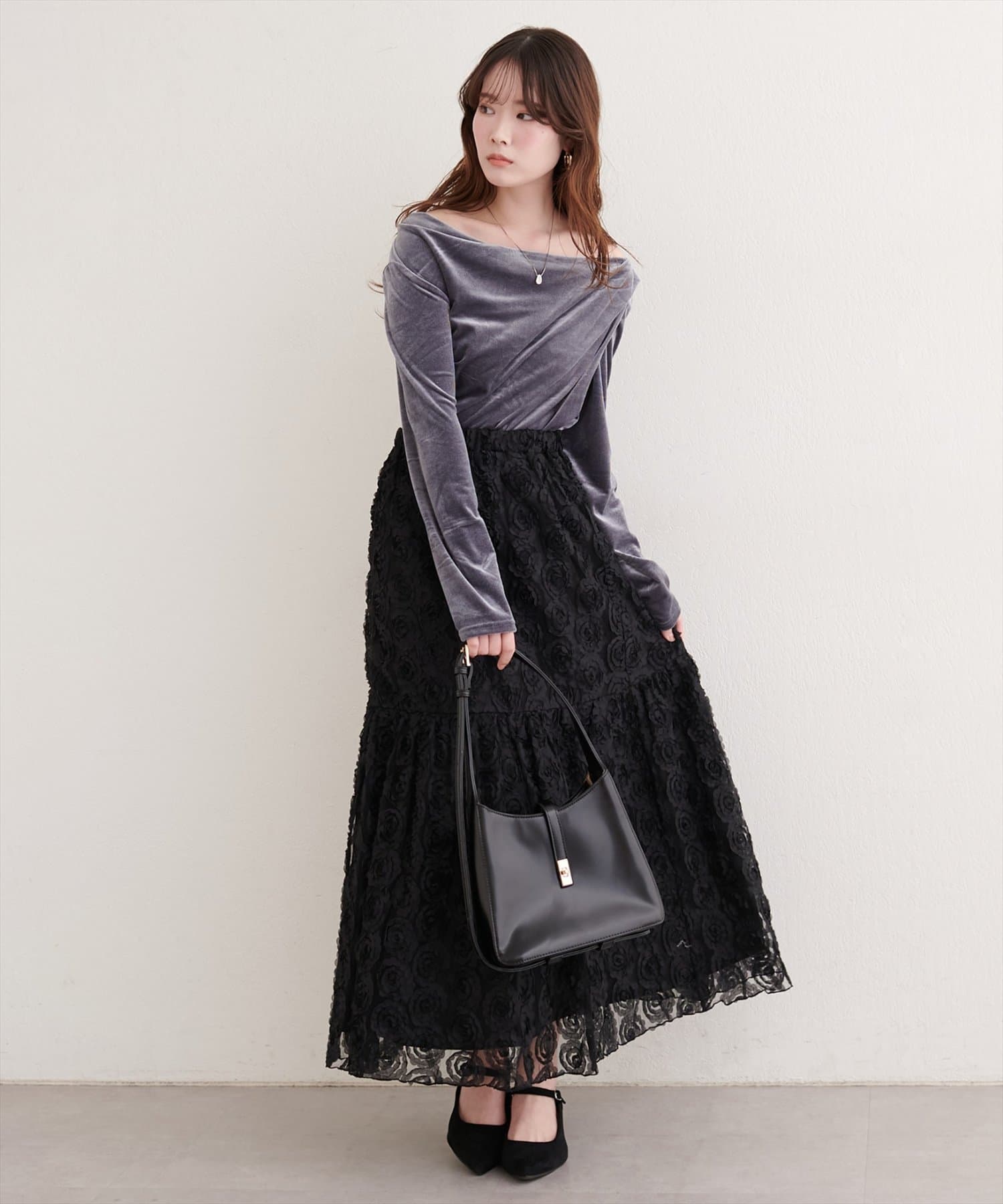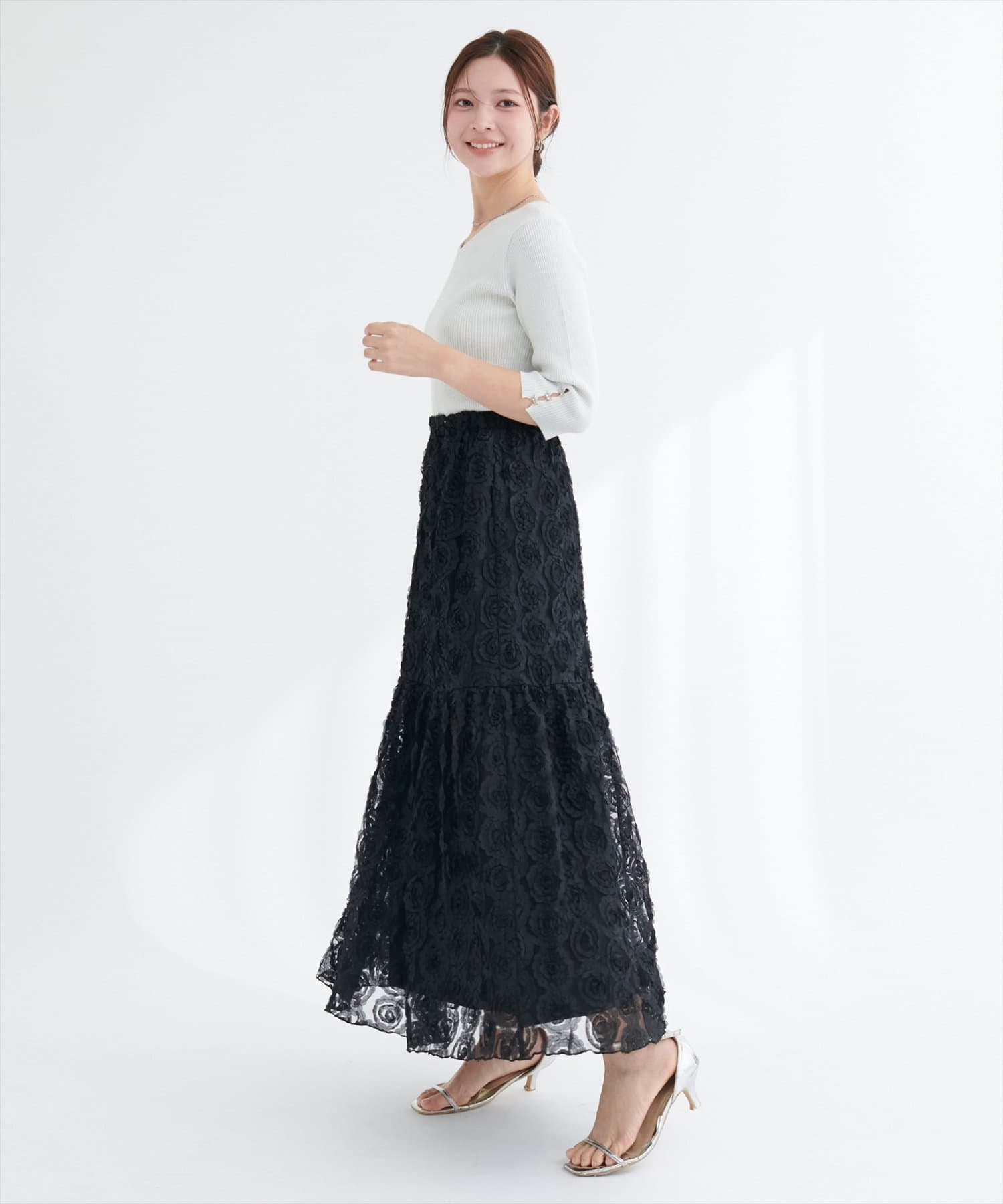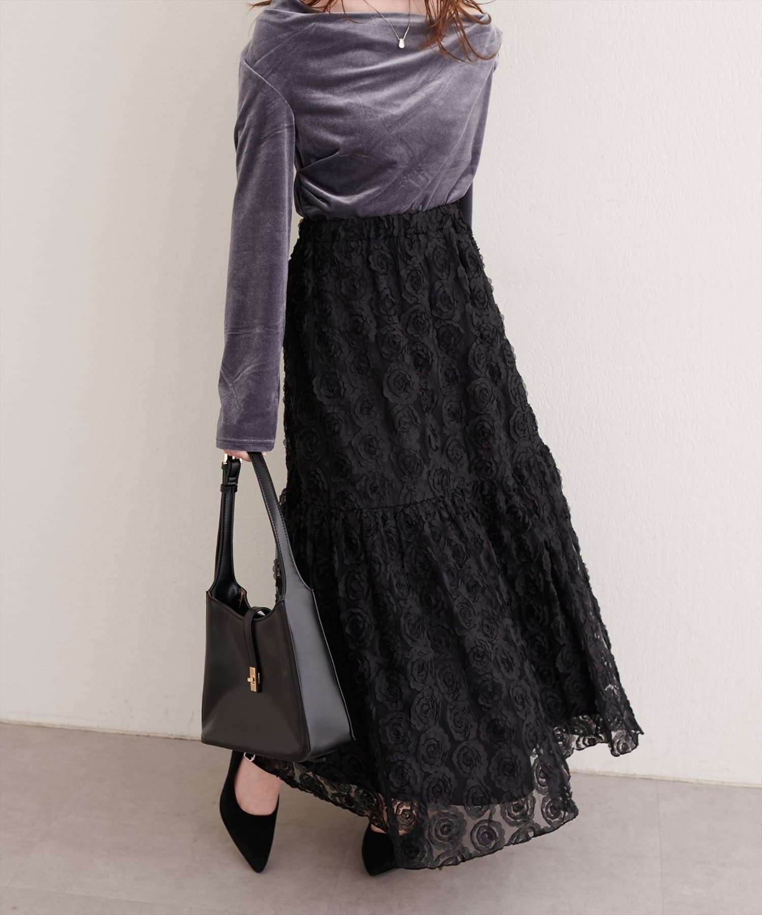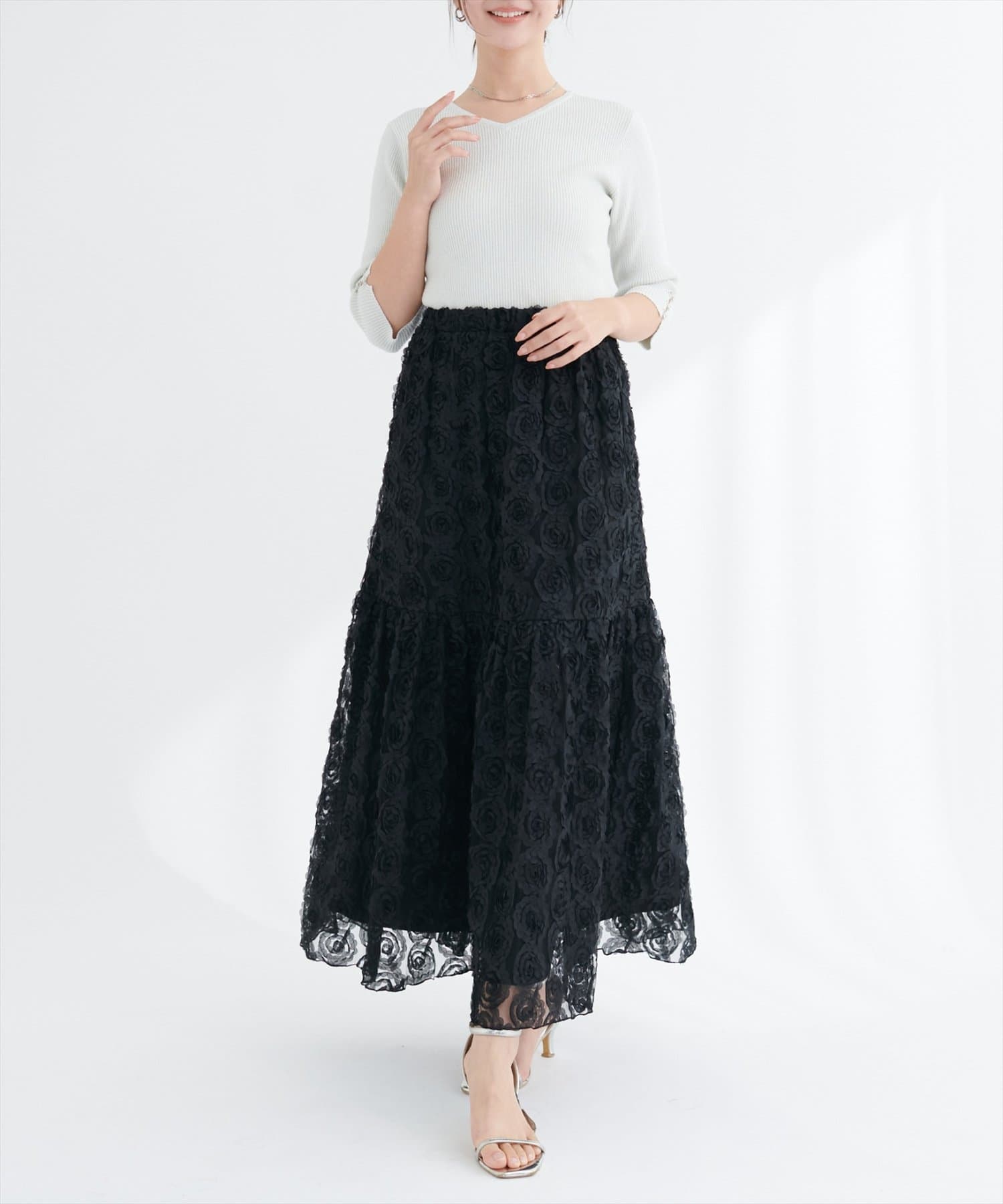 スカート全体を覆う立体的で繊細なフラワーモチーフがポイントのスカート。