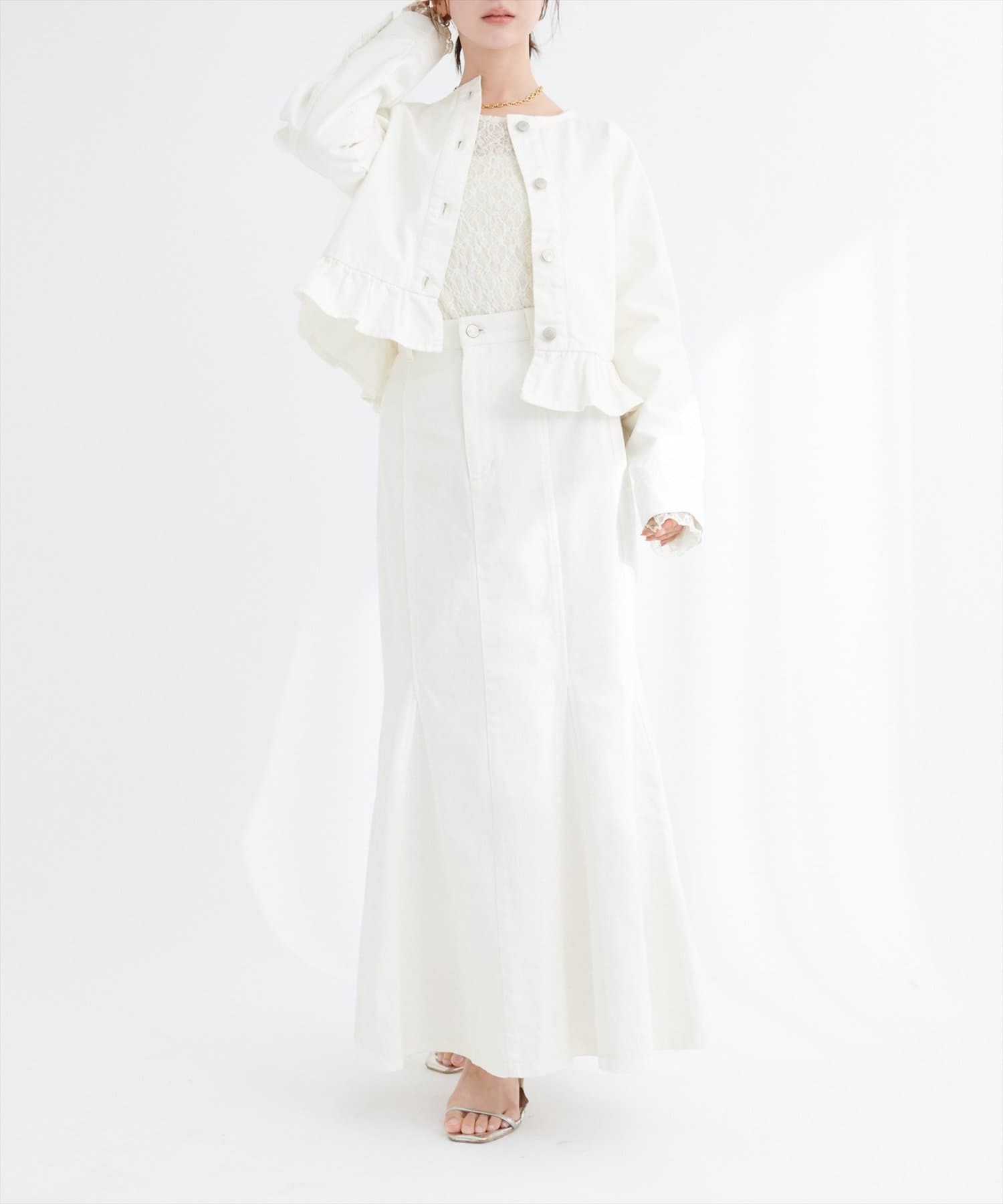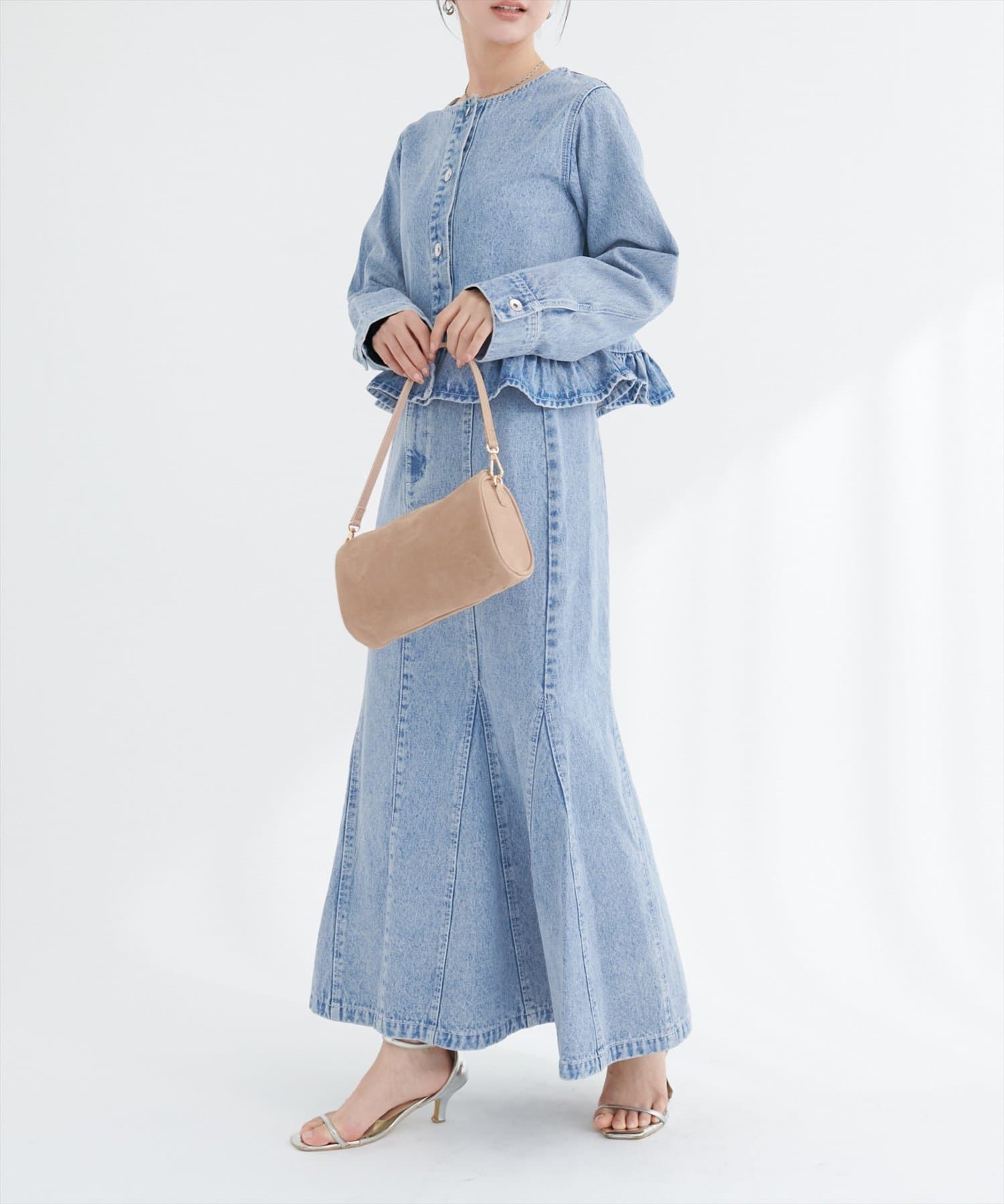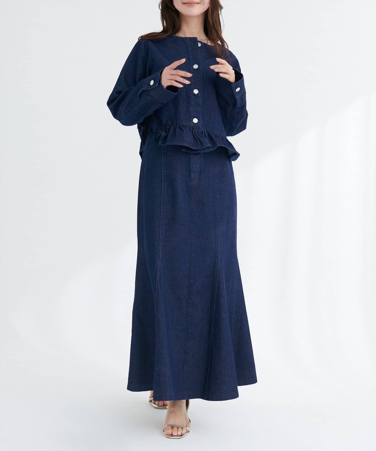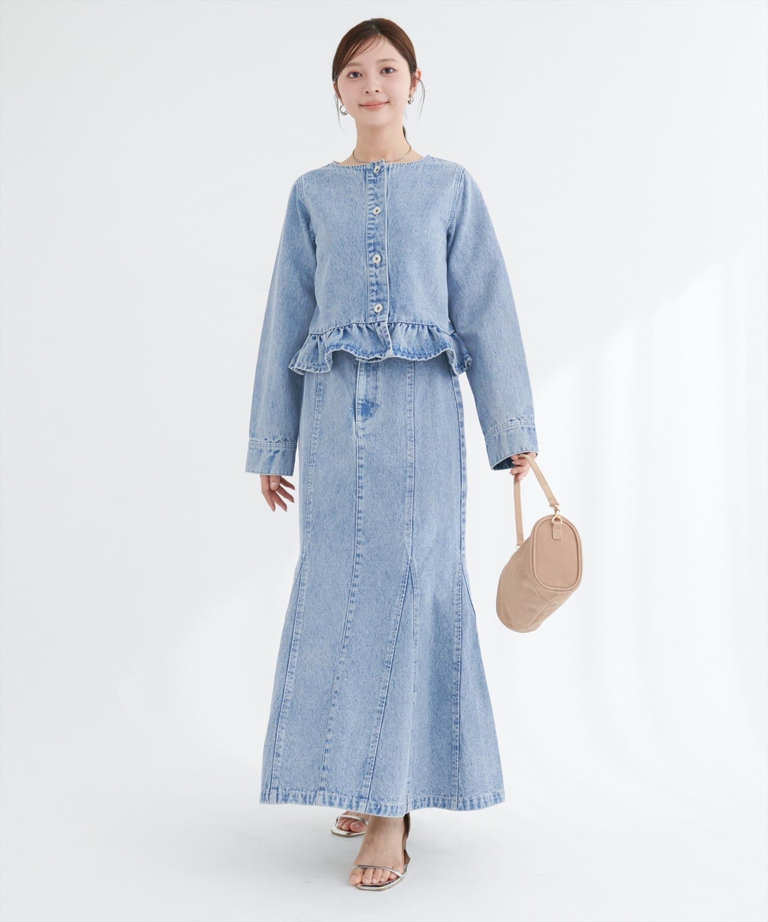 0361070170 ノーカラーペプラムデニムジャケットと合わせればセットアップ風コーデに♪