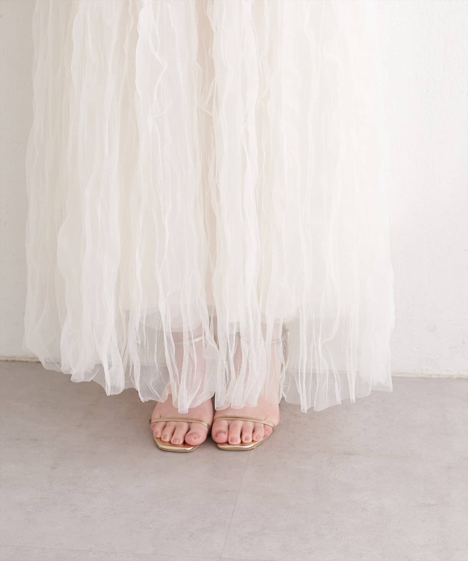 歩くたびに繊細なドレープが優雅に揺らめき、女性らしさを引き立てます。