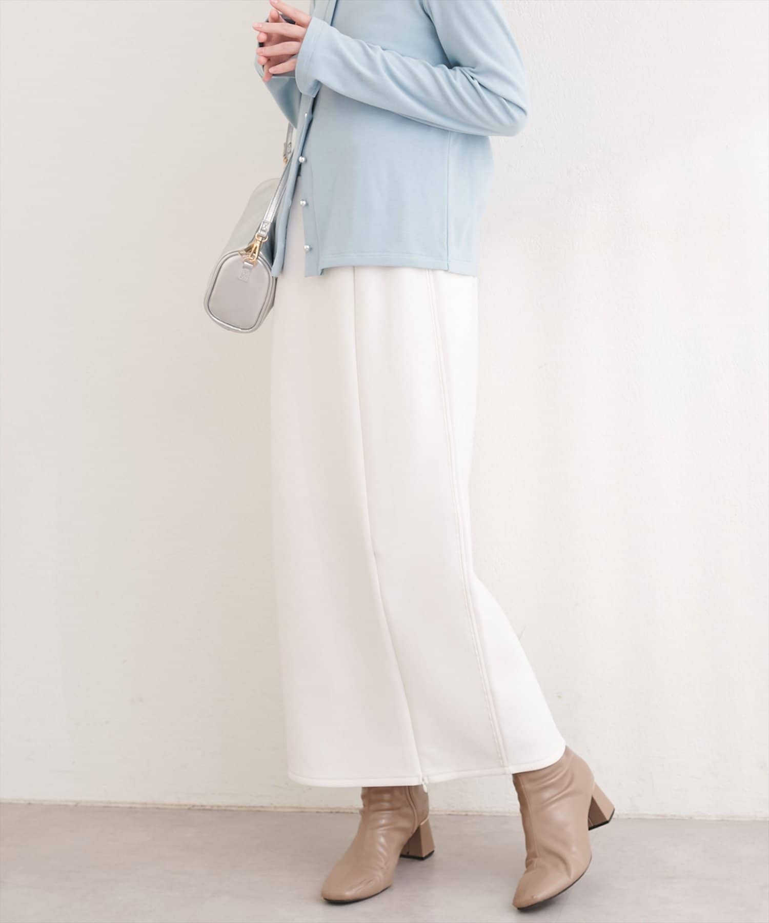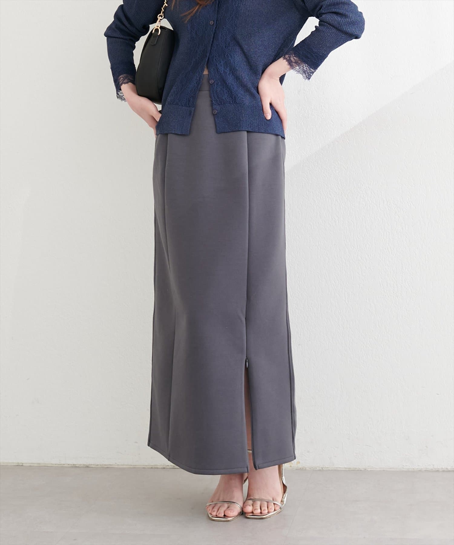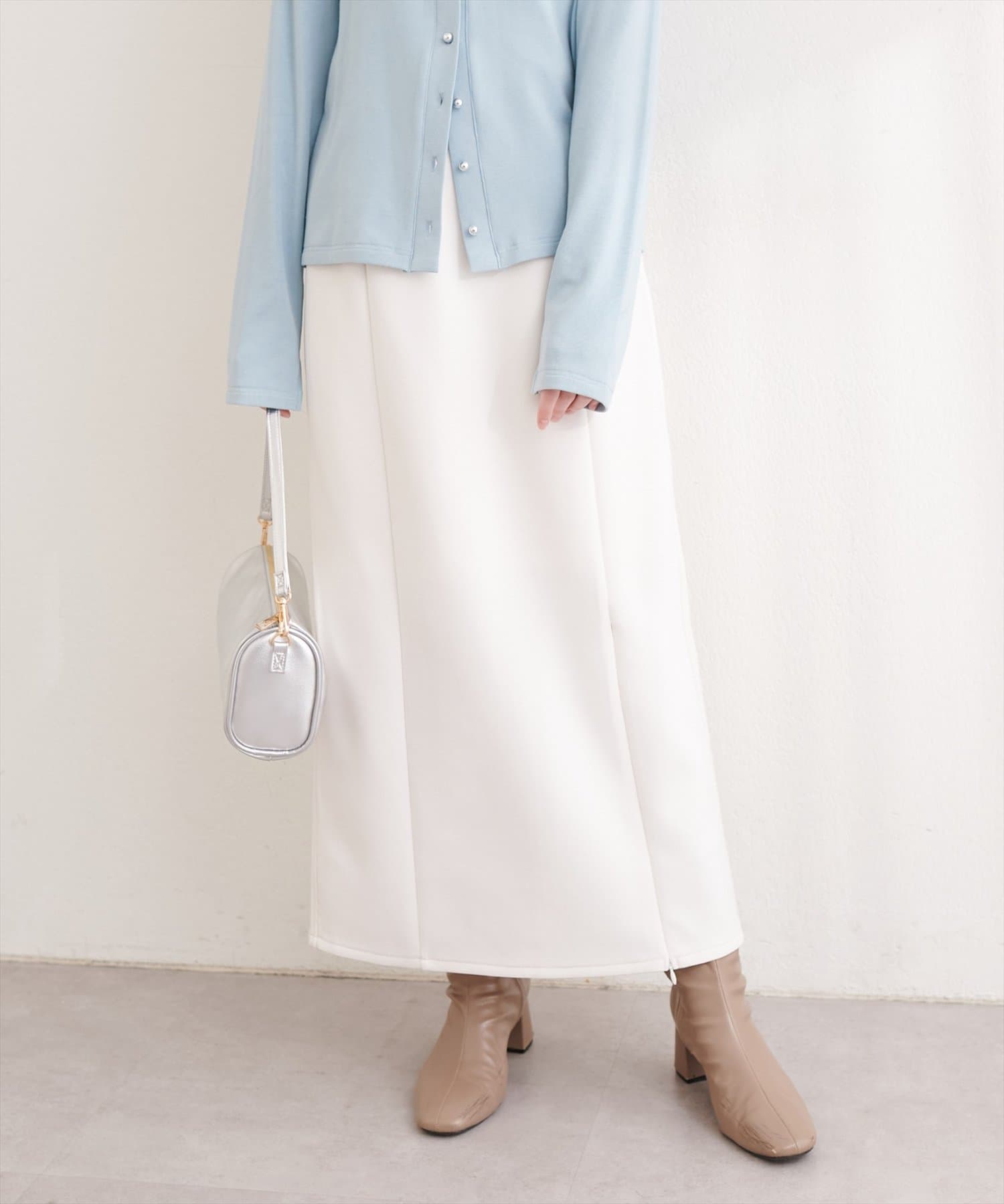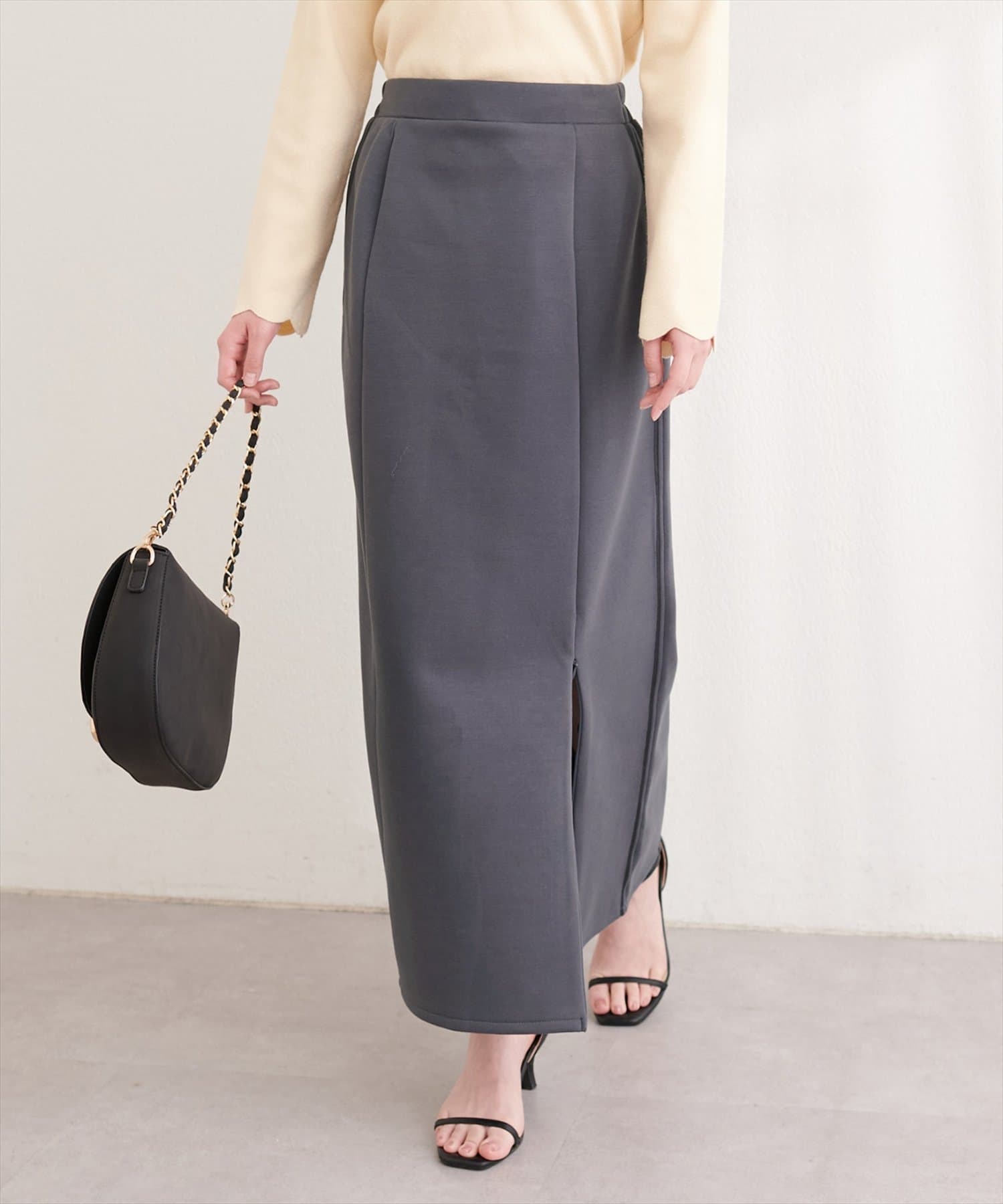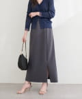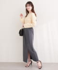 トップスにボリュームのあるアイテムを合わせることで、スカートのナローシルエットが際立ち、