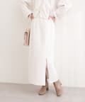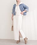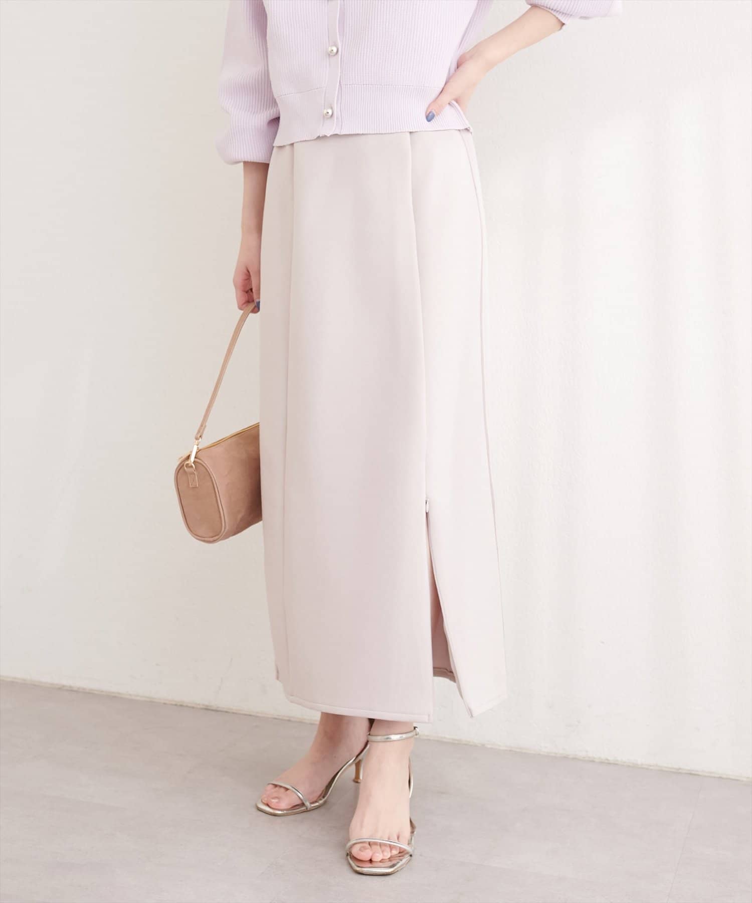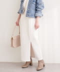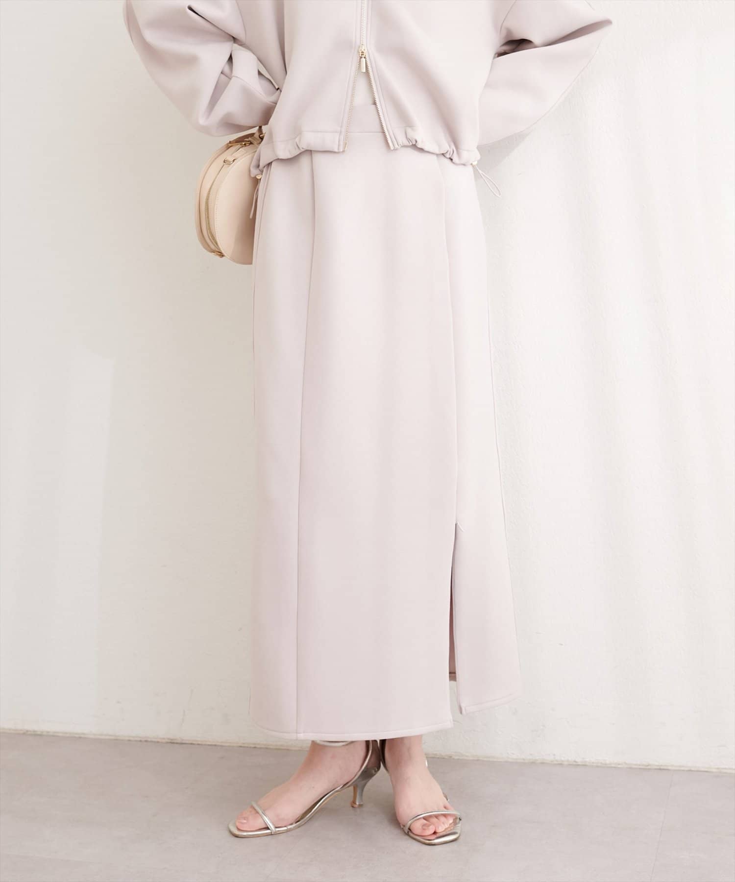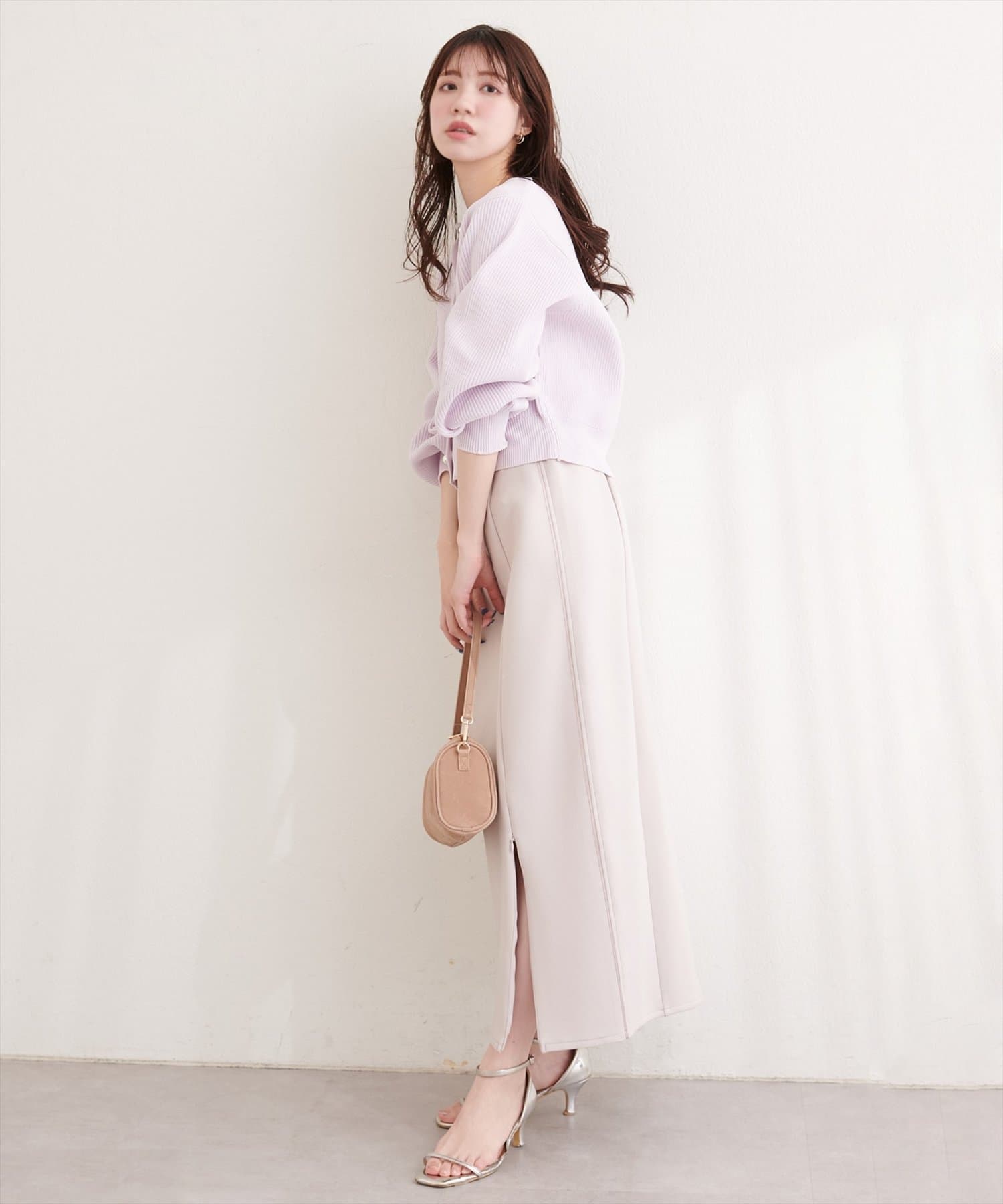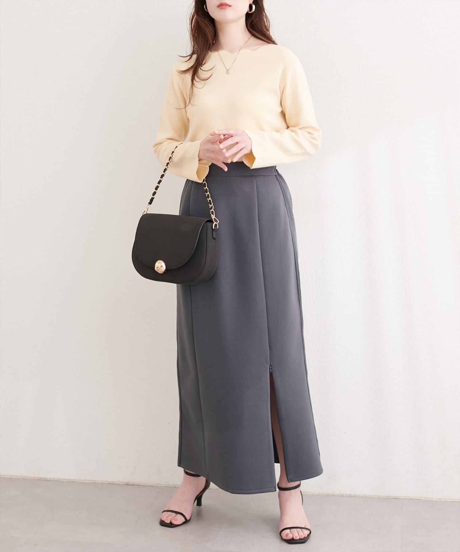 トップスにボリュームのあるアイテムを合わせることで、スカートのナローシルエットが際立ち、
