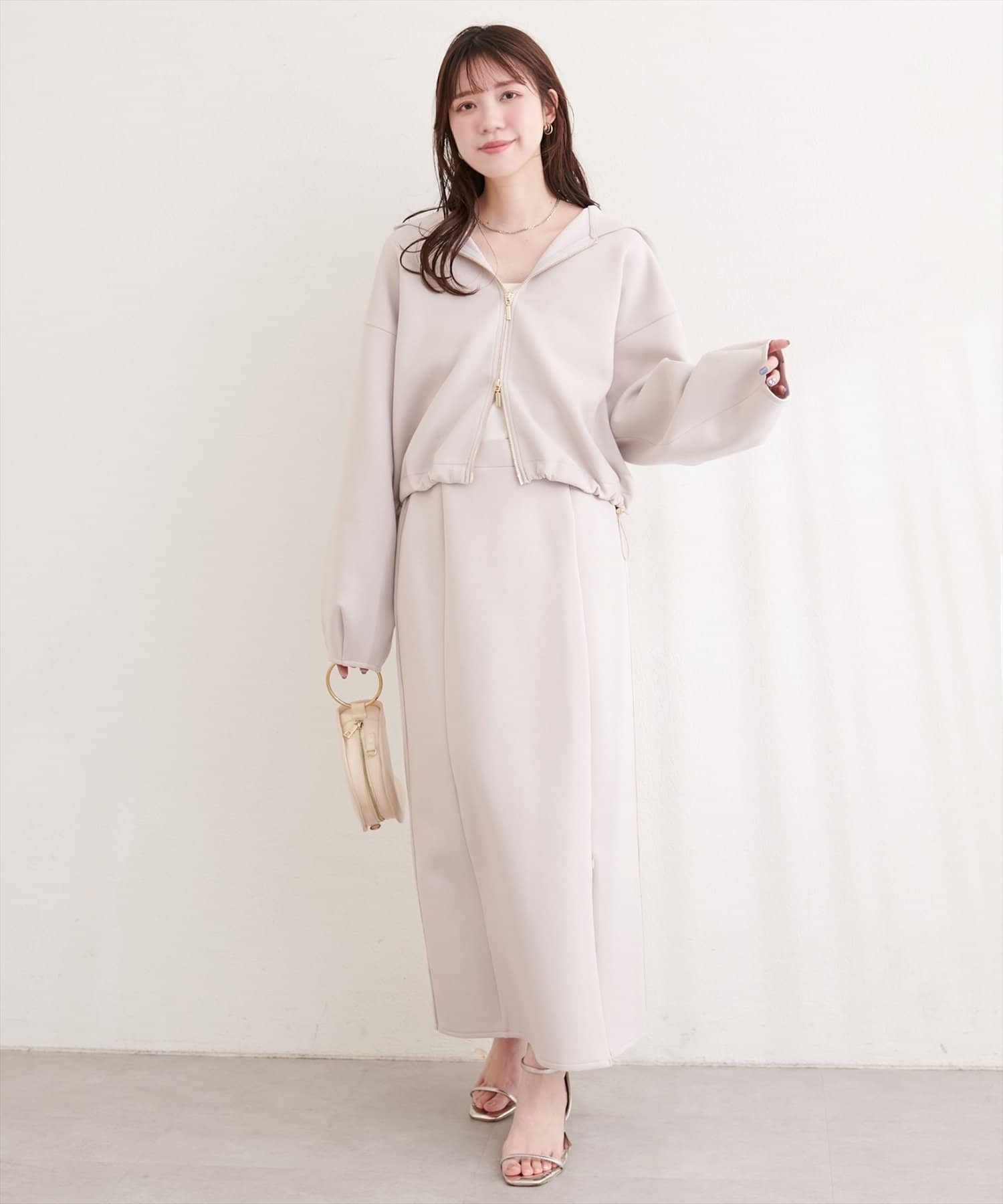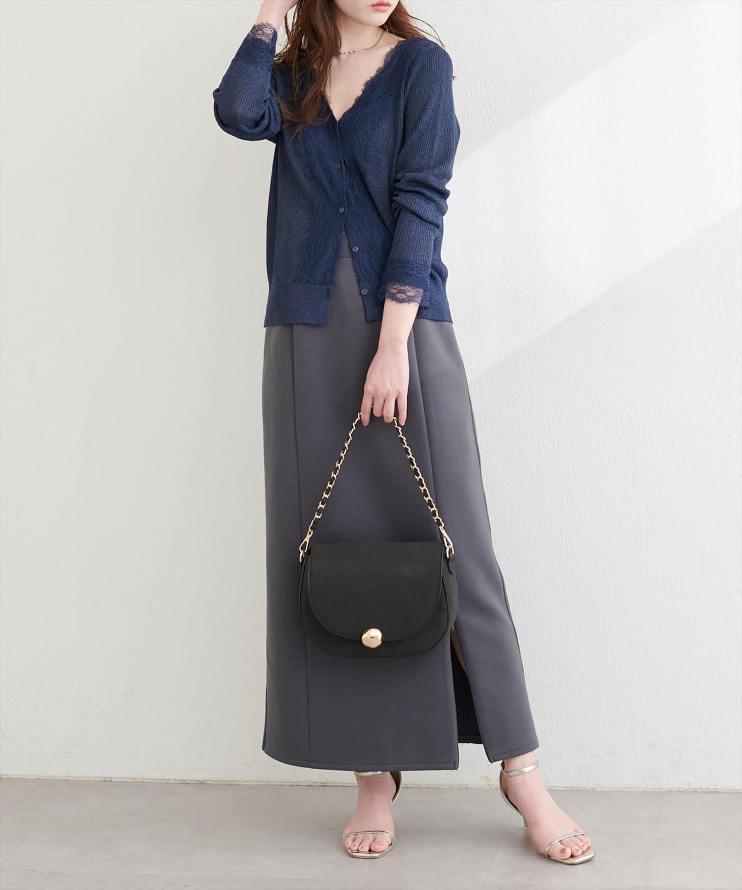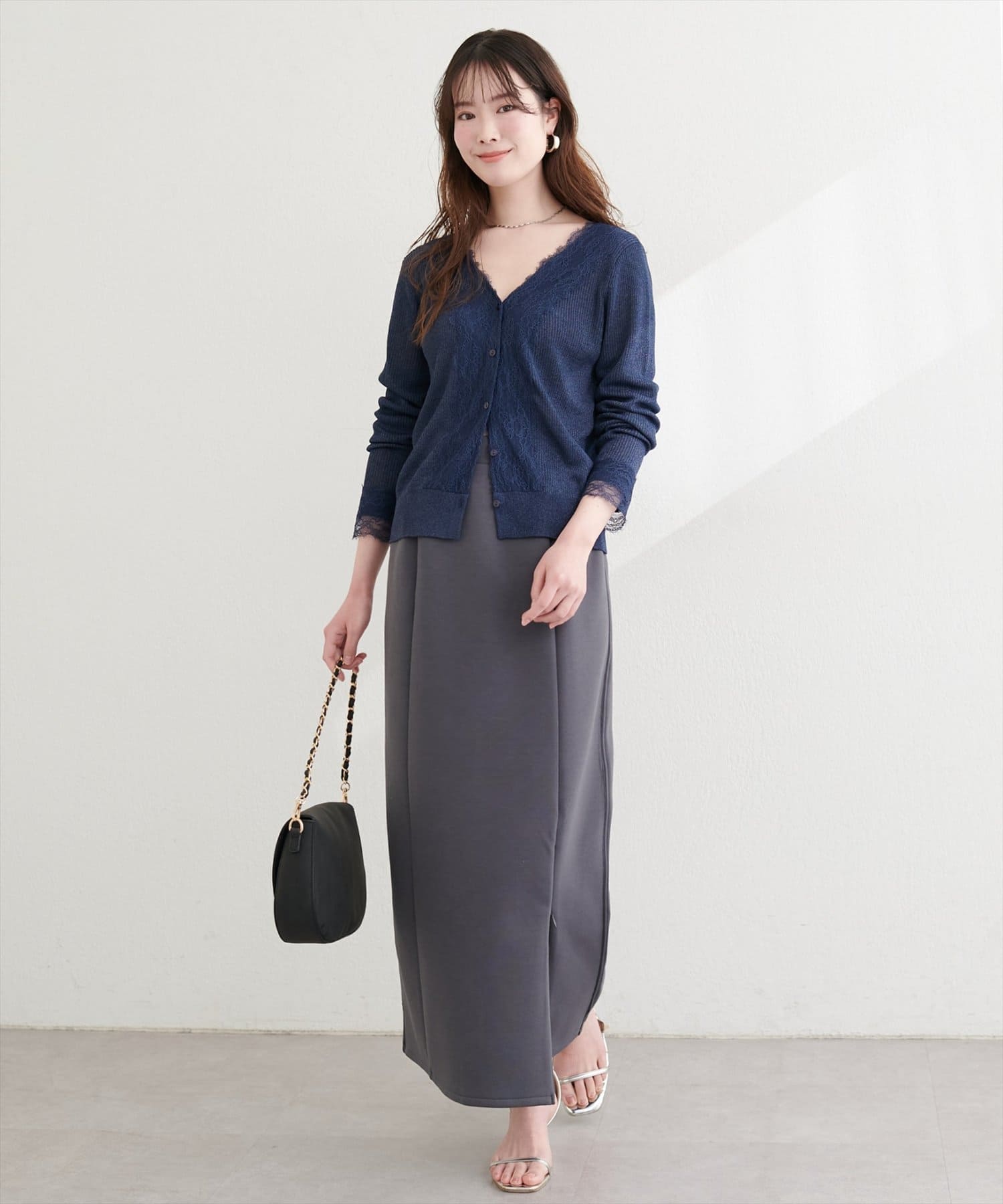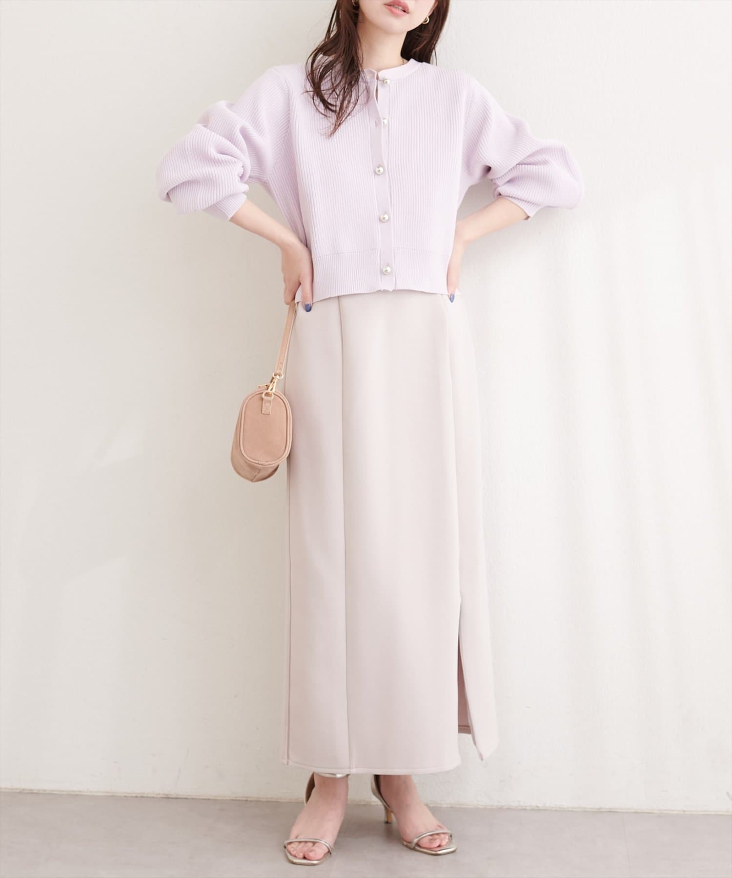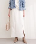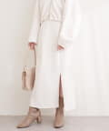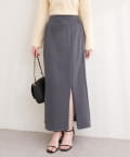 トップスにボリュームのあるアイテムを合わせることで、スカートのナローシルエットが際立ち、
