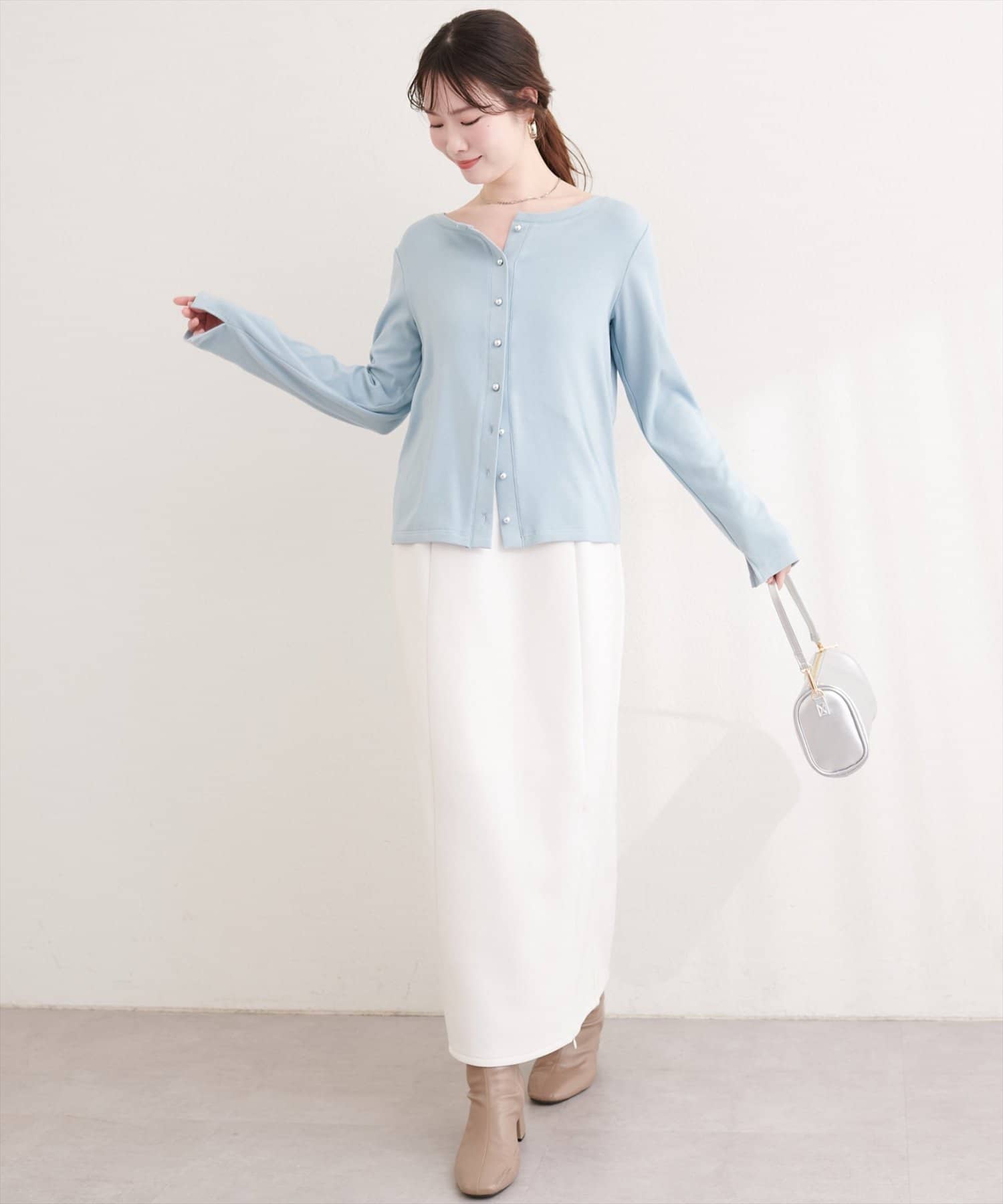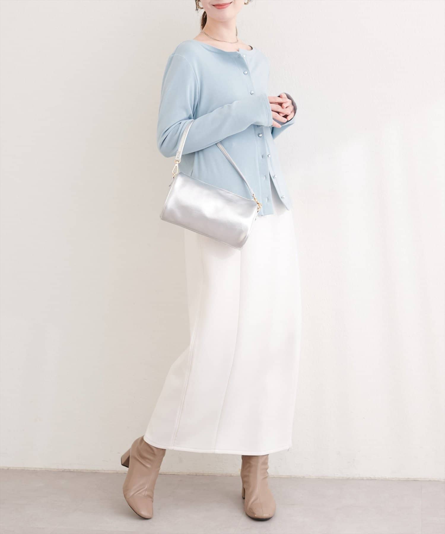 今の季節なら、ふんわりニットと合わせて、上品で温かみのあるコーディネートに。
