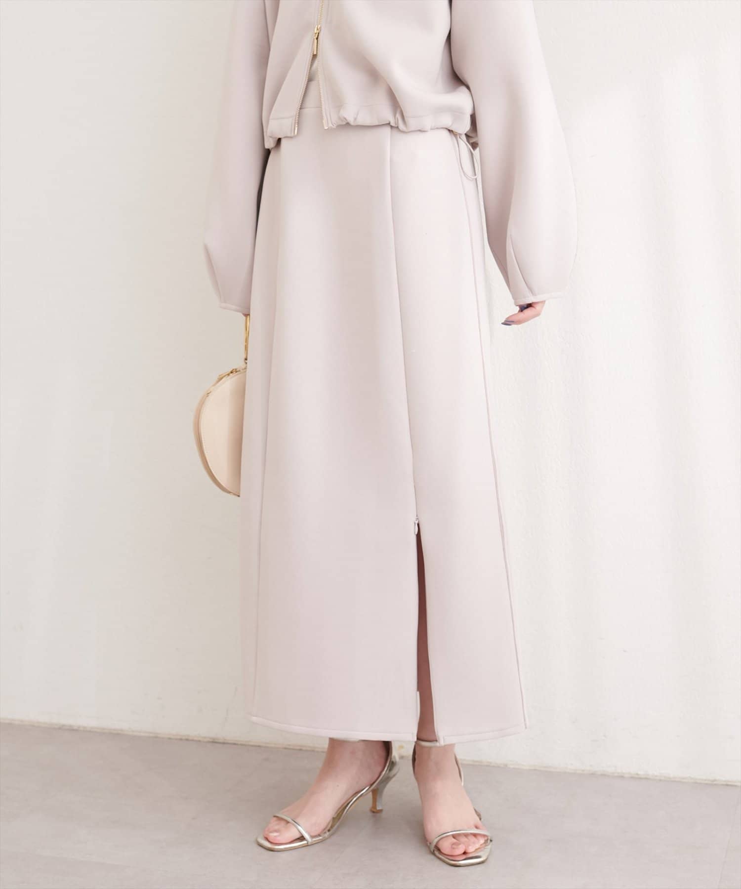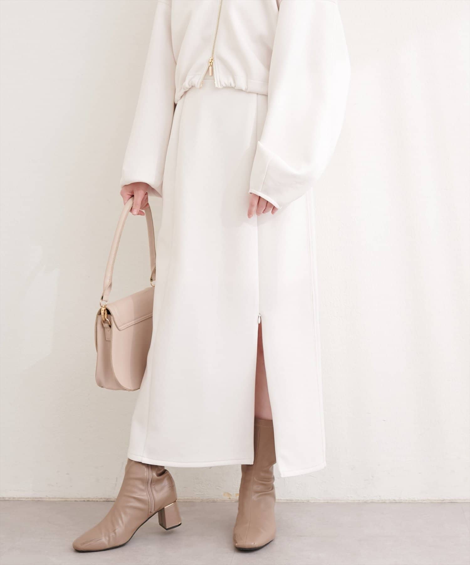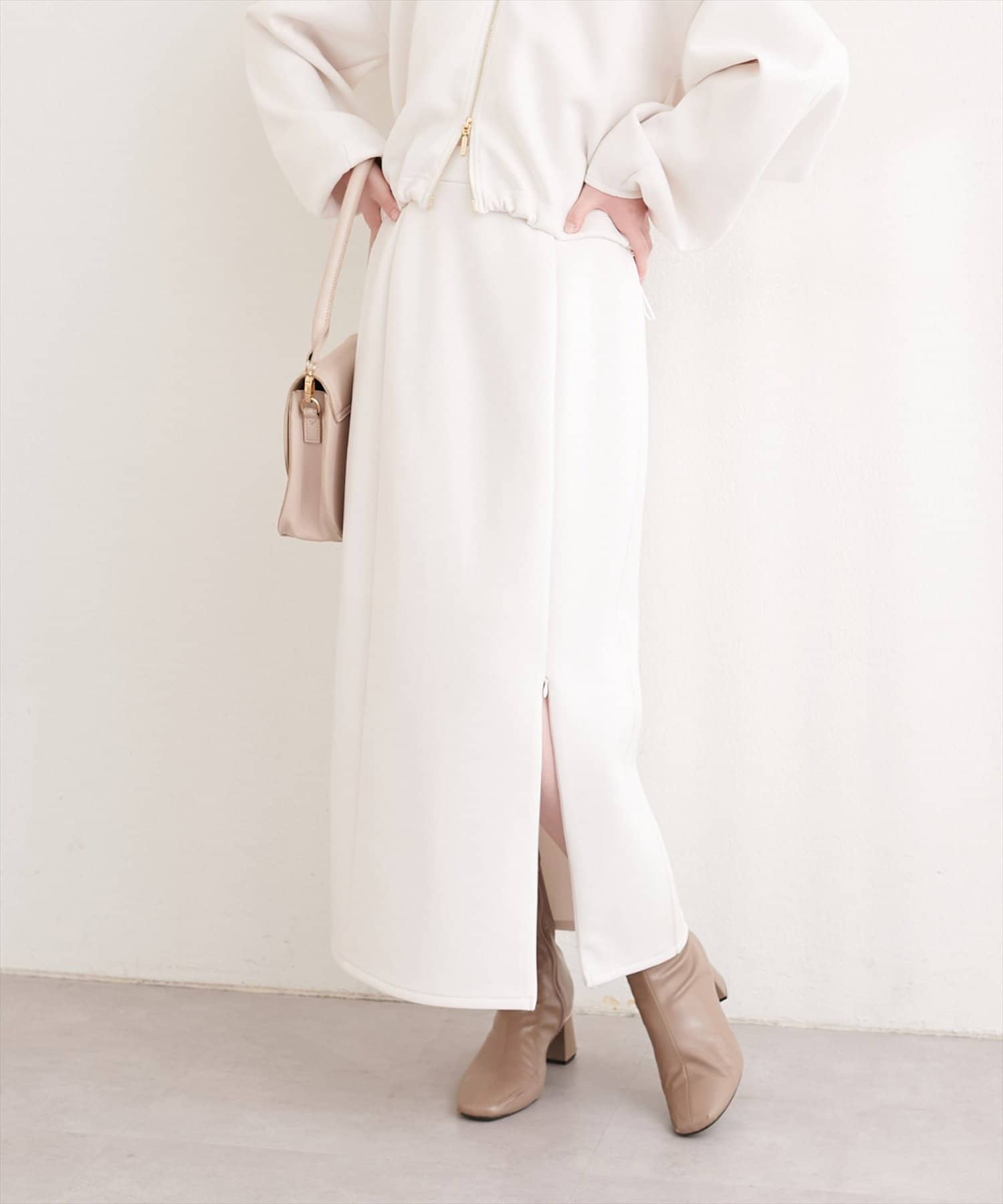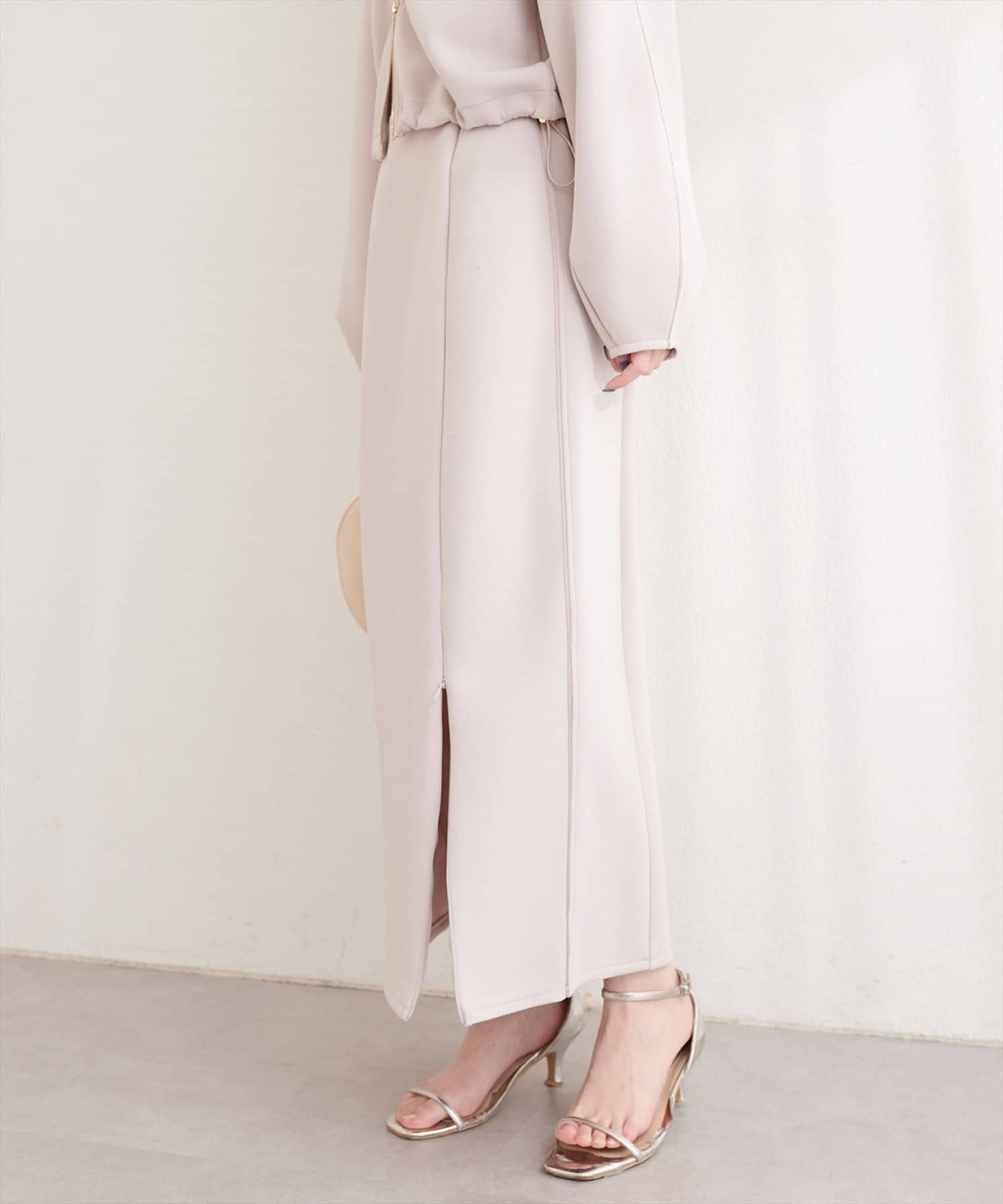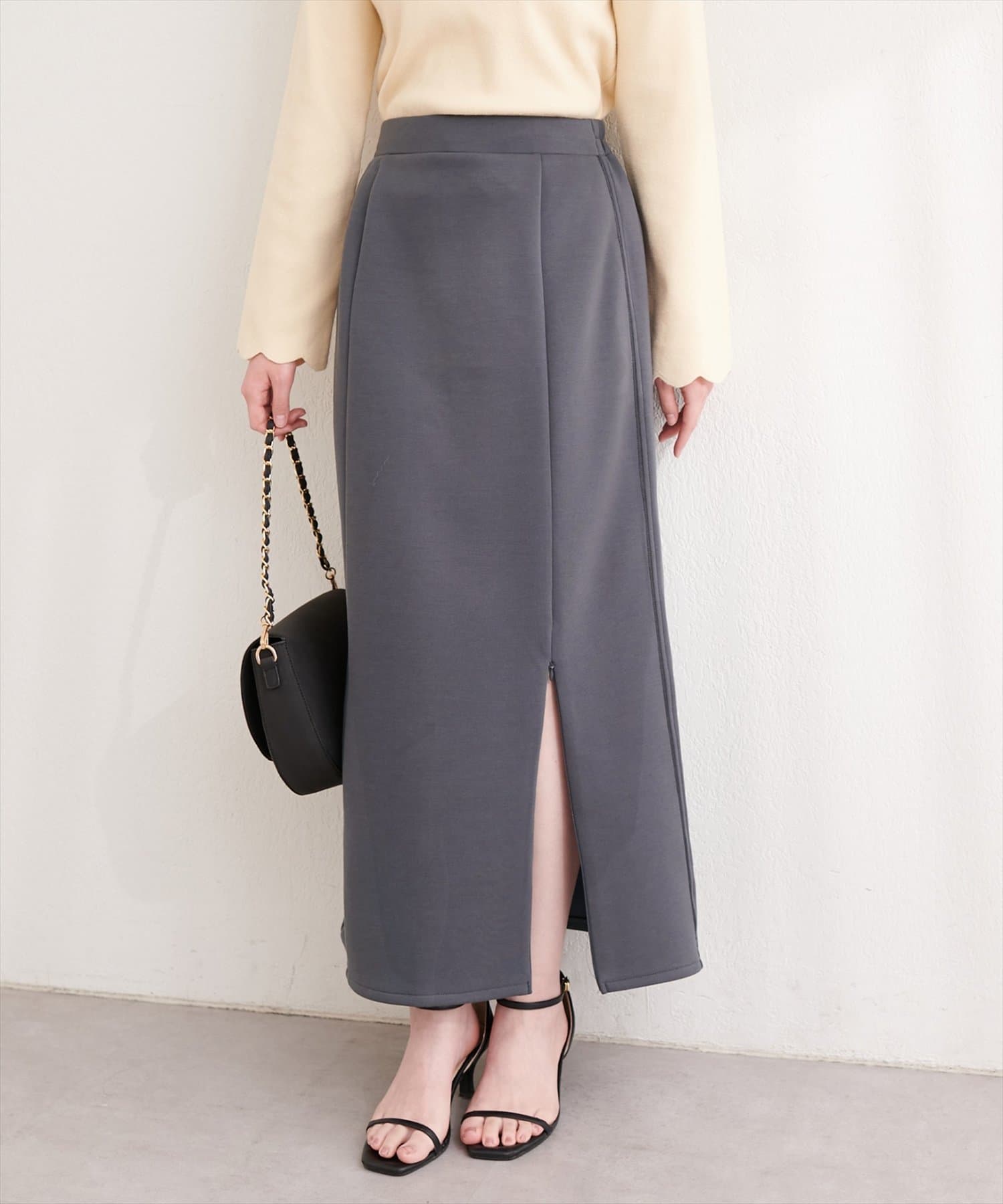 スリットはファスナー式なので、スリットの深さを調整することで、着こなしの幅が広がります。