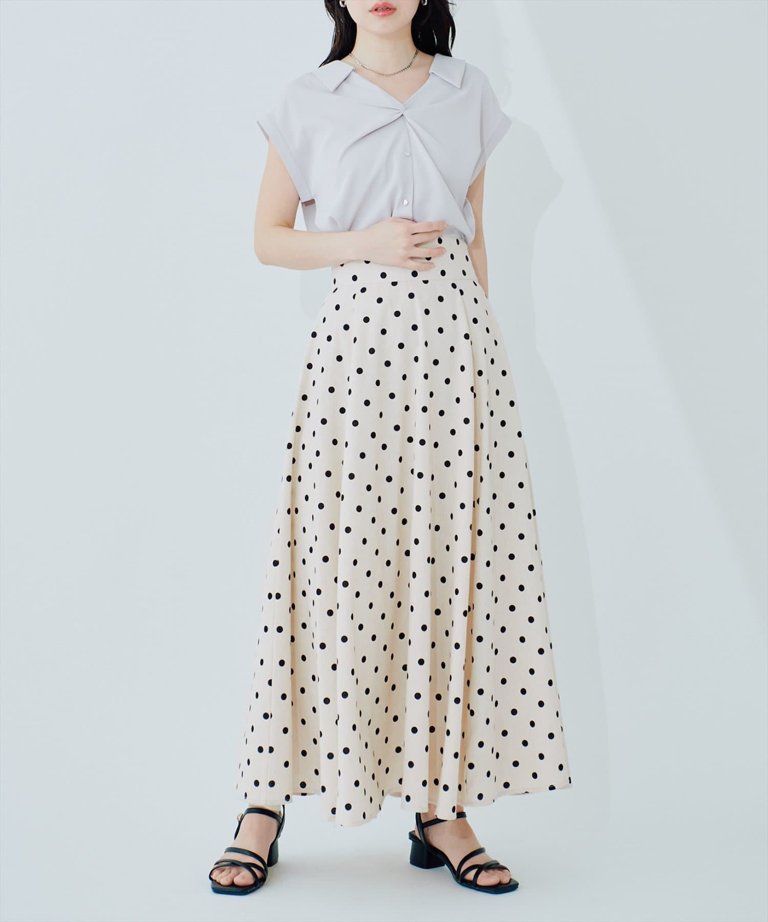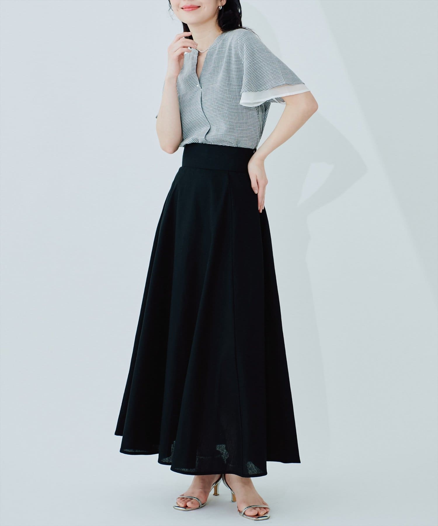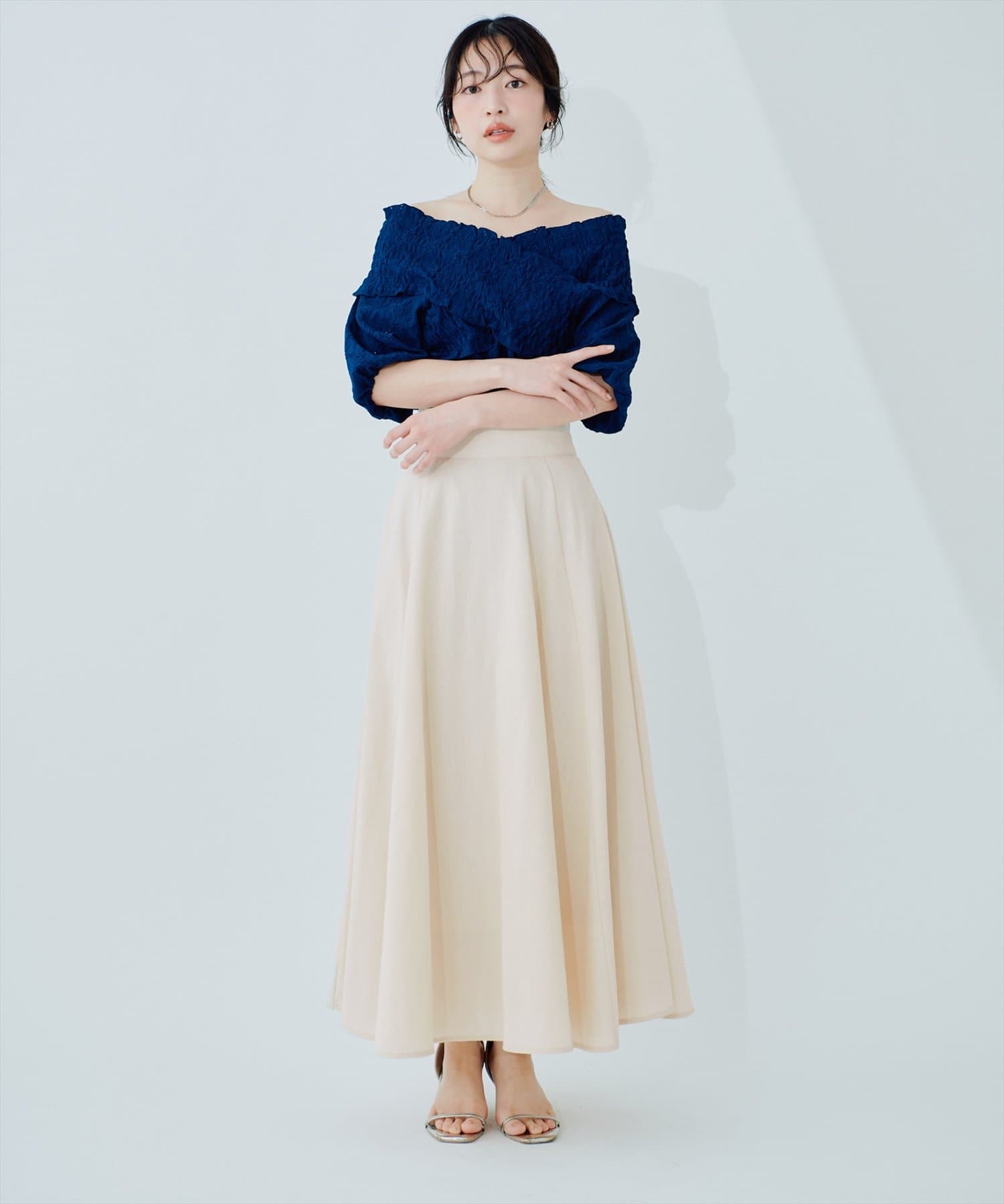 裾にむかってフレアに広がり、カジュアル過ぎずフェミニンさのある1着に仕上げました。