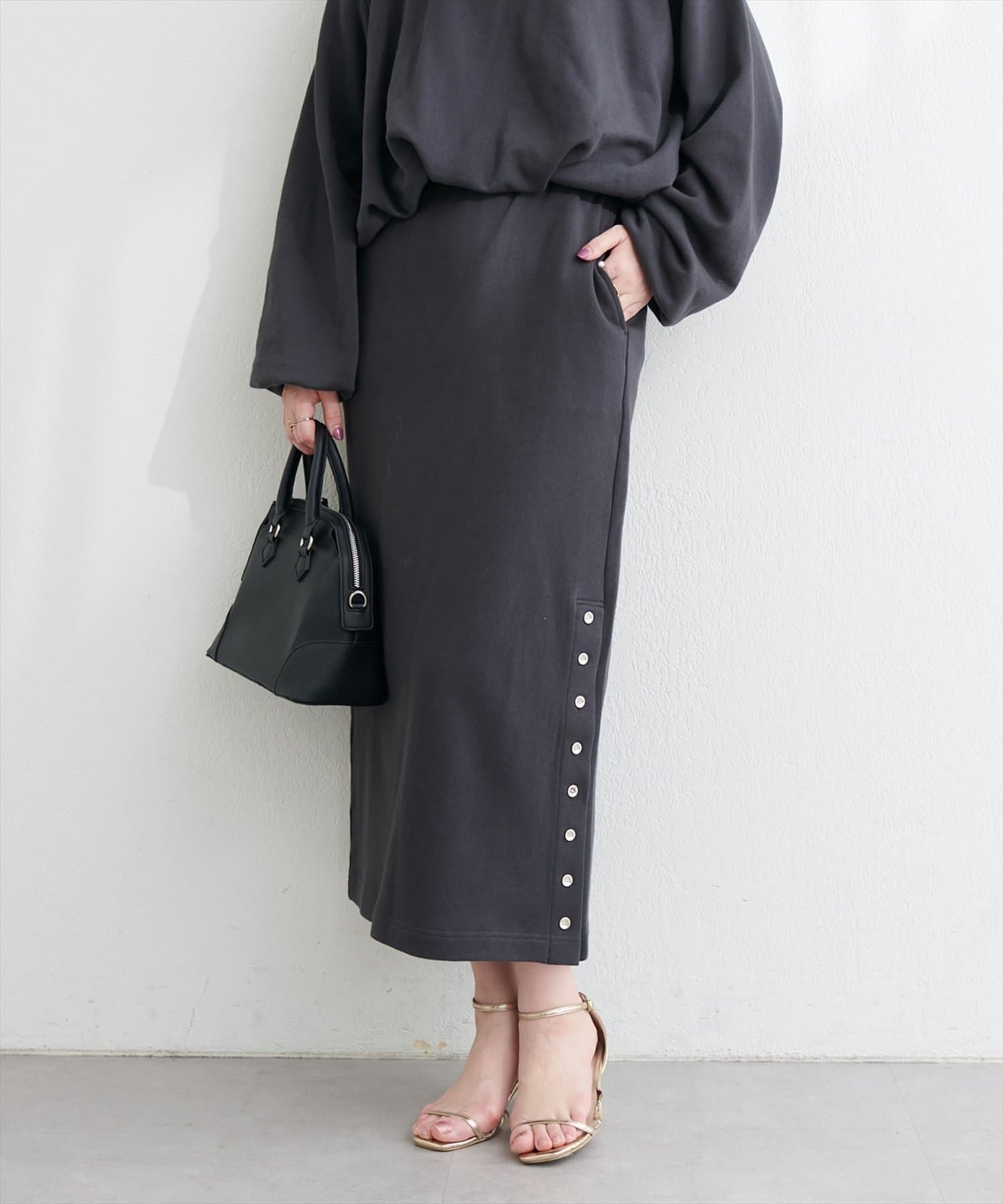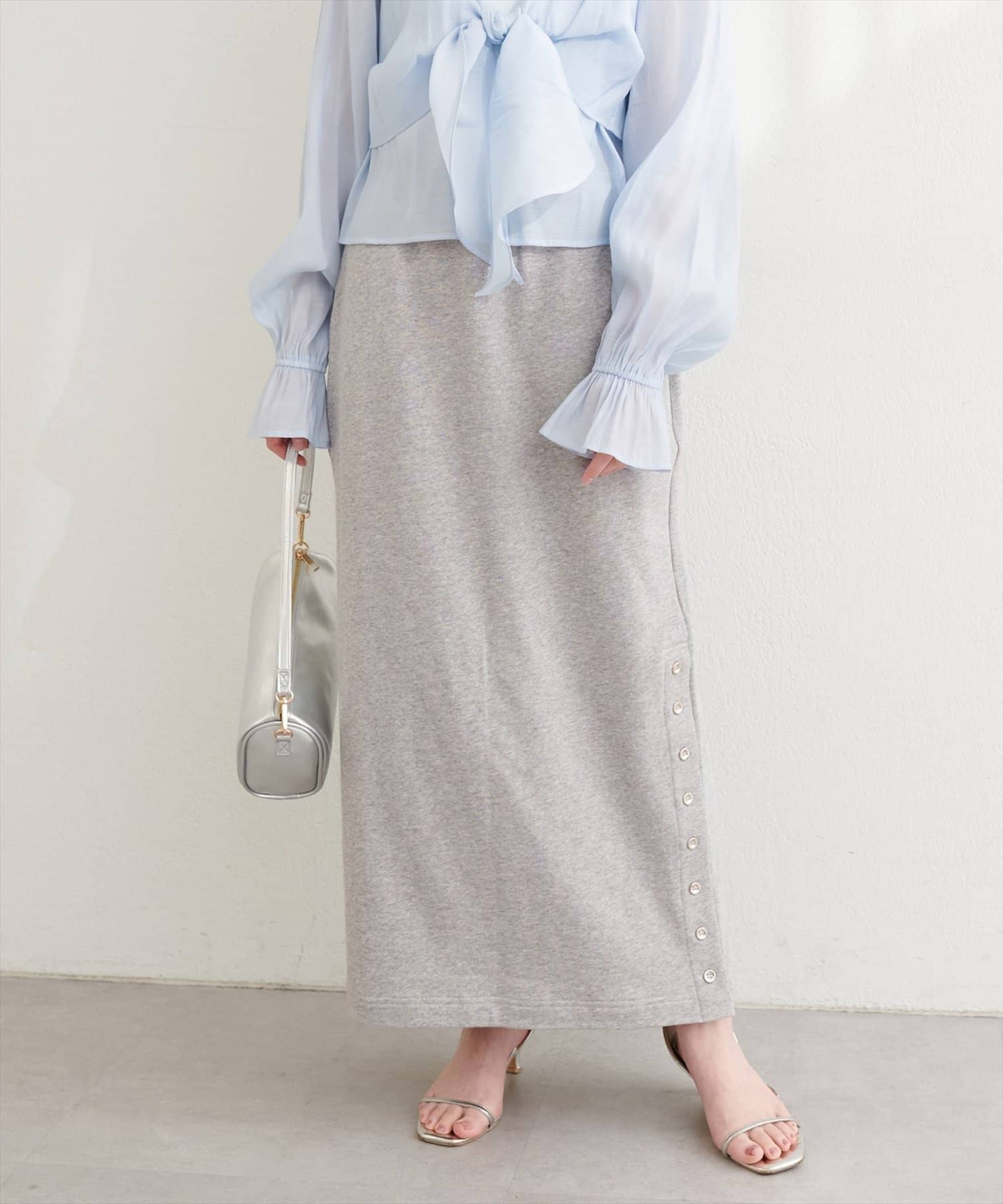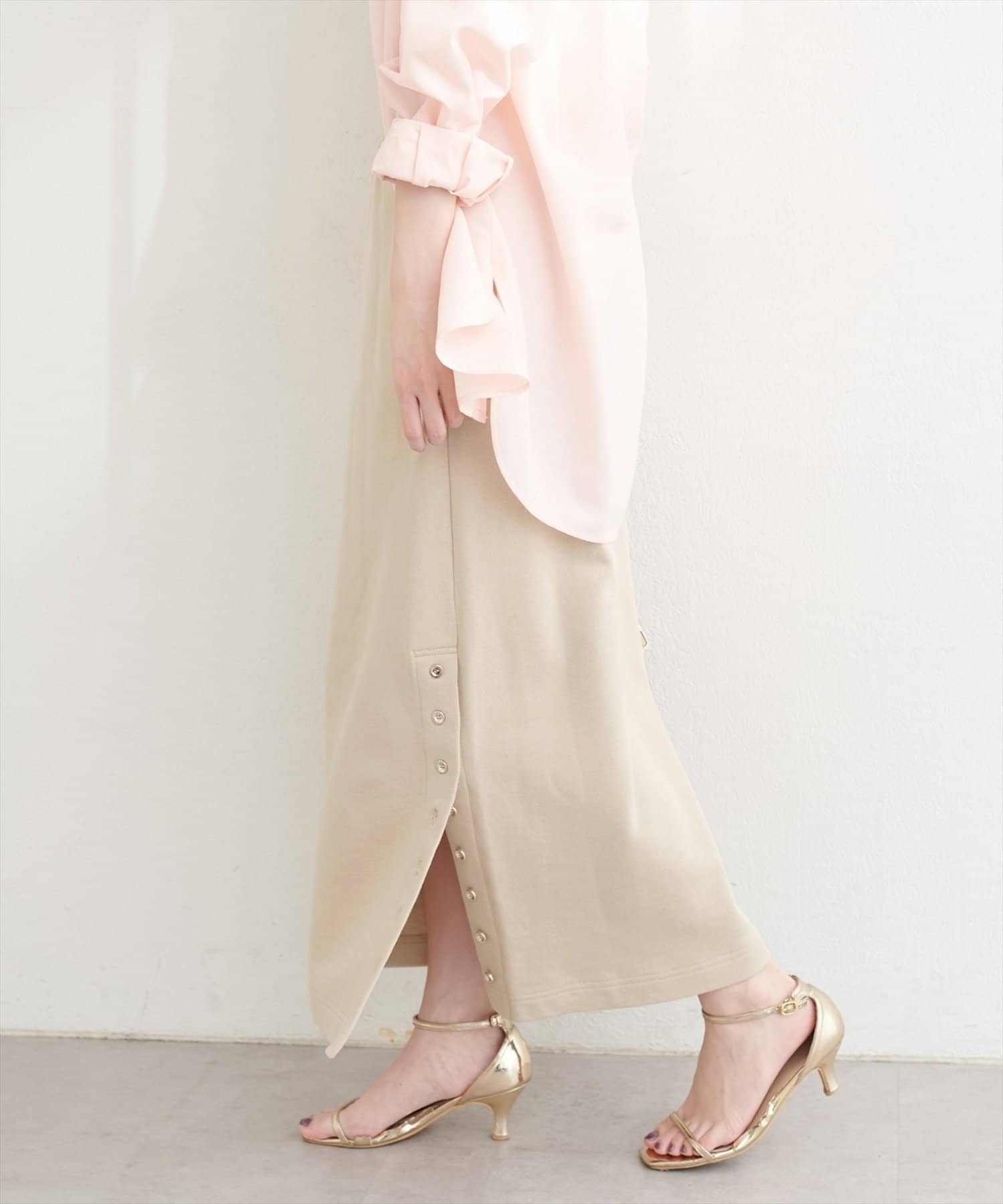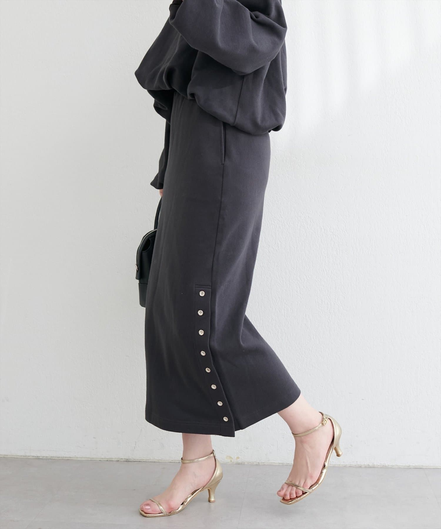 一見するとベーシックなナロースカート。しかし、サイドに施されたスリットと、並んだ釦が、動きのある表情を生み出します。