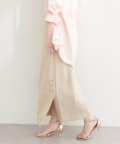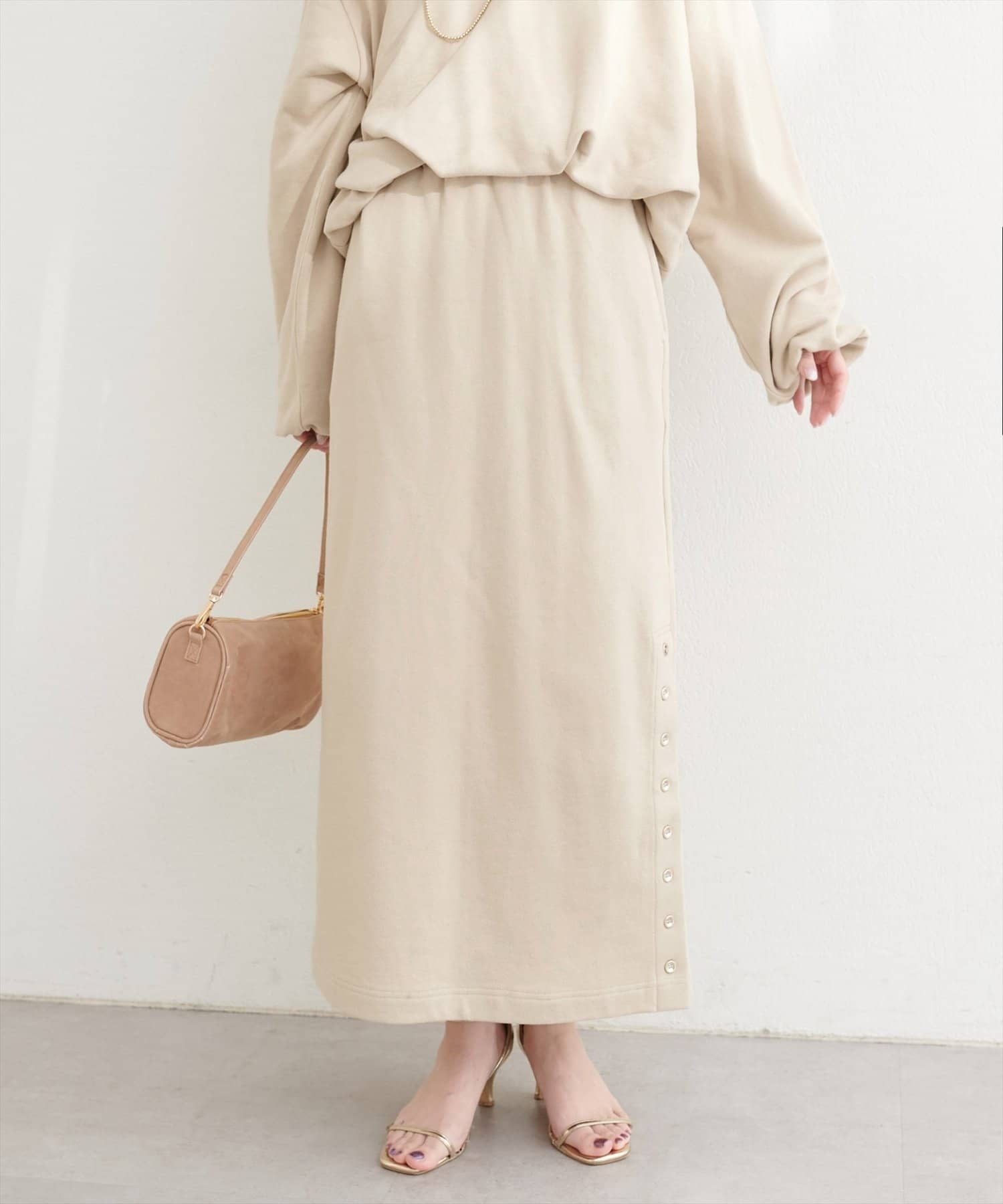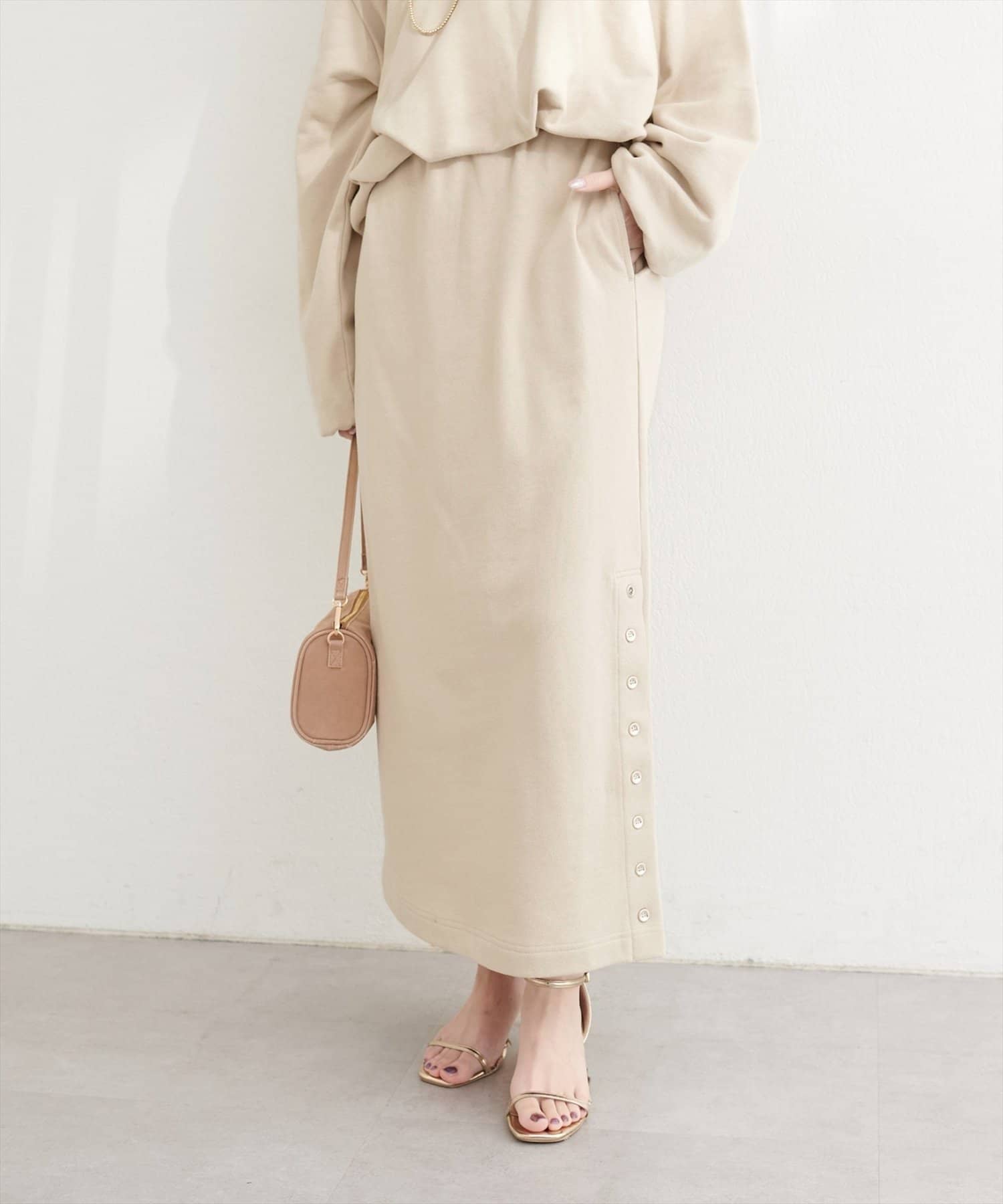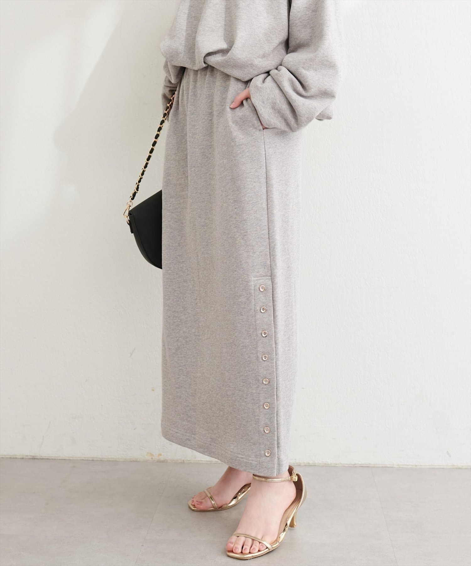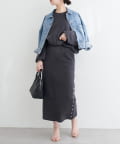 一見するとベーシックなナロースカート。しかし、サイドに施されたスリットと、並んだ釦が、動きのある表情を生み出します。