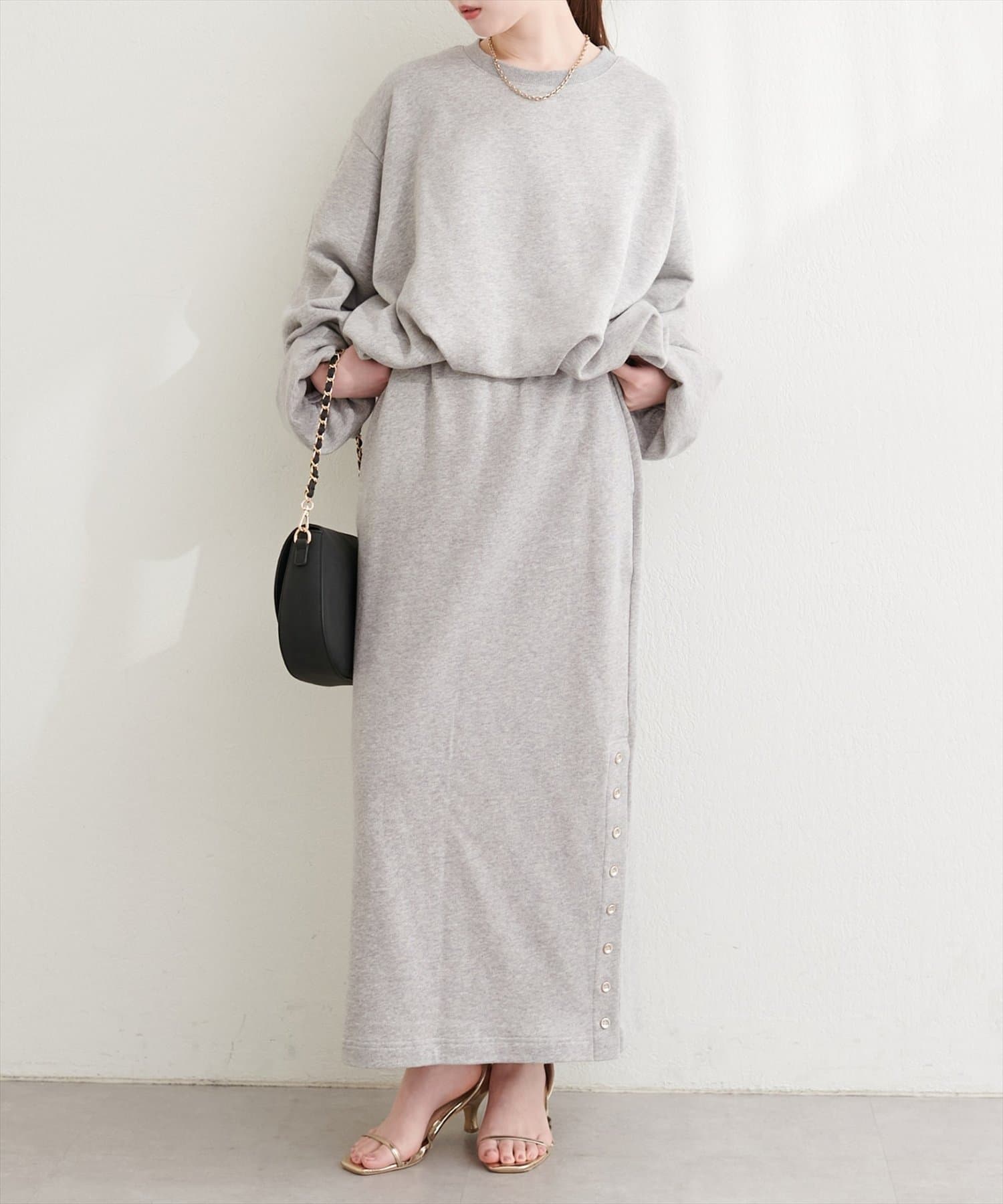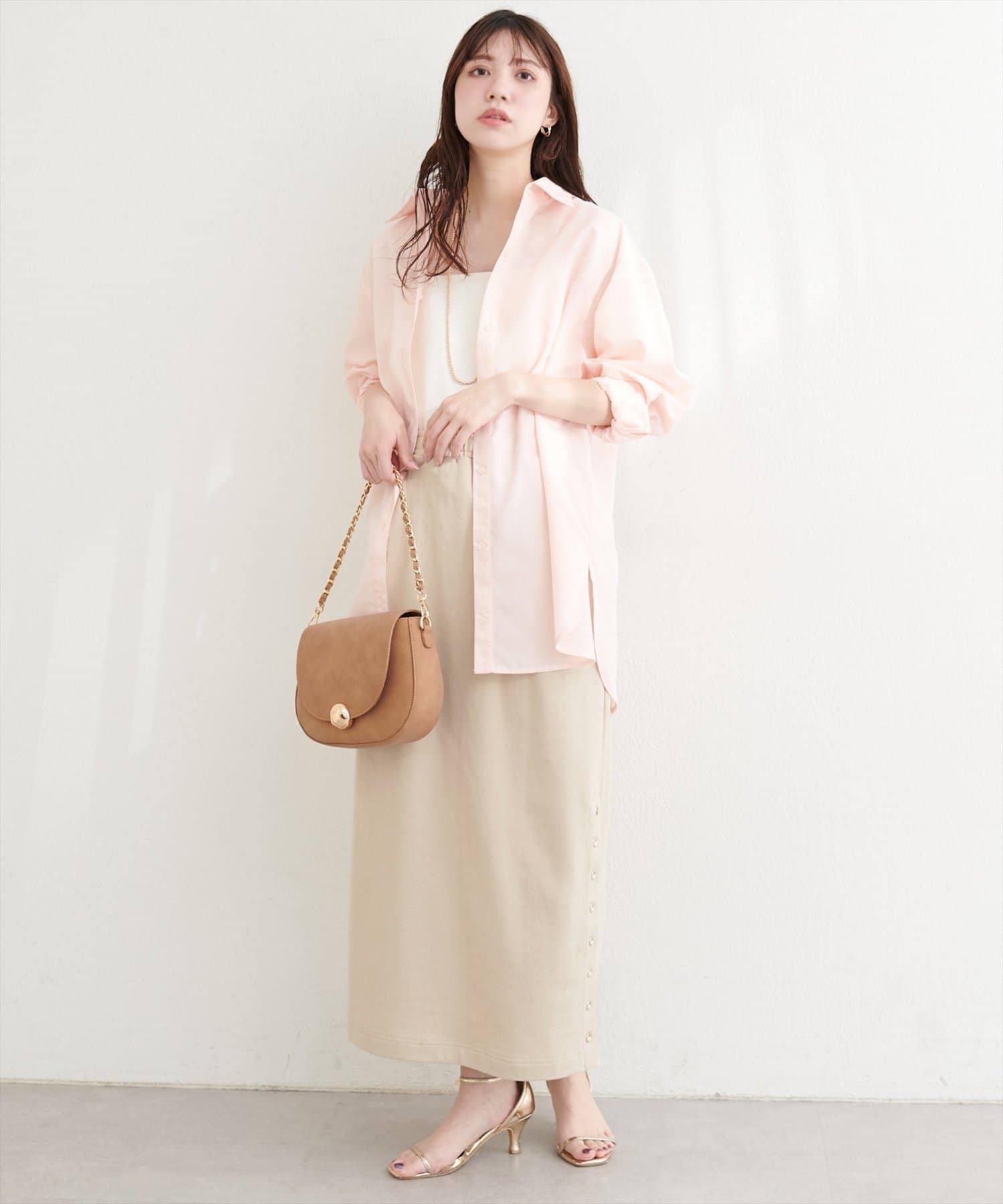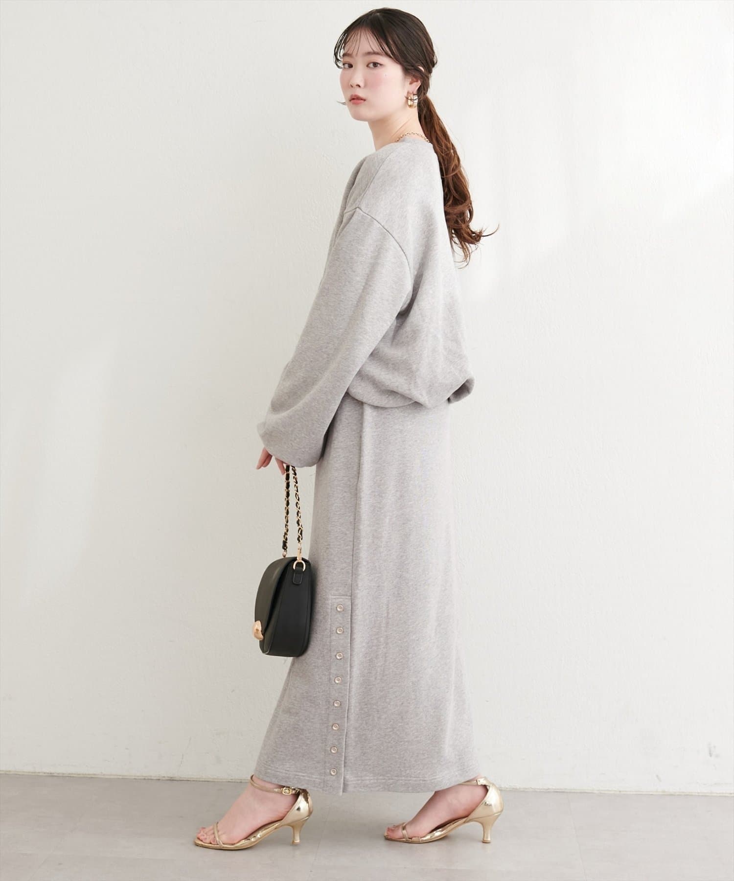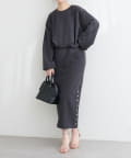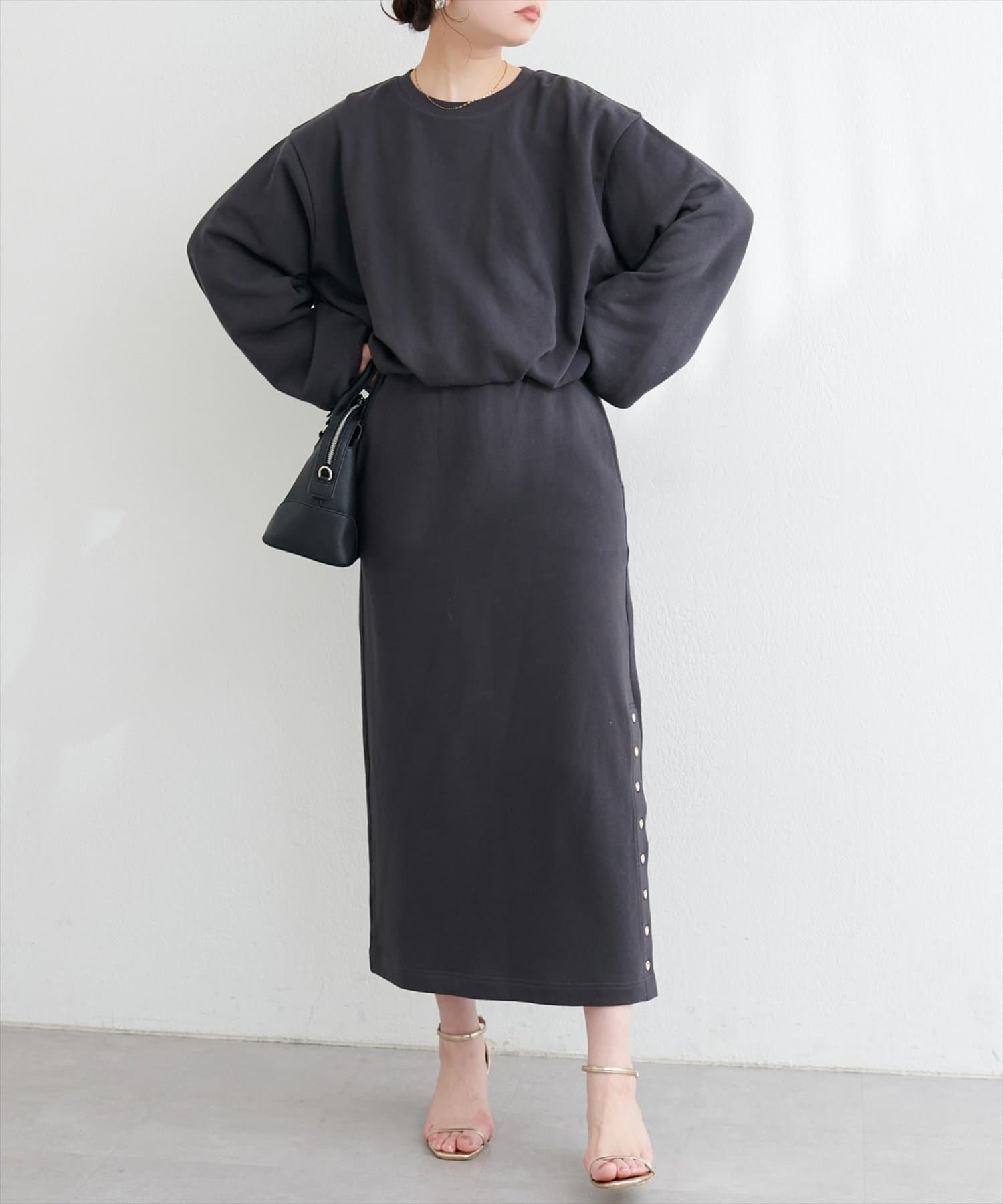 一見するとベーシックなナロースカート。しかし、サイドに施されたスリットと、並んだ釦が、動きのある表情を生み出します。
