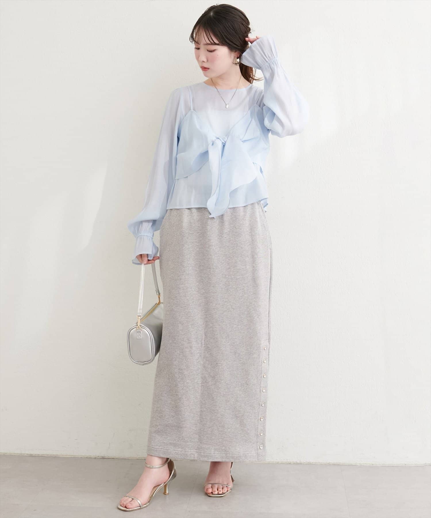 歩くたびにさりげなく見える素肌が、女性らしさを引き立て、軽やかな印象を与えます。