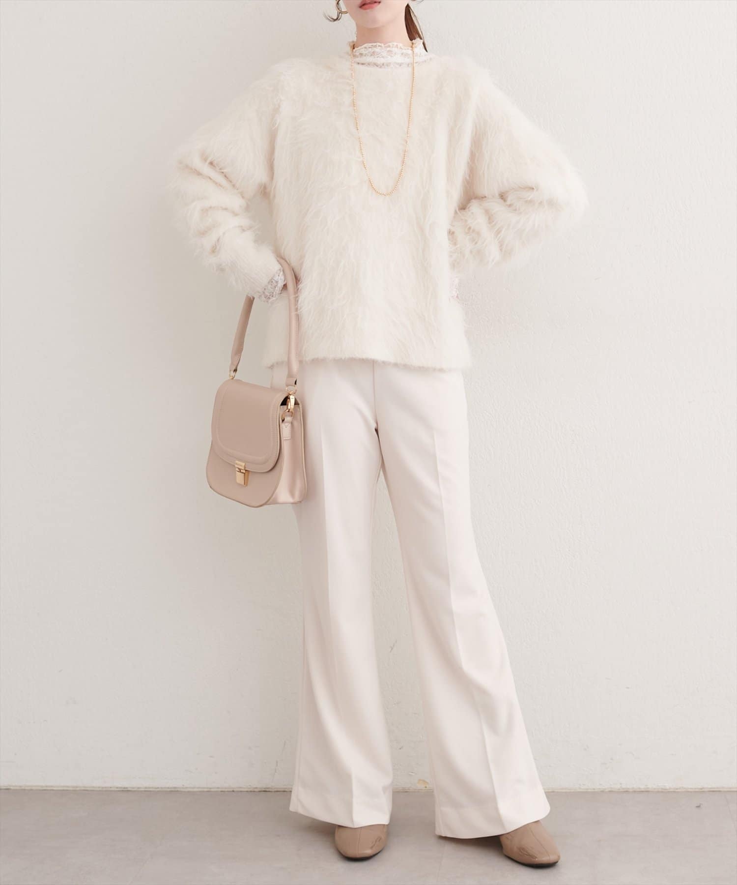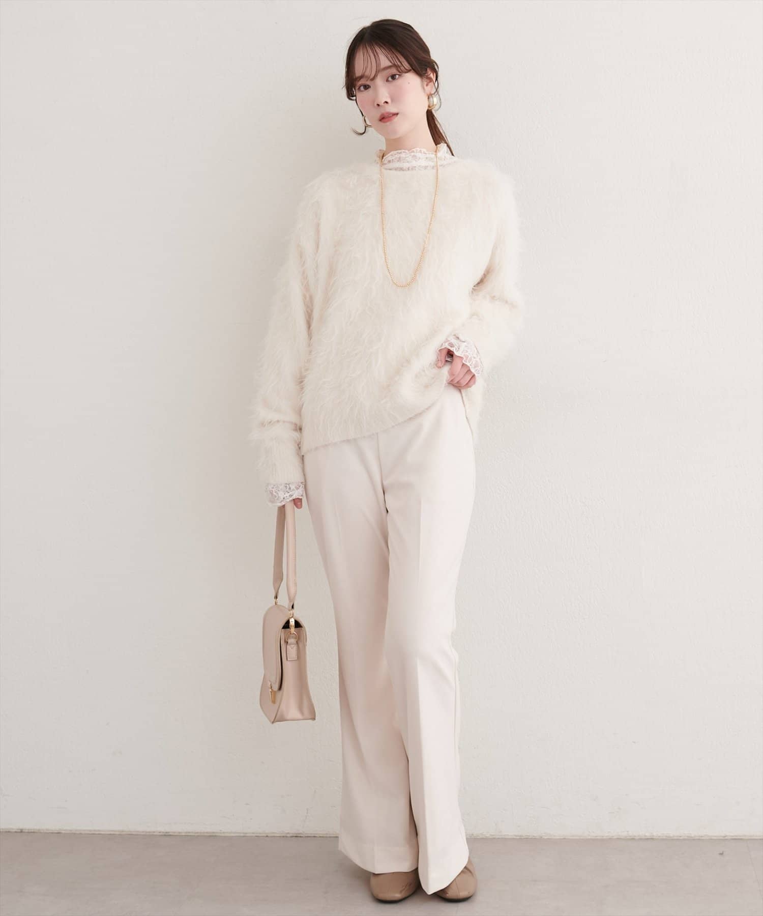 華奢なネックレスやイヤリングをプラスすれば、女性らしさがアップ。