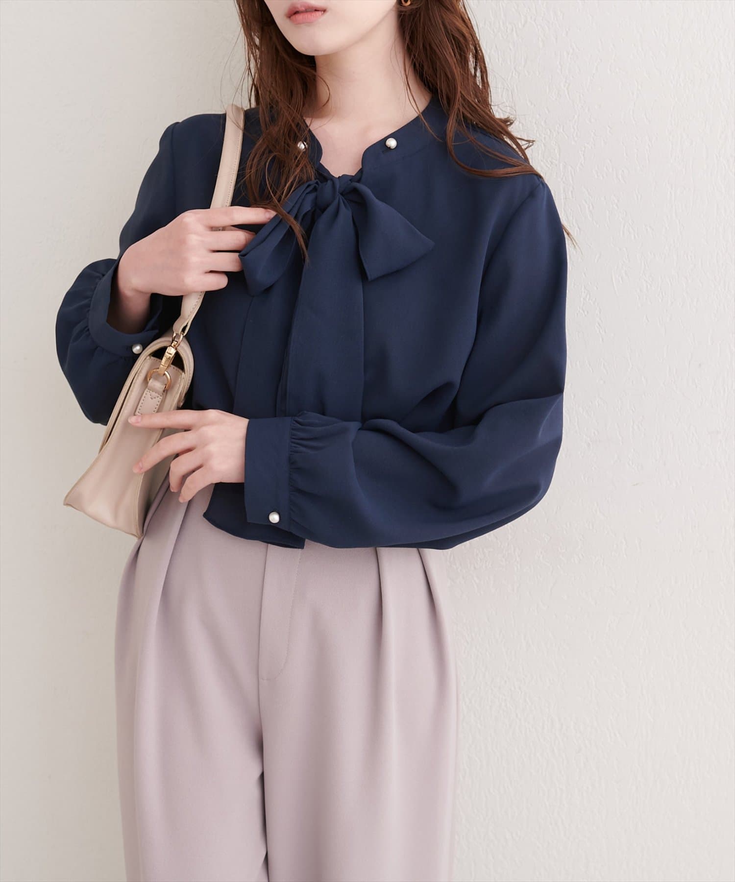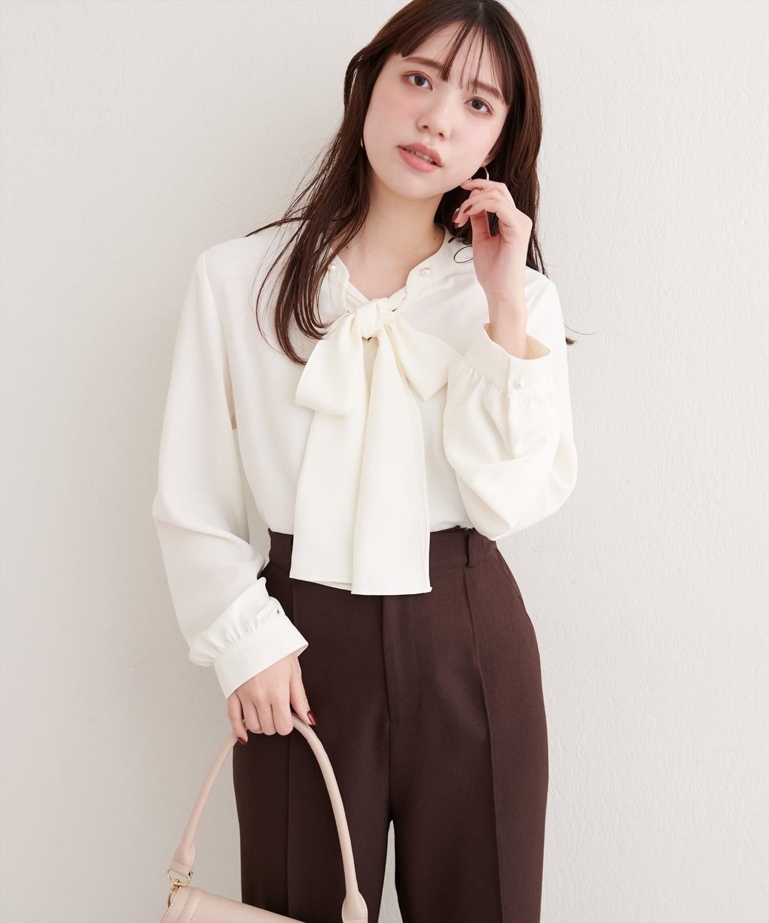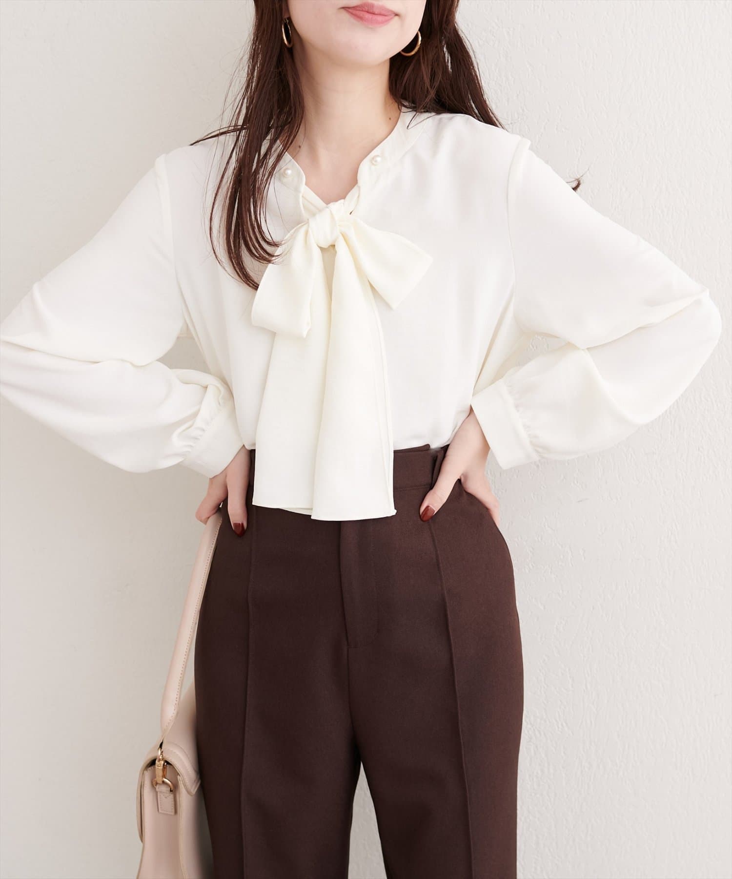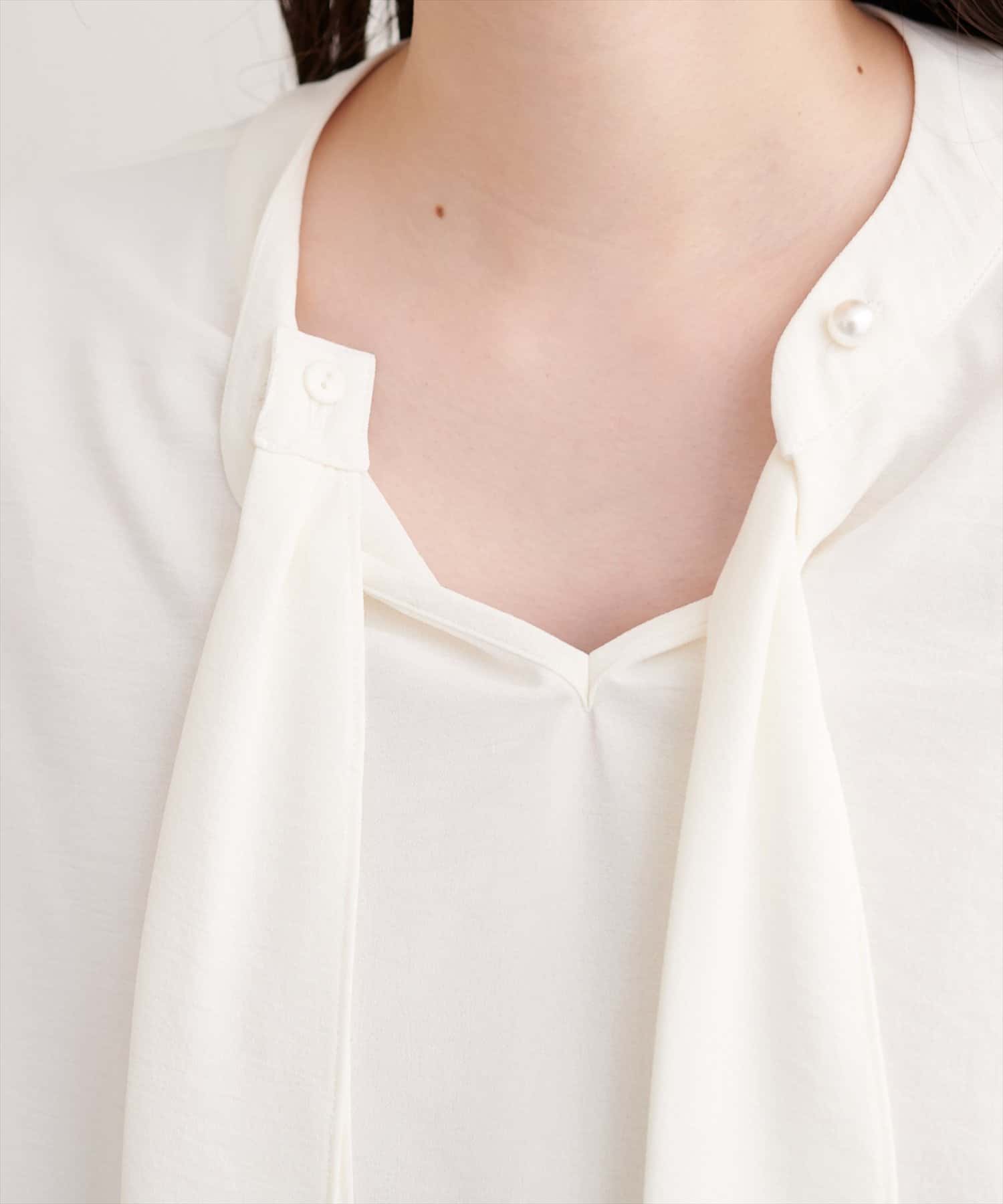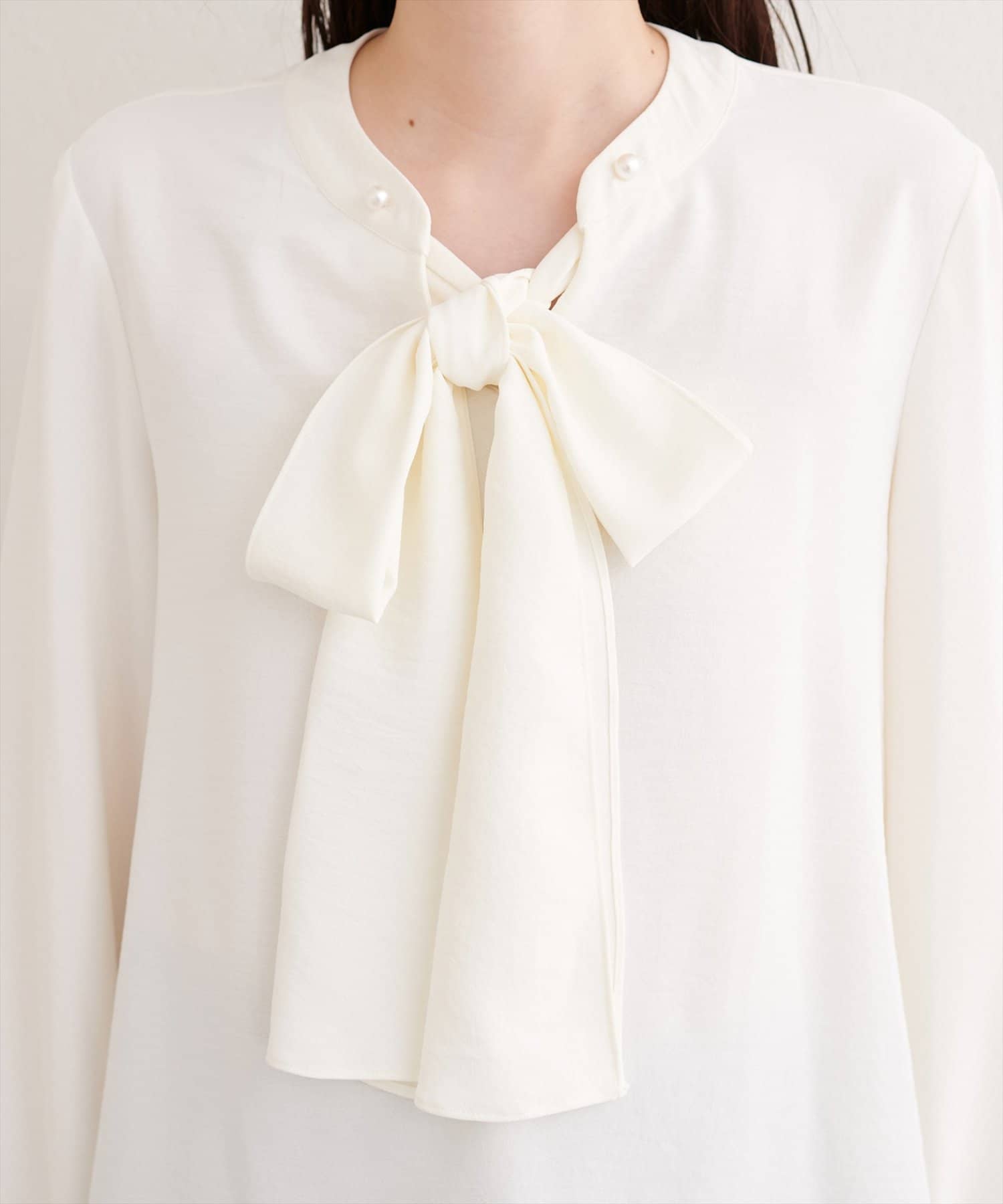 リボンを結んで上品で華やかな印象に、リボンを外してシンプルなクルーネックブラウスとして、2つの表情を楽しめます。