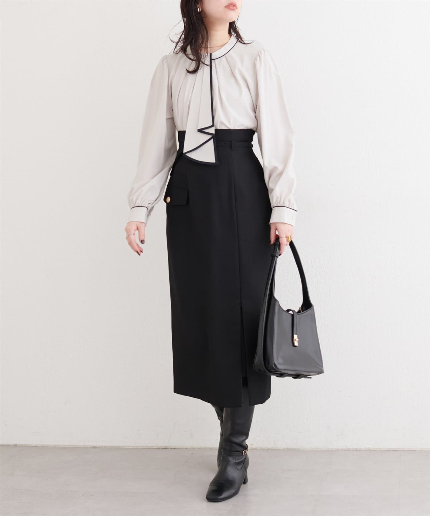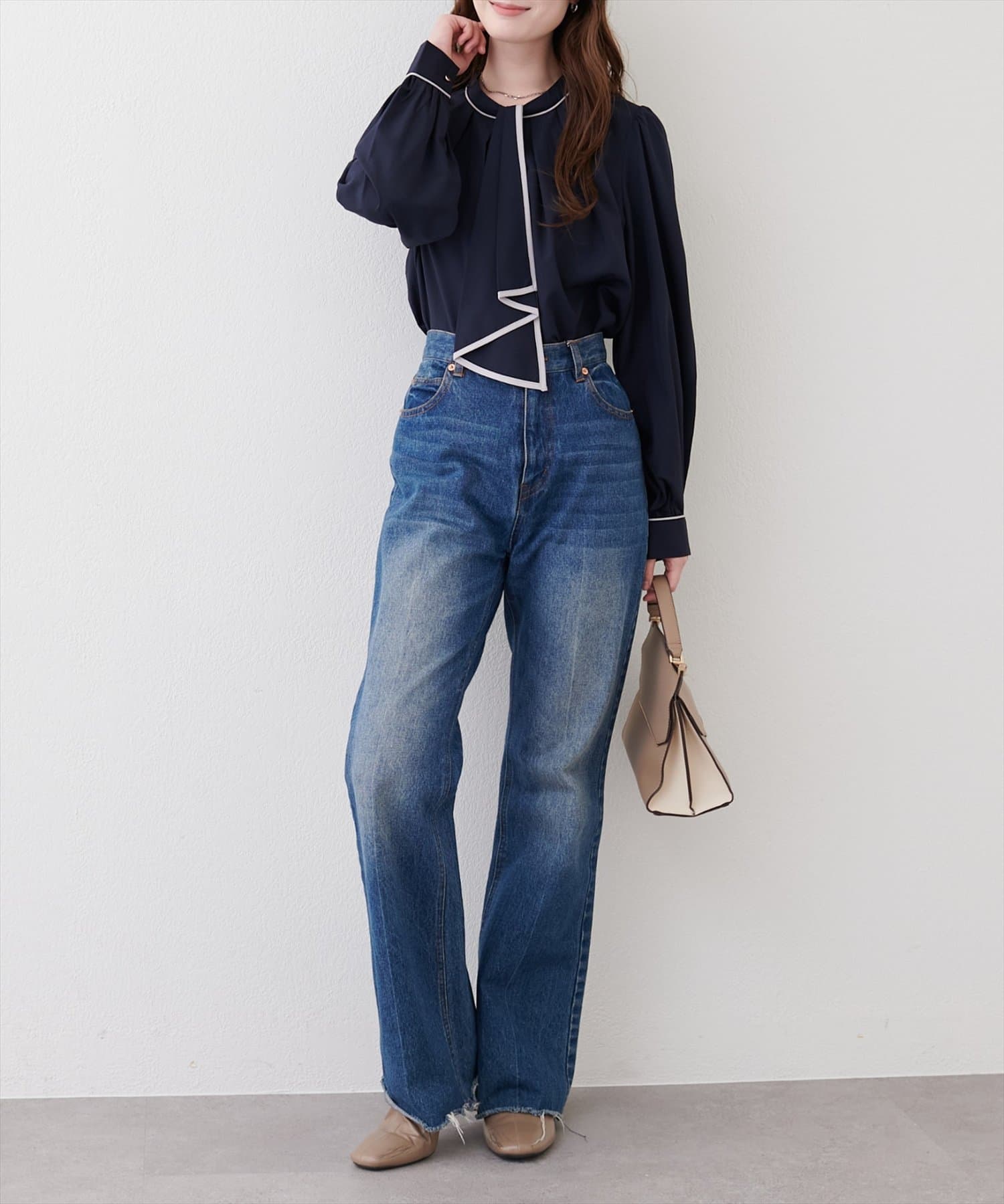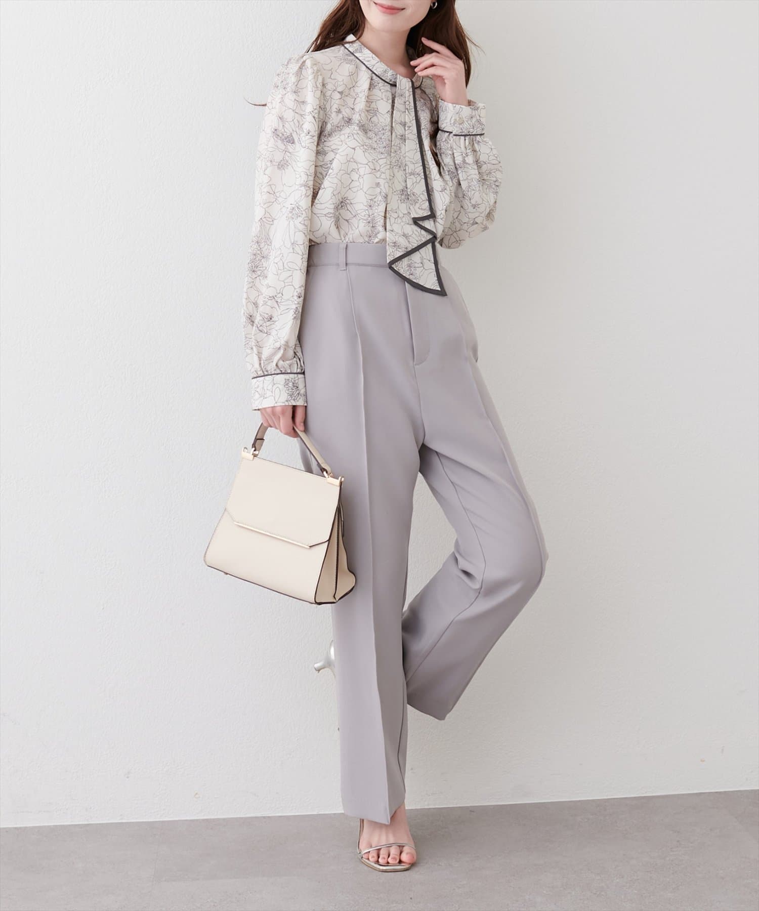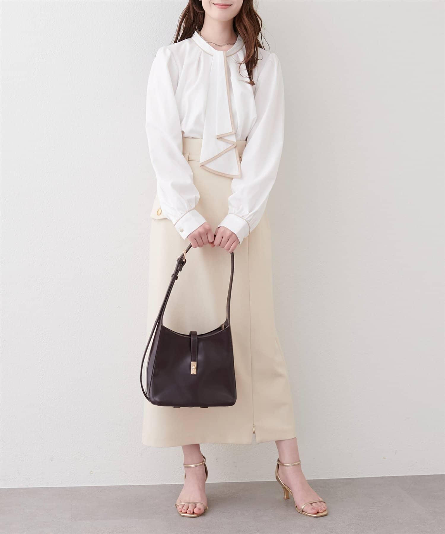 ブラウスがさらりとしている分、ボトムは厚みのあるアイテムを合わせて素材感にメリハリを付けるのがおすすめです。