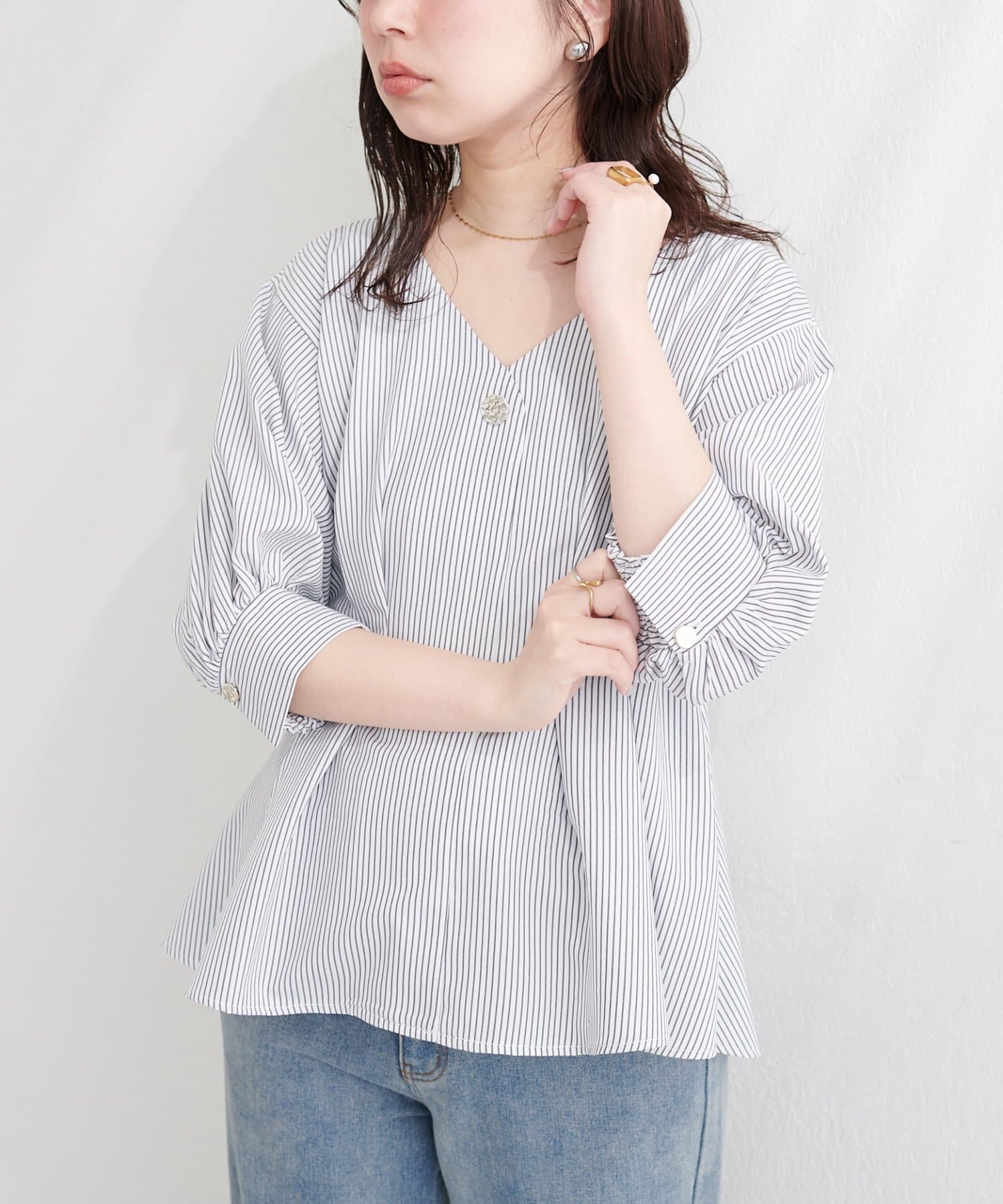 フロントと袖のボタンで上品さを演出し、Vネックですっきり抜け感も叶います。