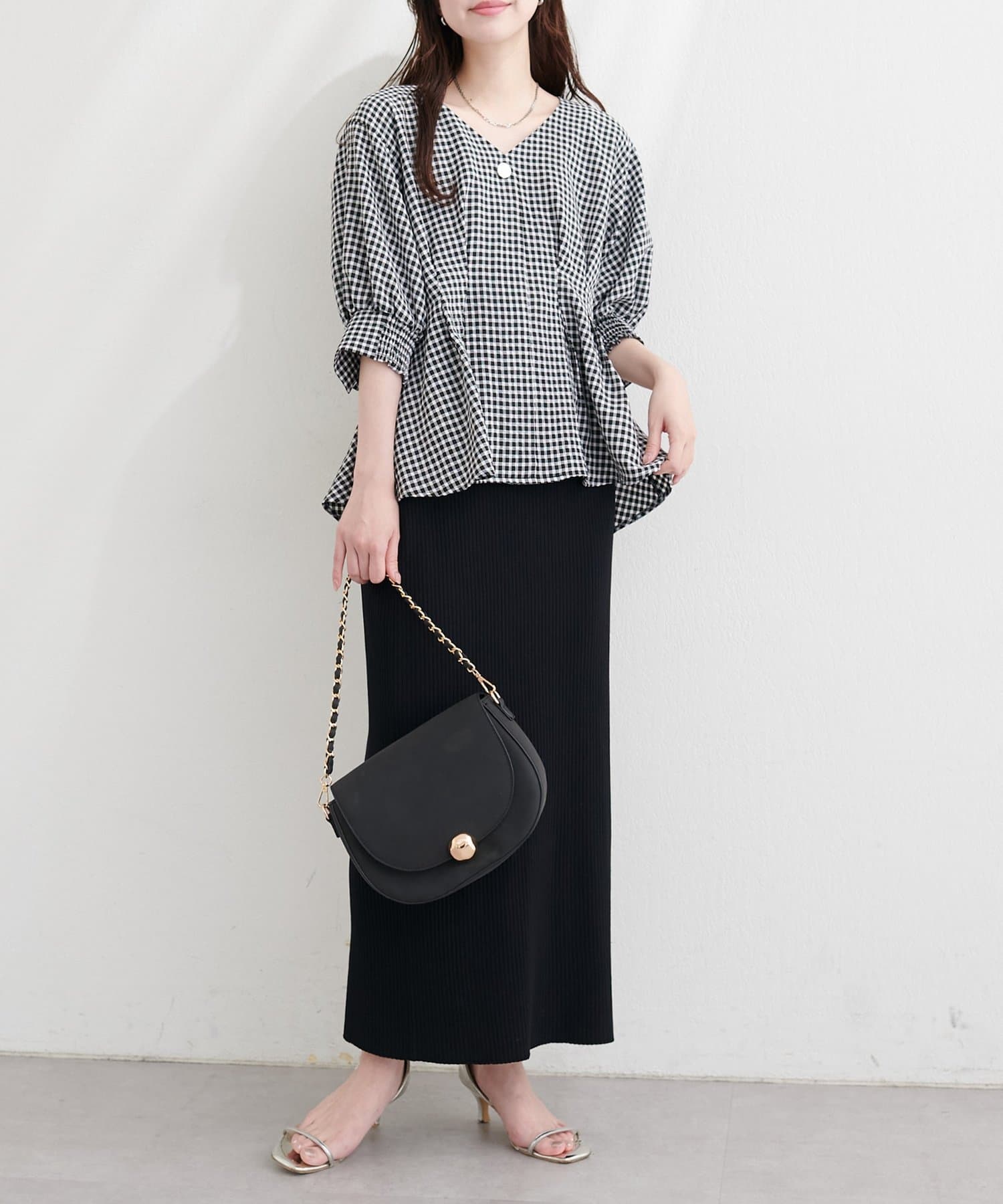 ボトムはナロースカートなど身体に優しく添う形がおすすめです。