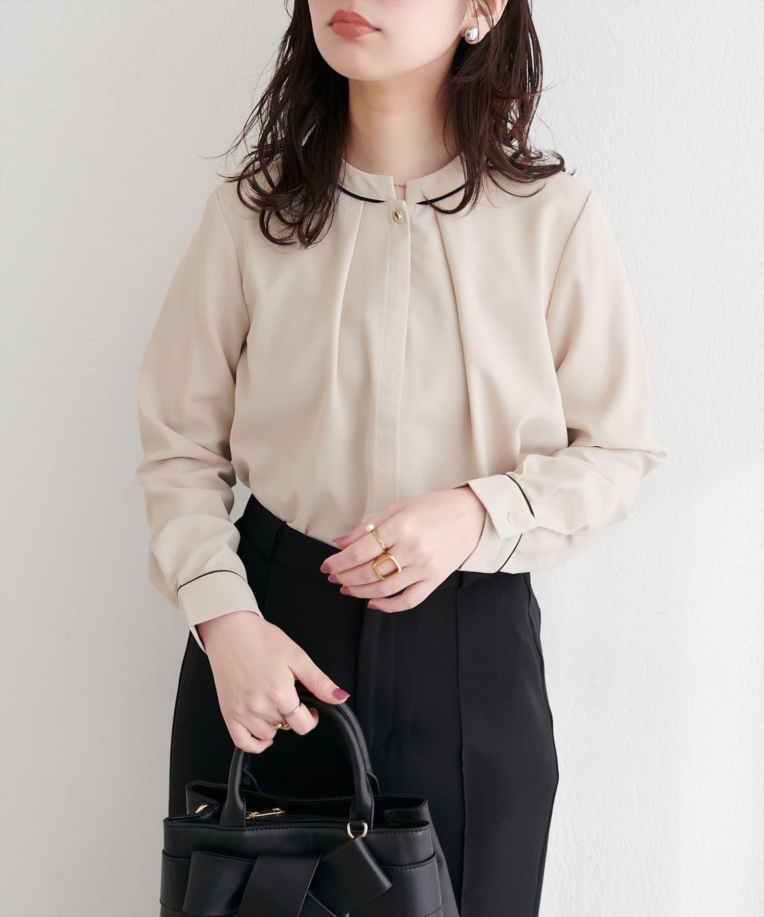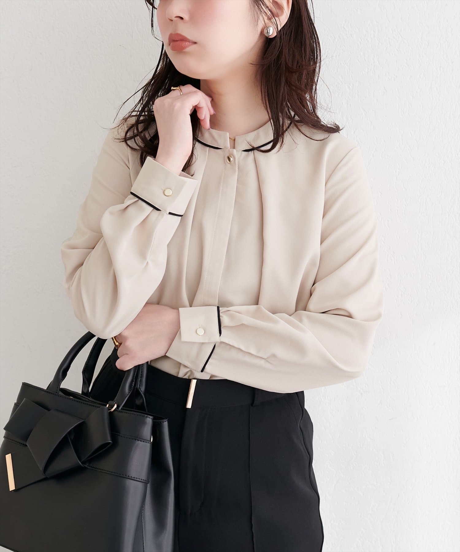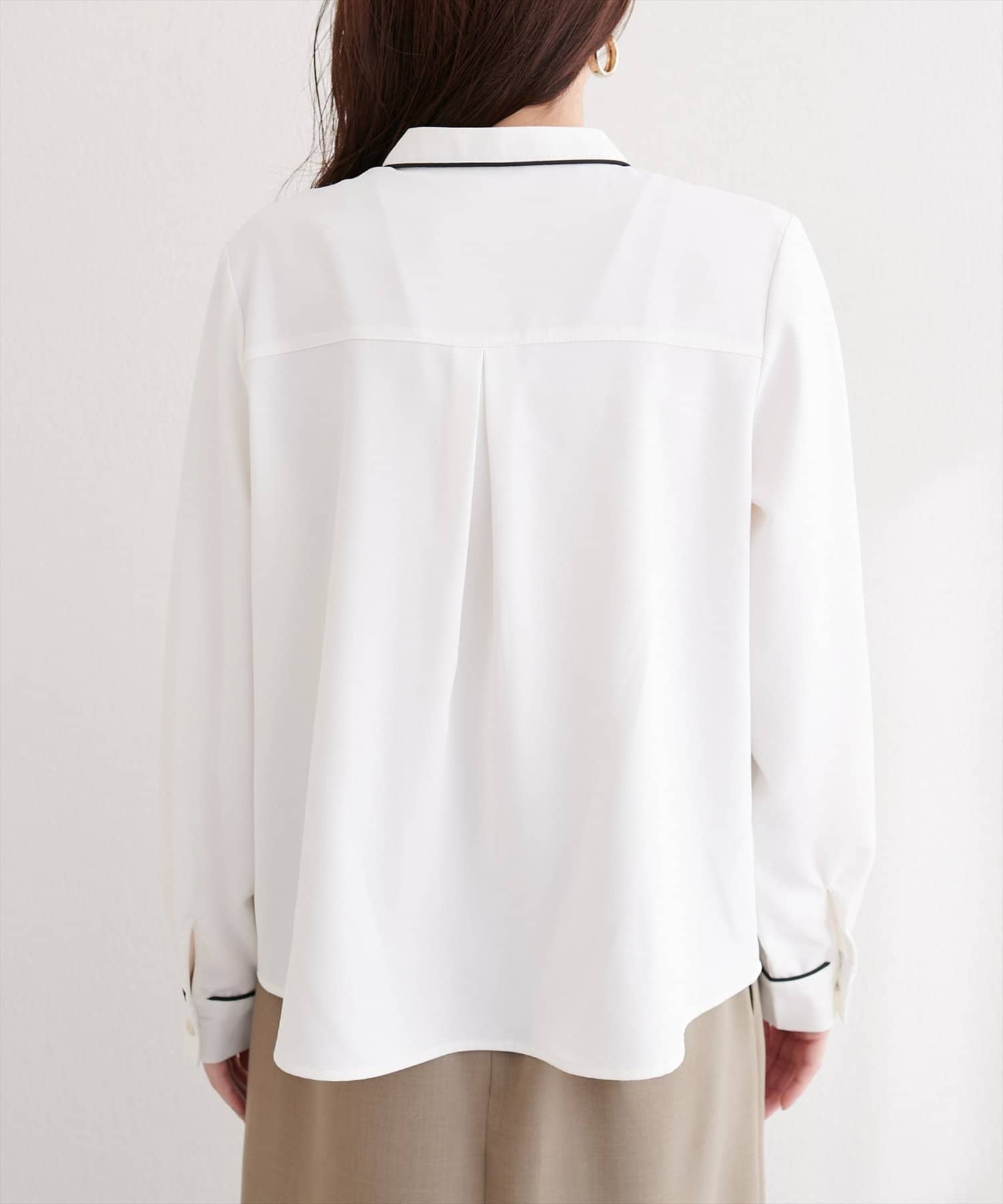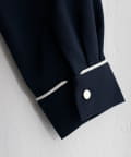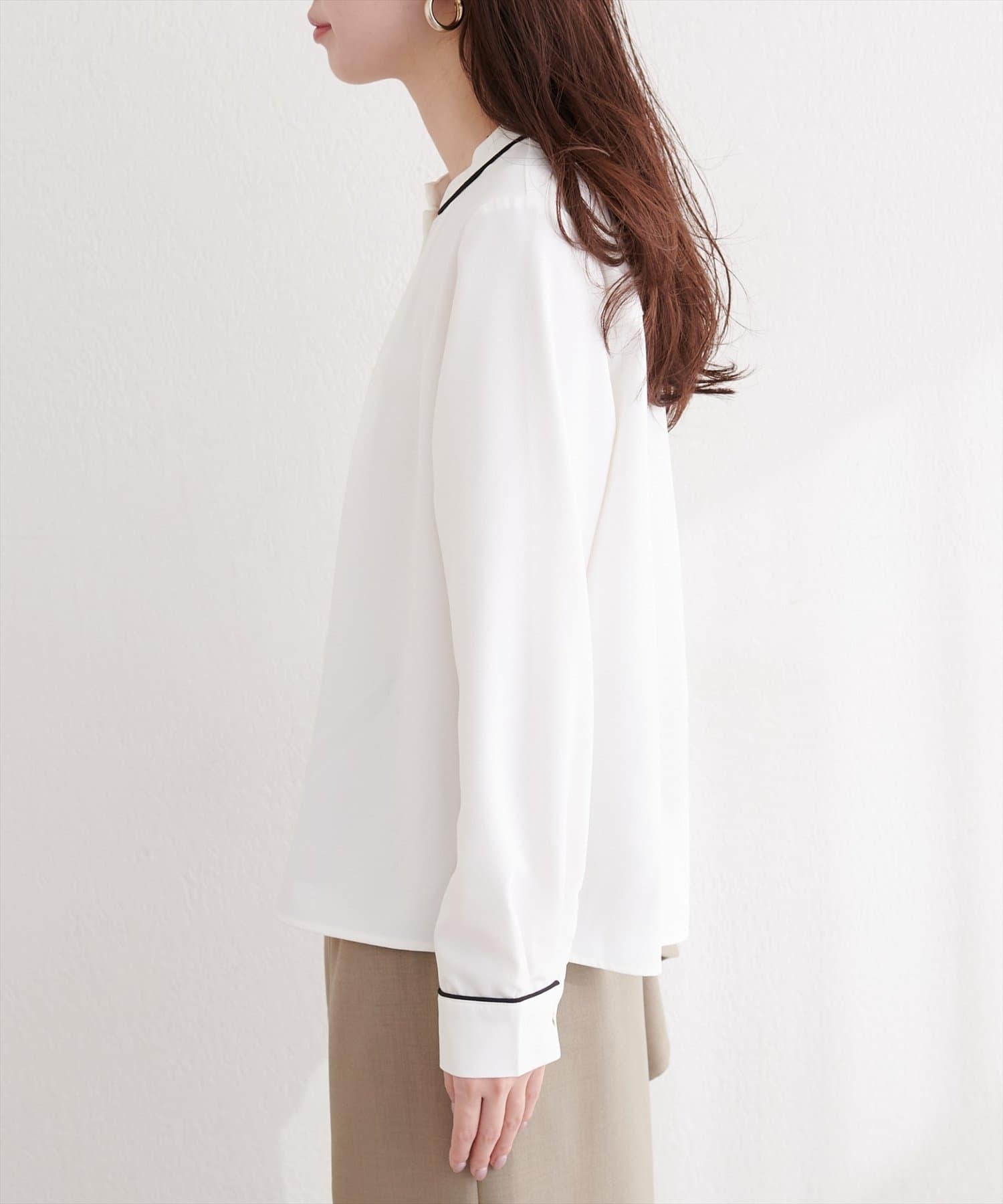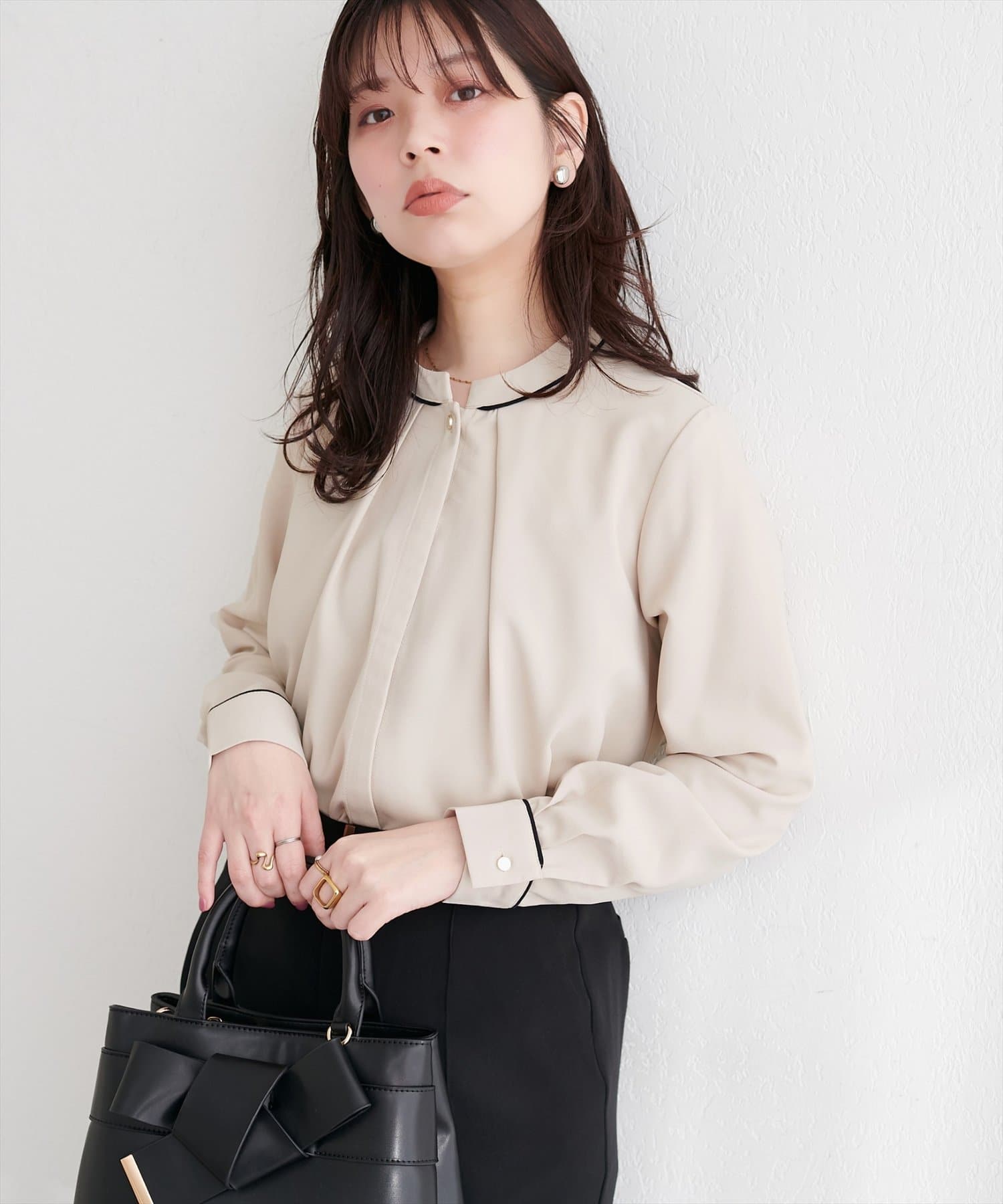 洗練されたスタンドカラーと、襟元や袖口にあしらわれた繊細なパイピングがポイントのブラウス。
