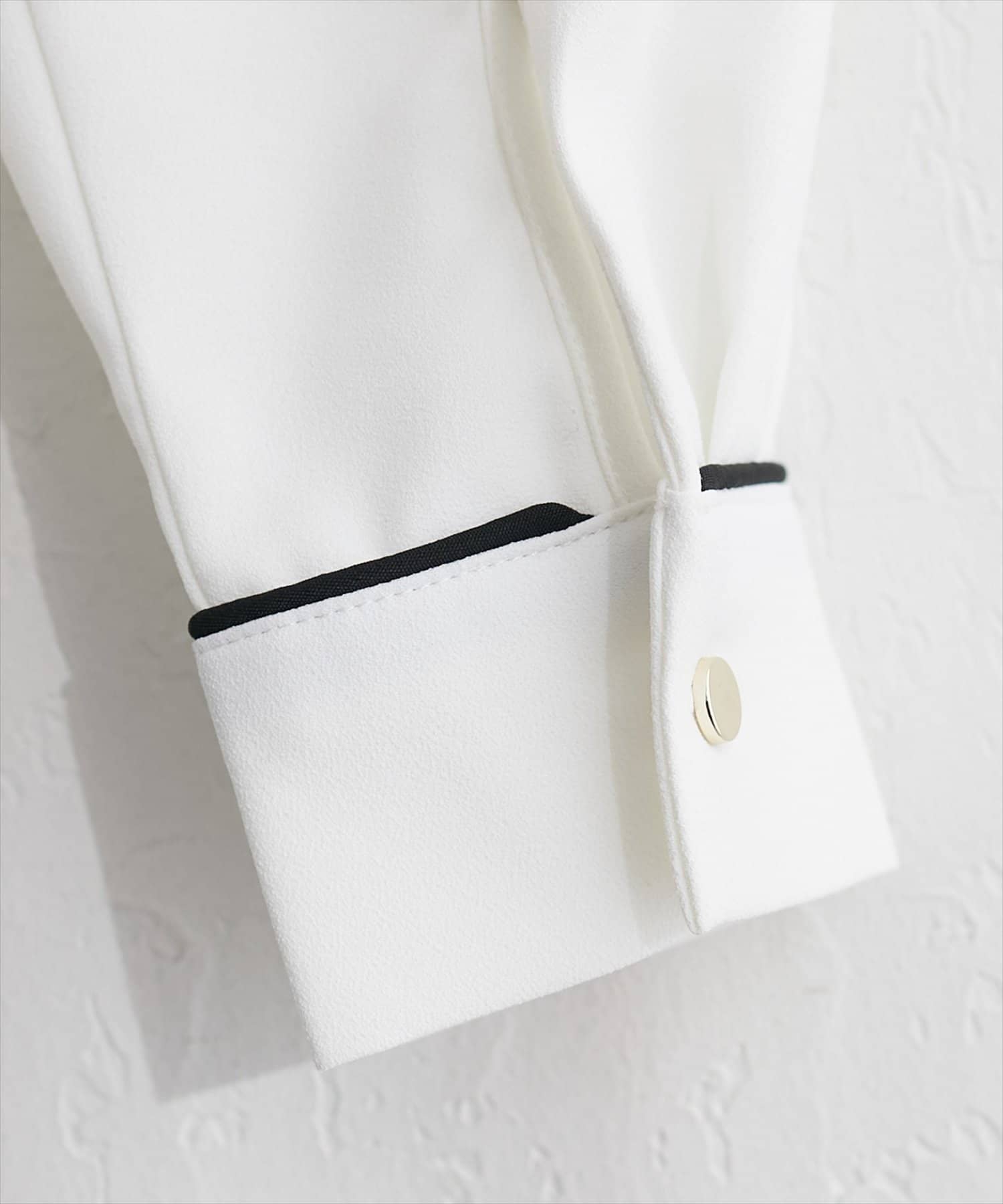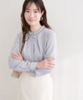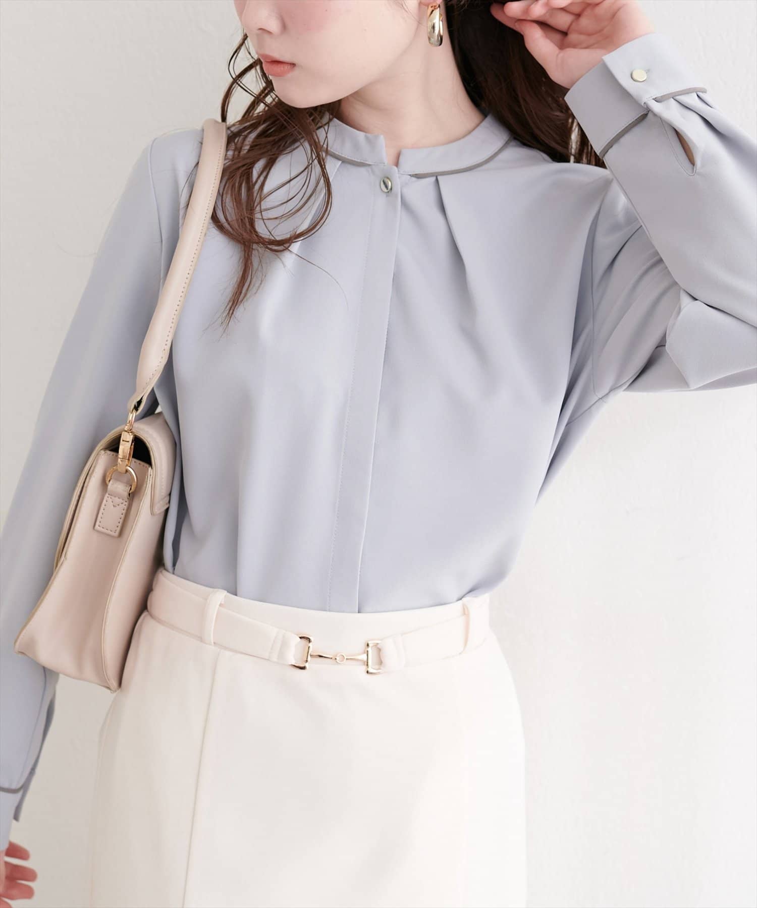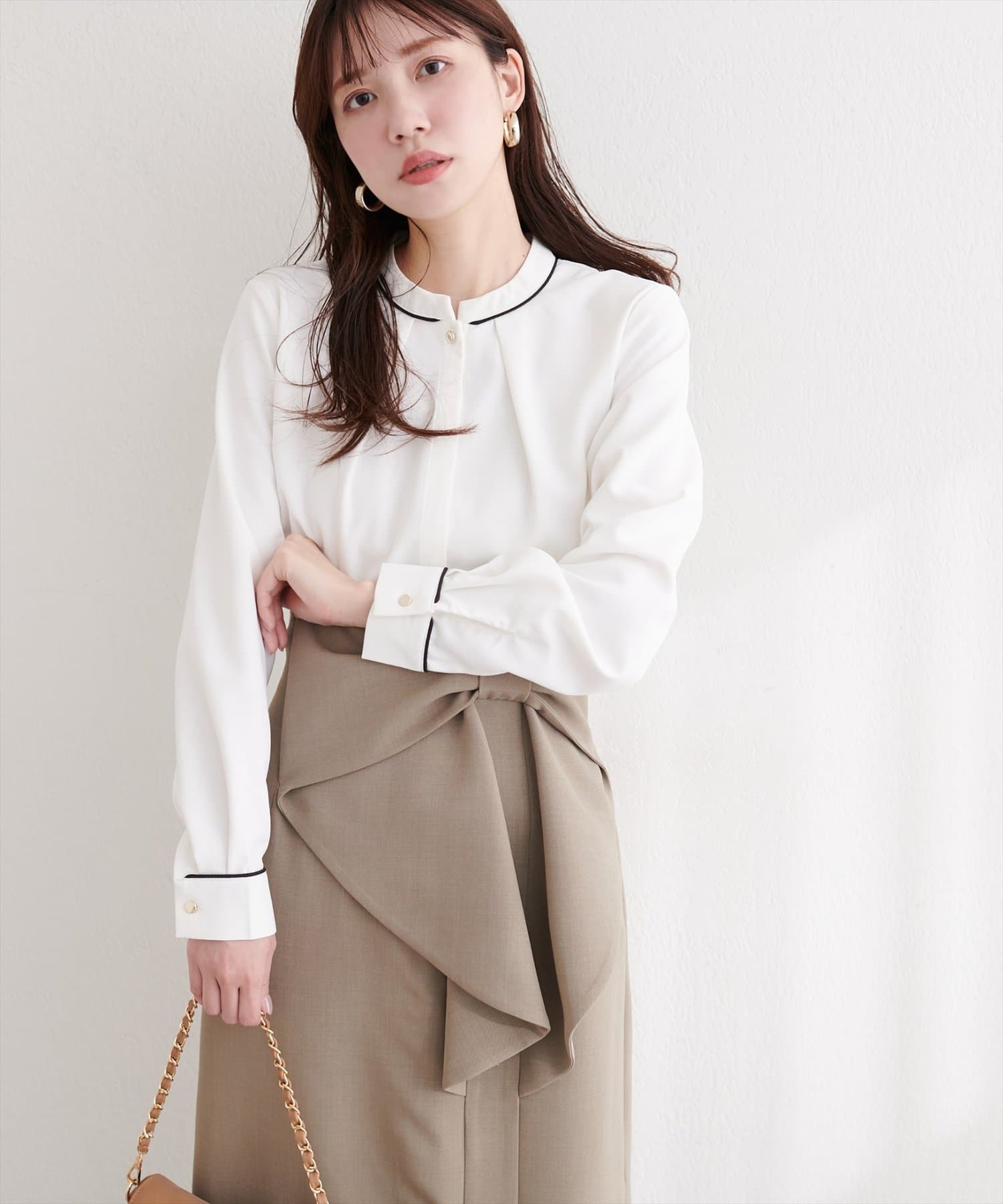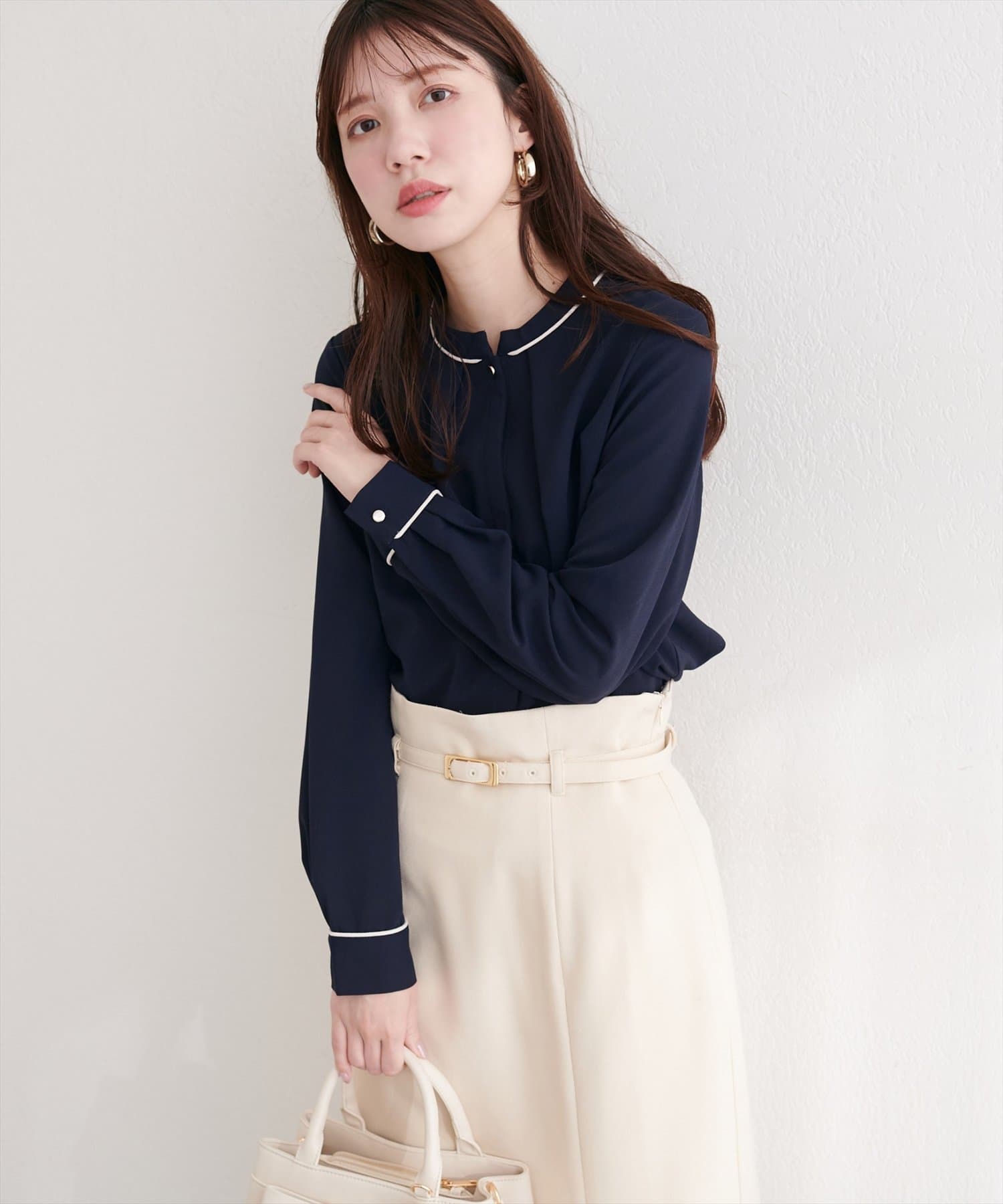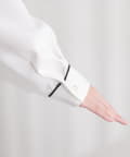 洗練されたスタンドカラーと、襟元や袖口にあしらわれた繊細なパイピングがポイントのブラウス。