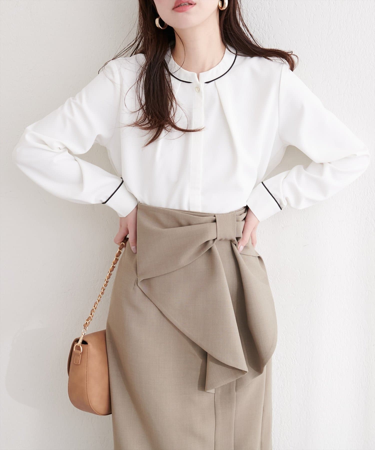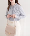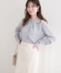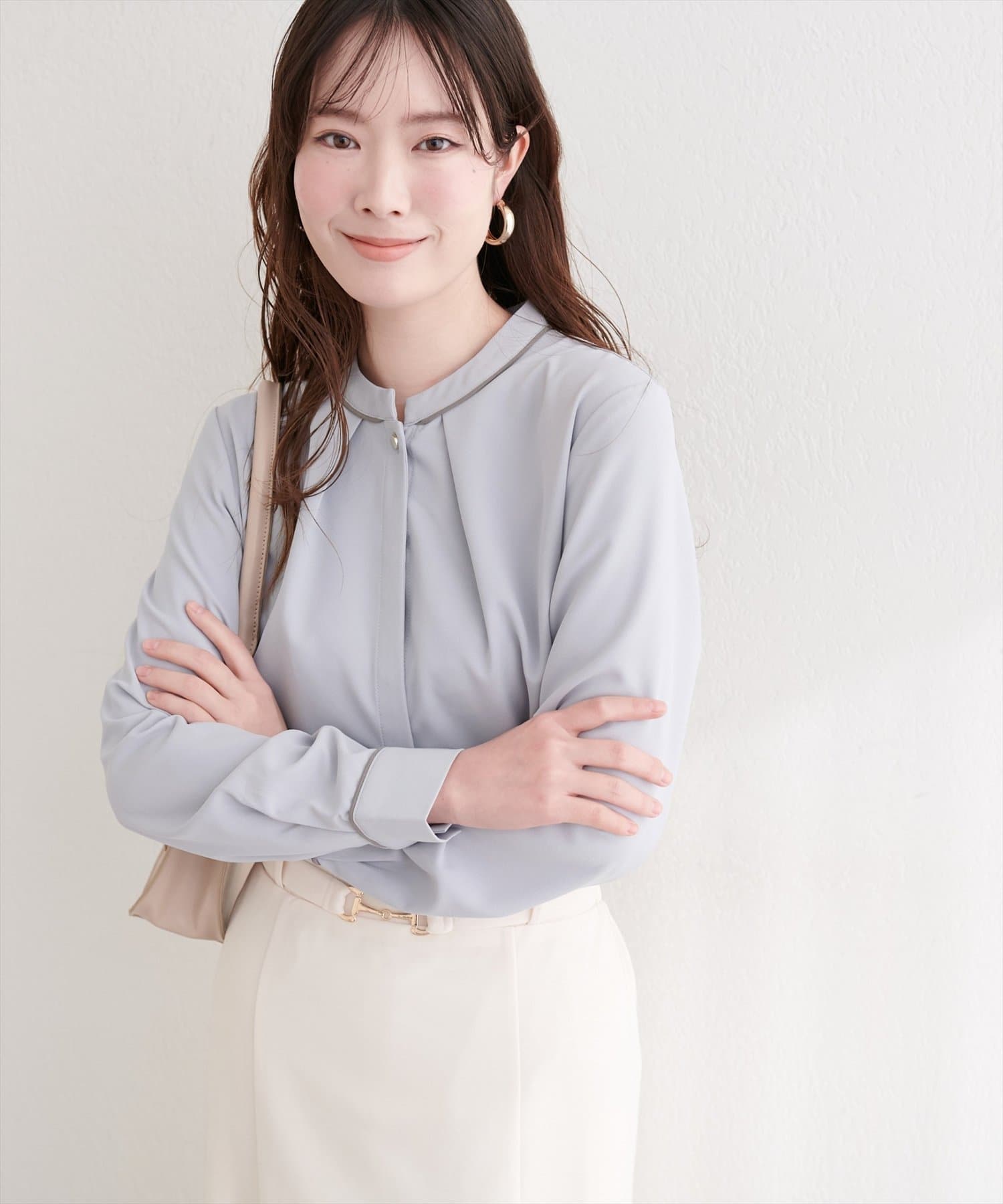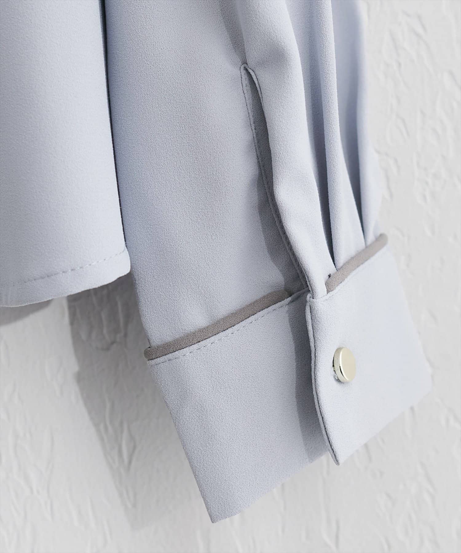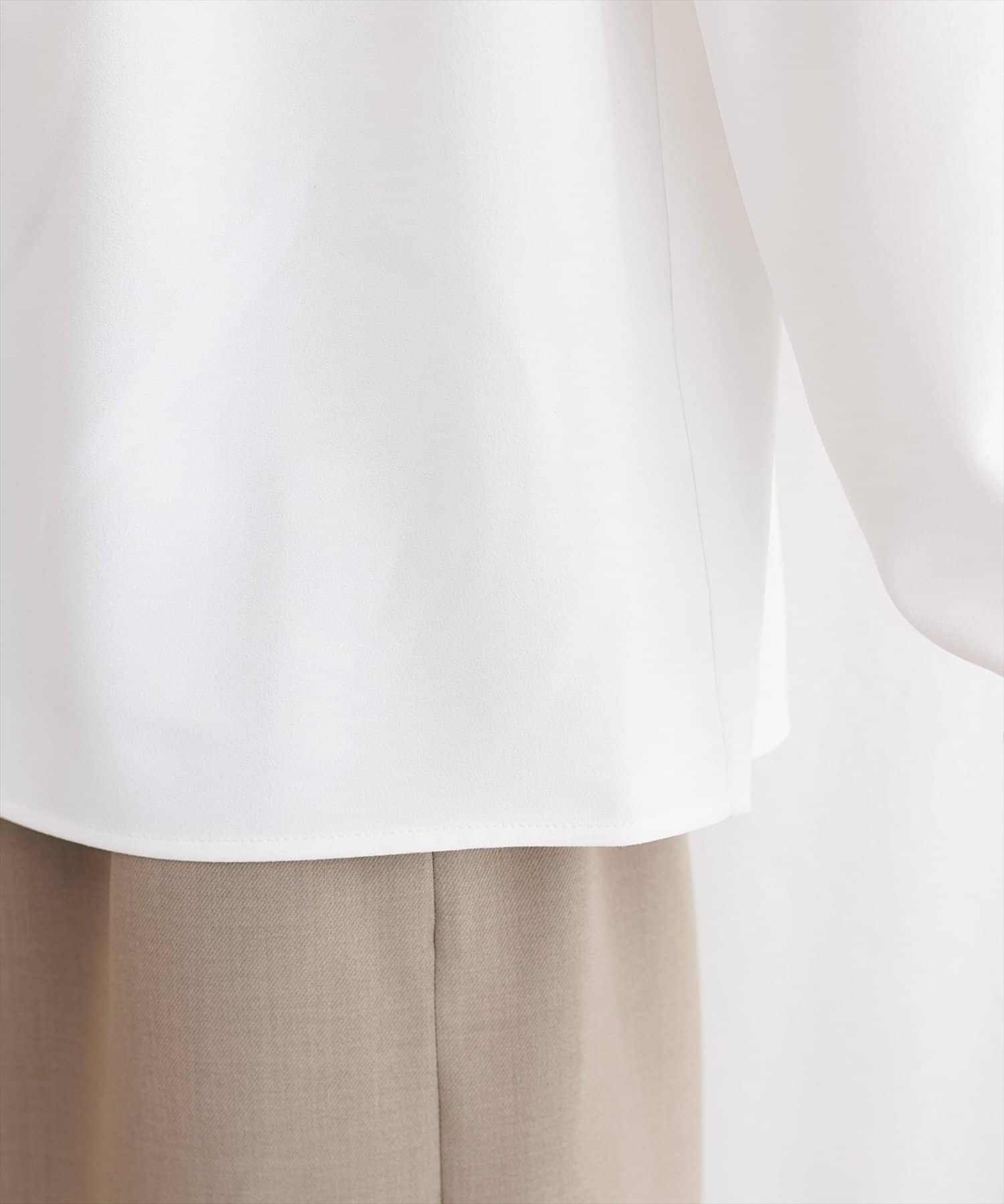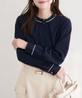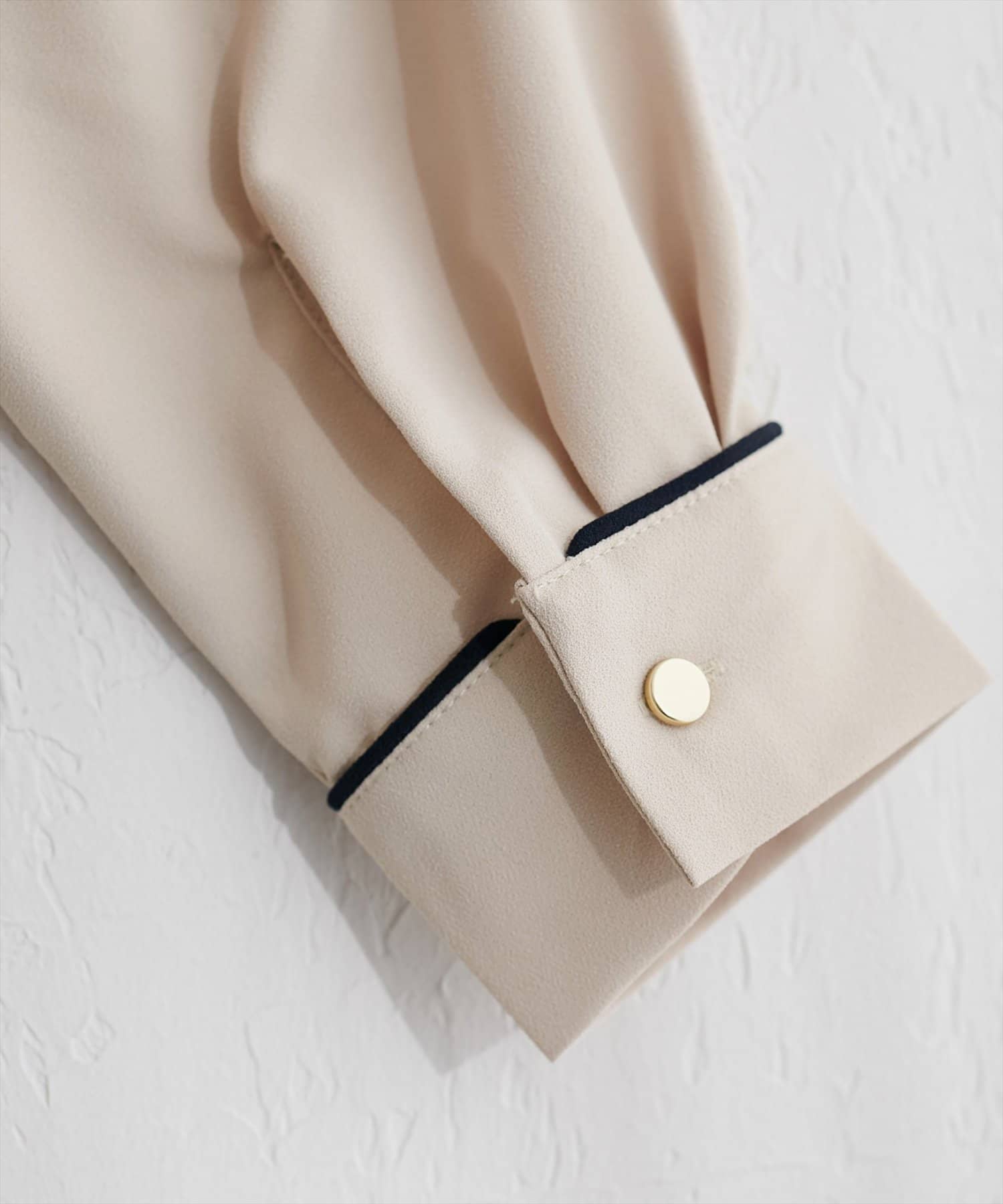洗練されたスタンドカラーと、襟元や袖口にあしらわれた繊細なパイピングがポイントのブラウス。
