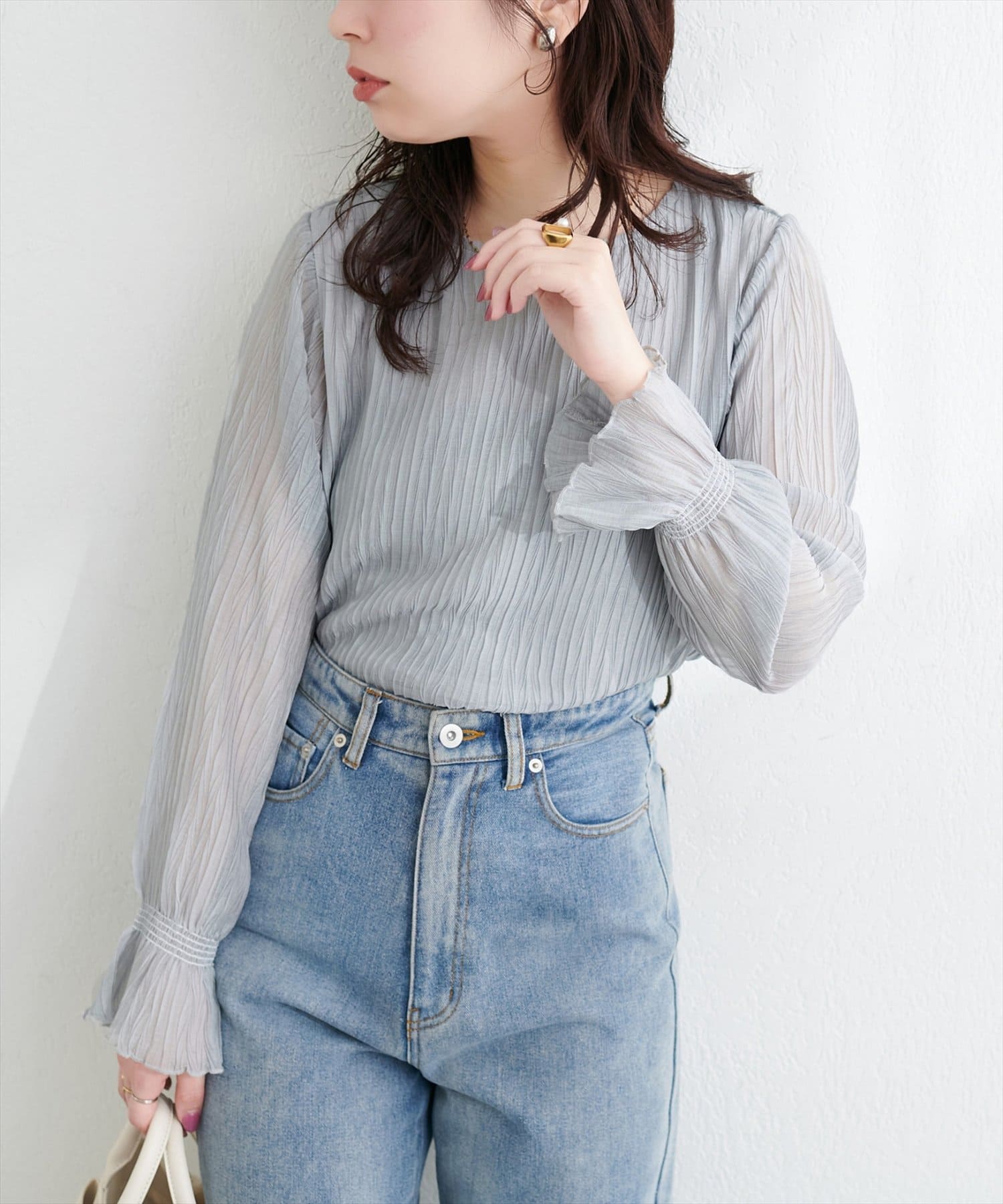 ブラウスの素材感が引き立つコーデに仕上がります。