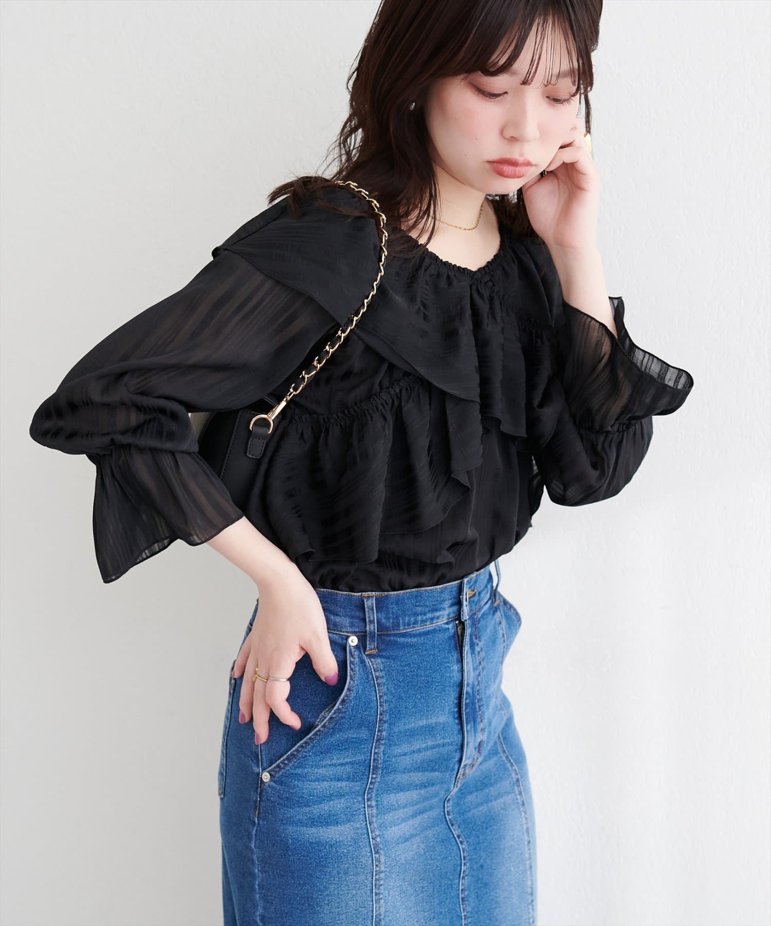 甘すぎない、大人の女性に似合う上品なフリル使いがポイント。