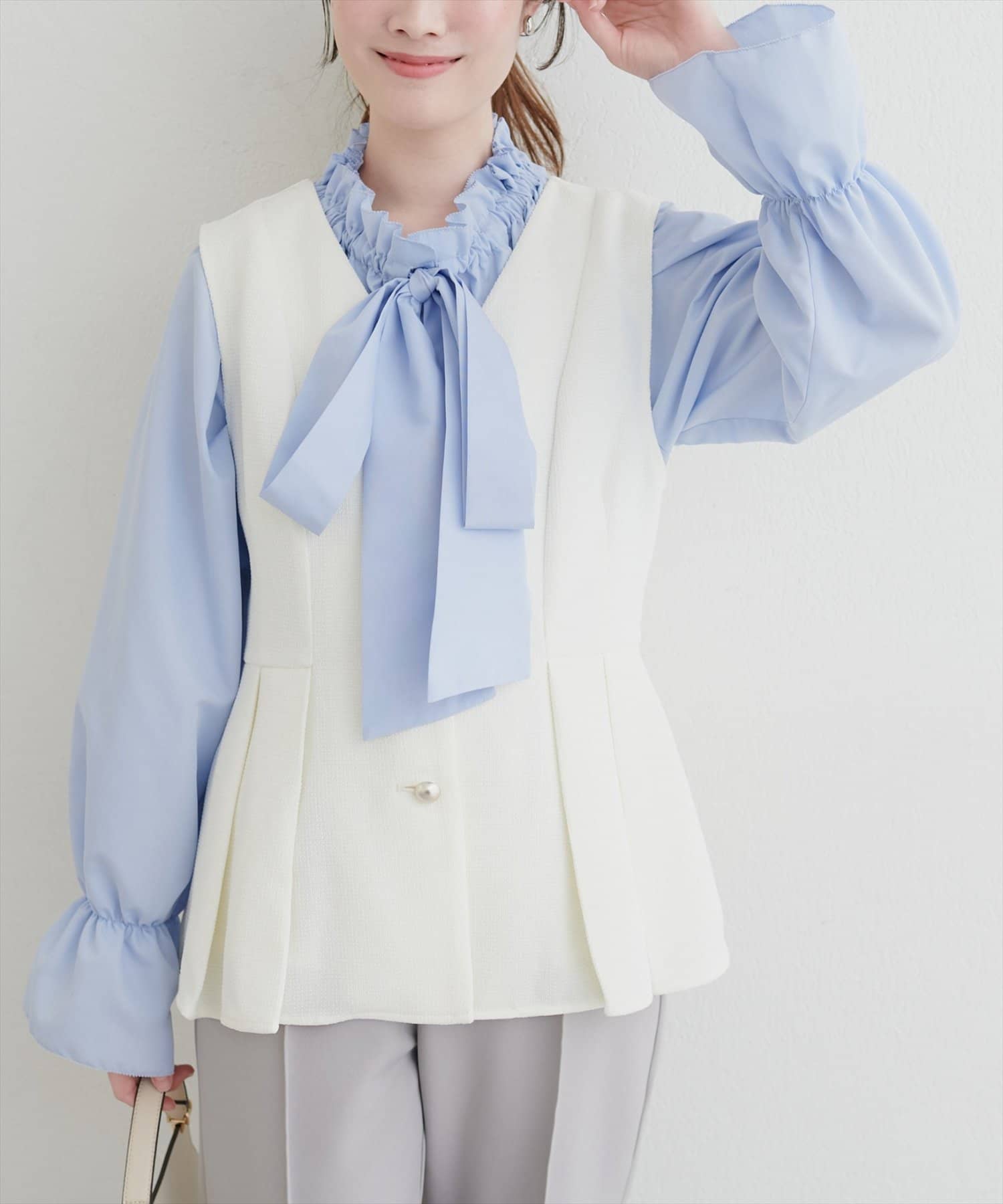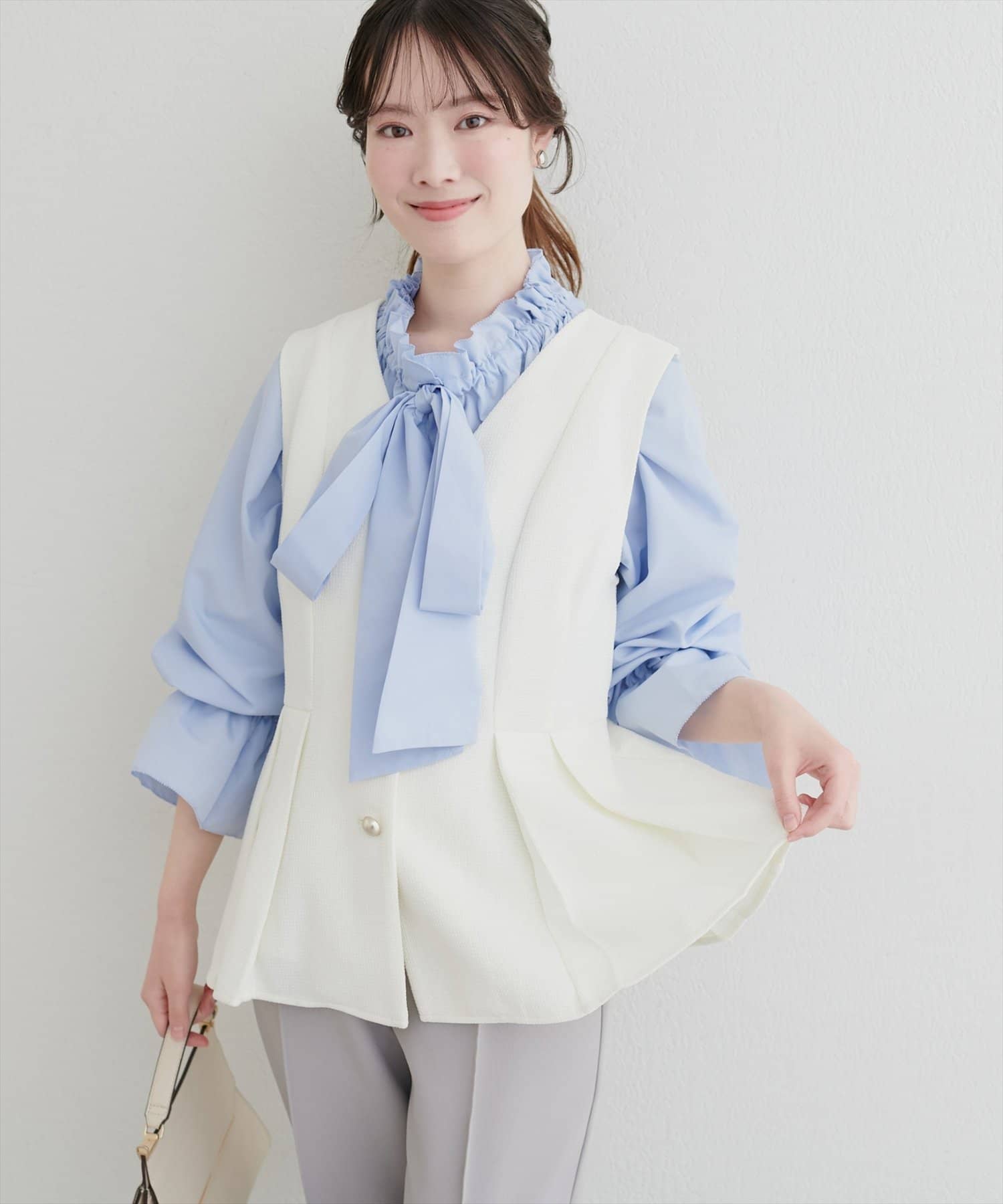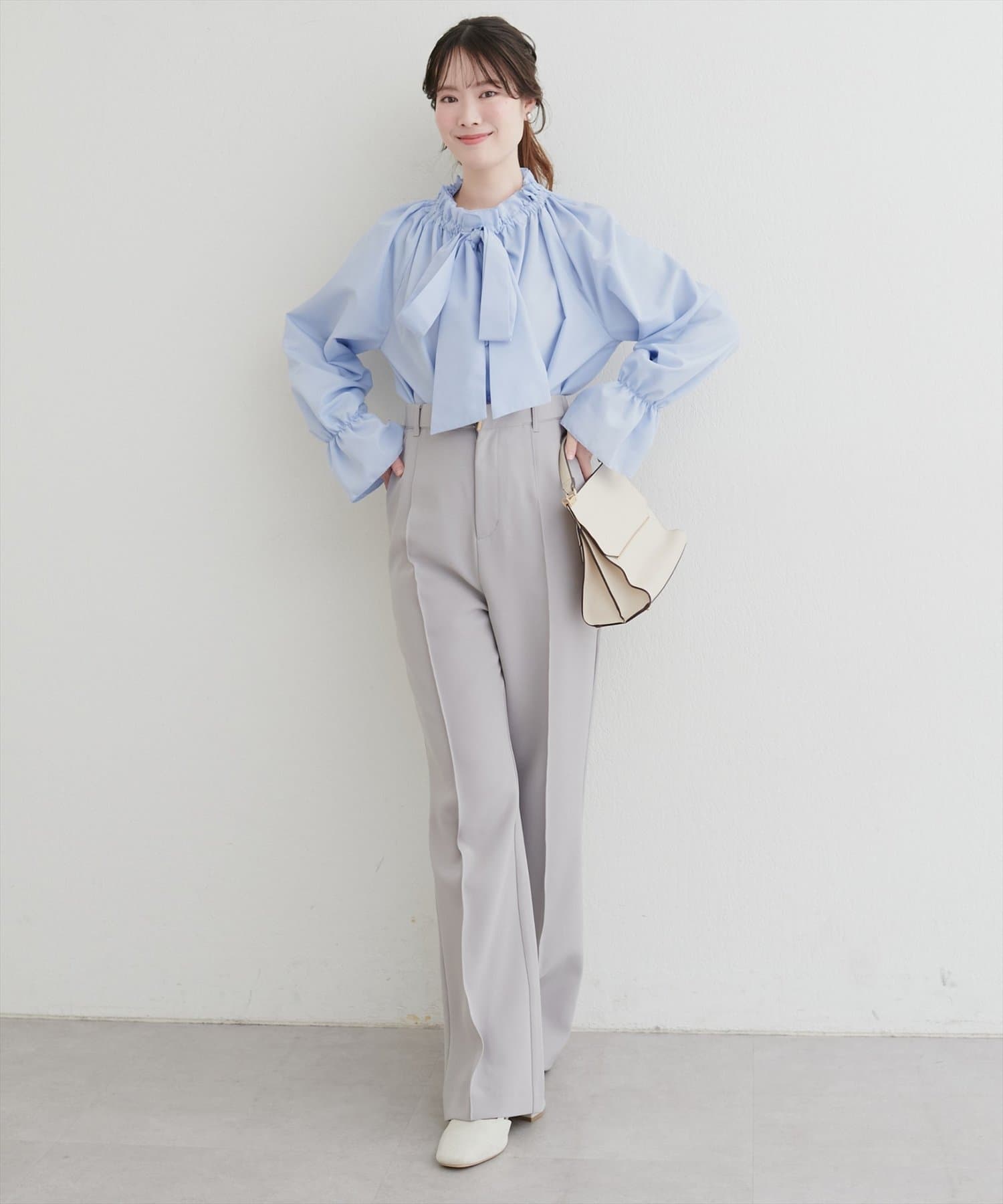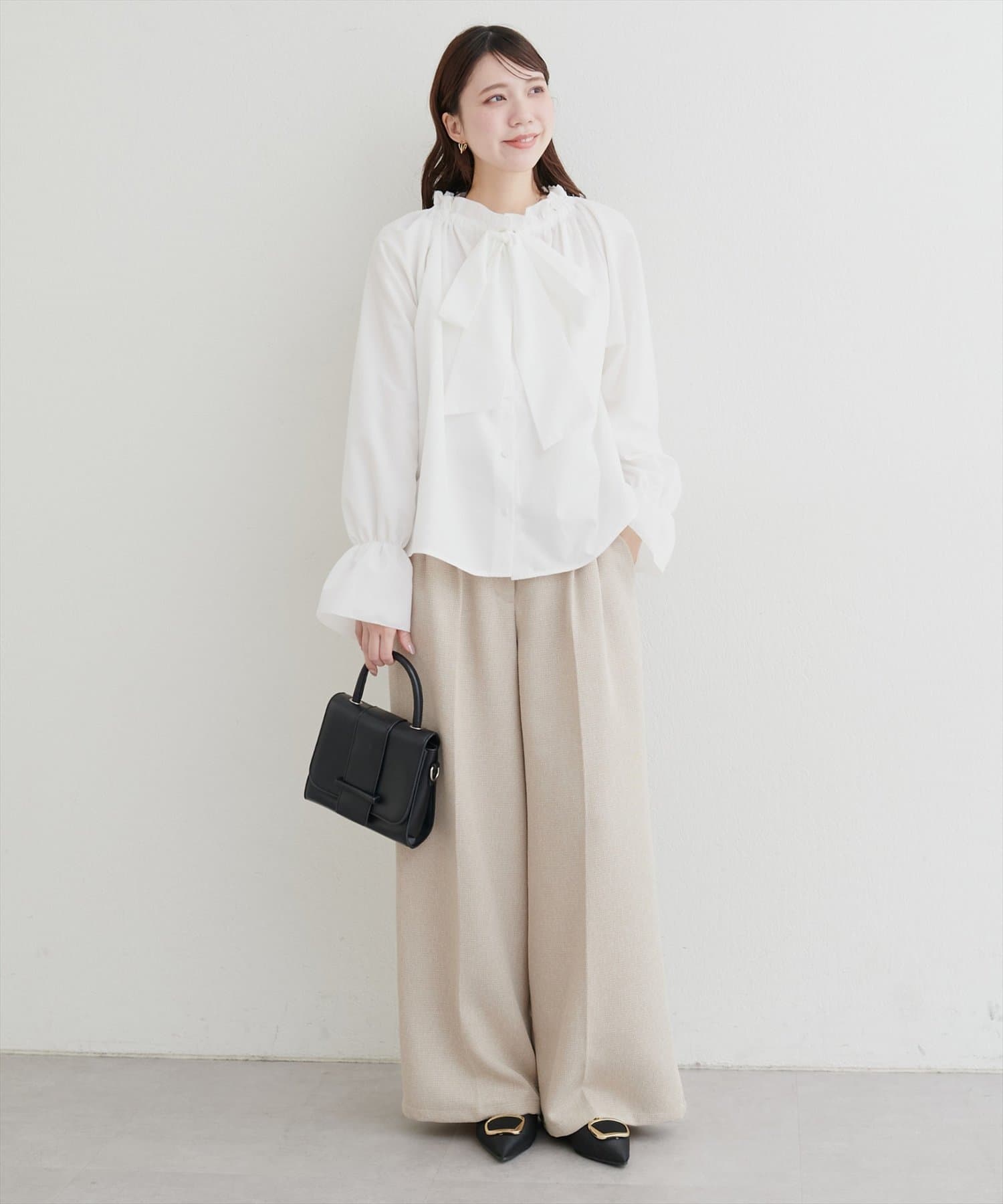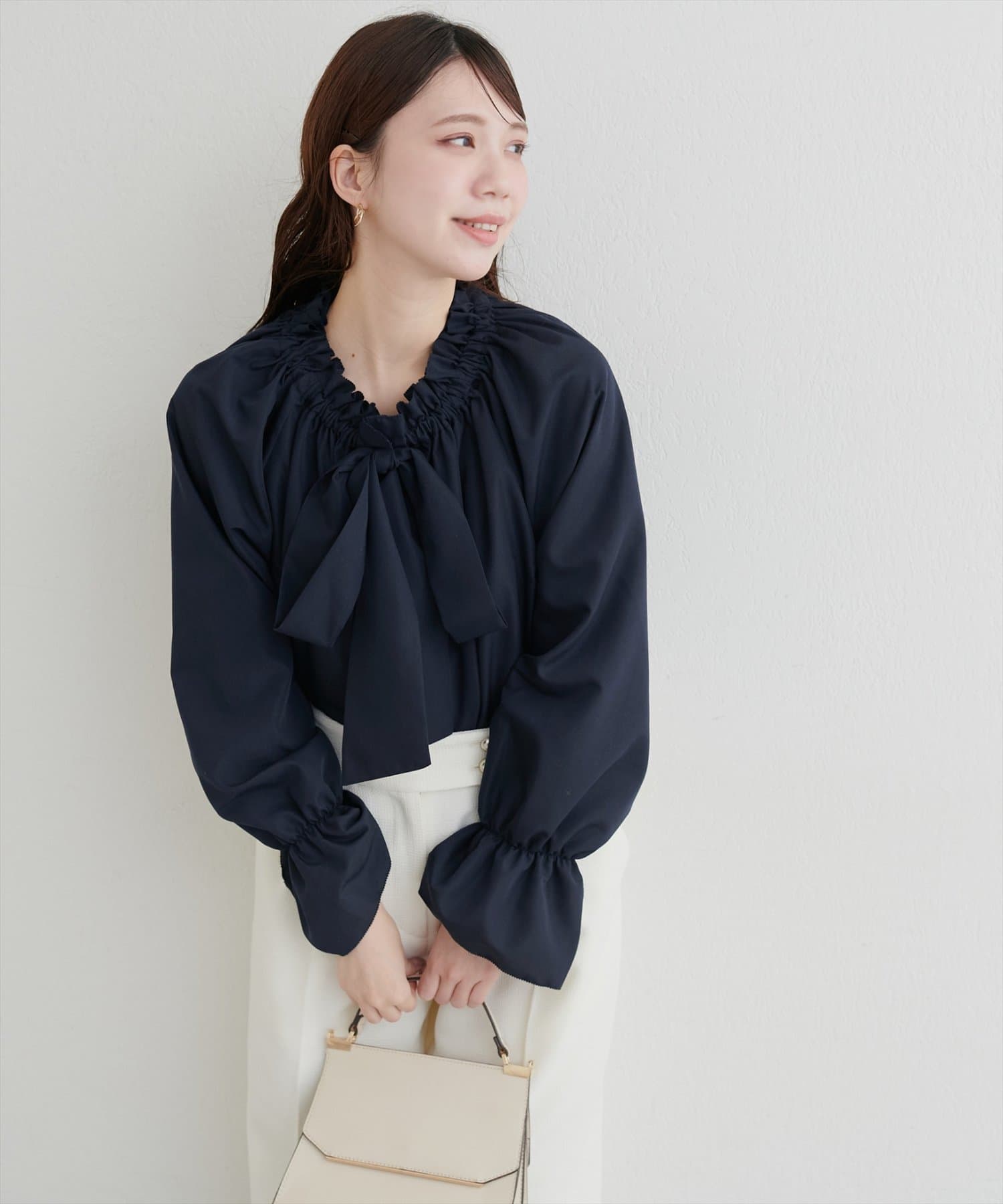 フェミニンなリボンが印象的なきれいめブラウス。上品で華やかな印象を与え、顔周りを明るく見せてくれます。