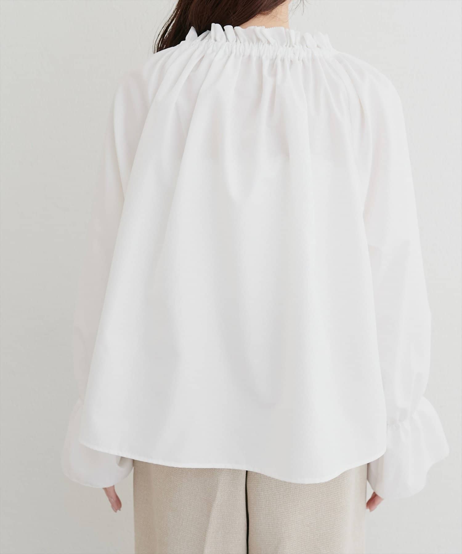 袖口のシャーリングが、さりげない可愛らしさをプラス。
