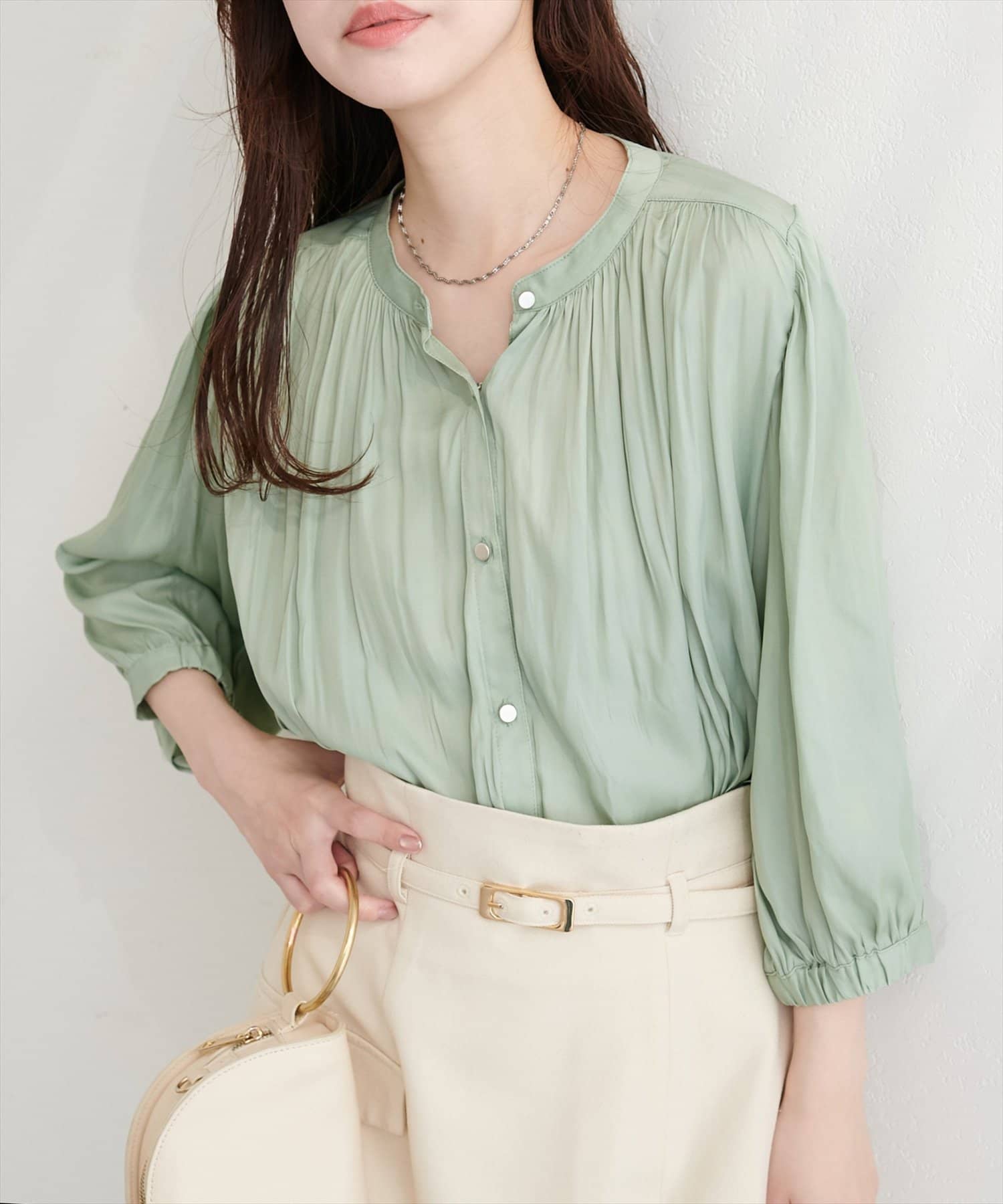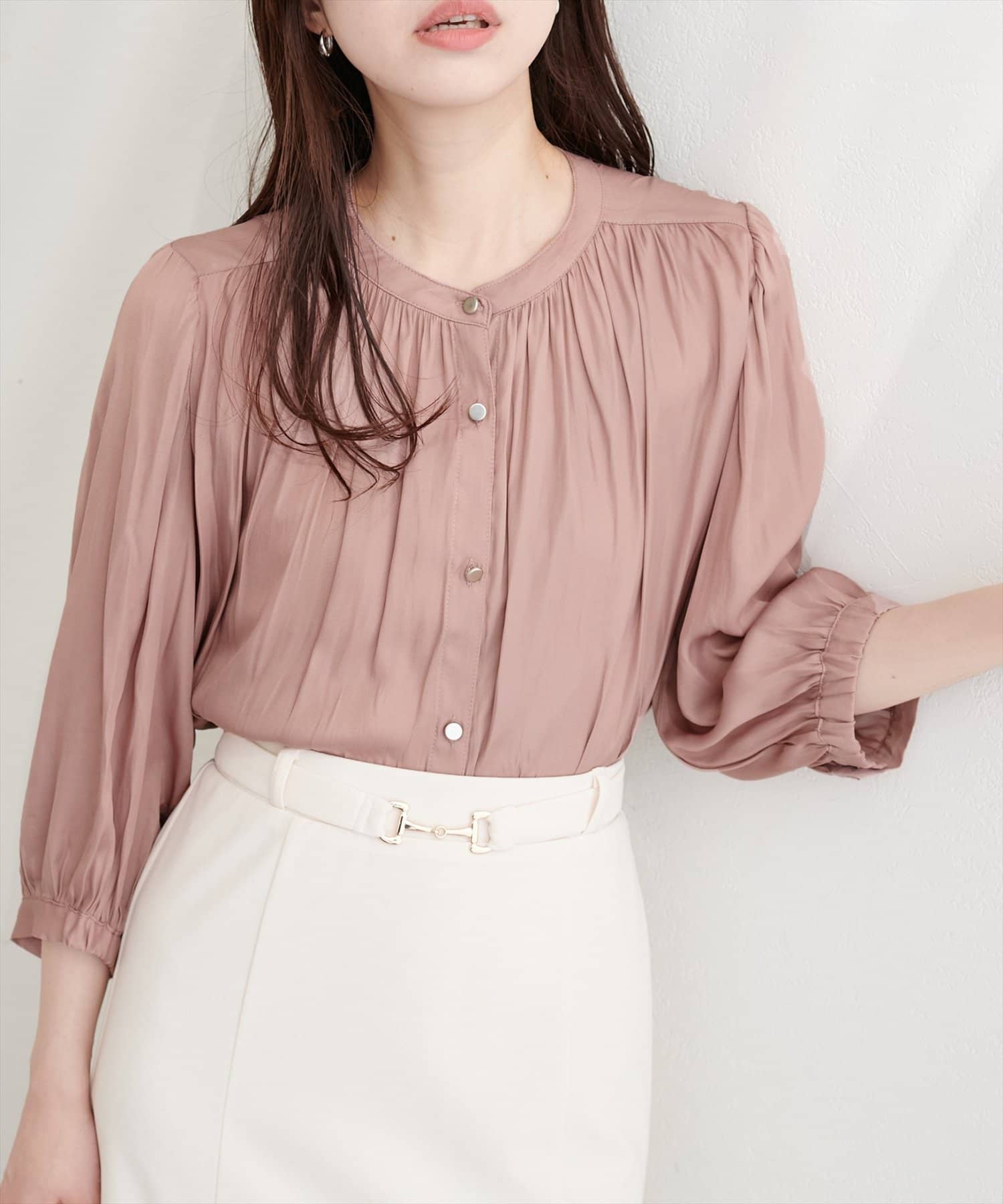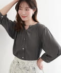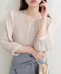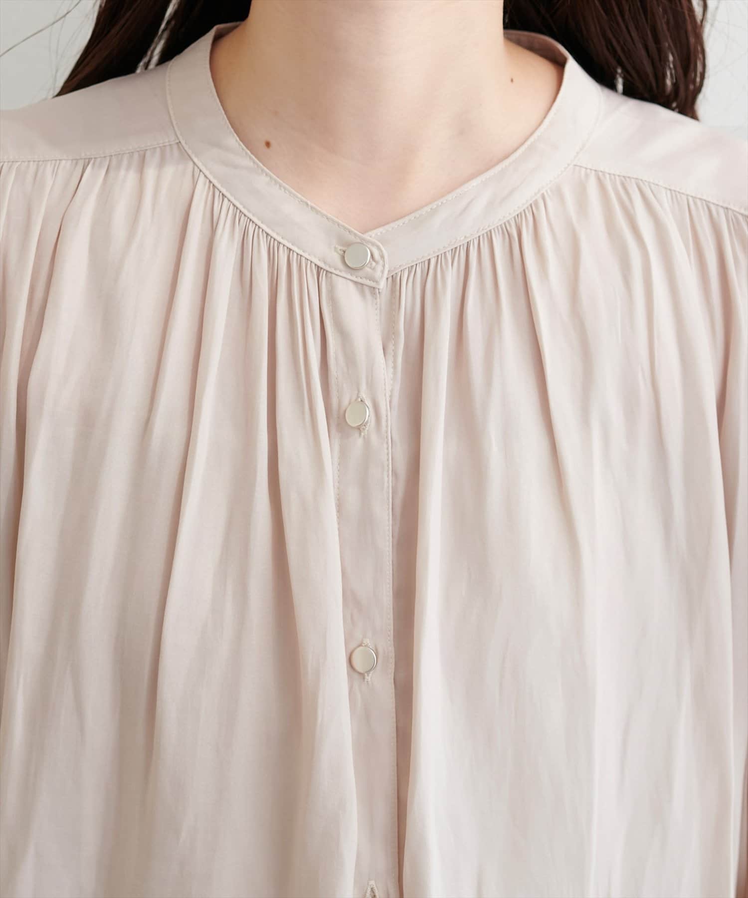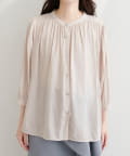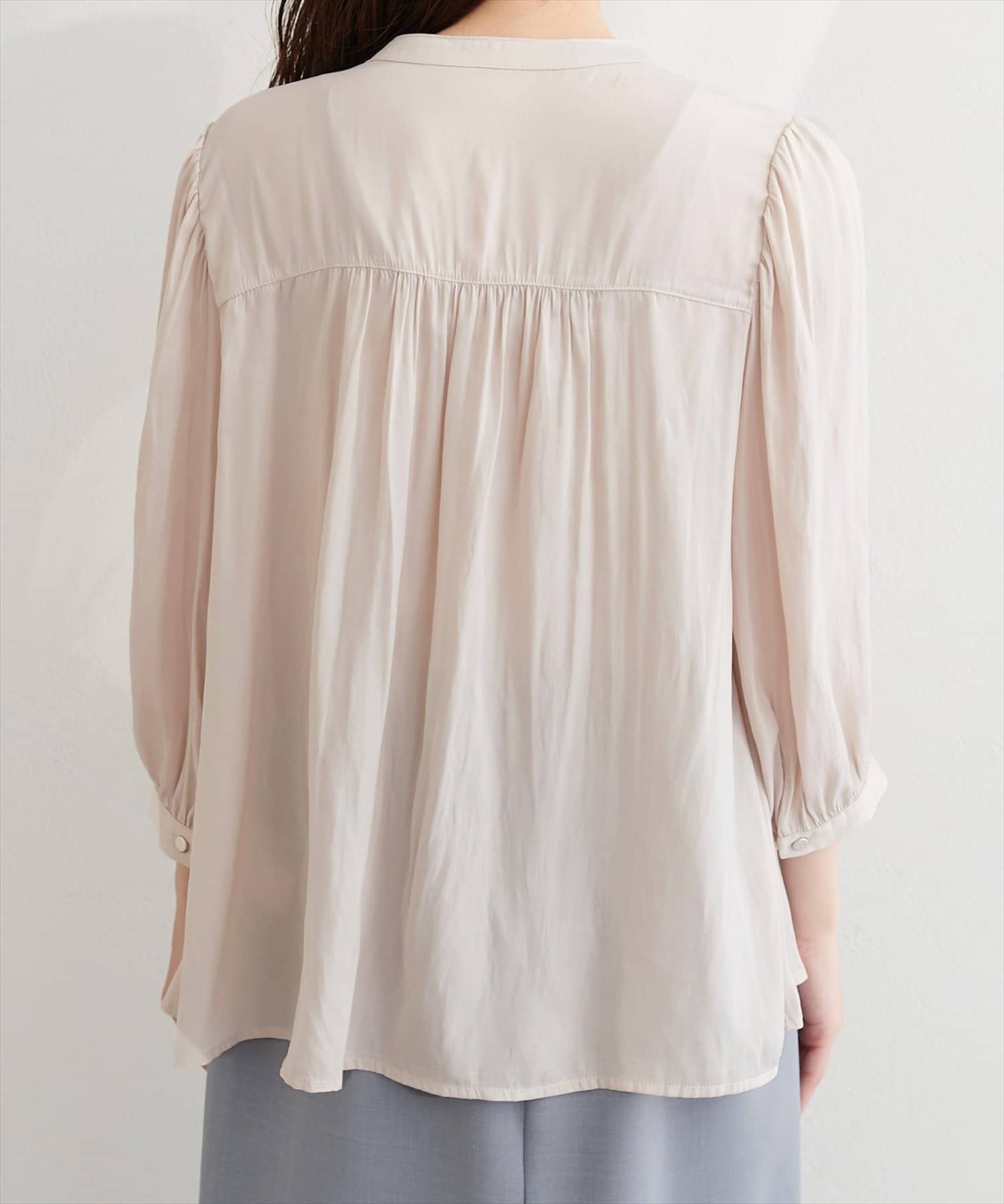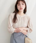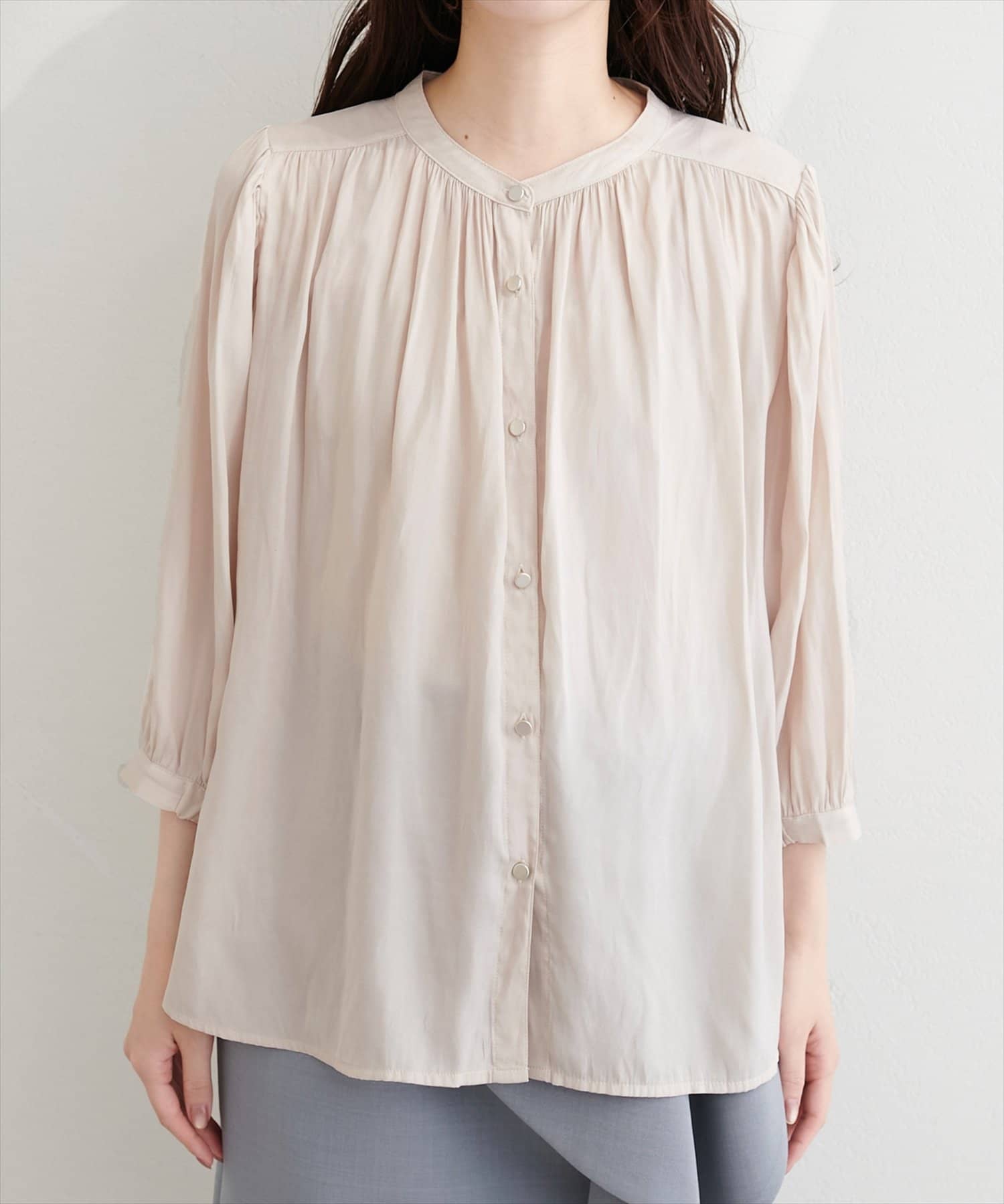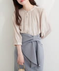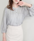 落ち感のあるとろみ素材と、たっぷりと施したギャザーが魅力の7分袖ブラウス。