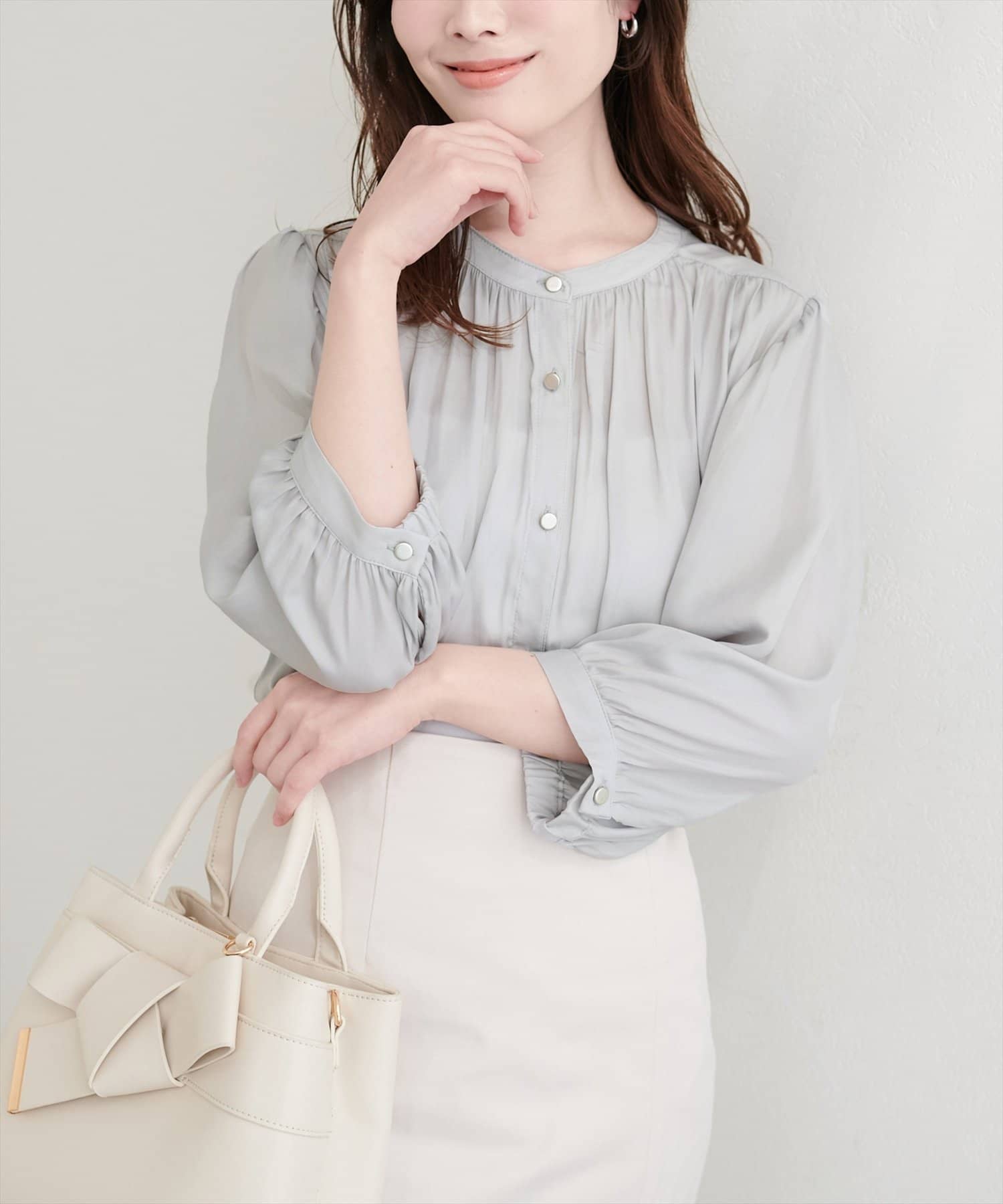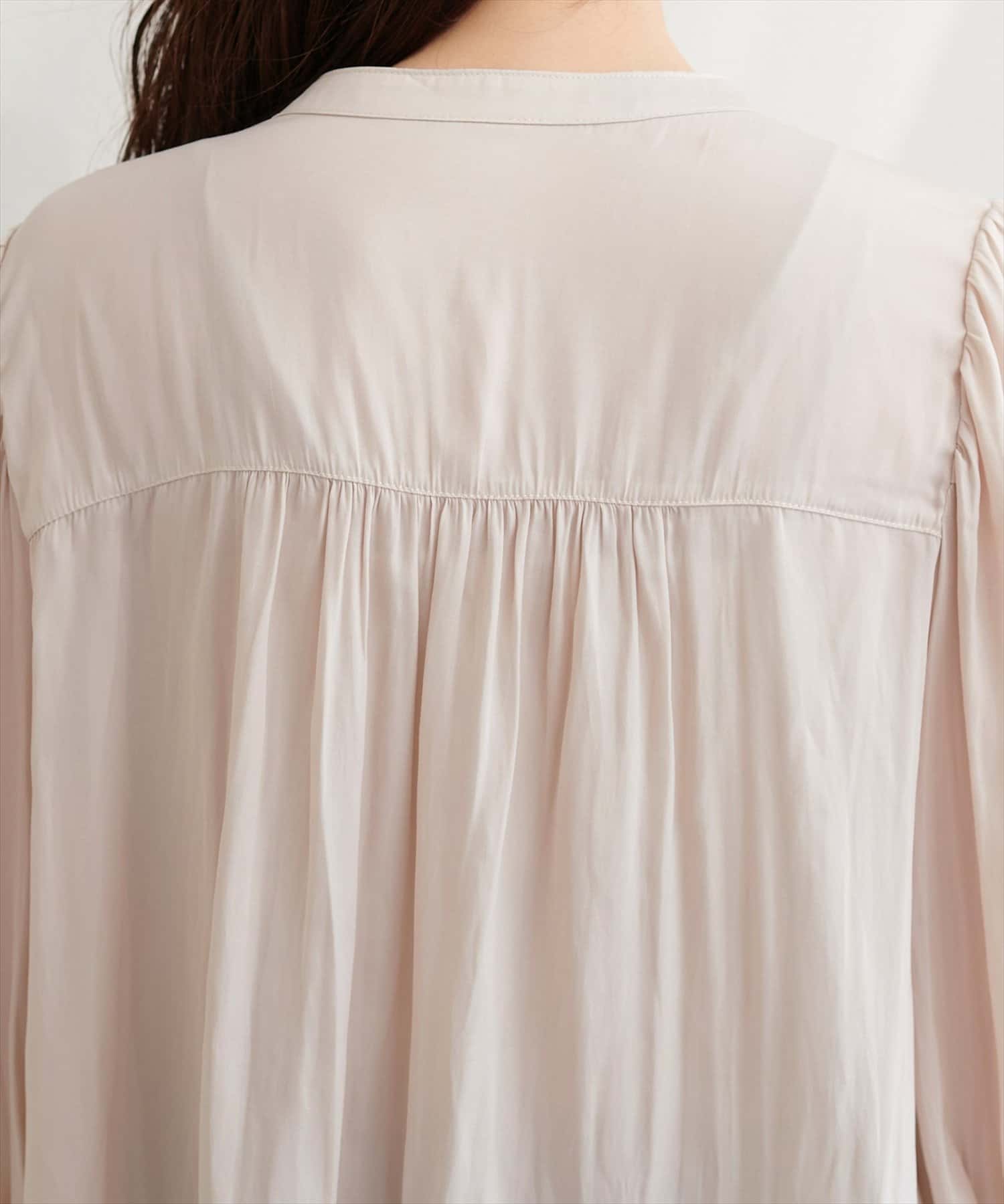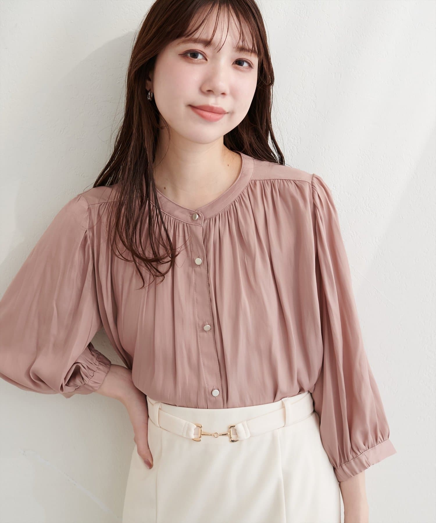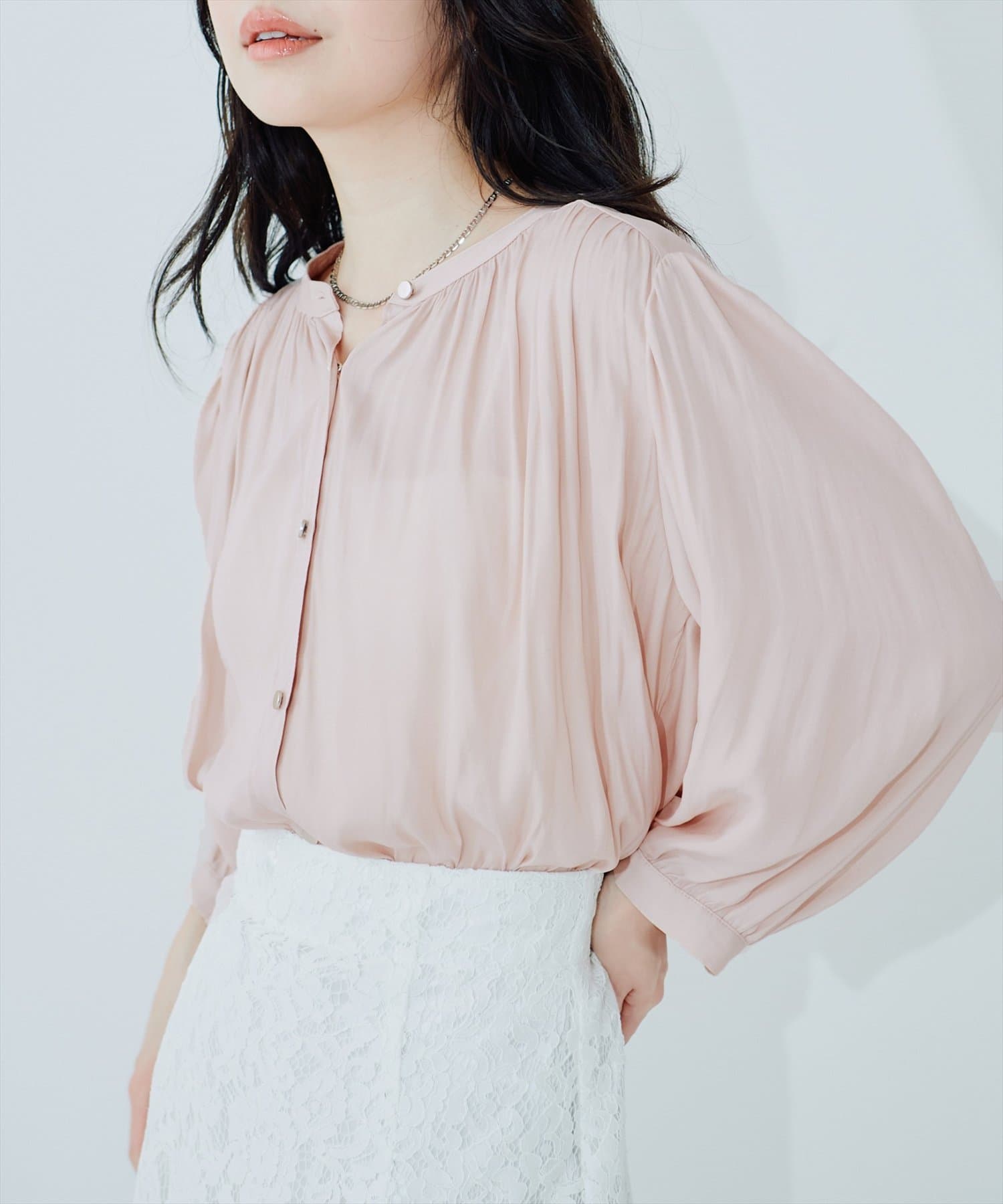 落ち感のあるとろみ素材と、たっぷりと施したギャザーが魅力の7分袖ブラウス。