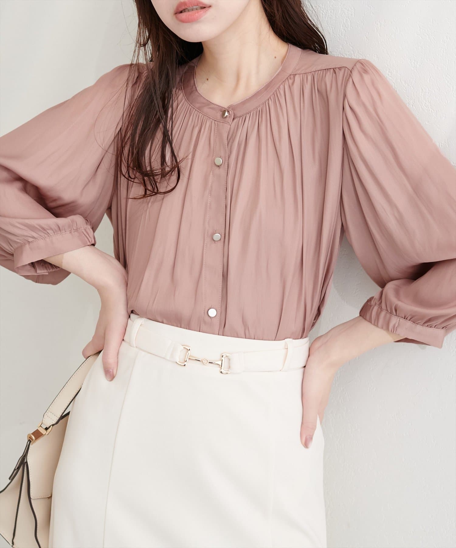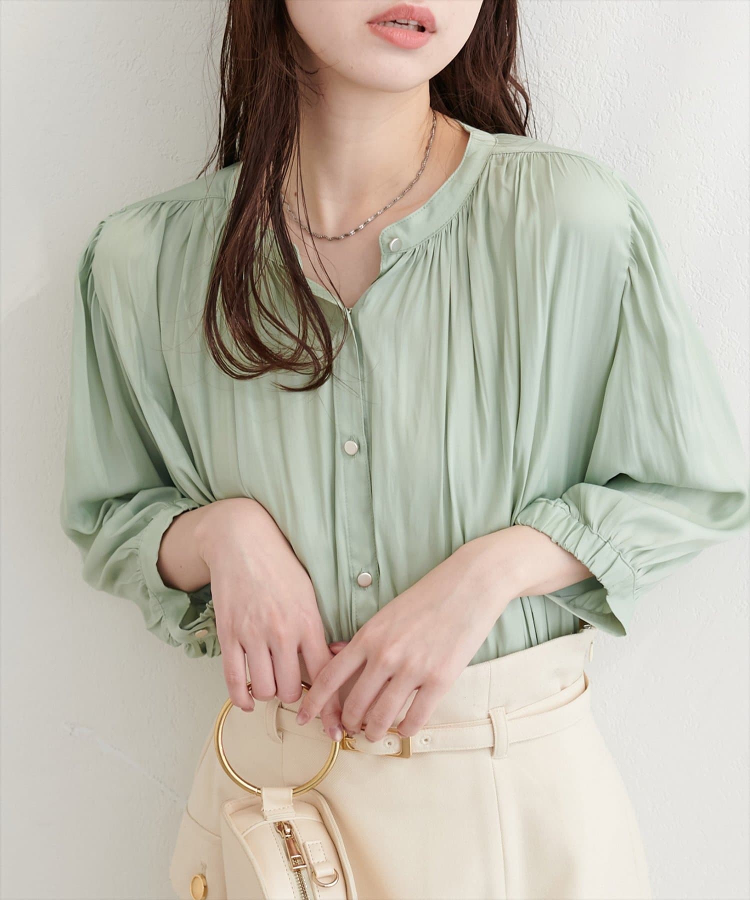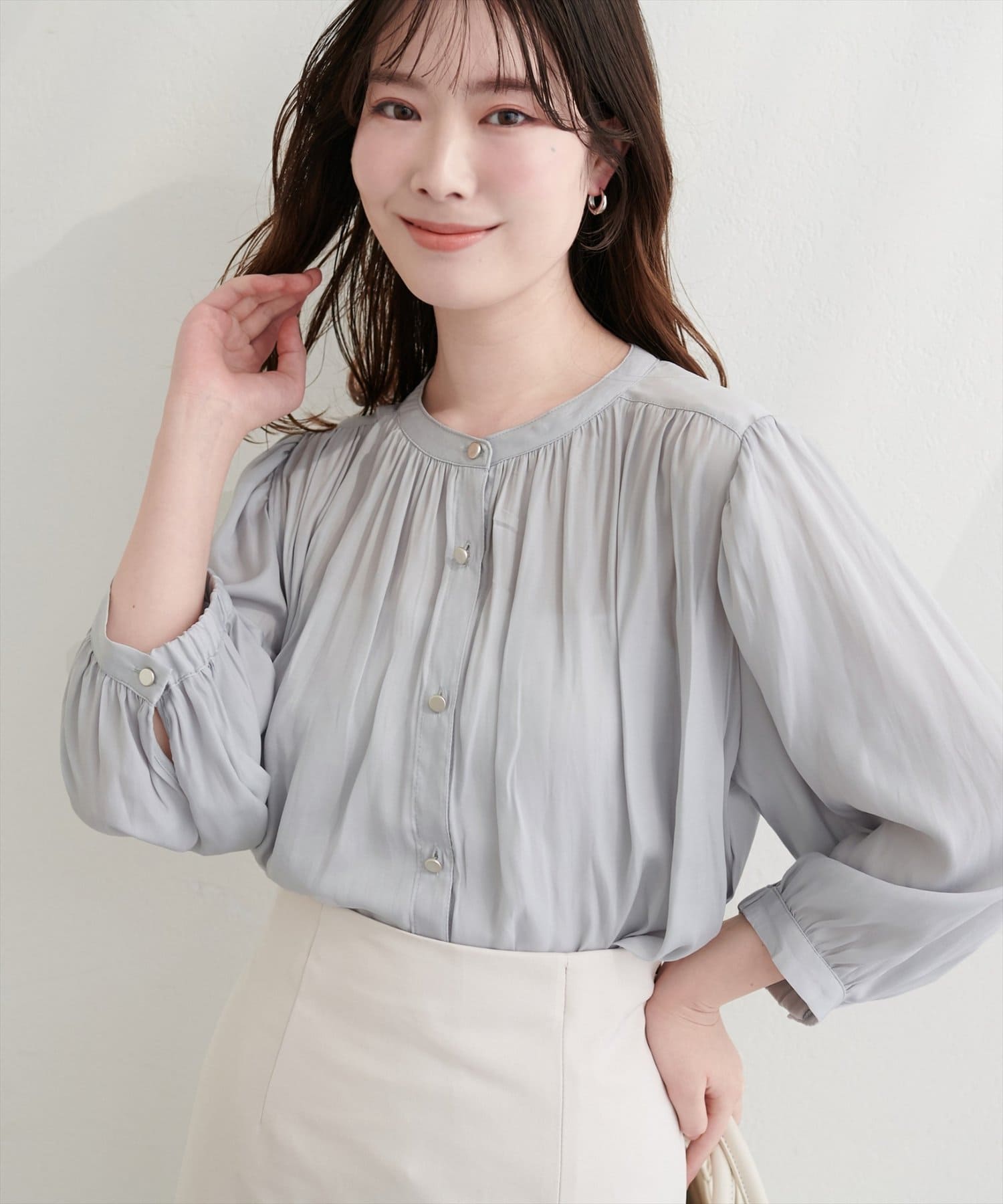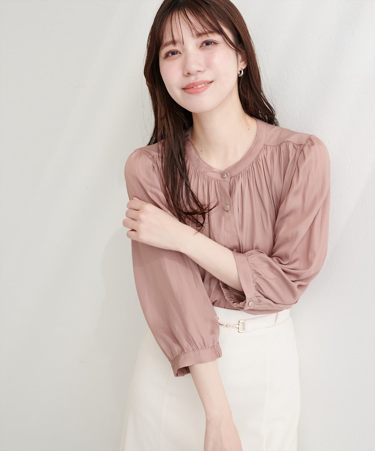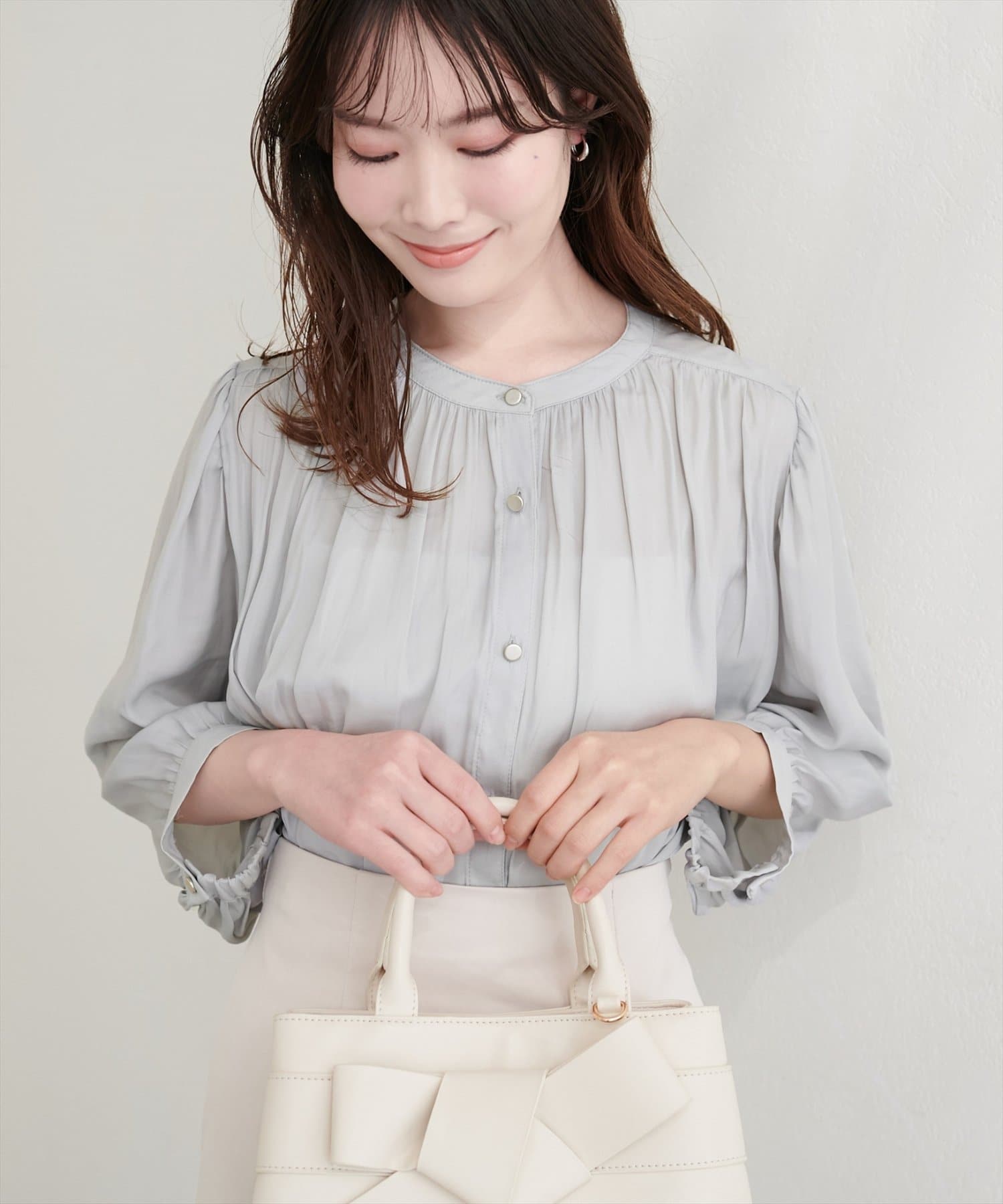 落ち感のあるとろみ素材と、たっぷりと施したギャザーが魅力の7分袖ブラウス。