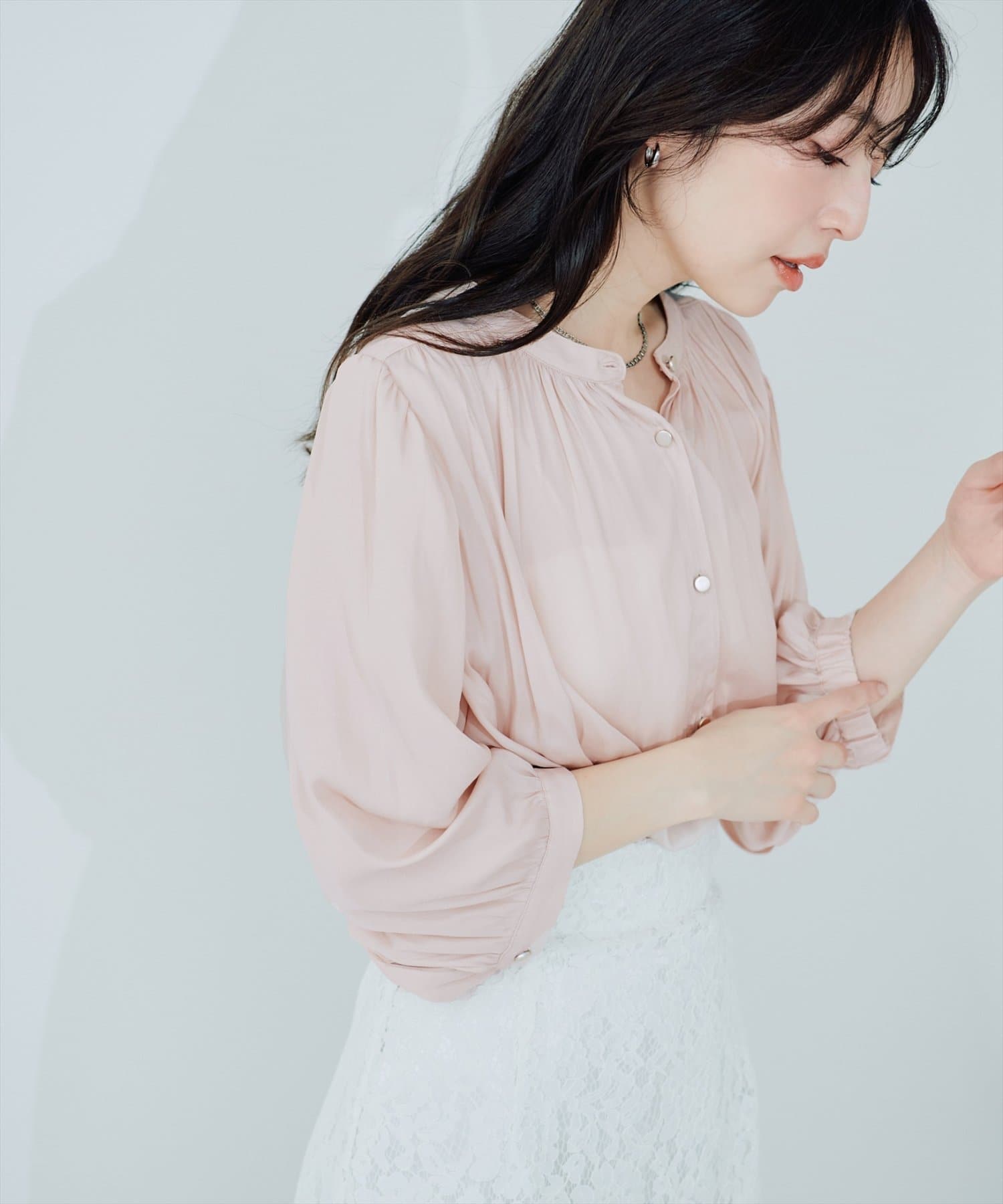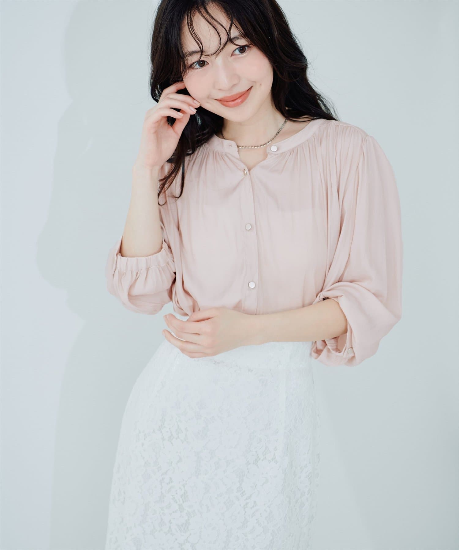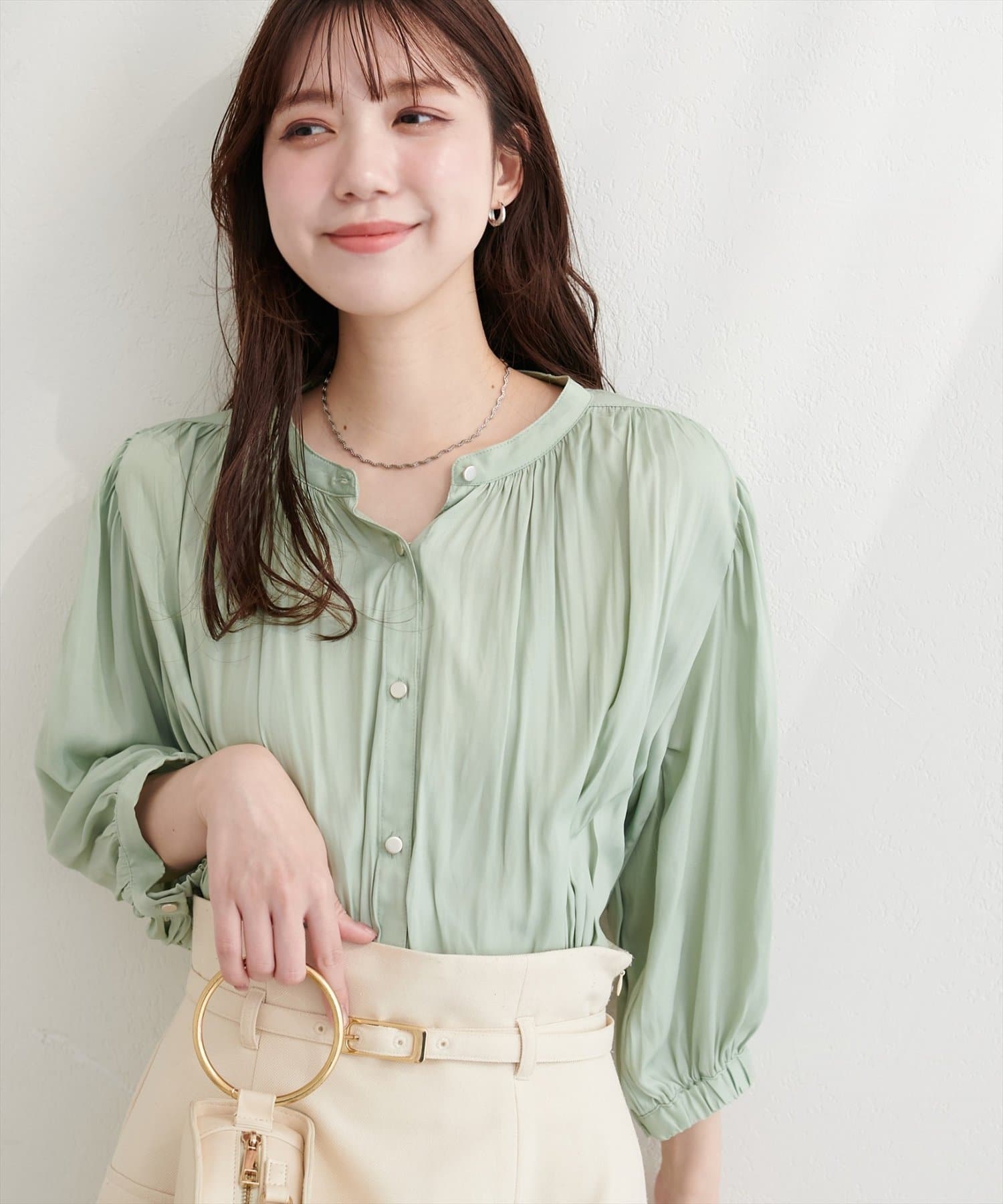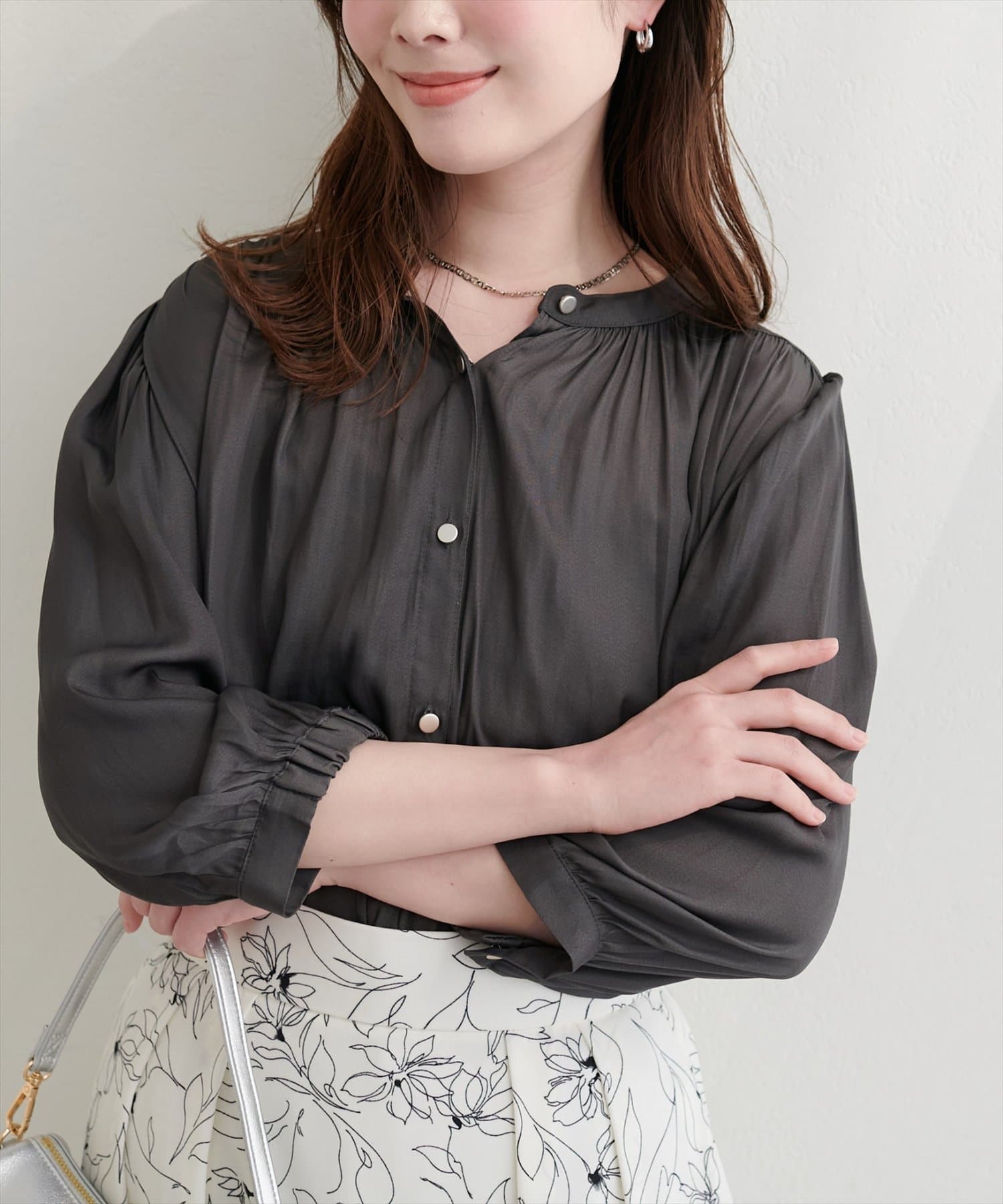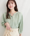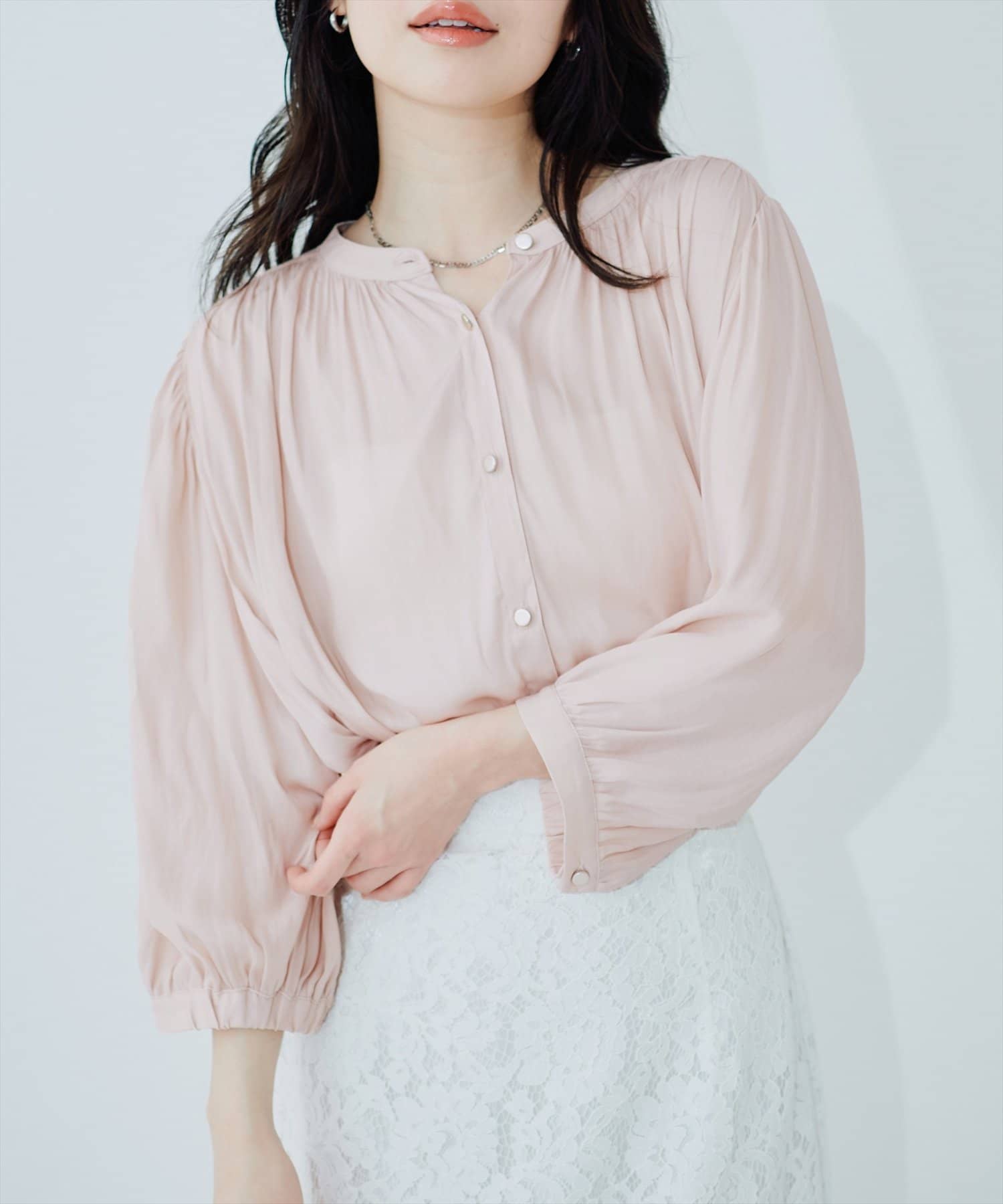 落ち感のあるとろみ素材と、たっぷりと施したギャザーが魅力の7分袖ブラウス。