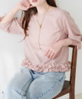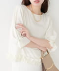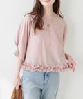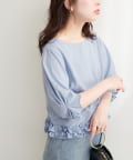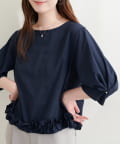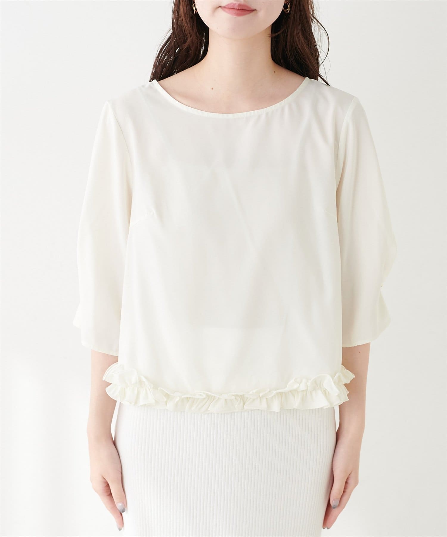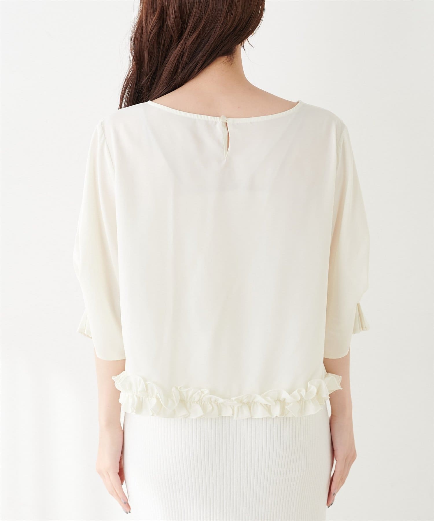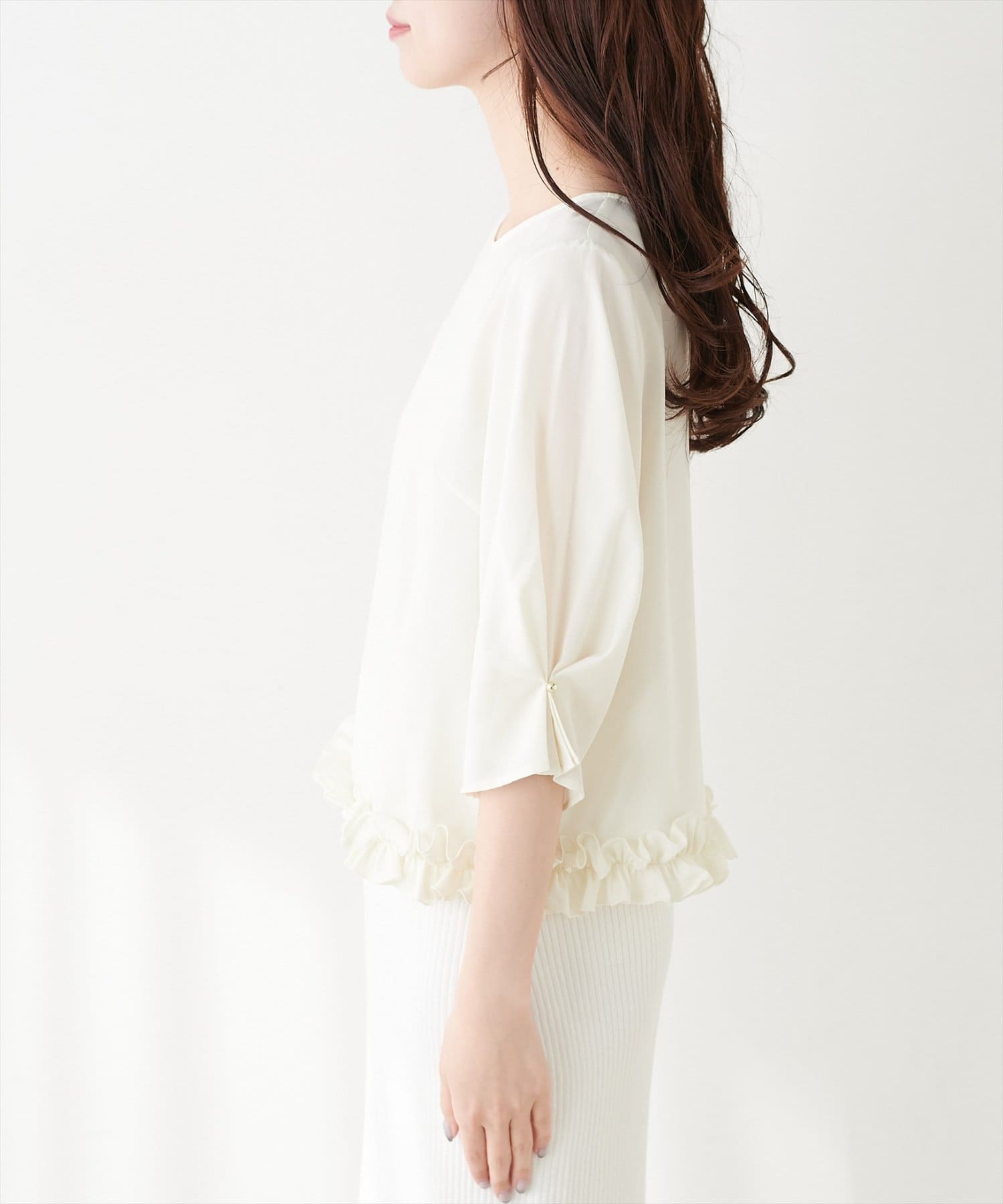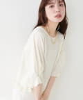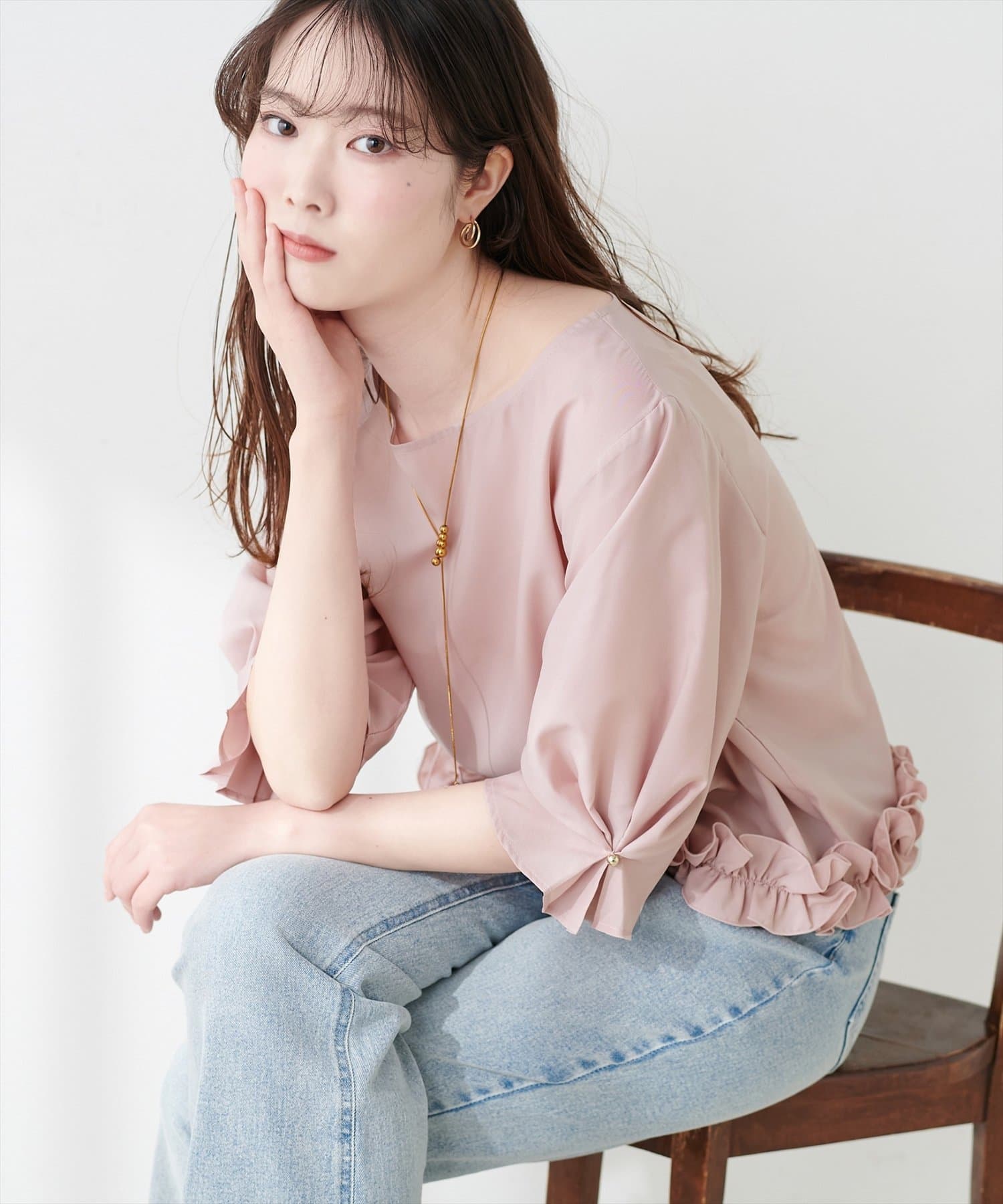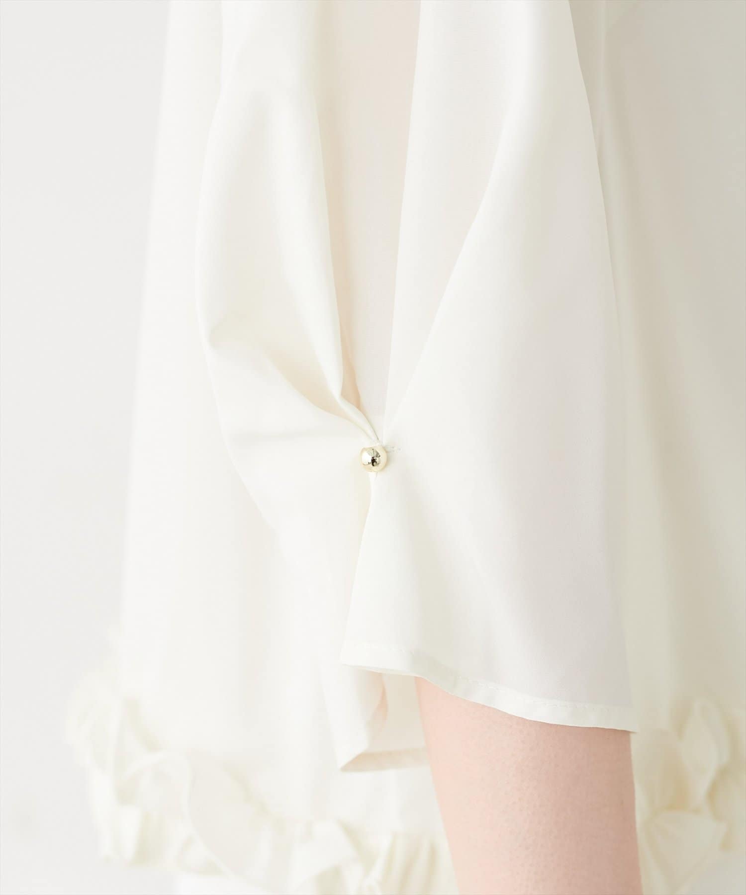 袖にあしらわれたタックと、裾のフリルデザインが愛らしい一枚。