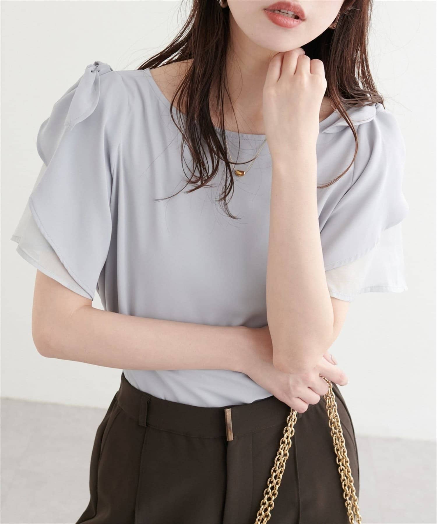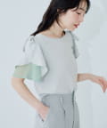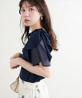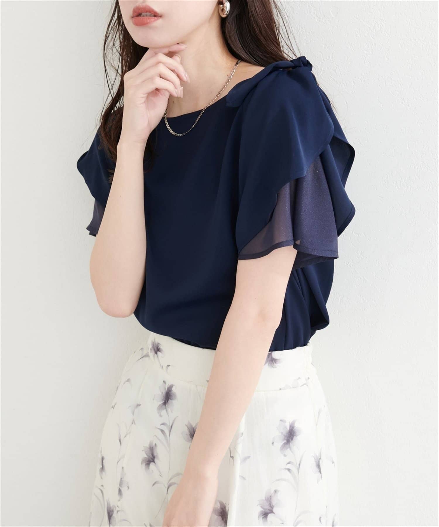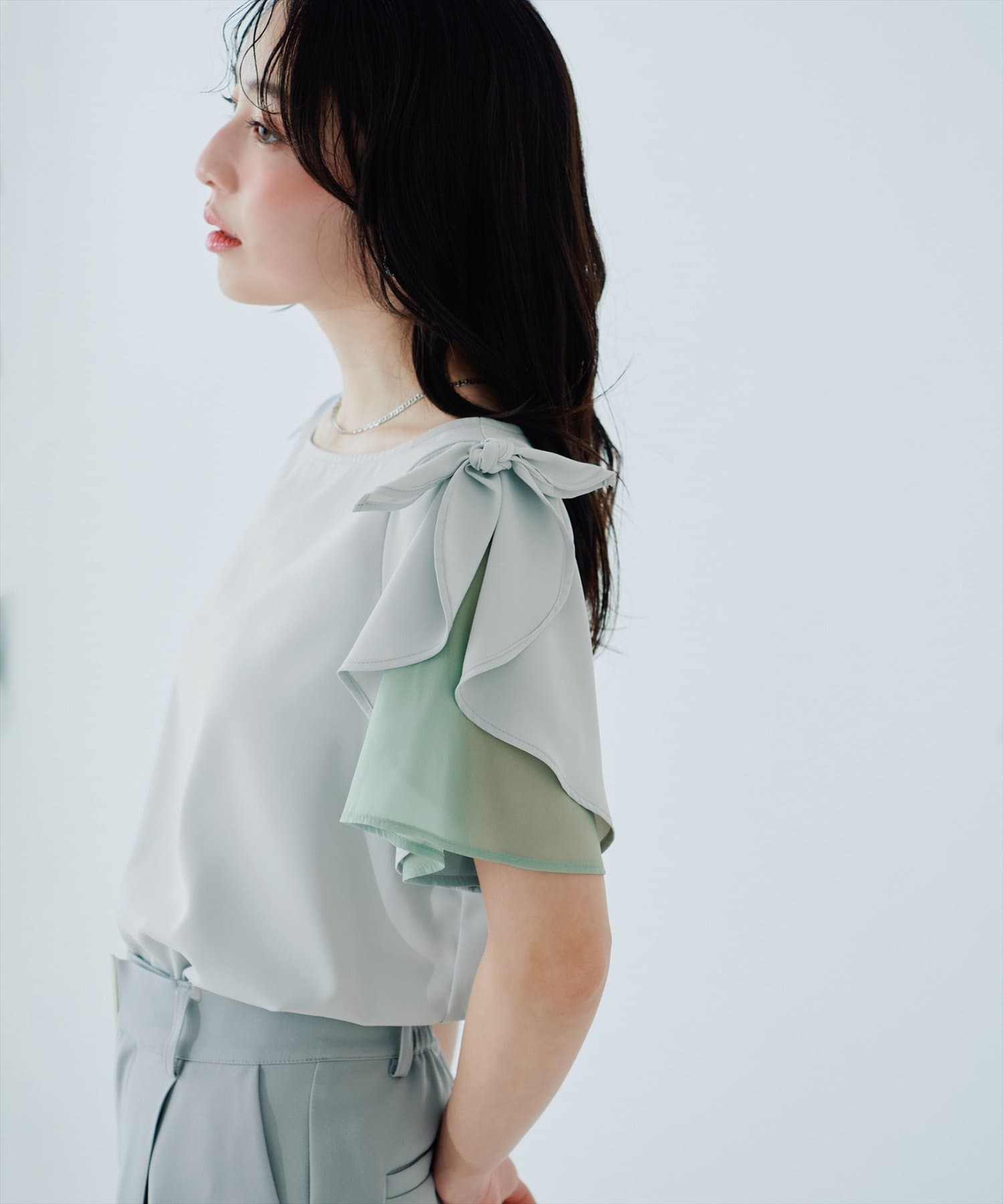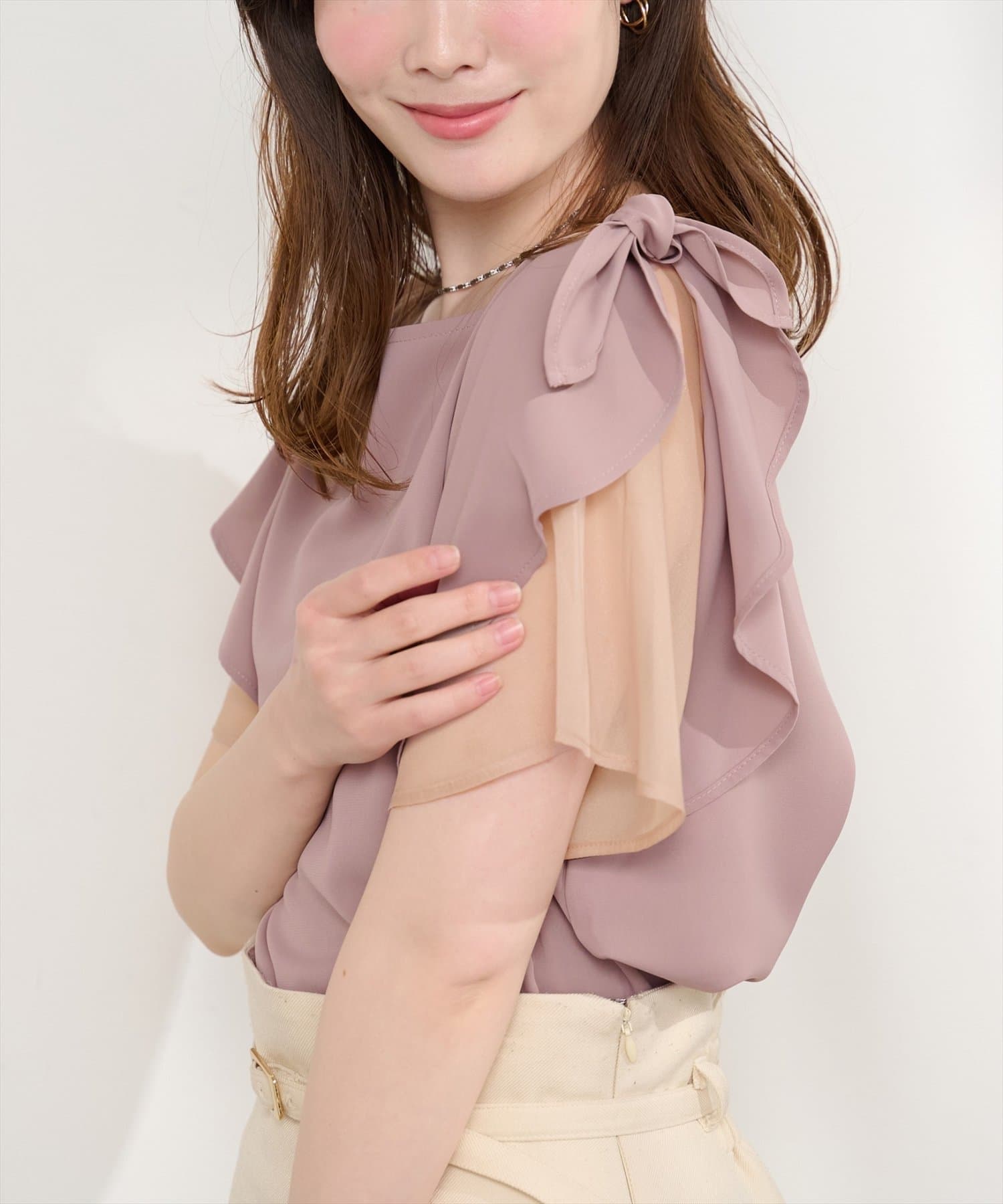 肩のさりげないリボンとラッフルズスリーブが魅力のブラウス。