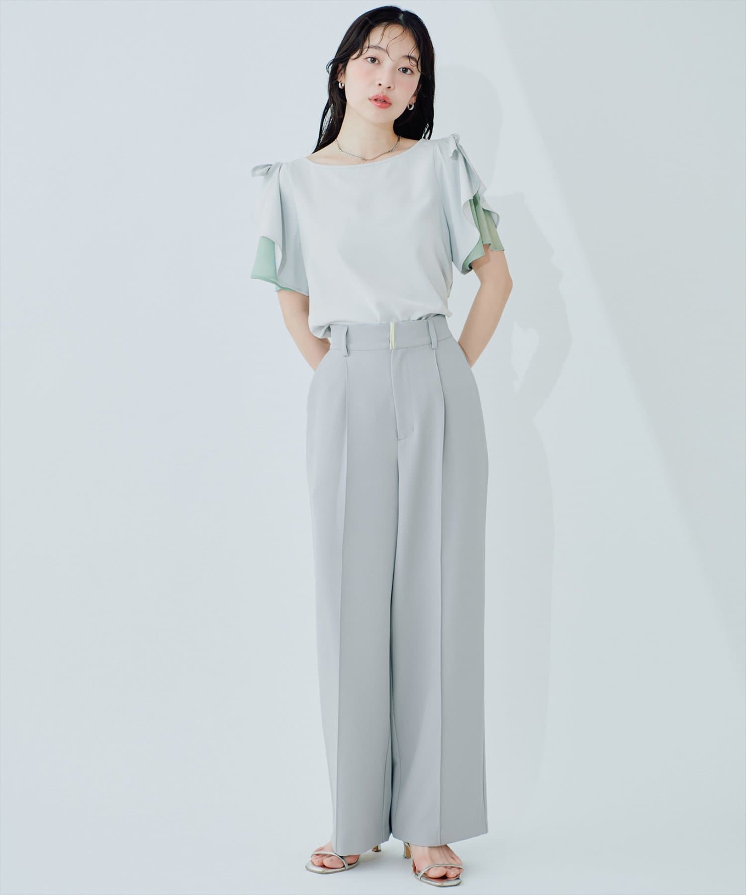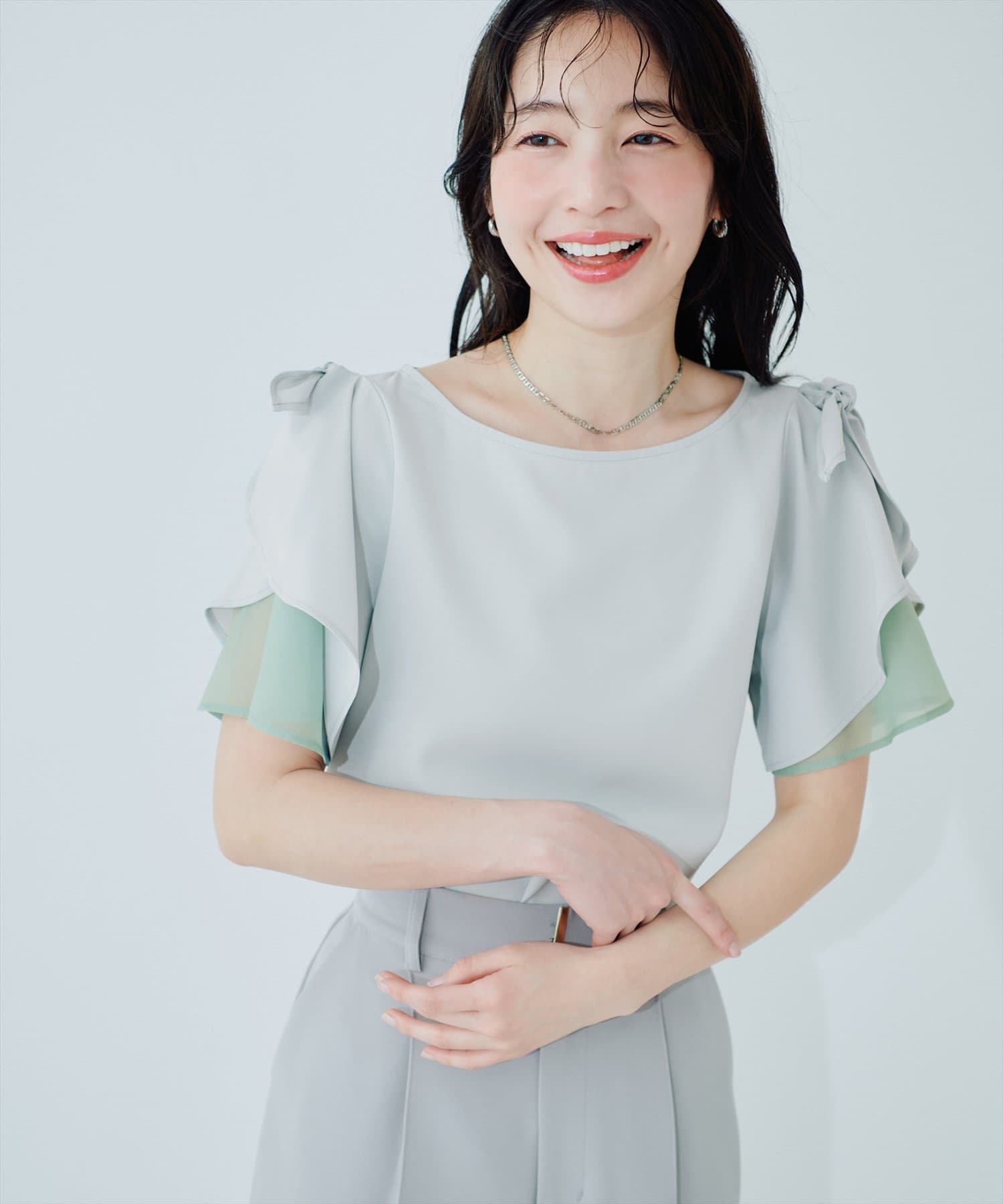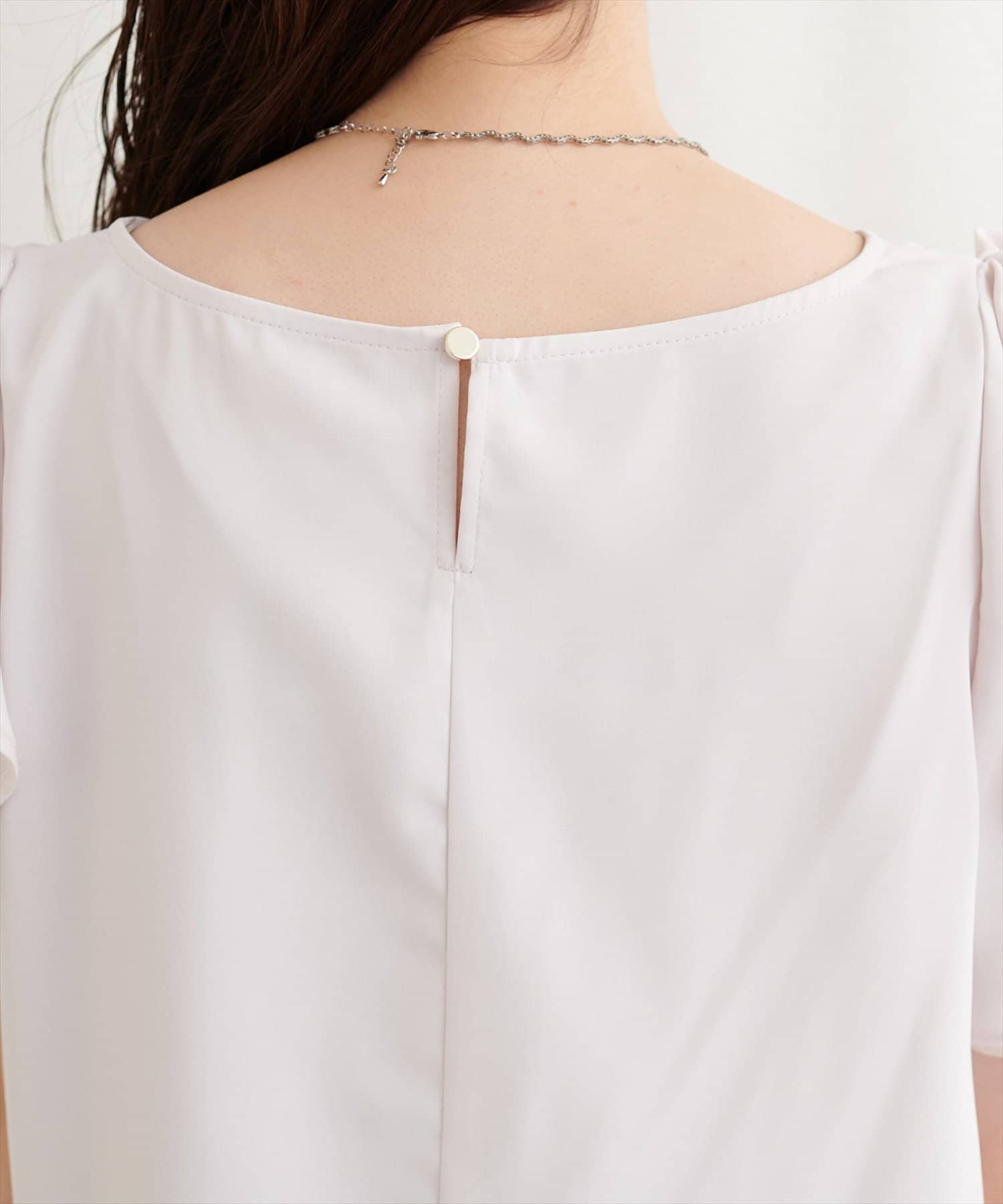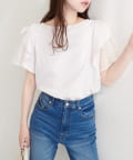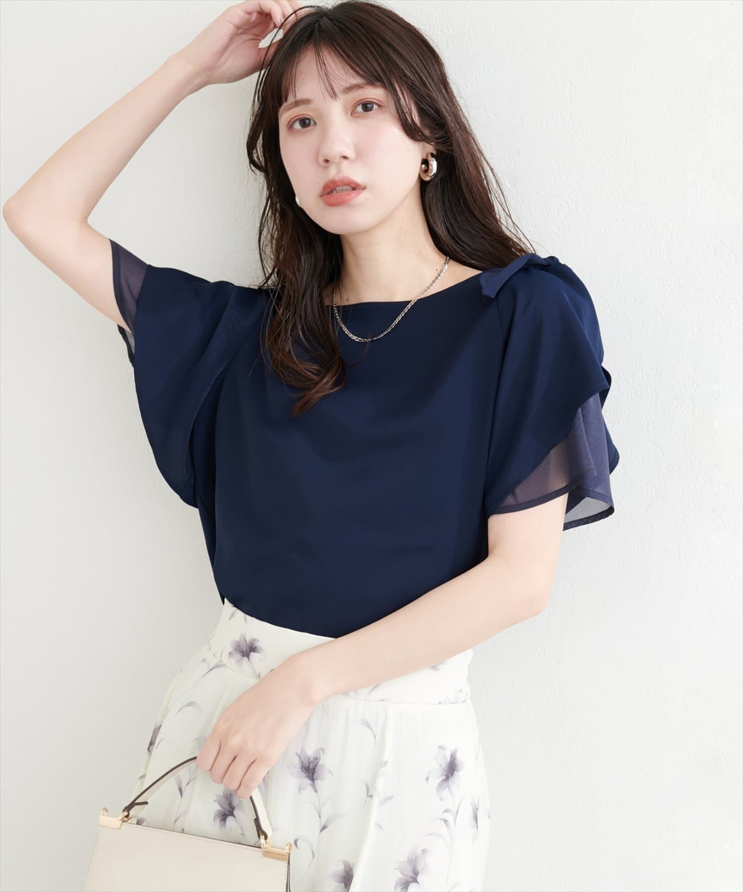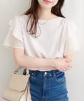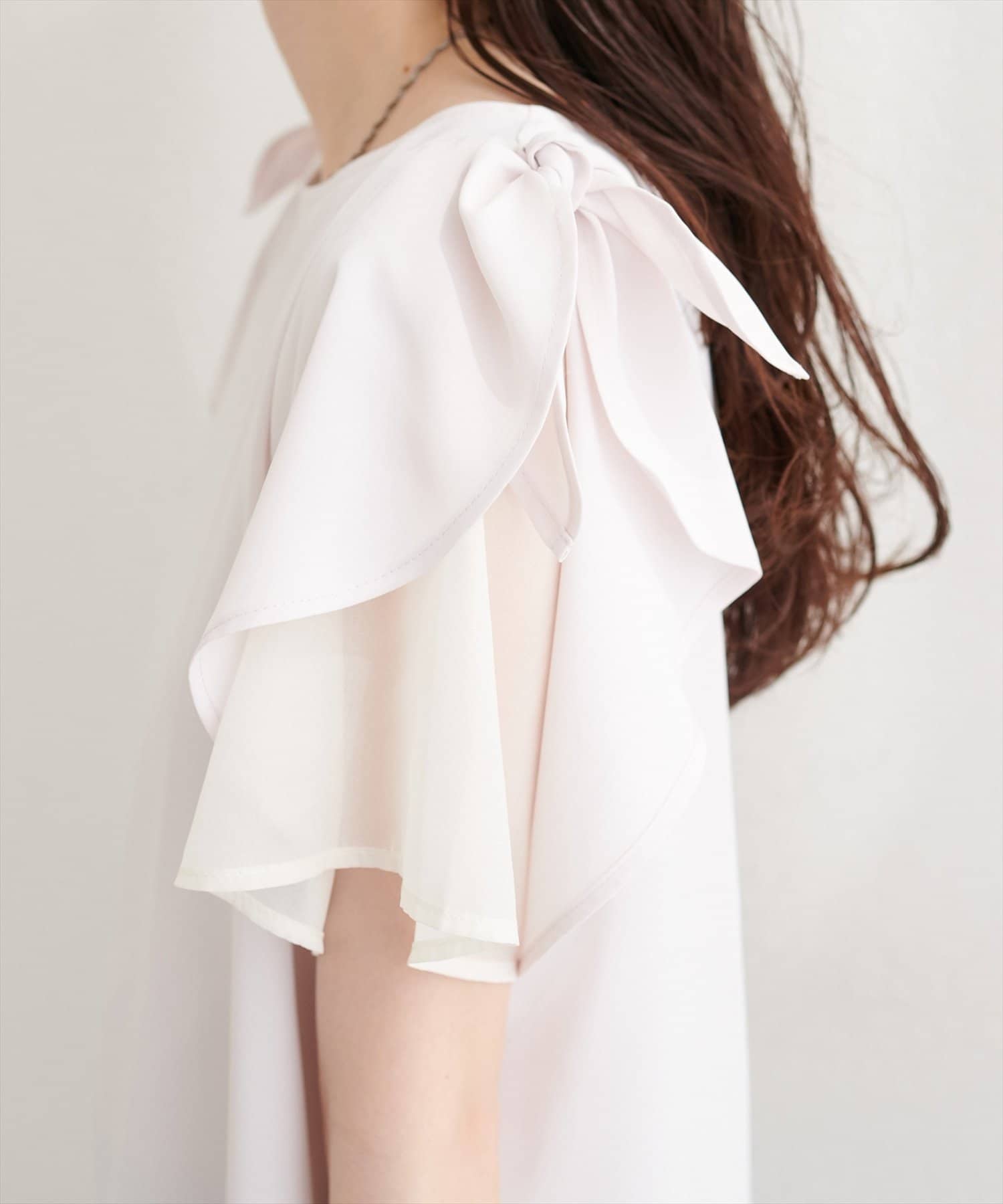 肩のさりげないリボンとラッフルズスリーブが魅力のブラウス。