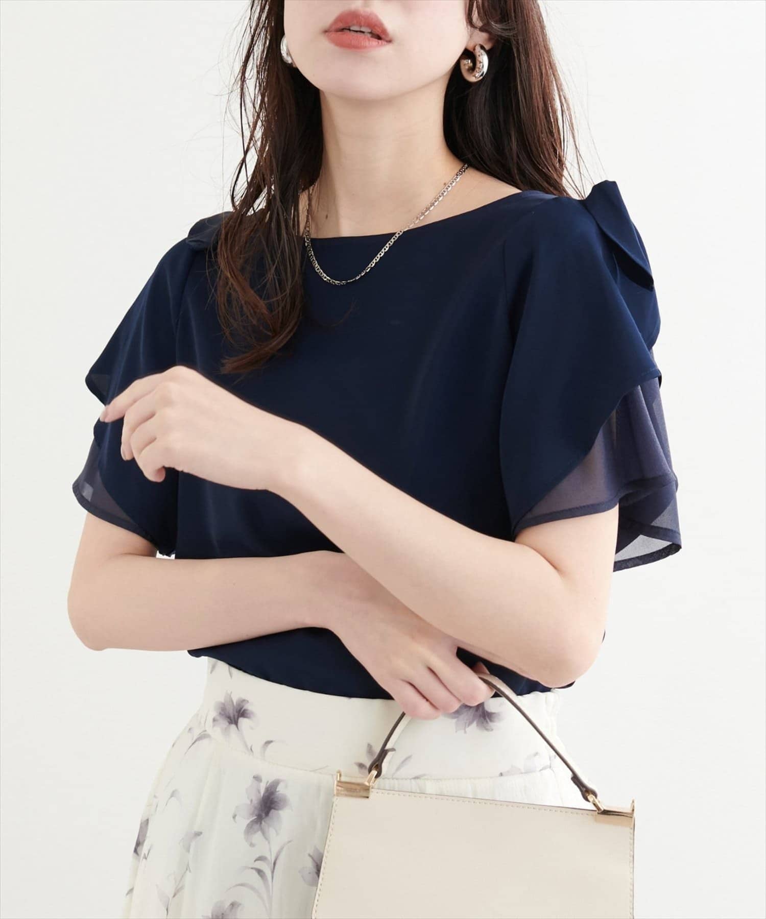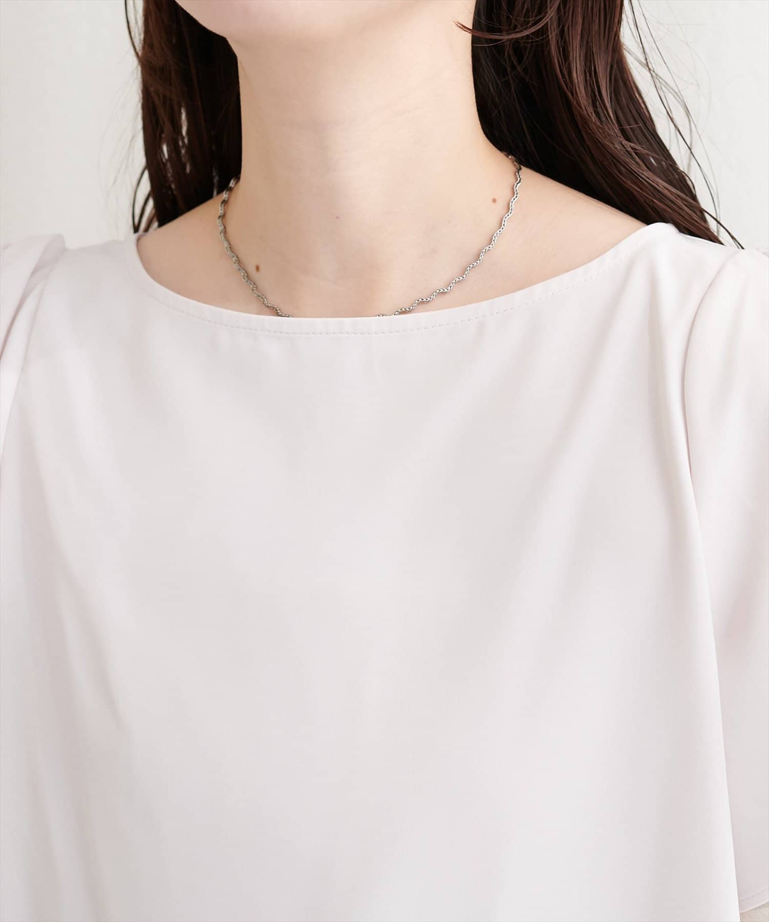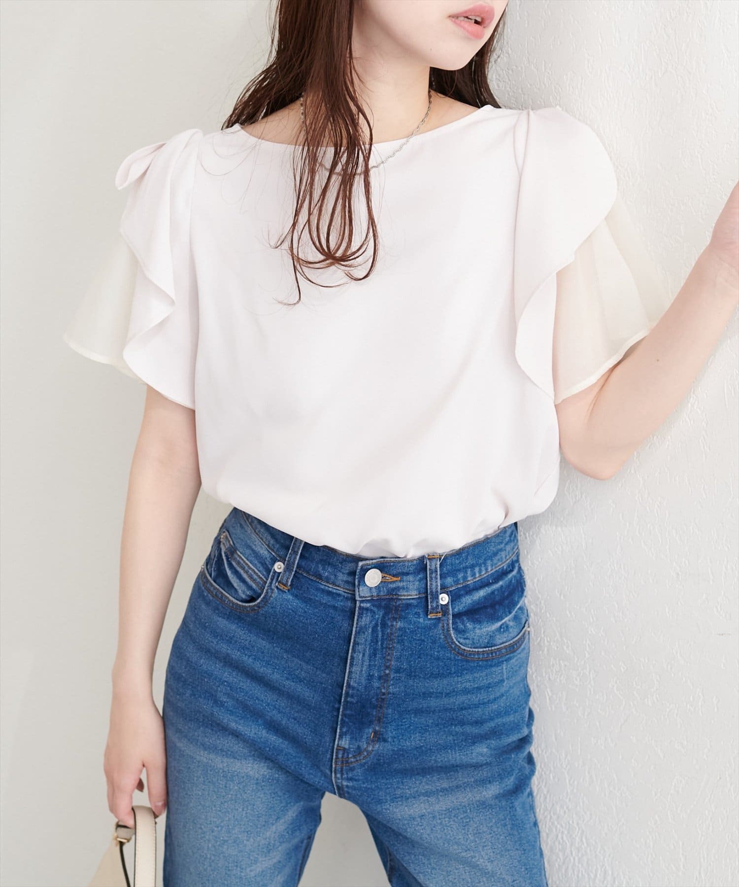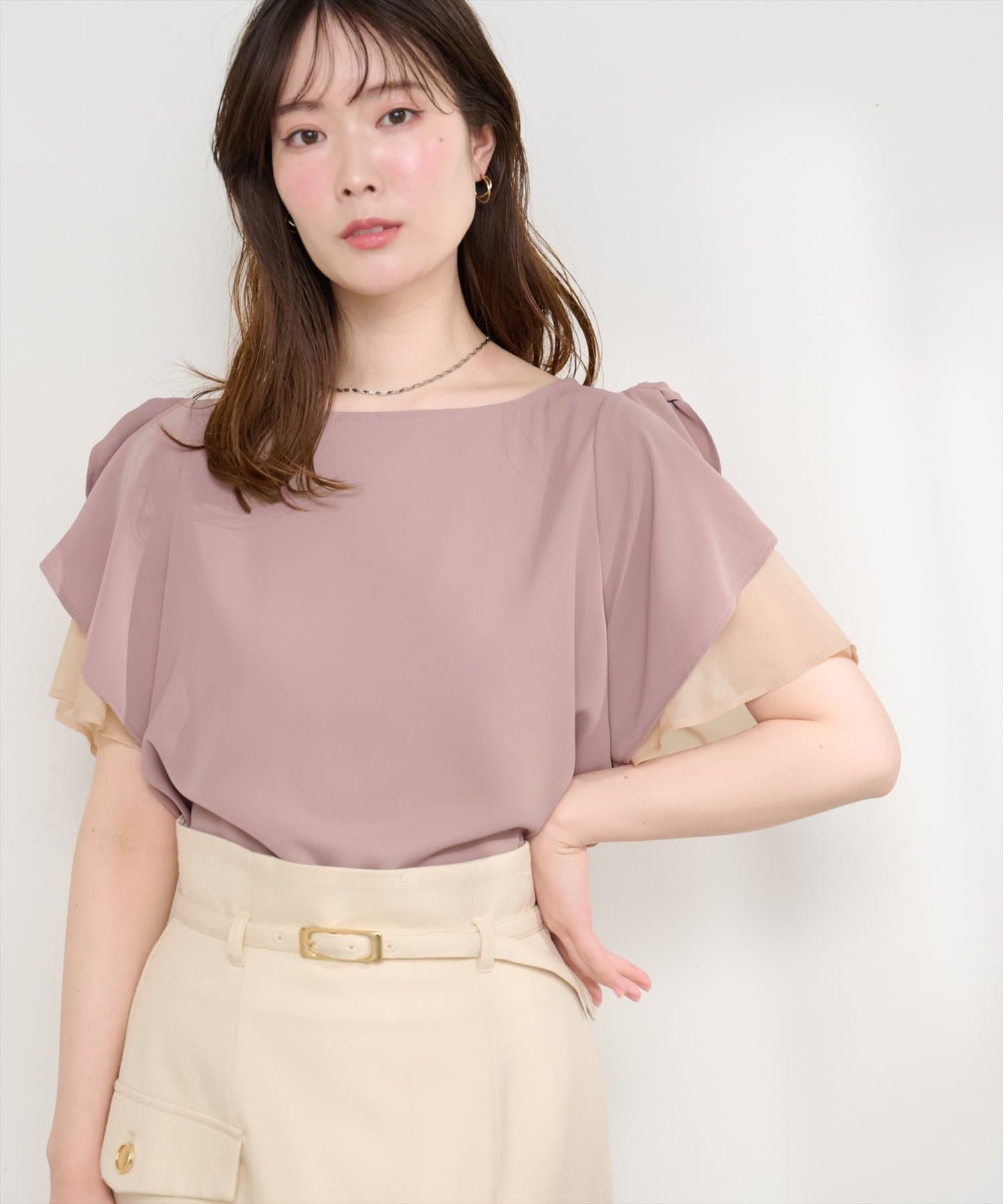 肩のさりげないリボンとラッフルズスリーブが魅力のブラウス。