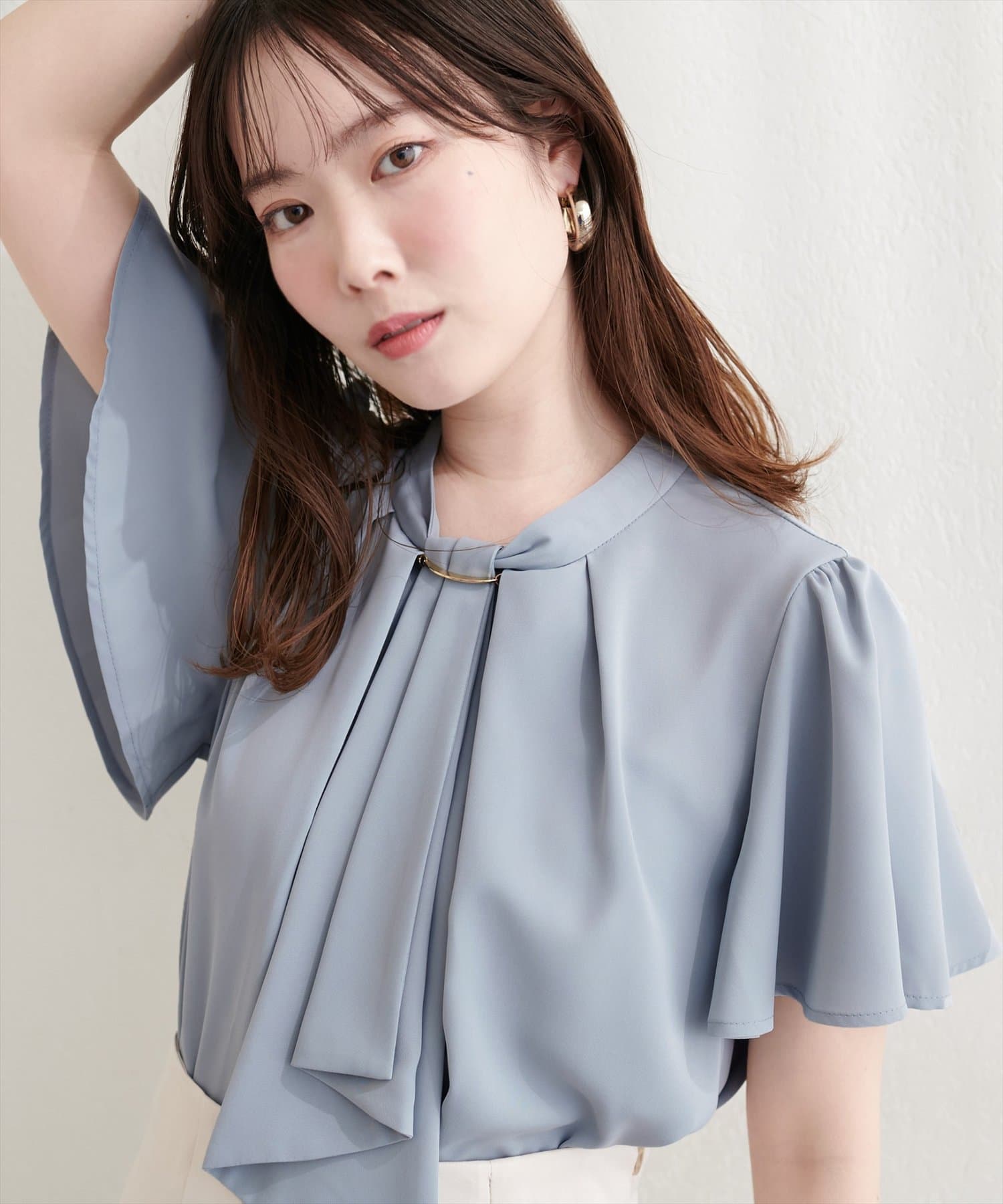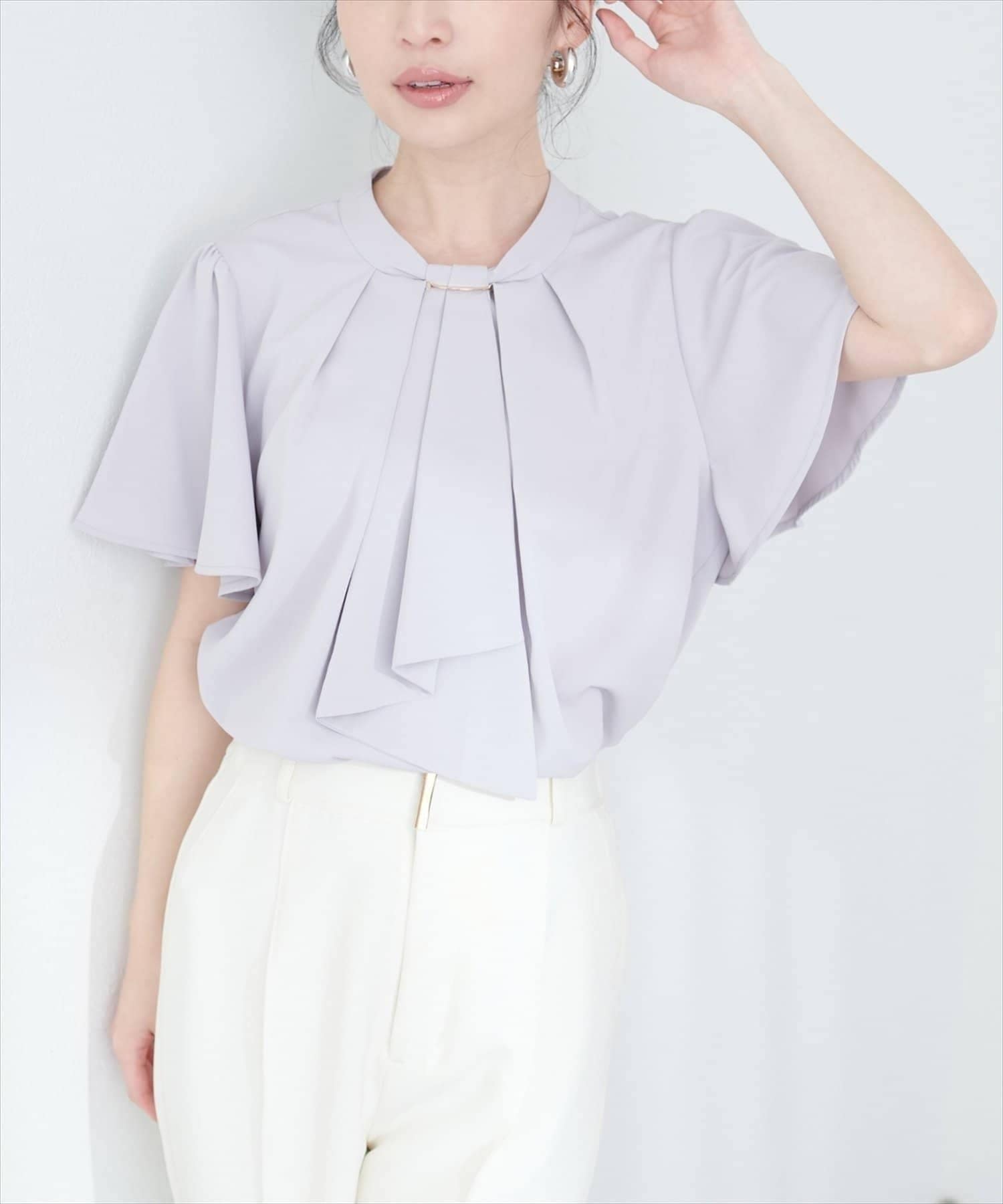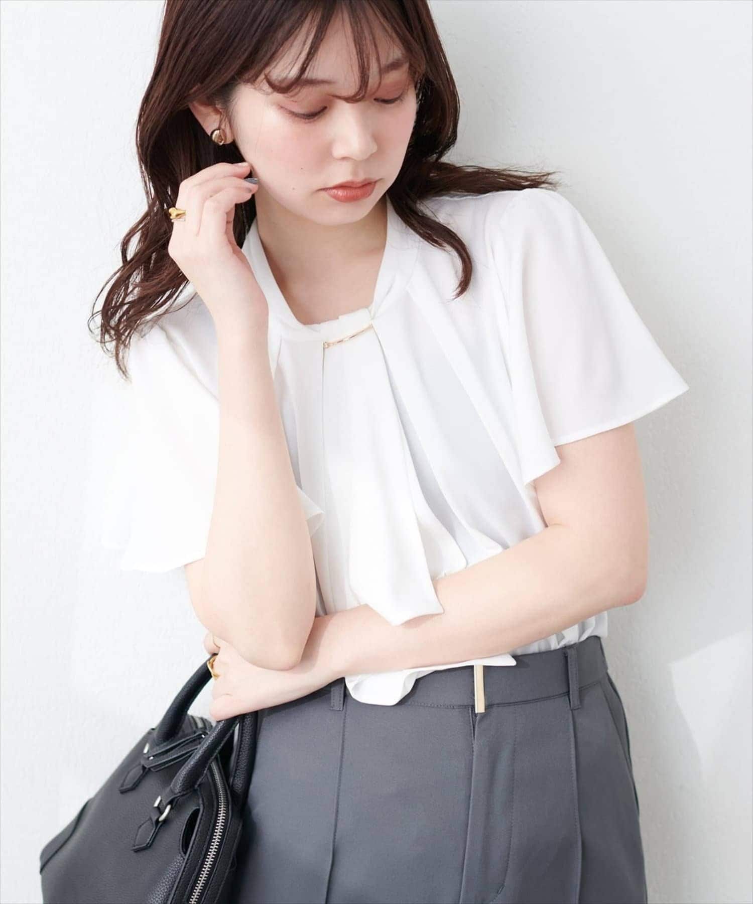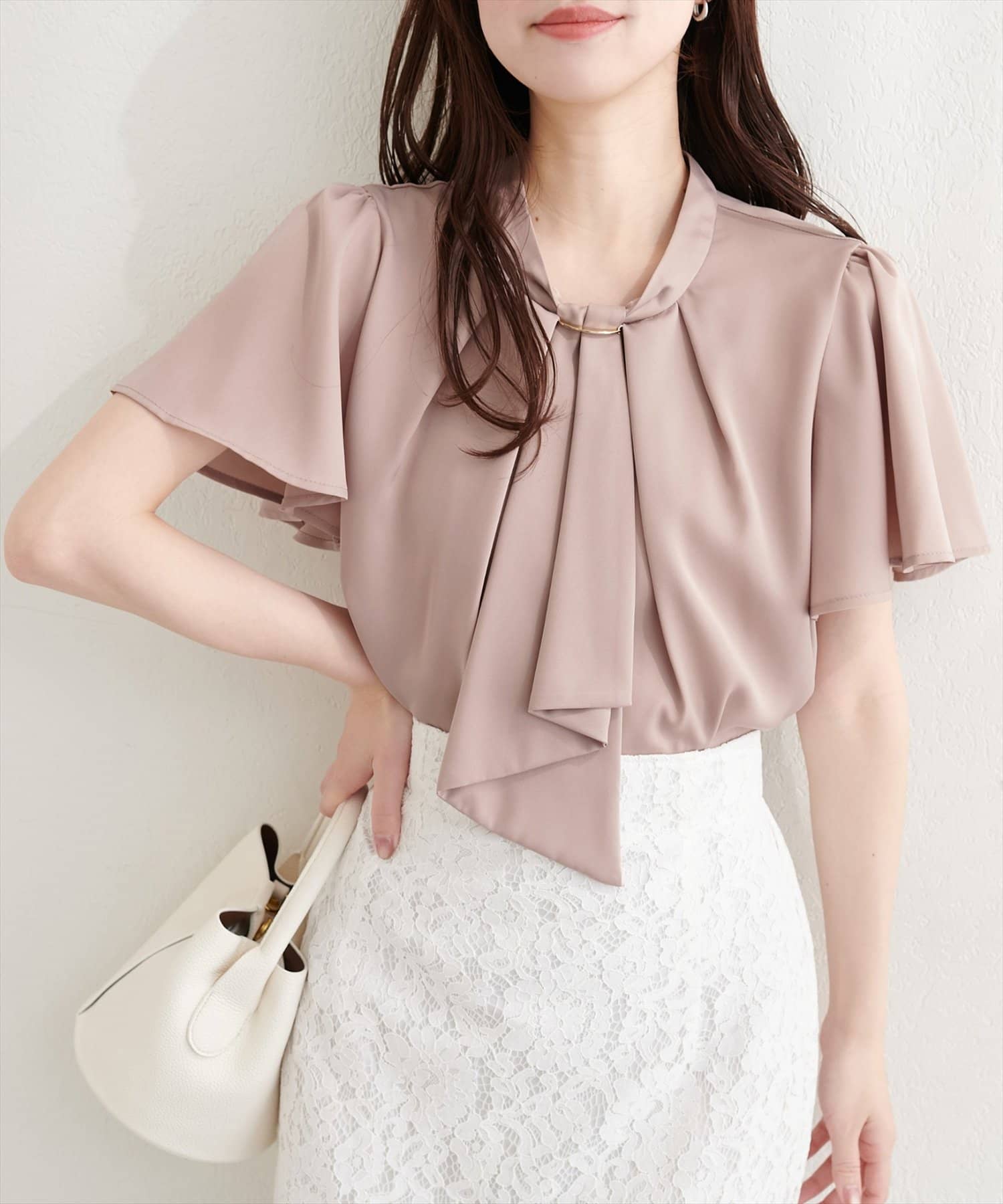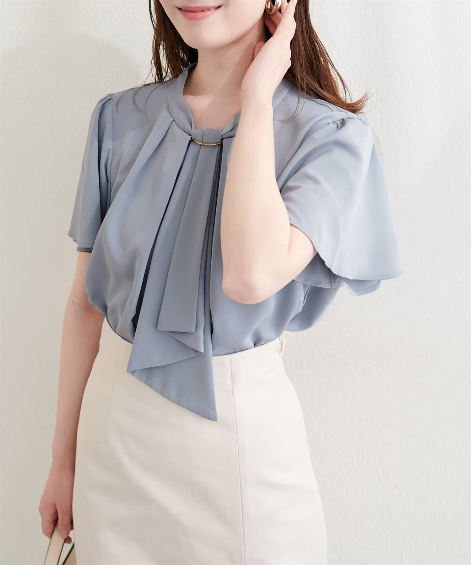 ボウタイディティールにゴールドのアクセントを加えた、1枚で華やかさのあるプルオーバーブラウス。