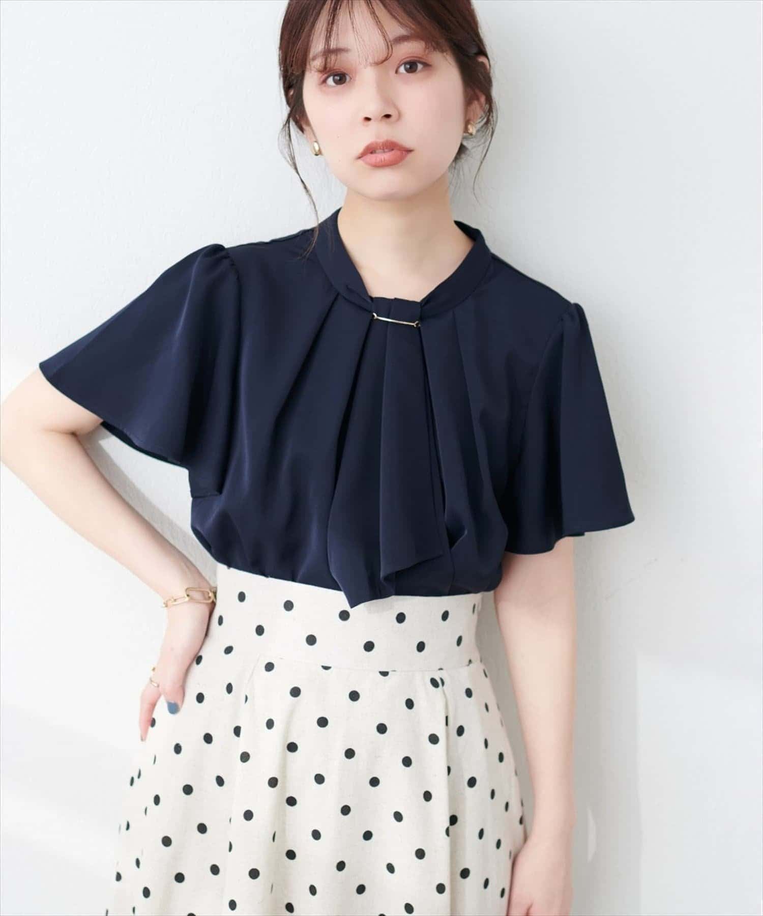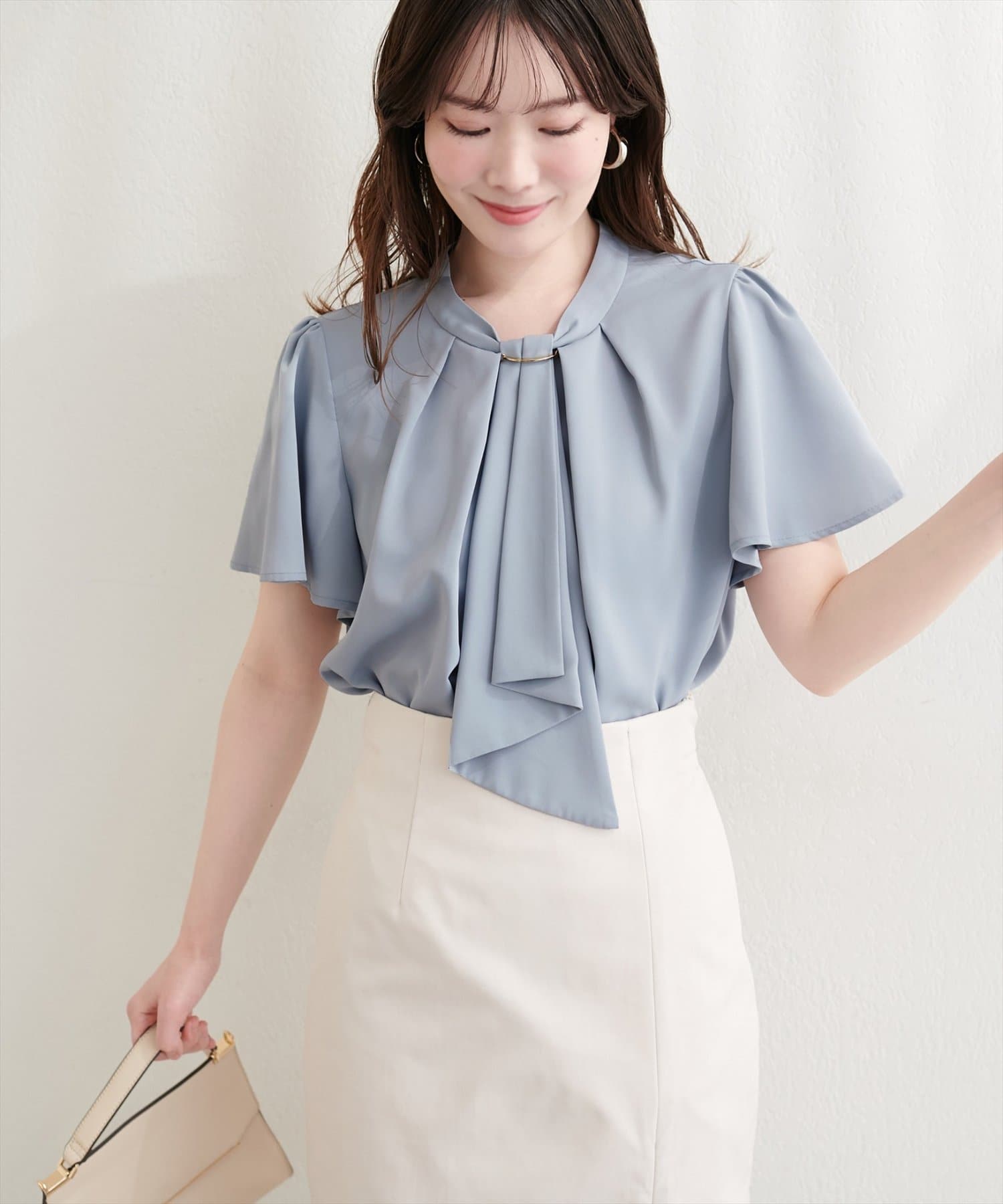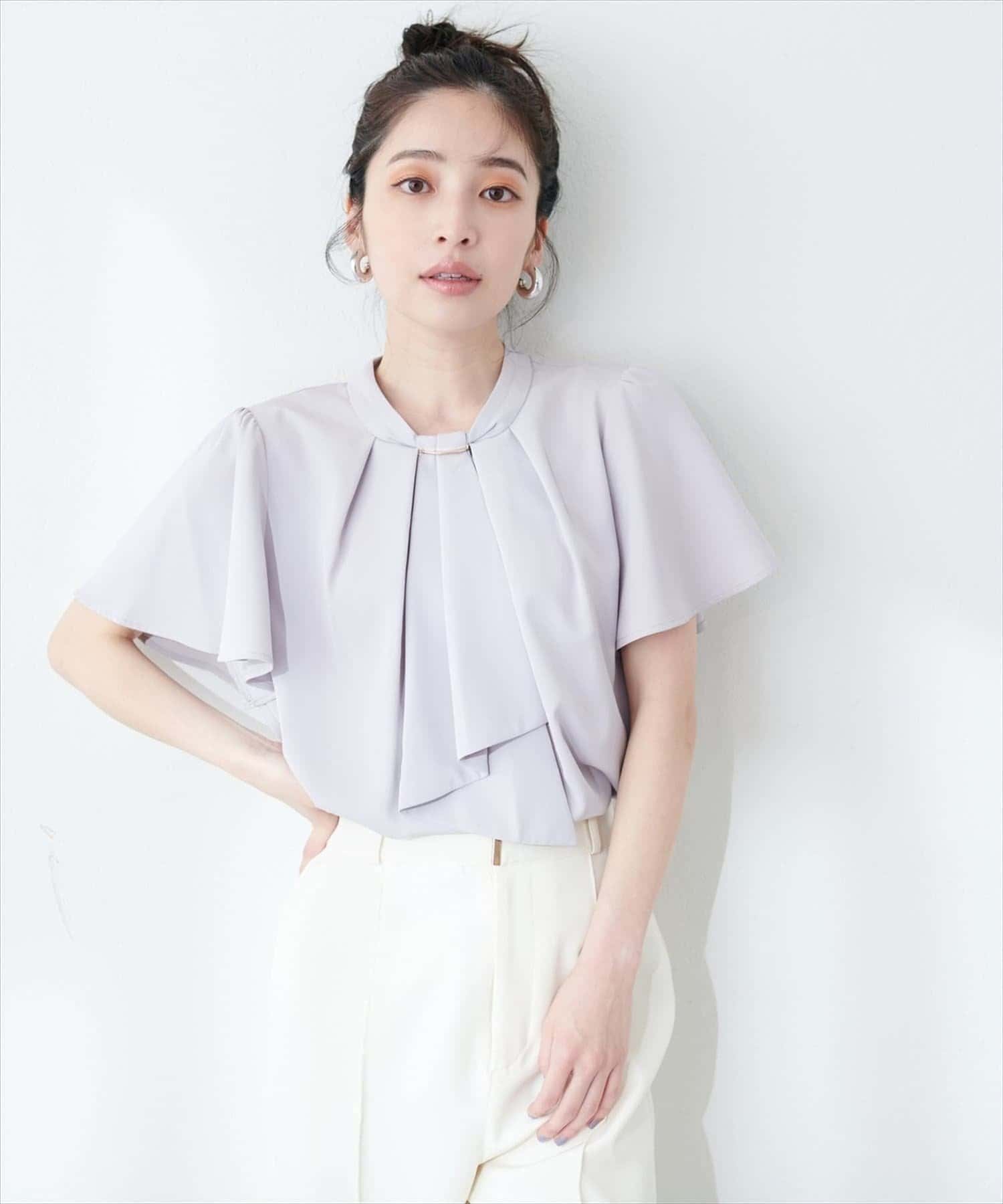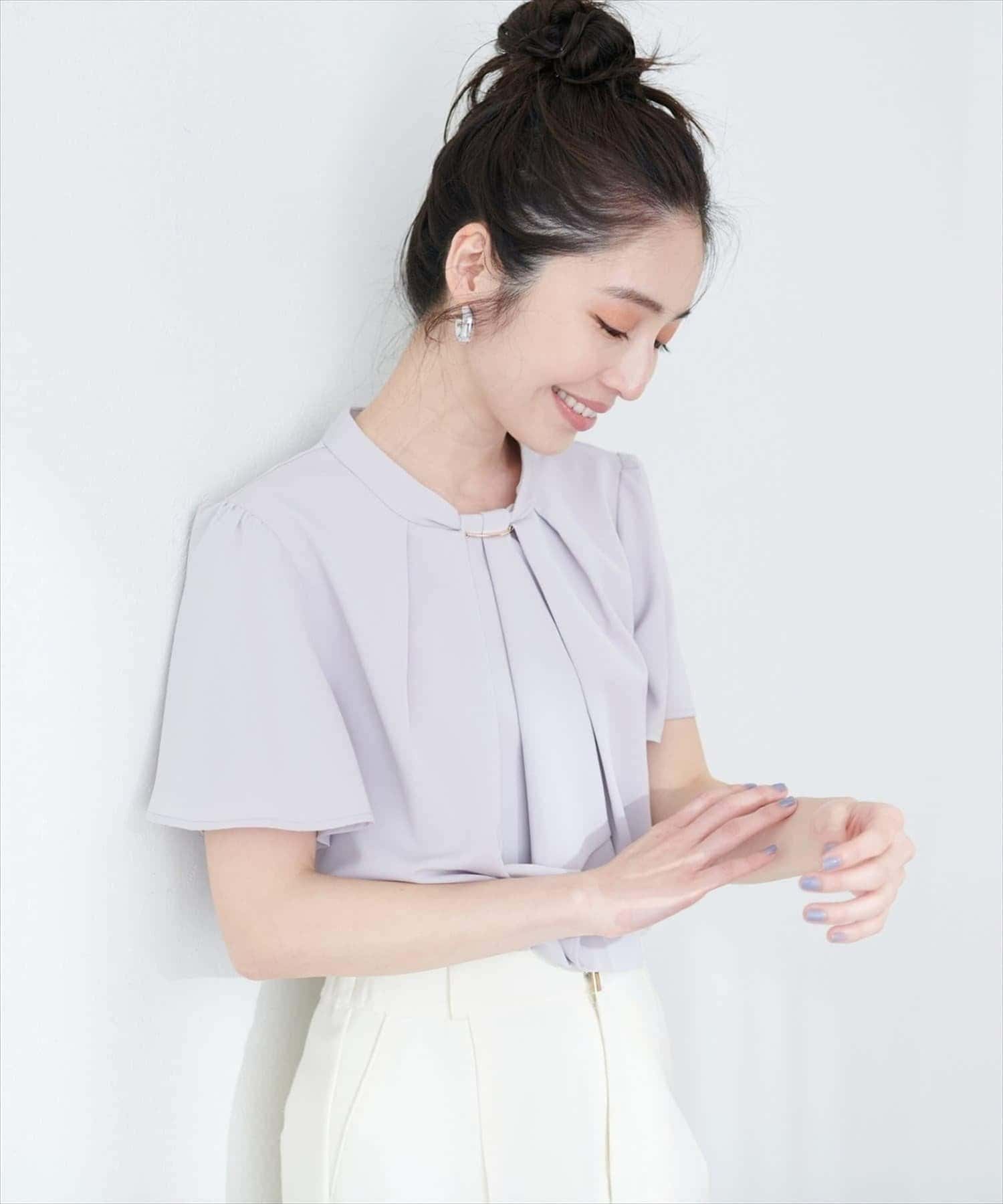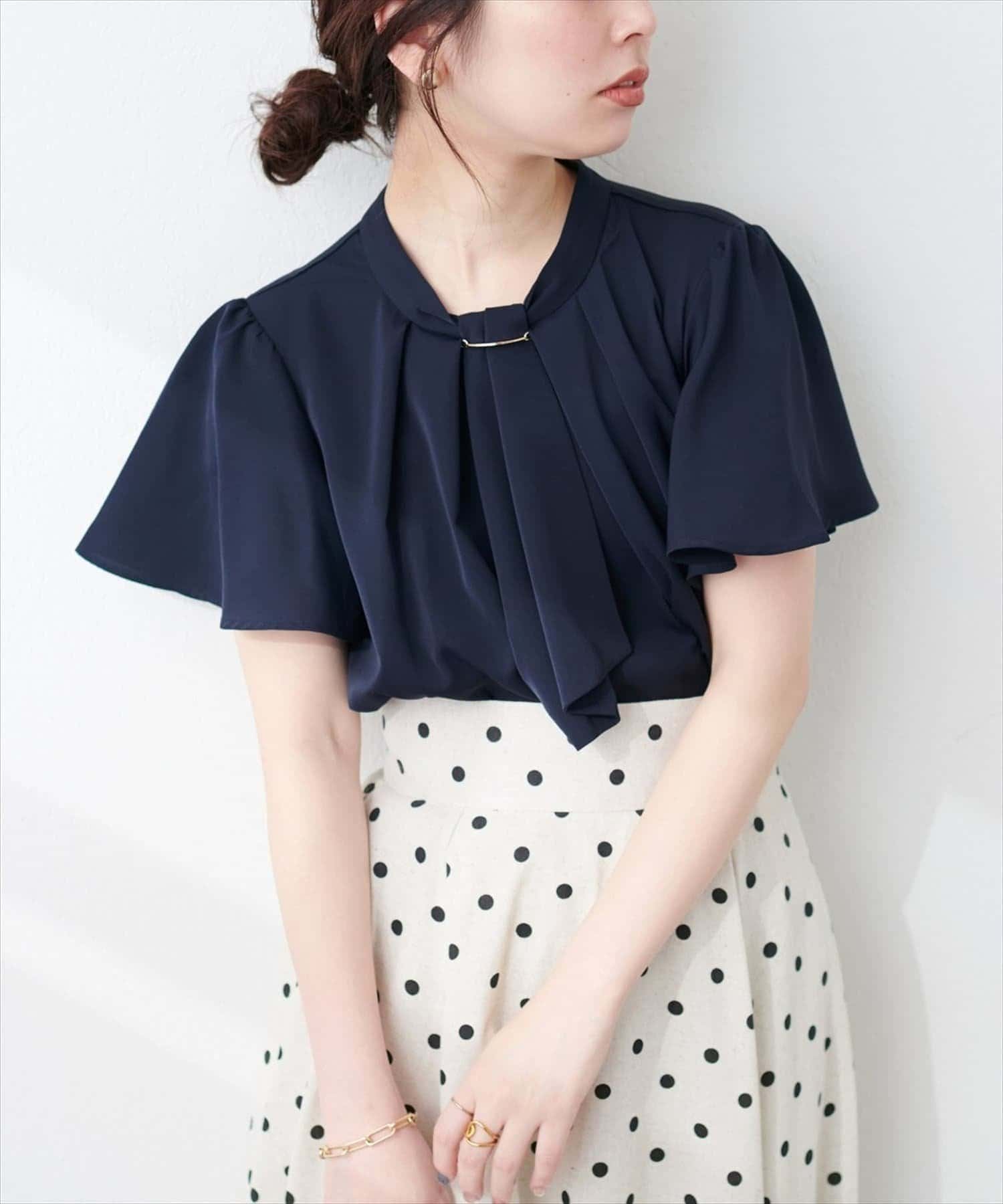 ボウタイディティールにゴールドのアクセントを加えた、1枚で華やかさのあるプルオーバーブラウス。