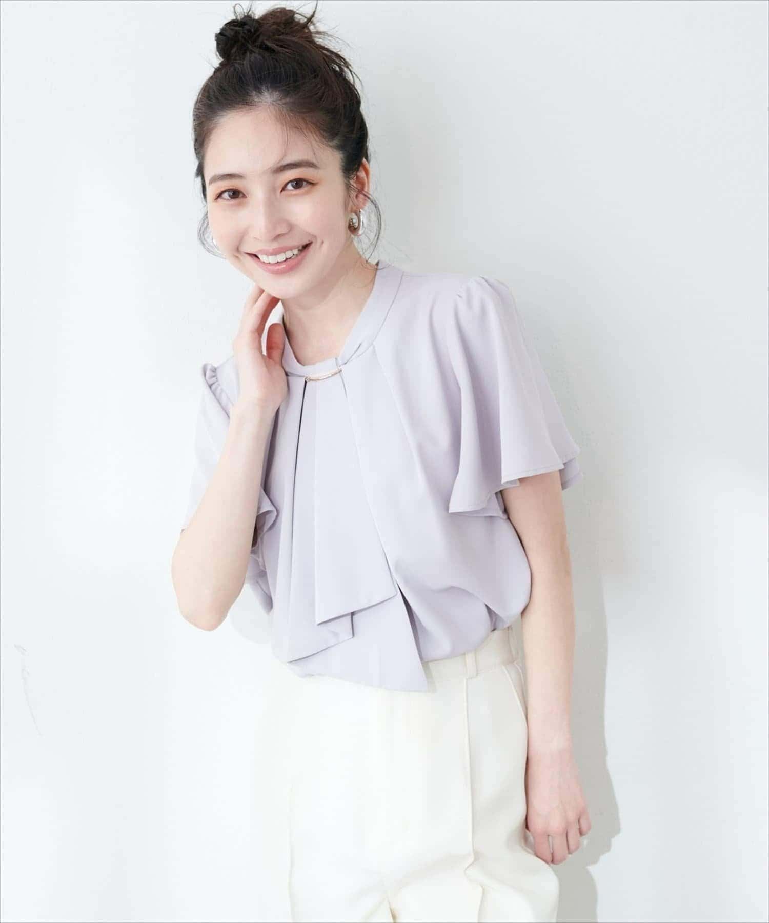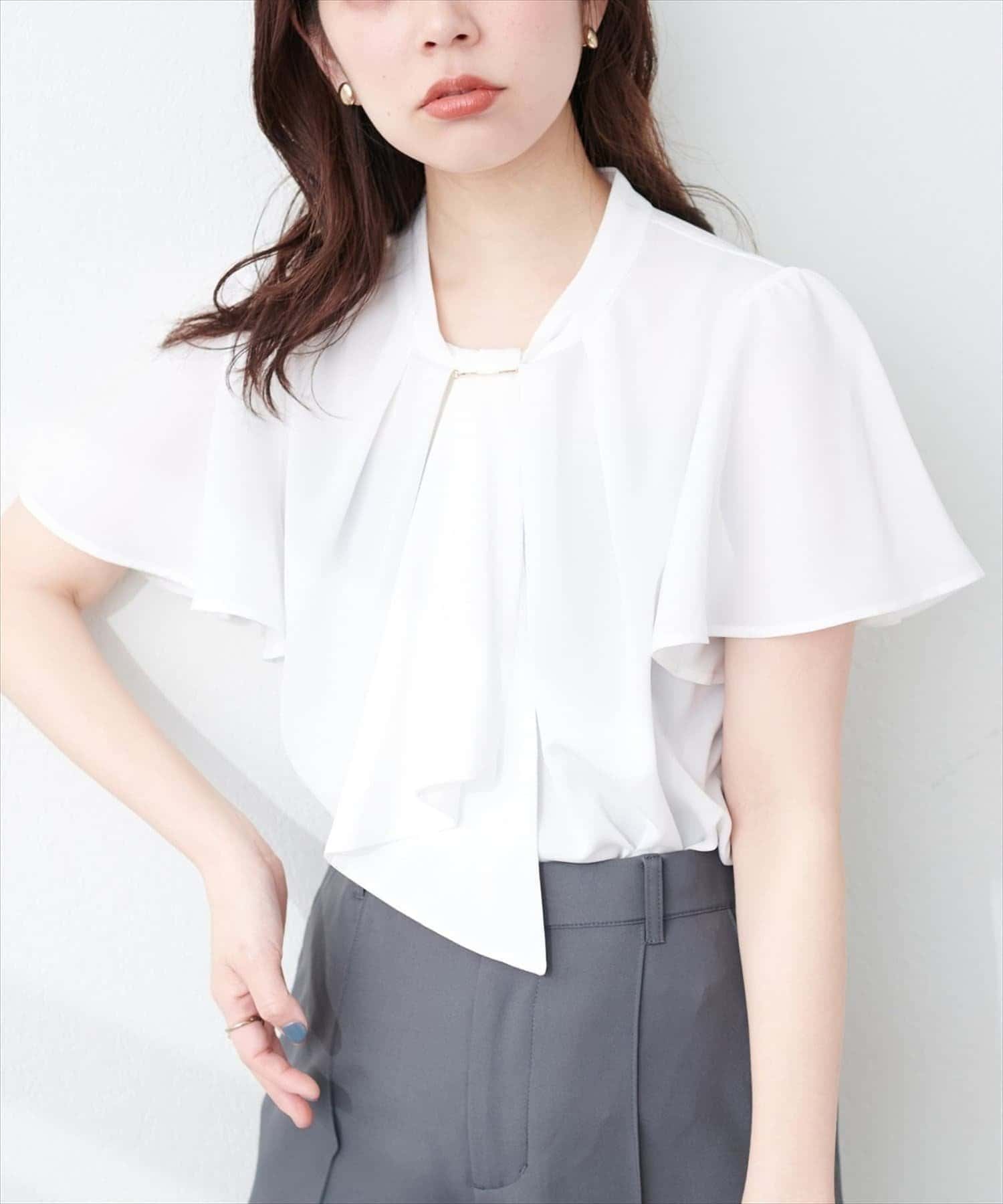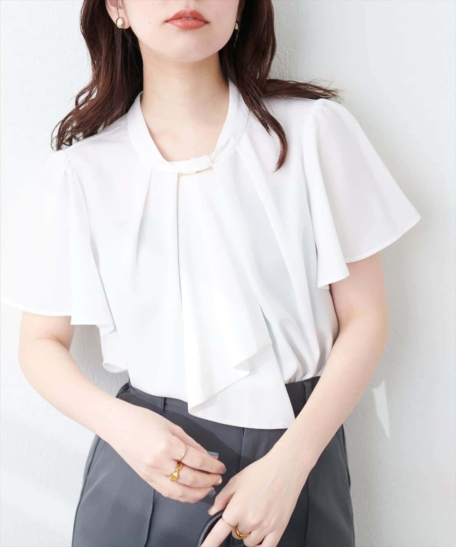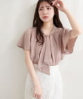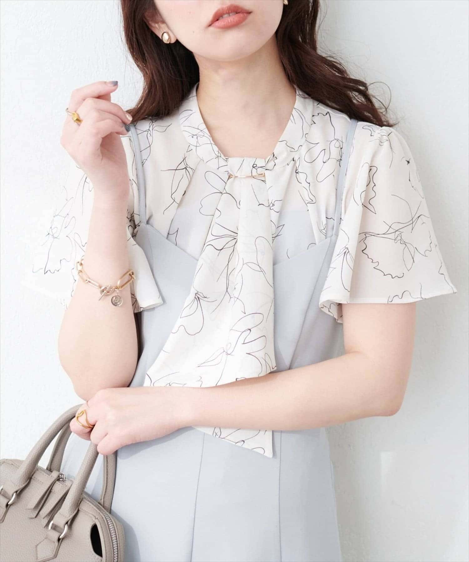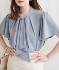 ボウタイディティールにゴールドのアクセントを加えた、1枚で華やかさのあるプルオーバーブラウス。