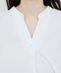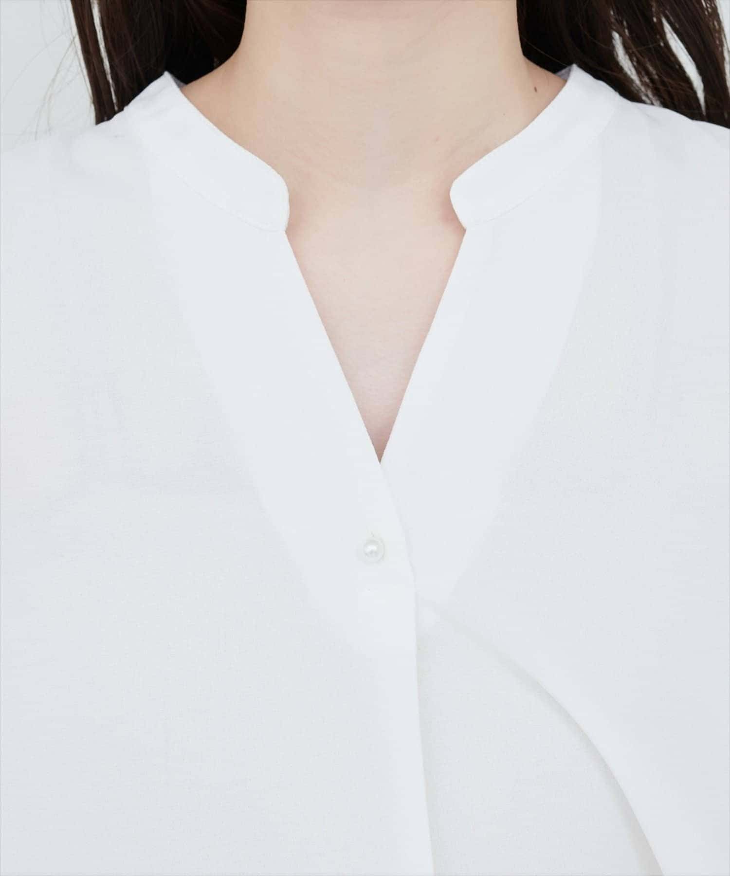 首元はすっきりとしたバンドカラーで、上品さをプラスし、さりげなく輝くボタンもアクセントに。