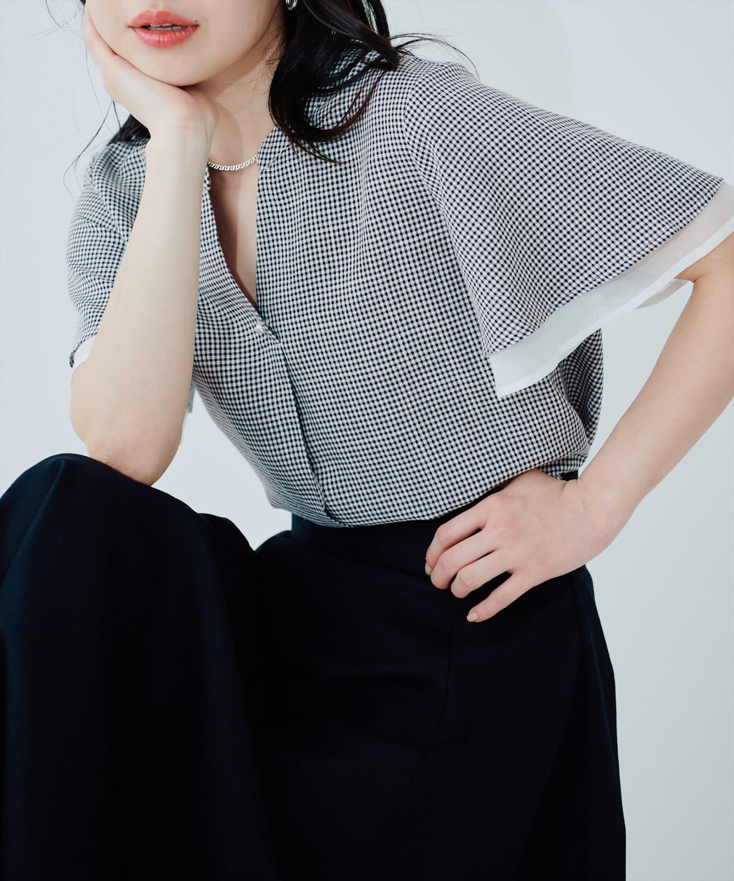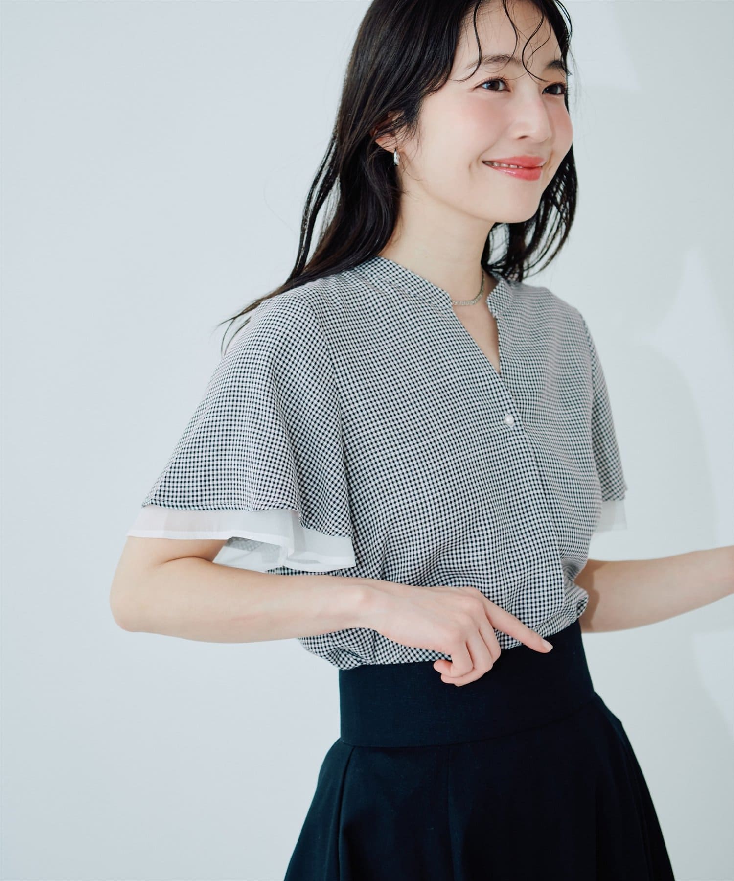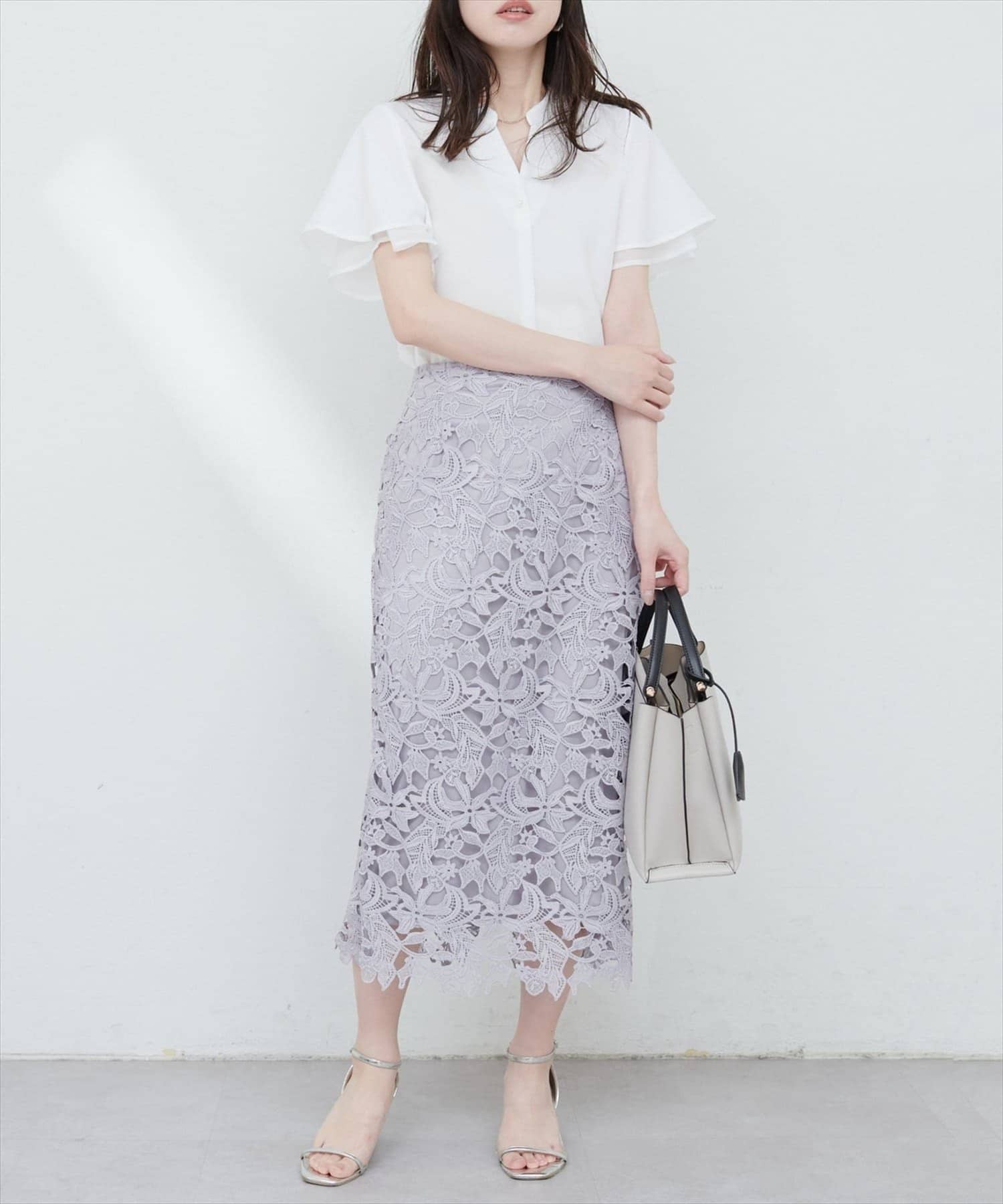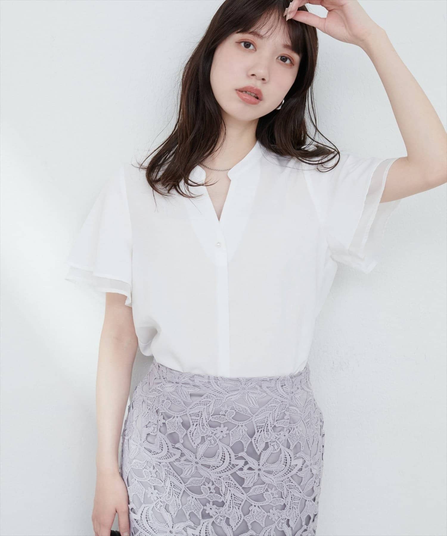 フリルのような袖のシルエットは、甘すぎず、大人可愛い雰囲気を演出。