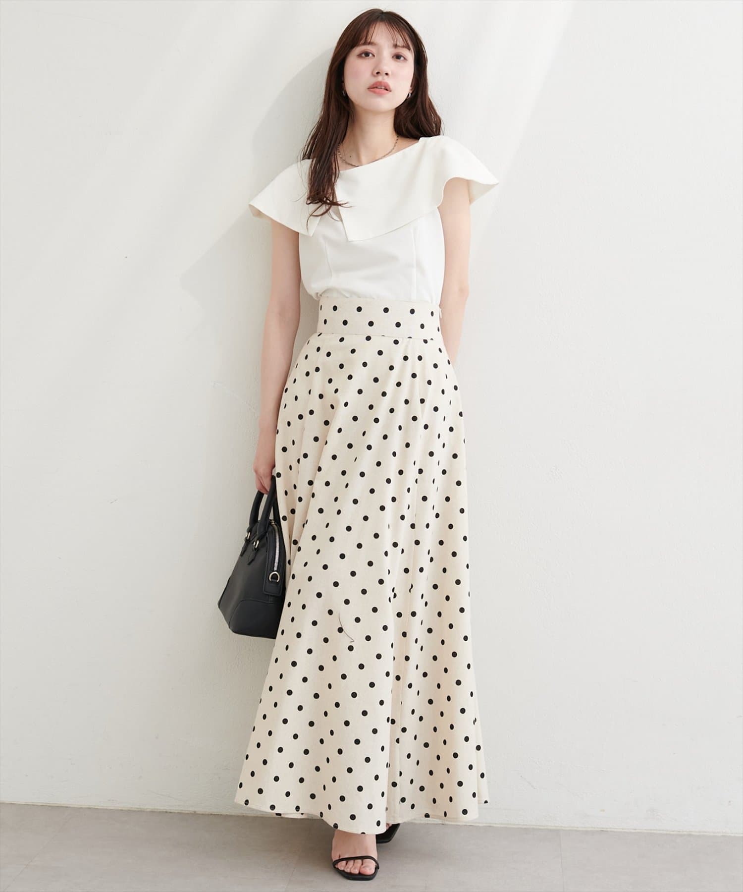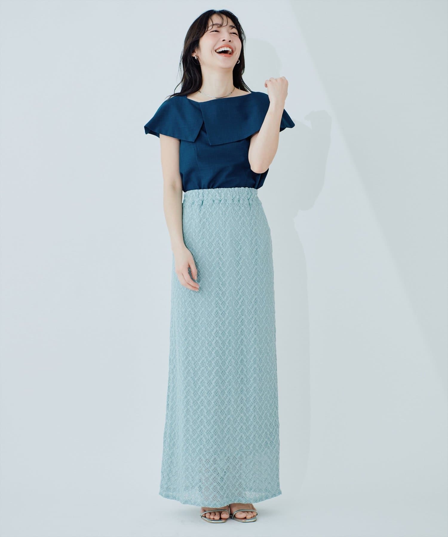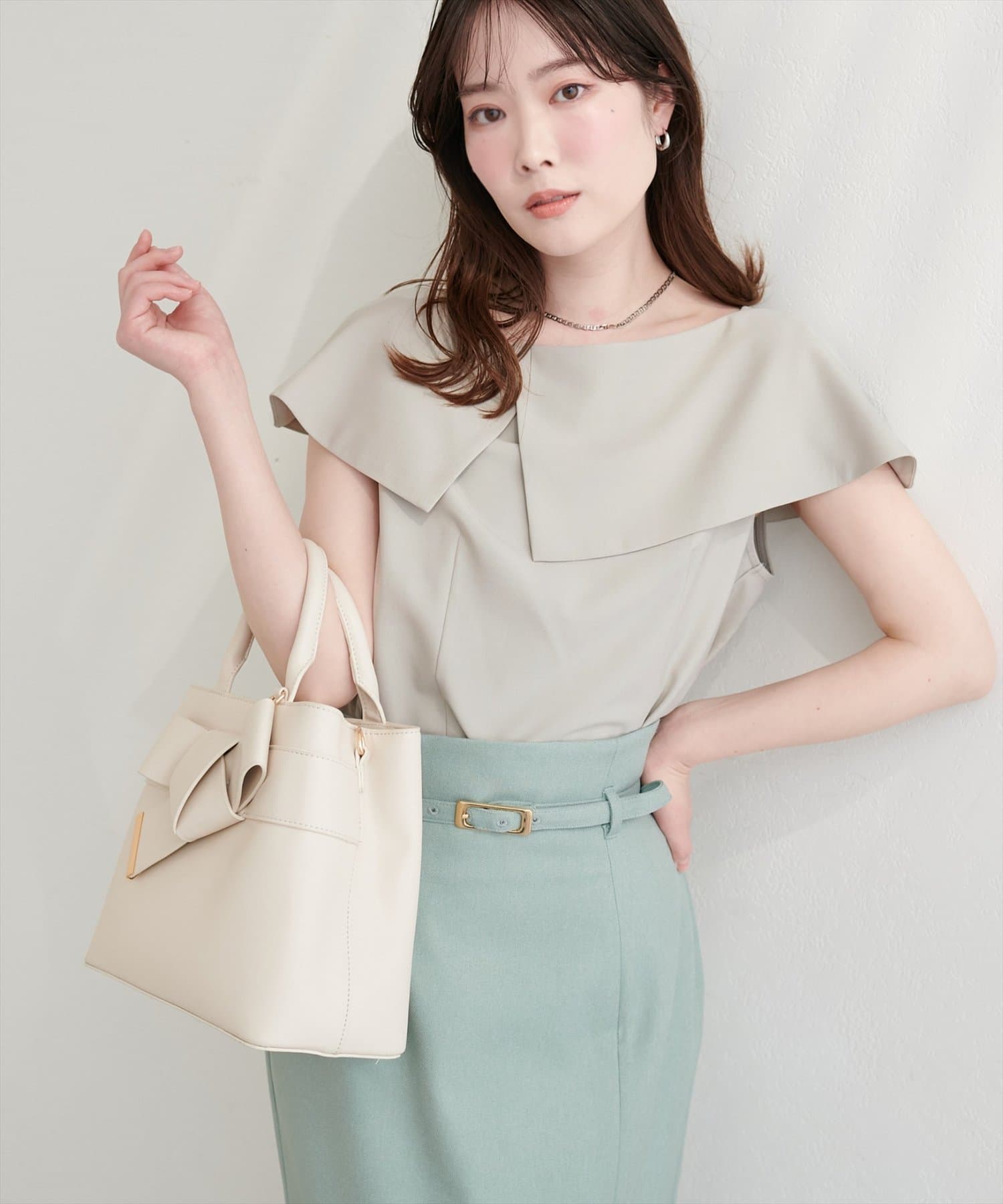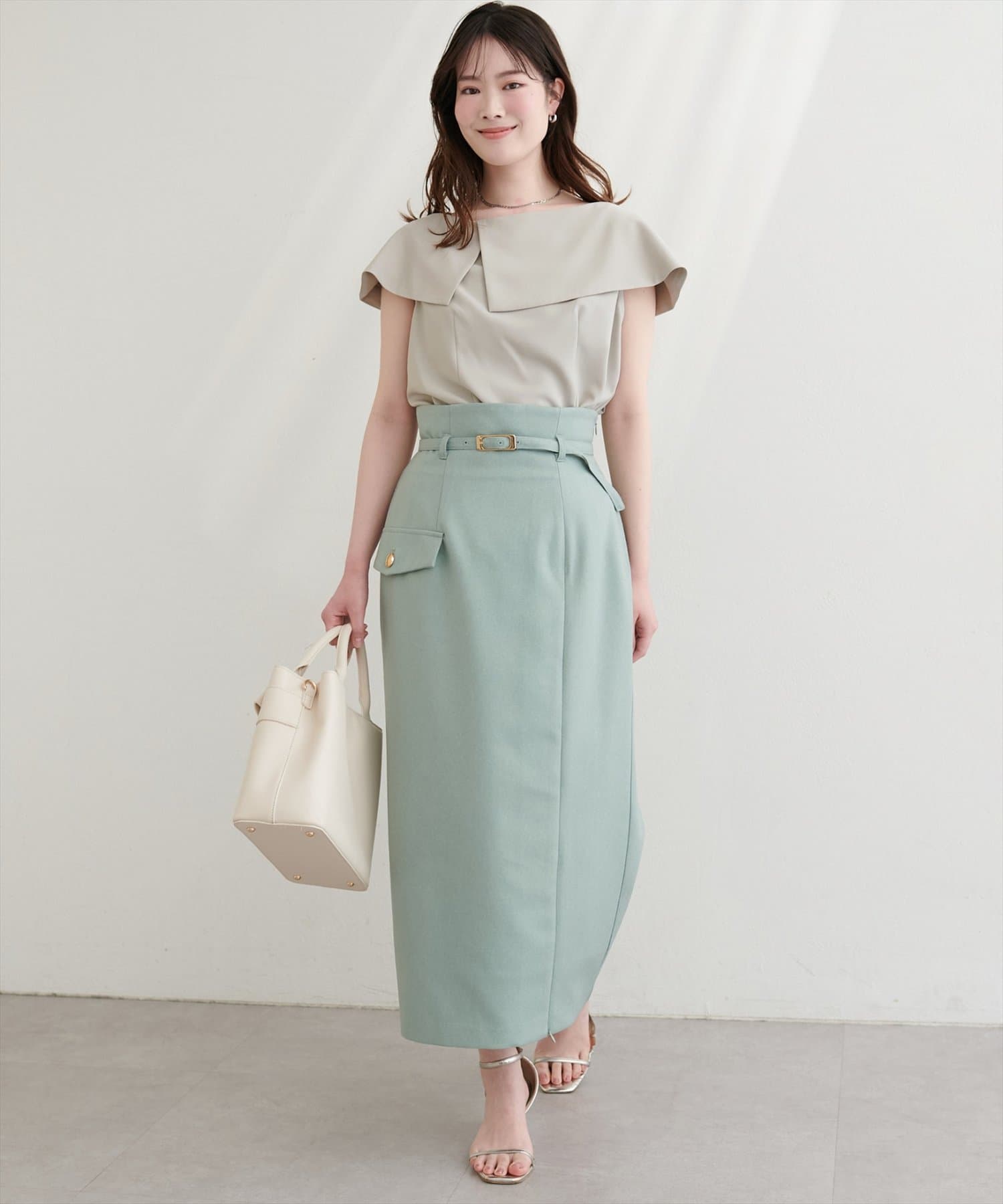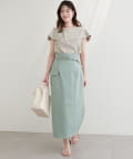 落ち感のあるナロースカートやマーメイドシルエットのスカートを合わせると、落ち着いた大人の雰囲気に。