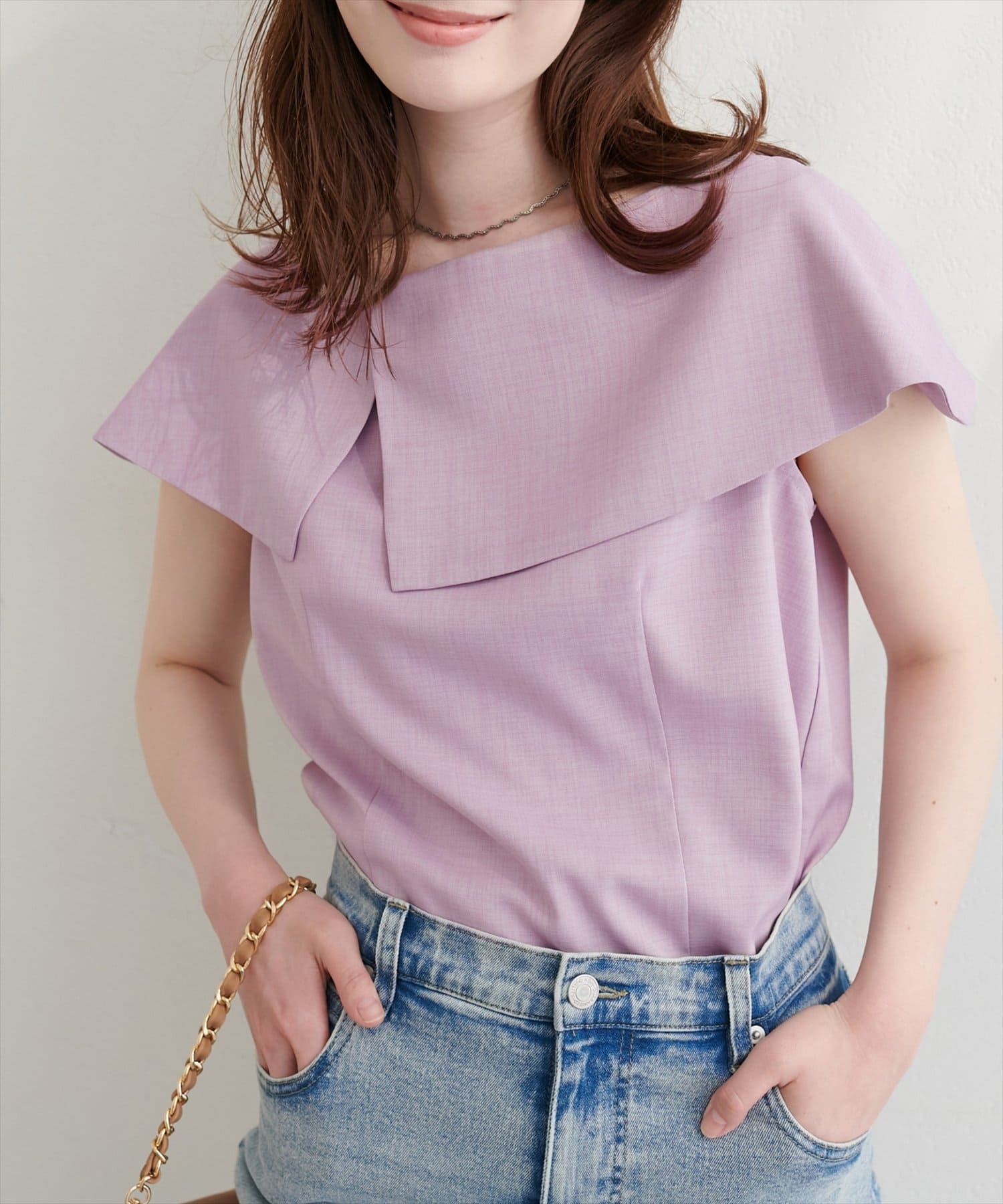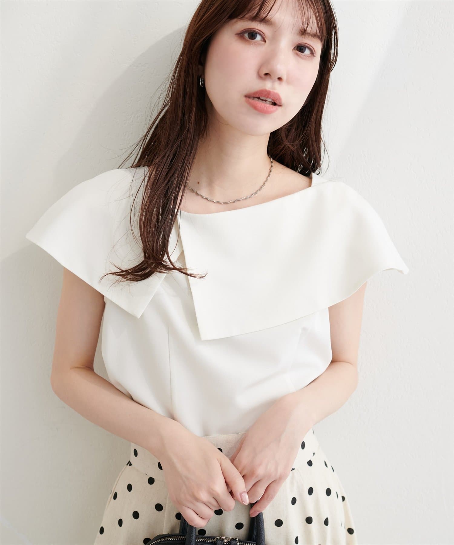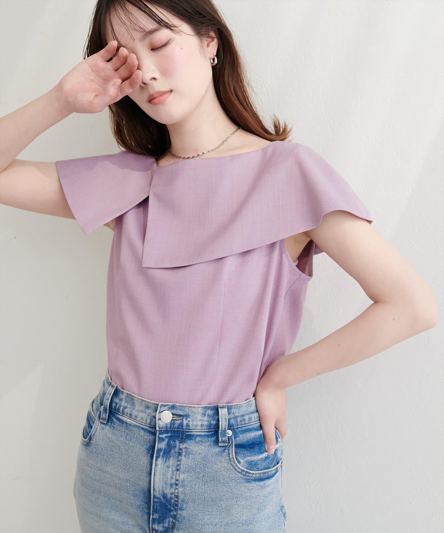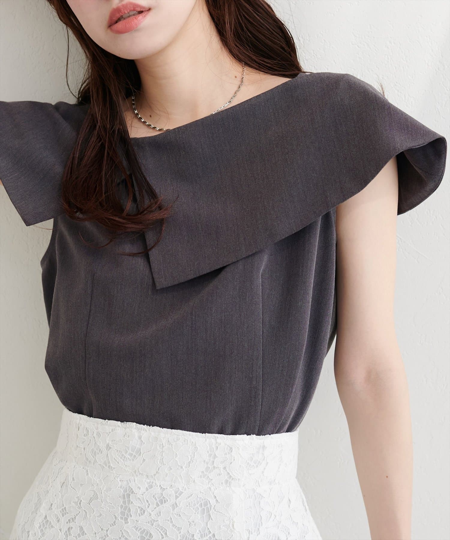 大きなアシメ衿が肩を覆ってくれて肩周りが気にならない優秀アイテムです。