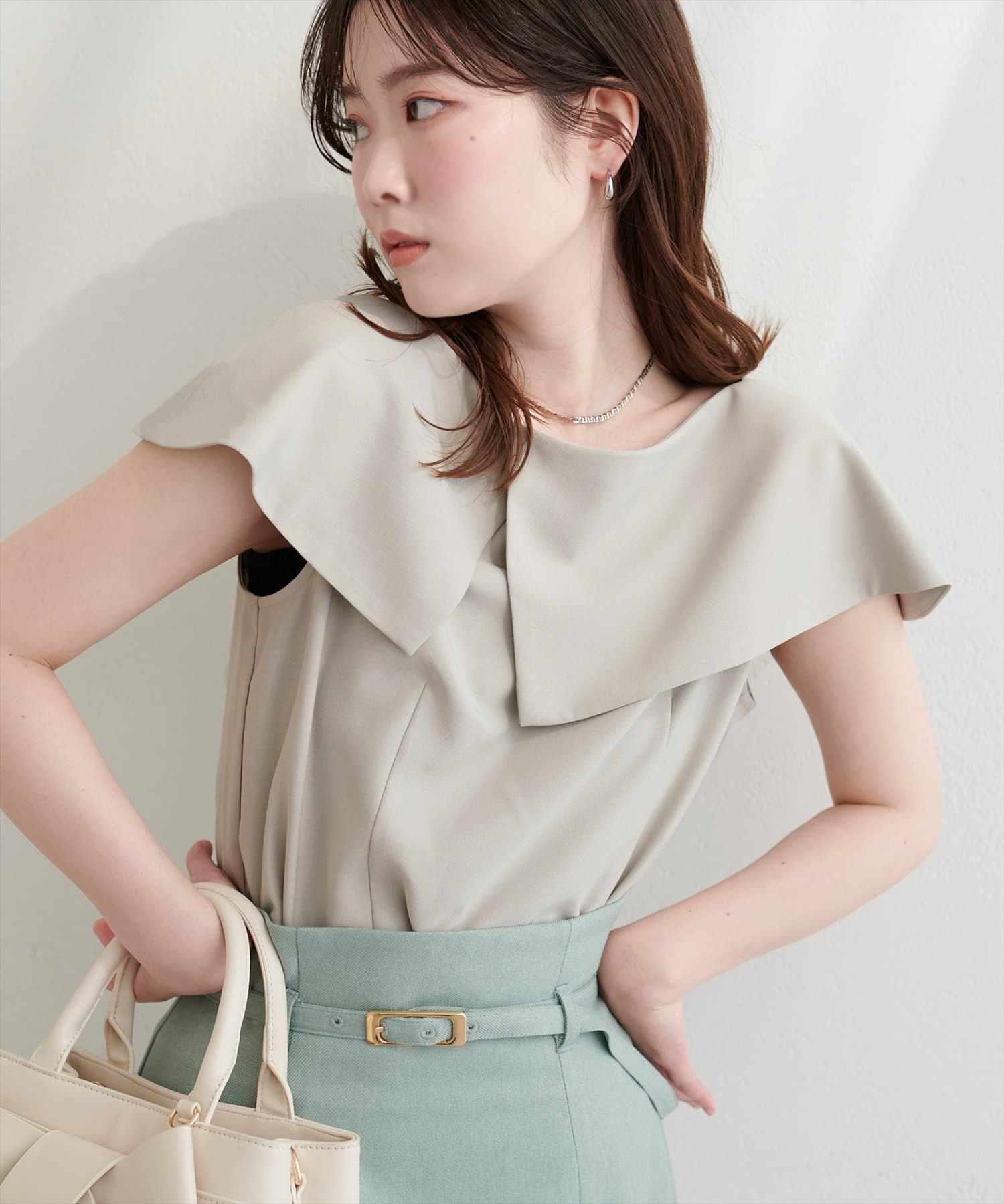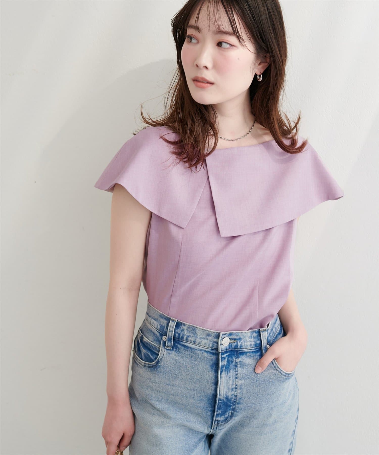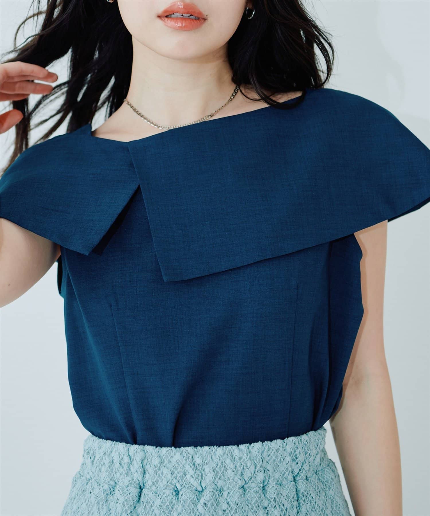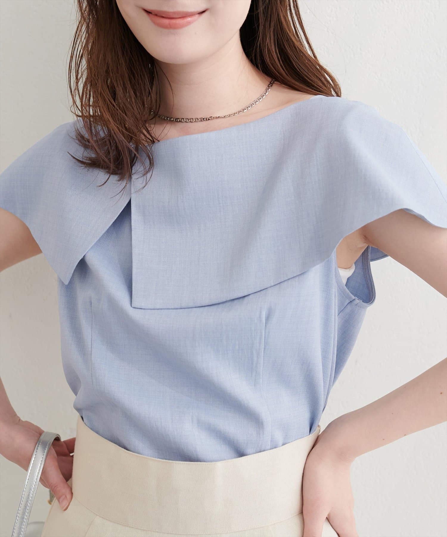 大きなアシメ衿が肩を覆ってくれて肩周りが気にならない優秀アイテムです。