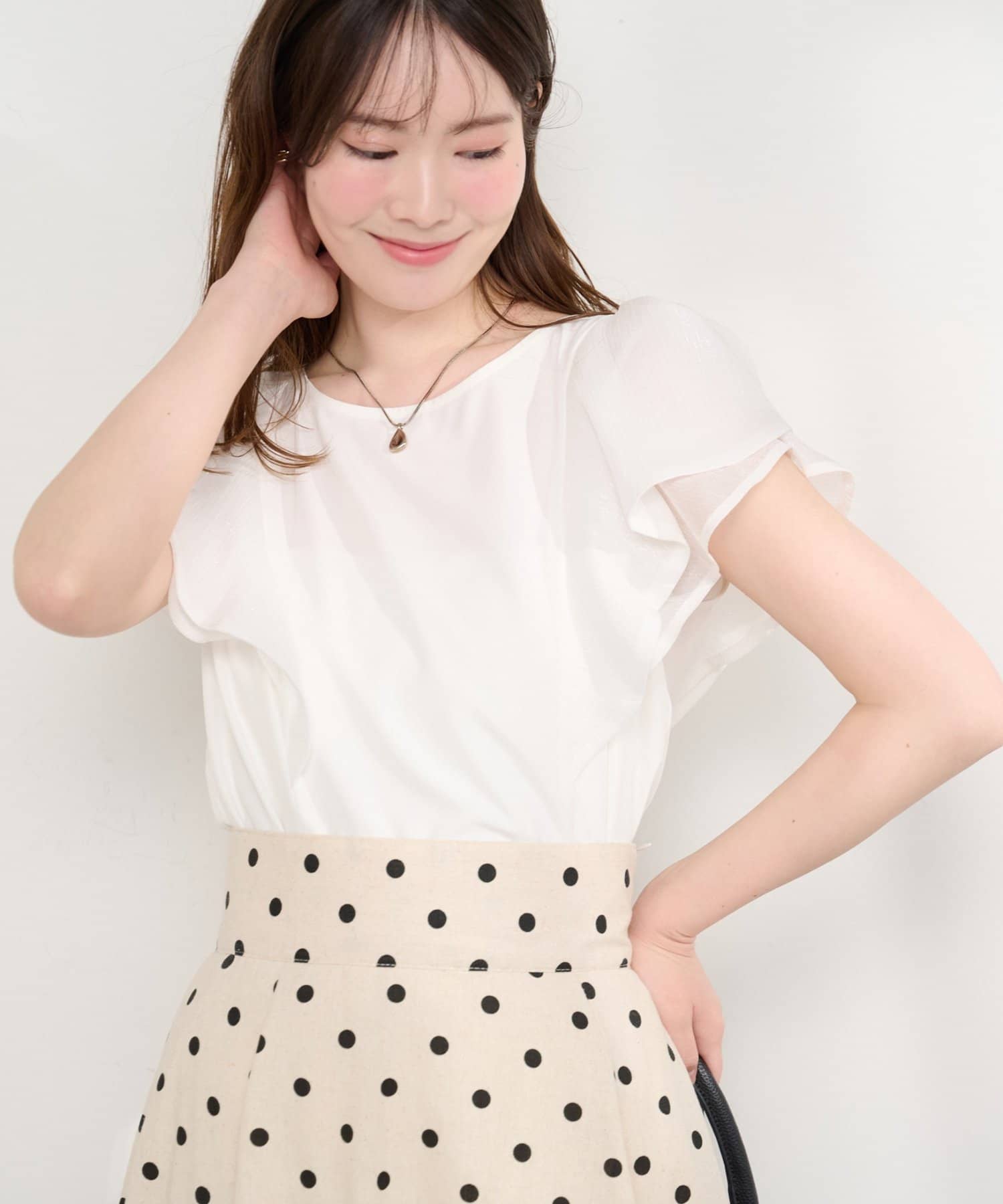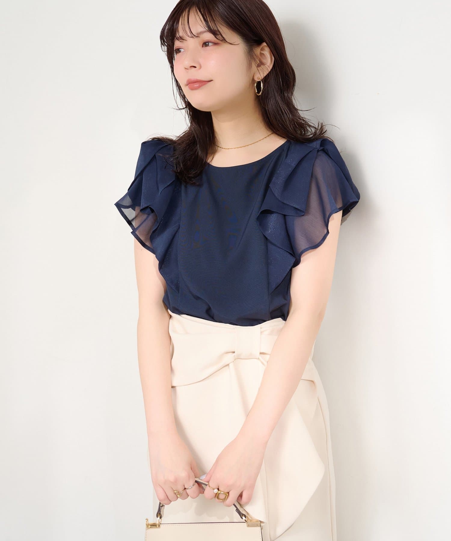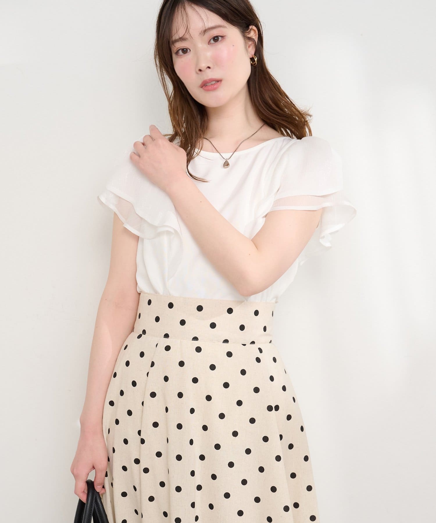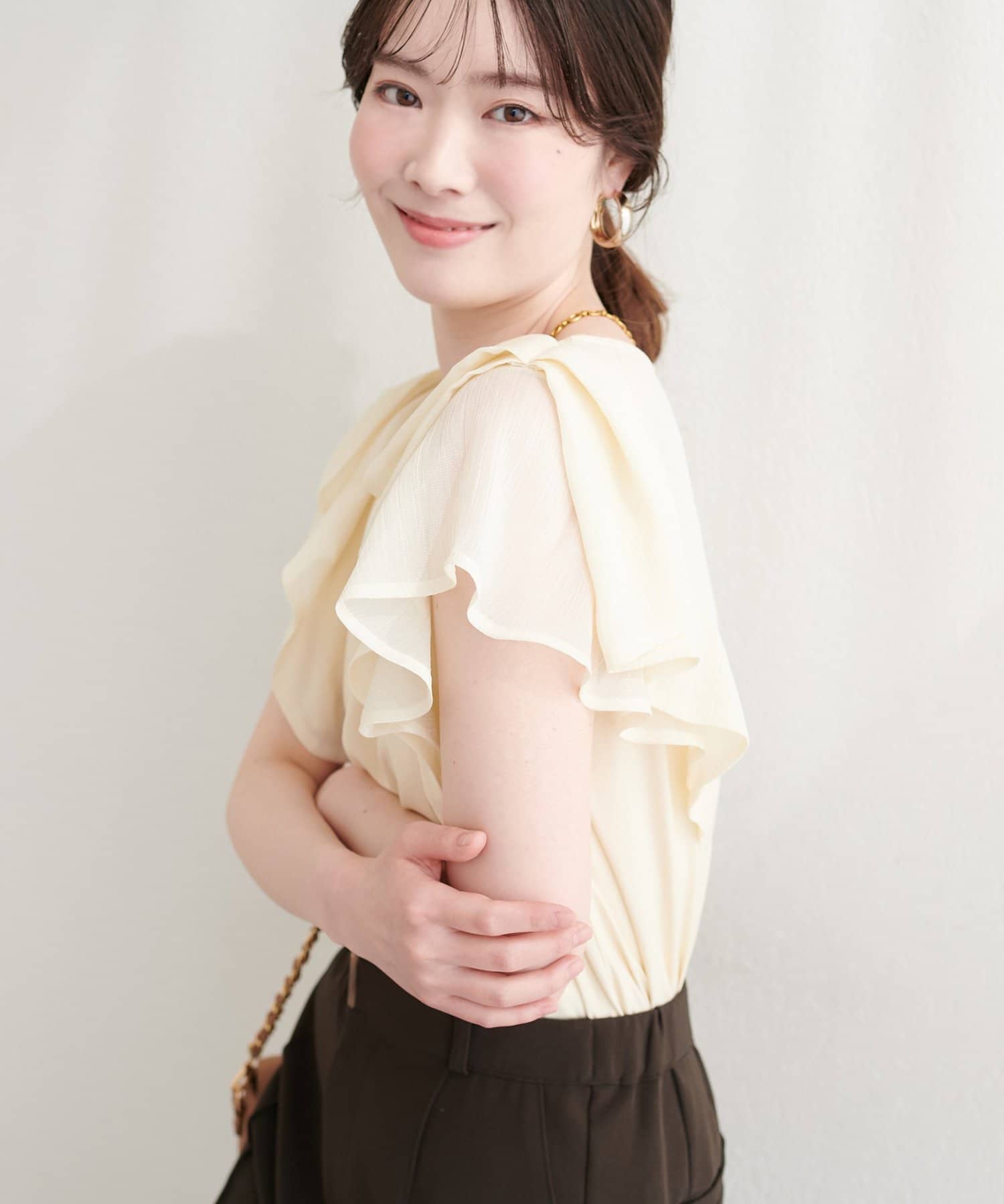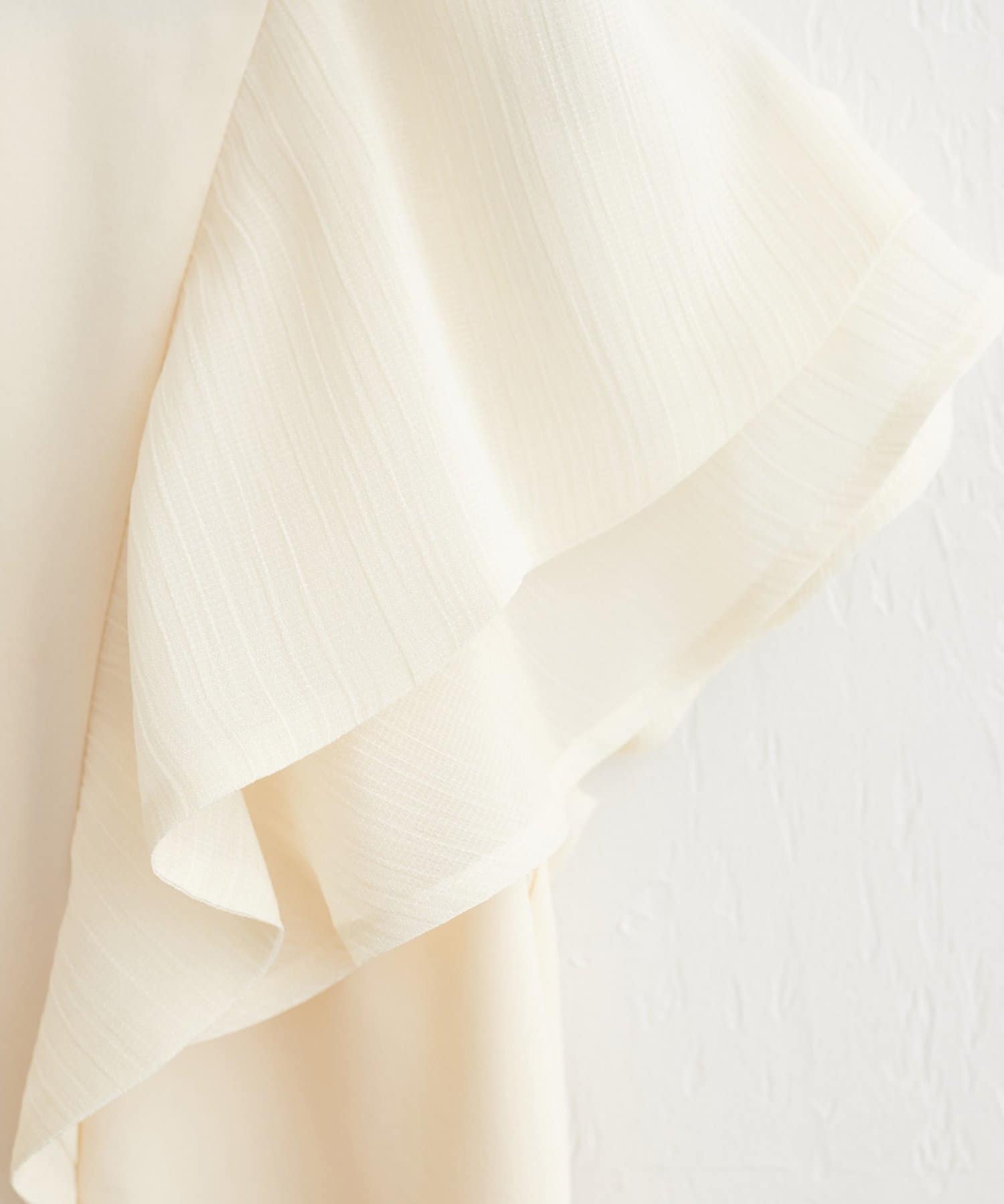 肩を飾るフリルは、動くたびにふわりと愛らしく、甘すぎない、大人のためのリボンデザイン。