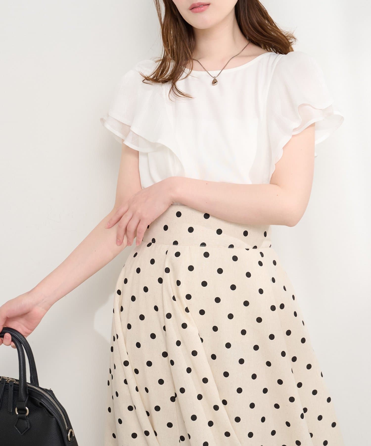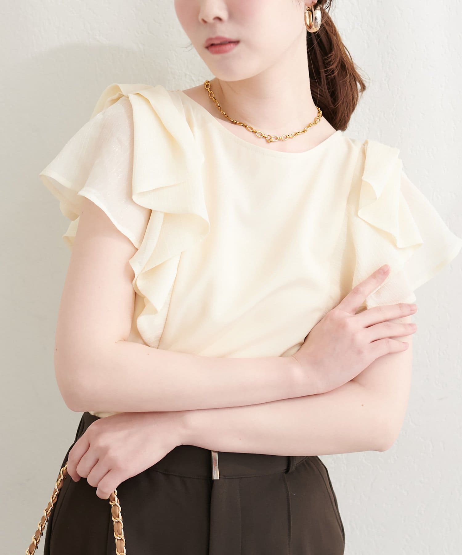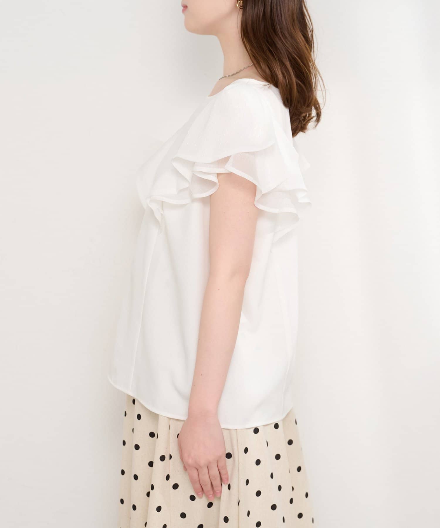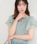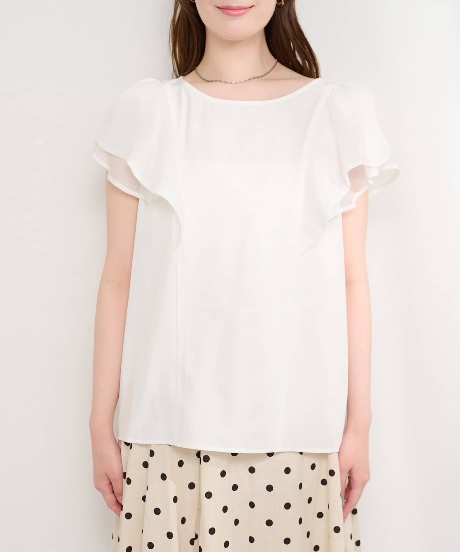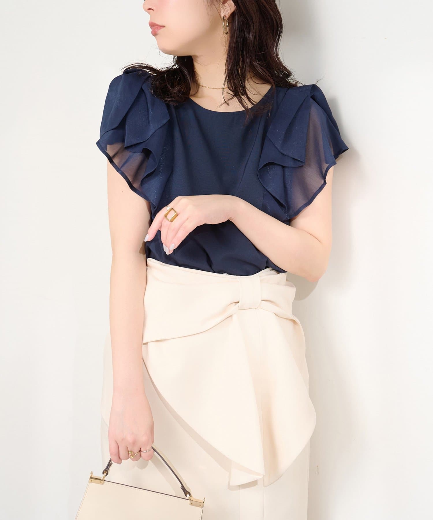 肩を飾るフリルは、動くたびにふわりと愛らしく、甘すぎない、大人のためのリボンデザイン。