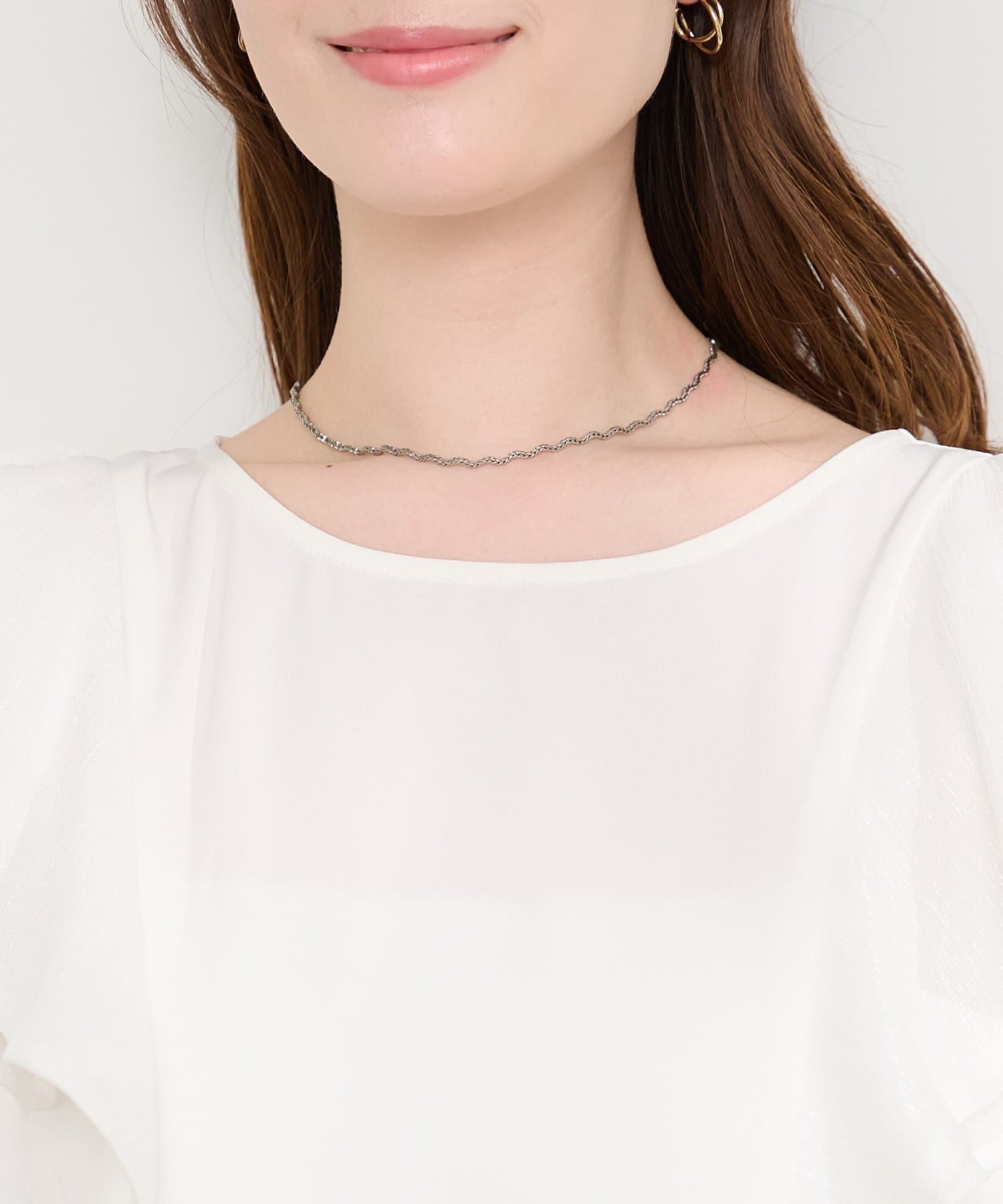 ネックラインは、デコルテを美しく見せるラウンドネック。